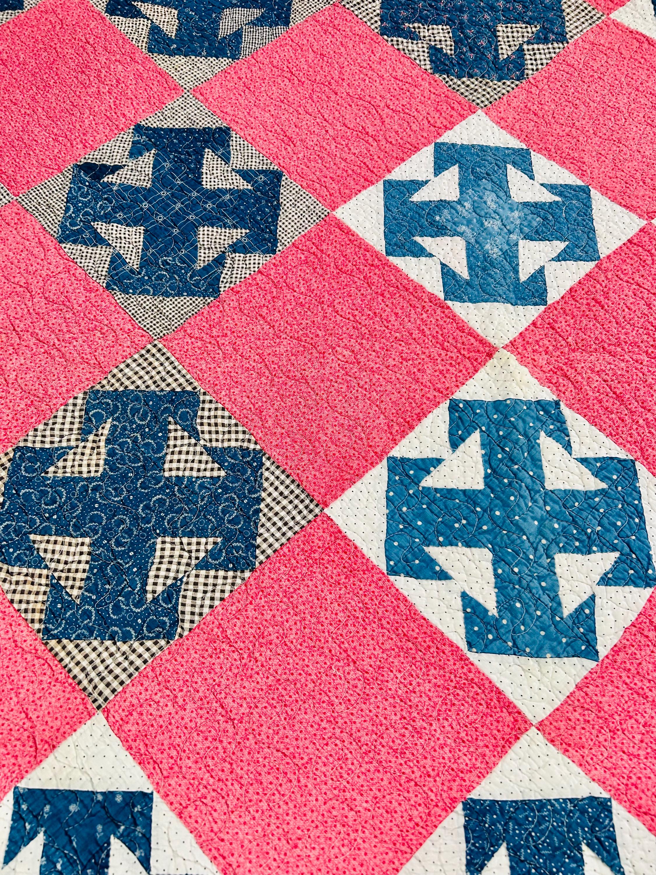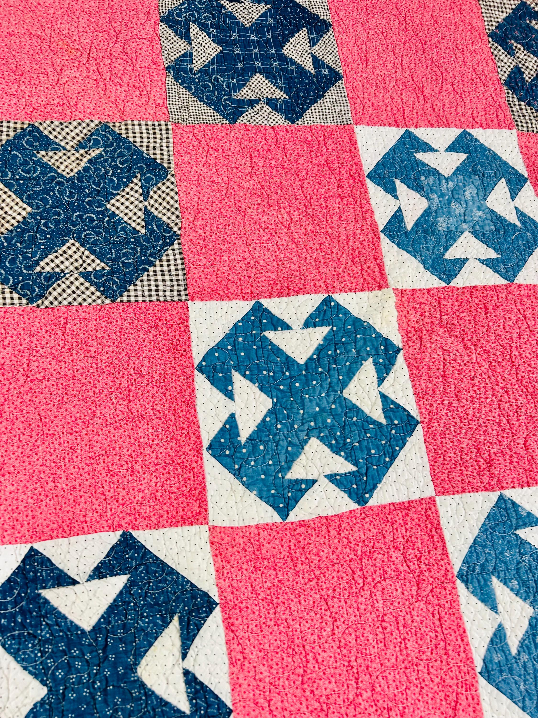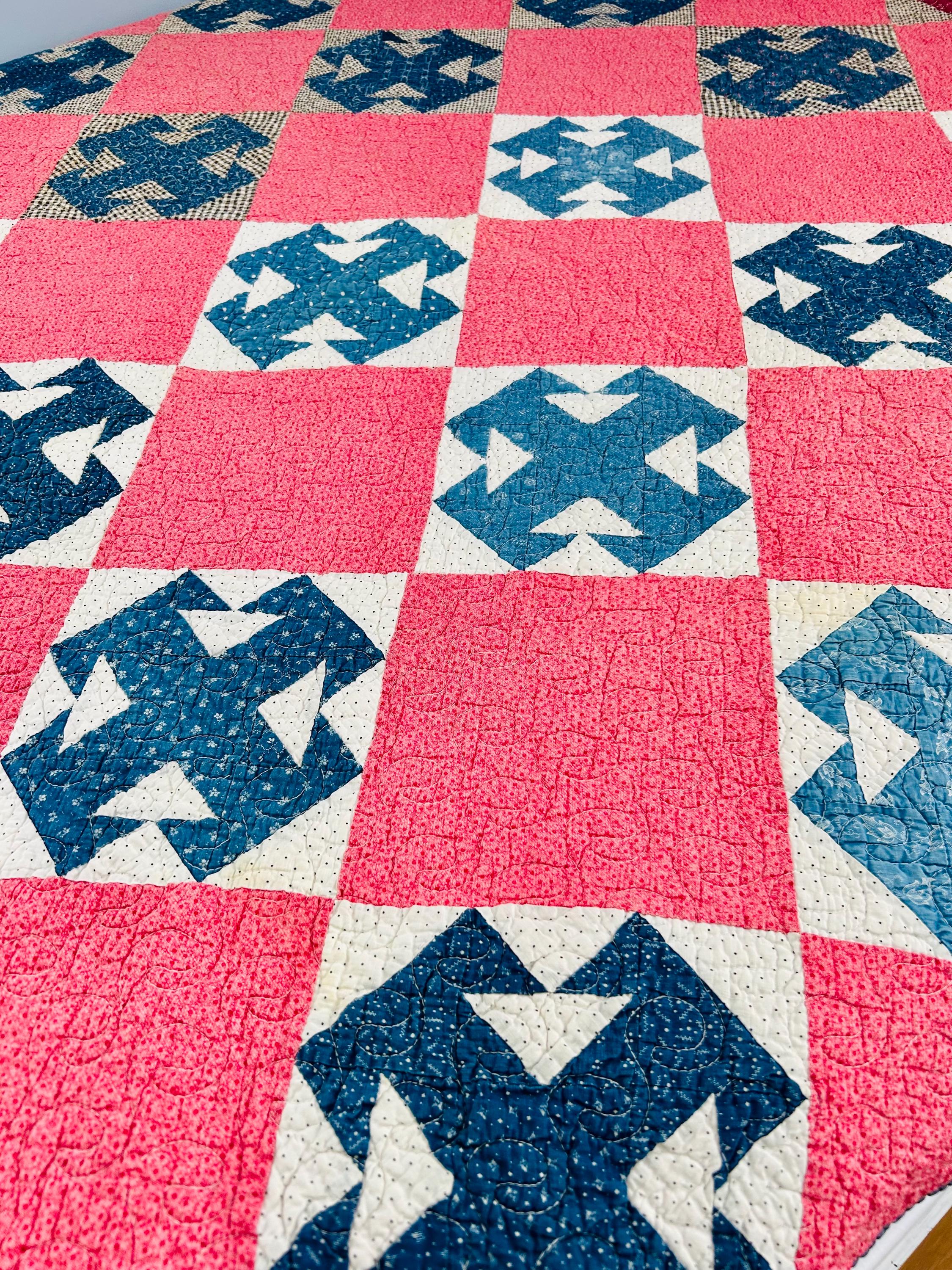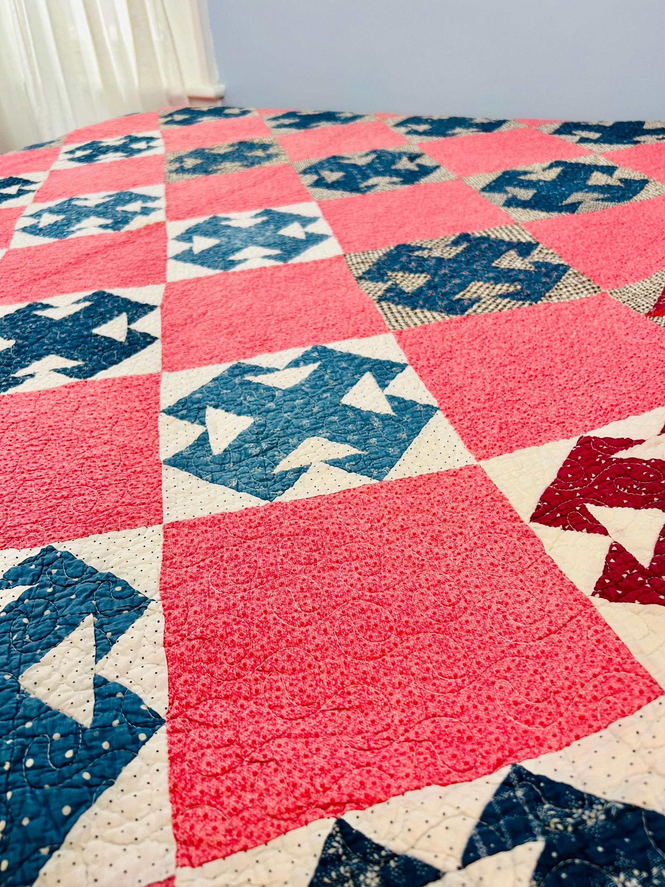 Details: • Pattern: Double T (Block Style) • Dimensions: 64” x 76” • Top Era: Circa 1880–1900 • Quilting: Modern Long-Arm Finished • Colors: Indigo Blue, Bubblegum Pink, Black/White Shirting