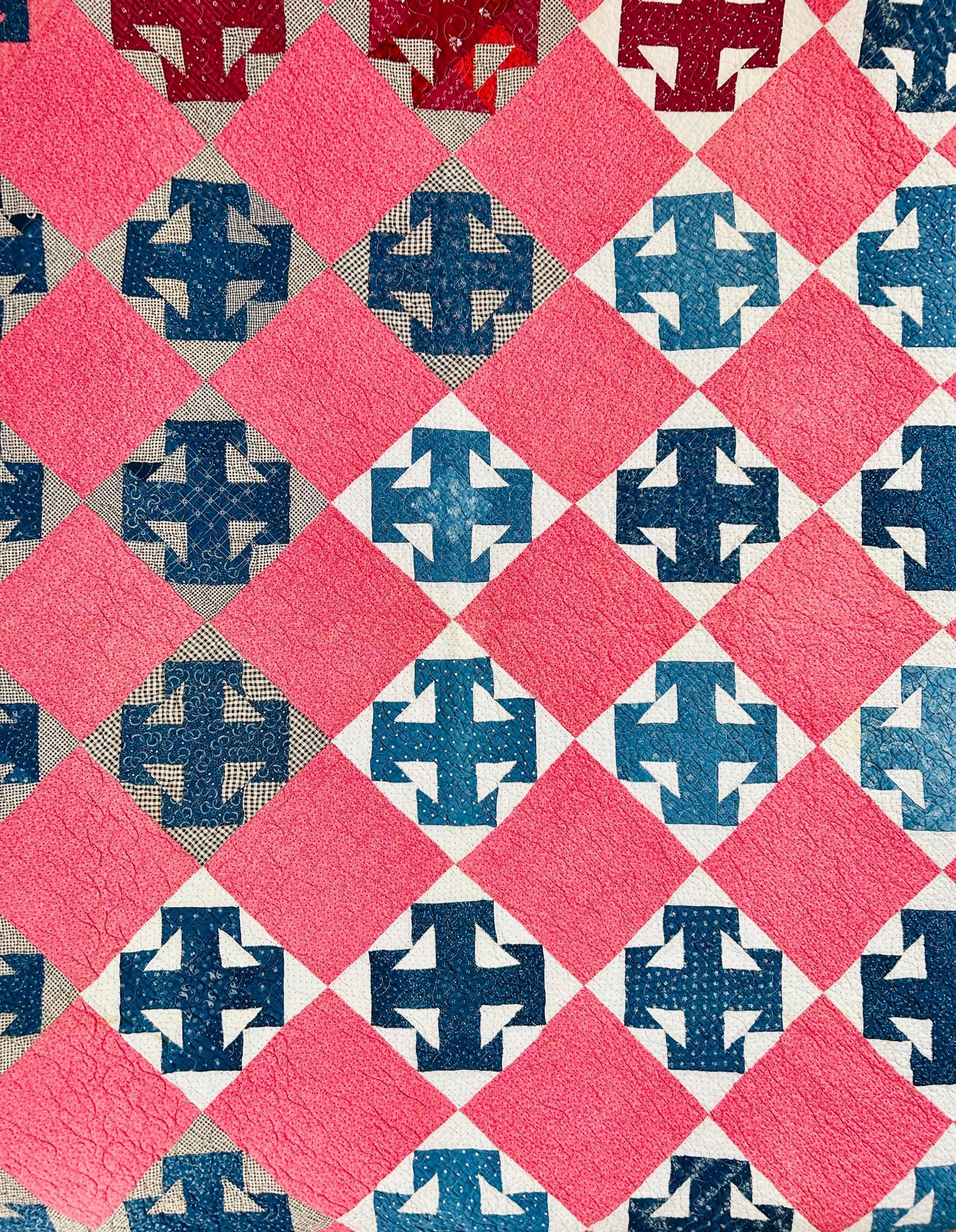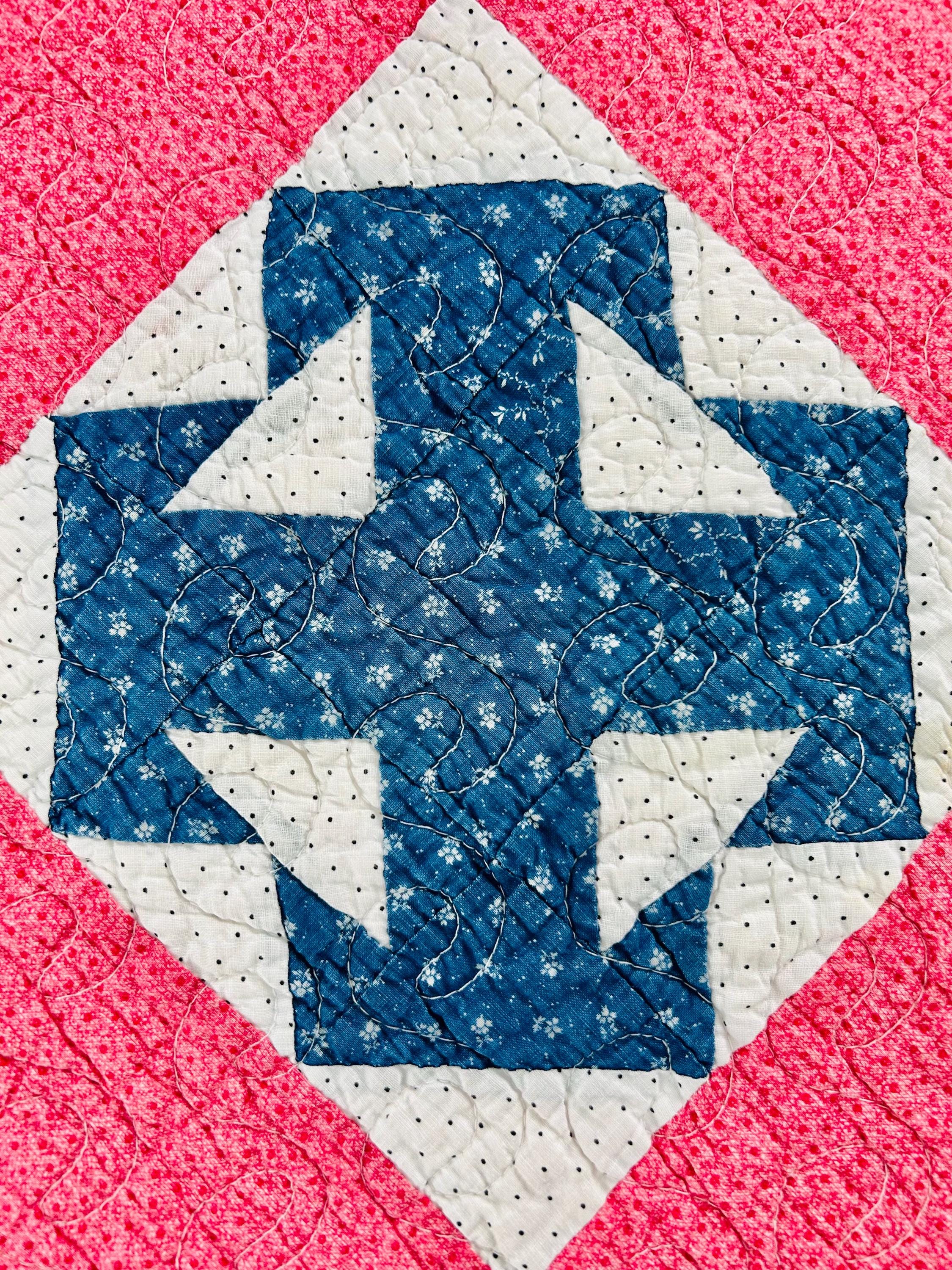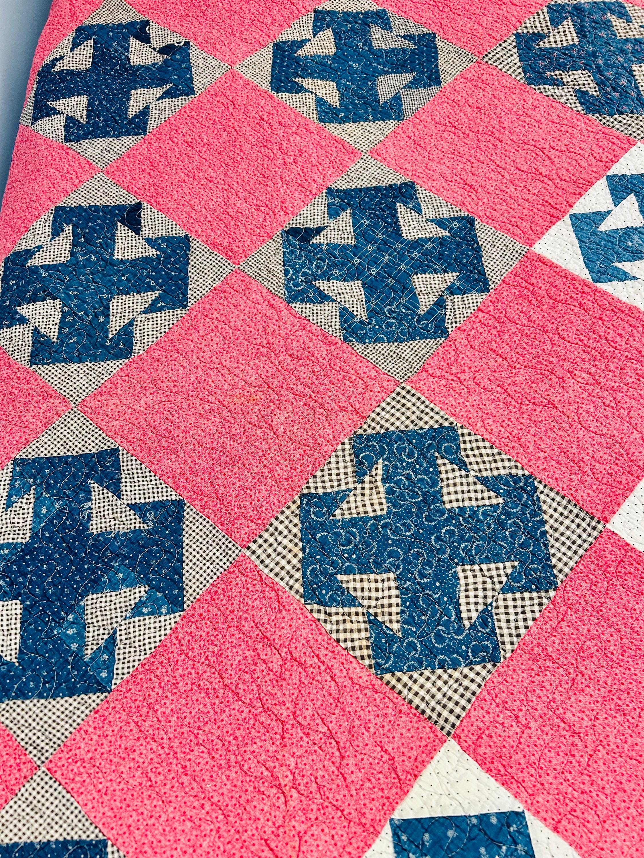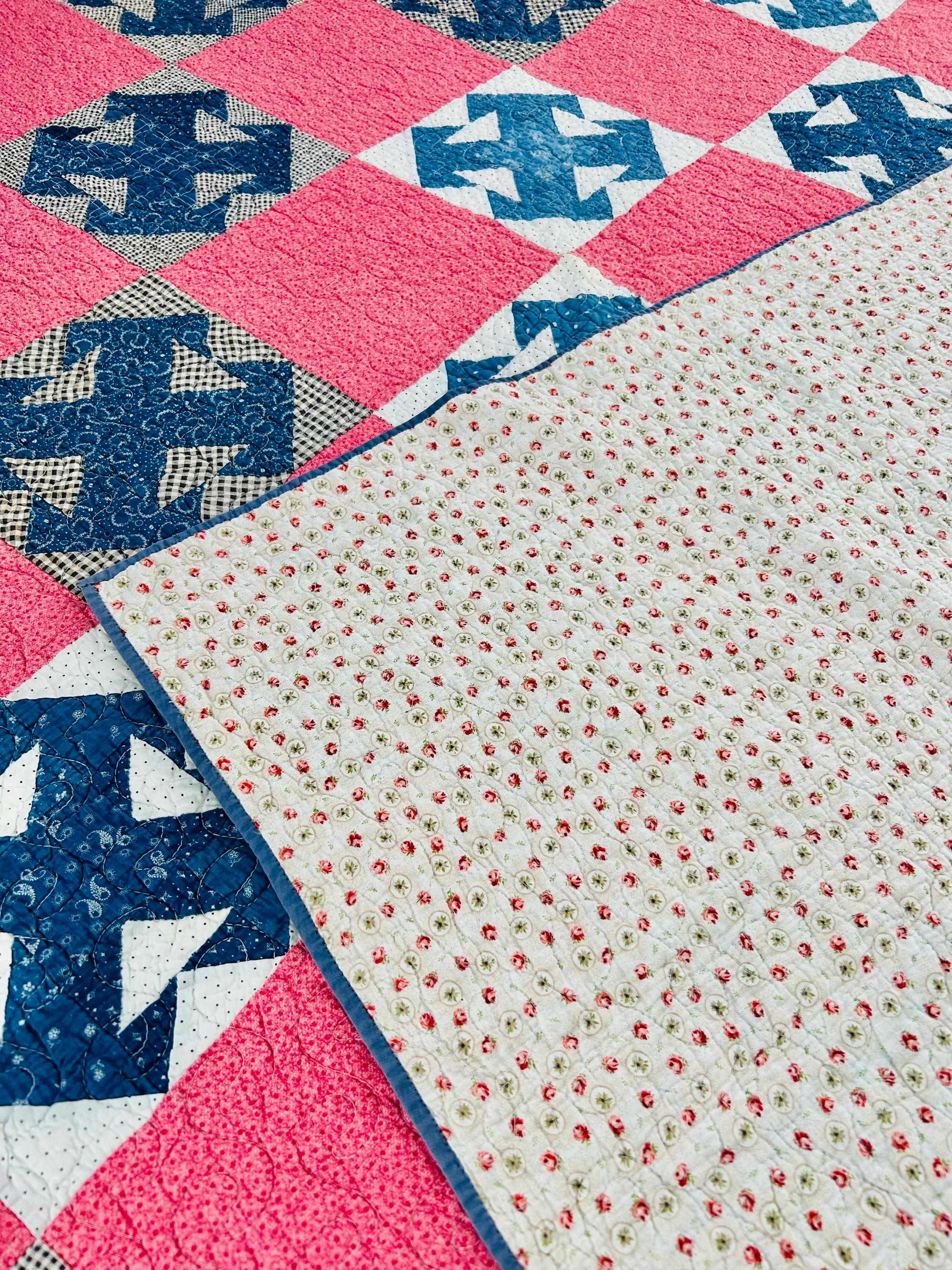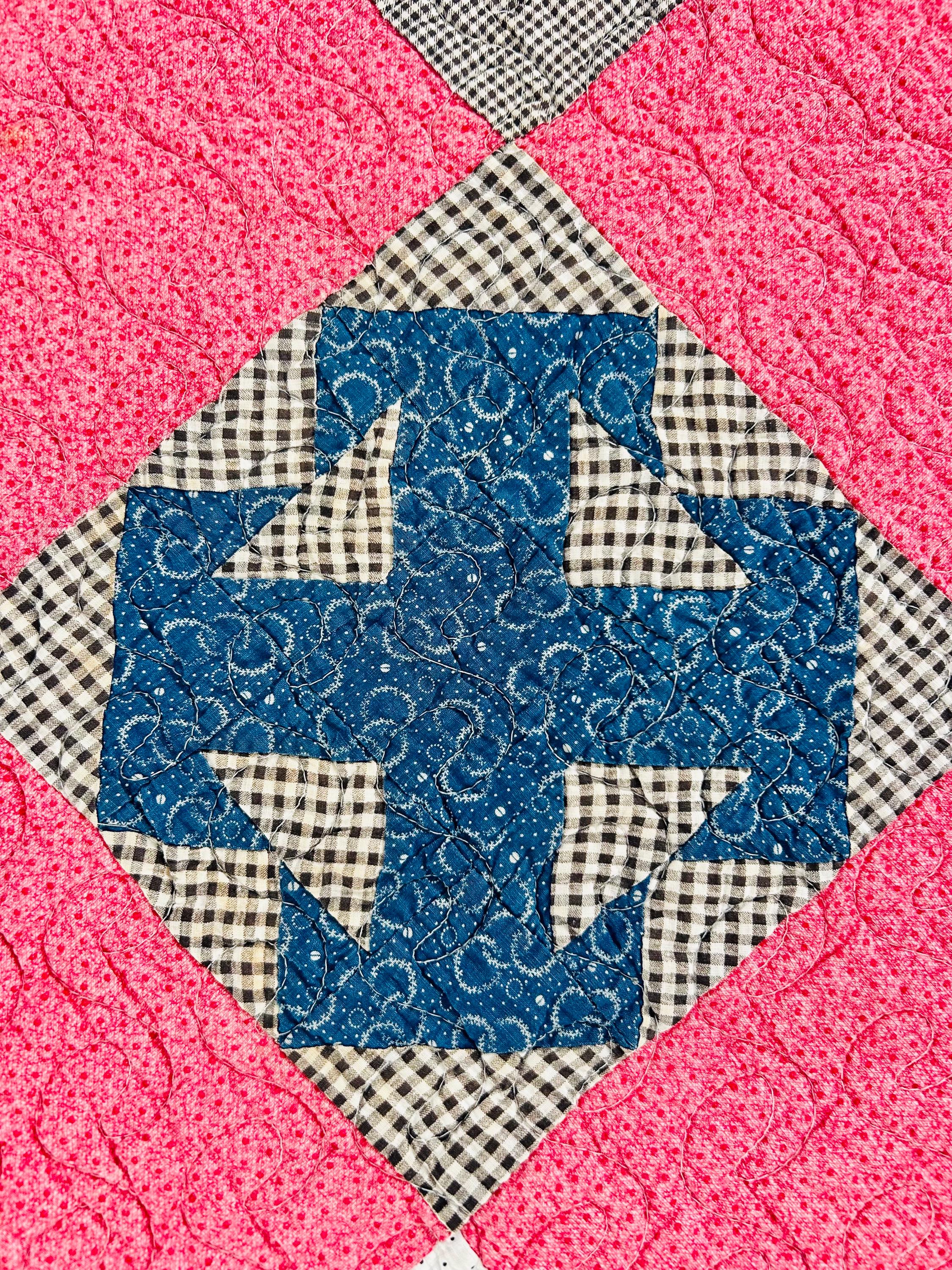 Details: • Pattern: Double T (Block Style) • Dimensions: 64” x 76” • Top Era: Circa 1880–1900 • Quilting: Modern Long-Arm Finished • Colors: Indigo Blue, Bubblegum Pink, Black/White Shirting