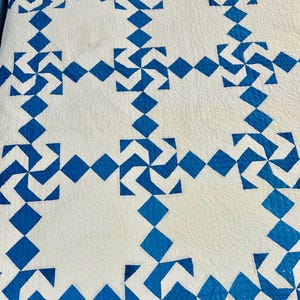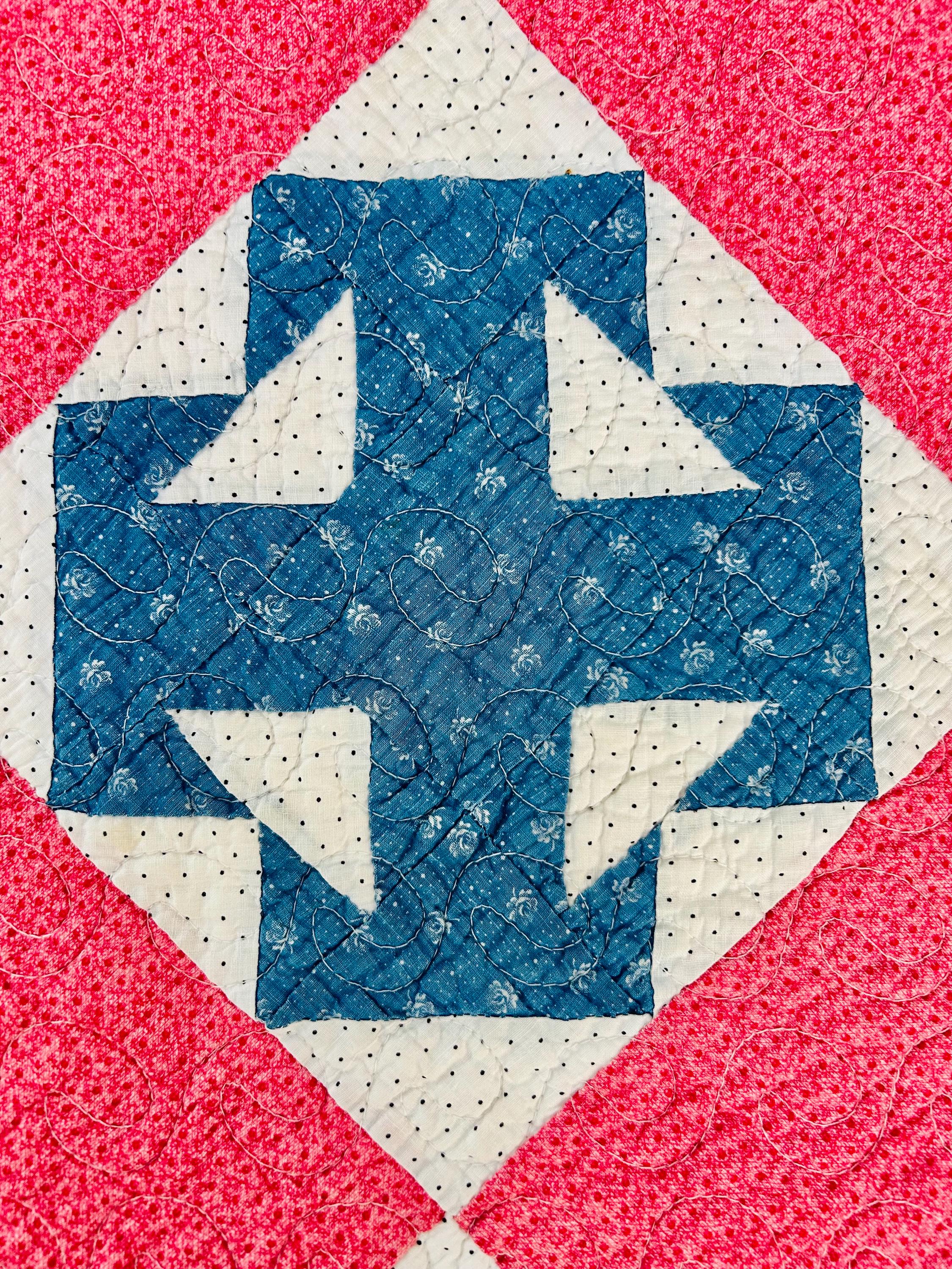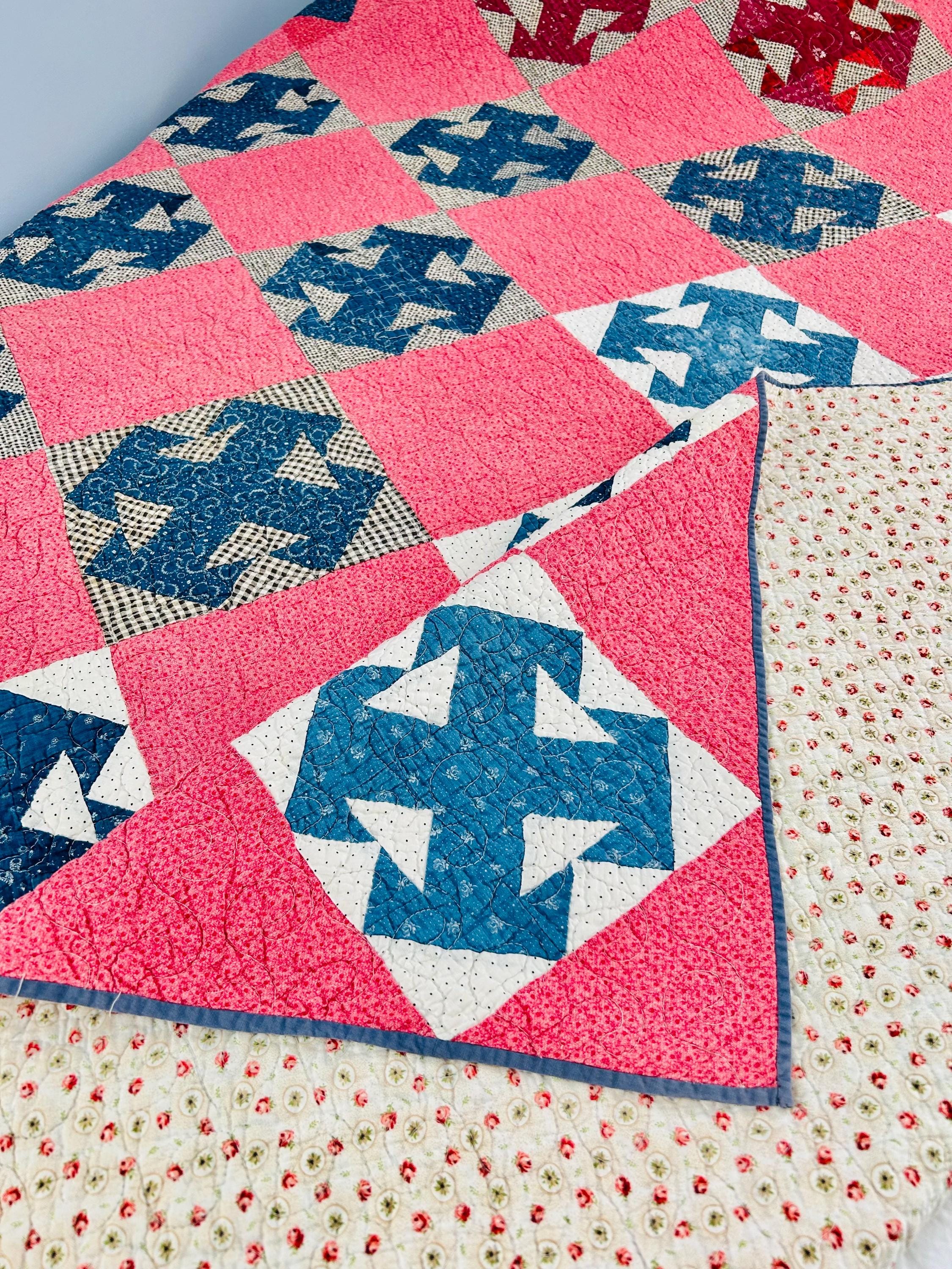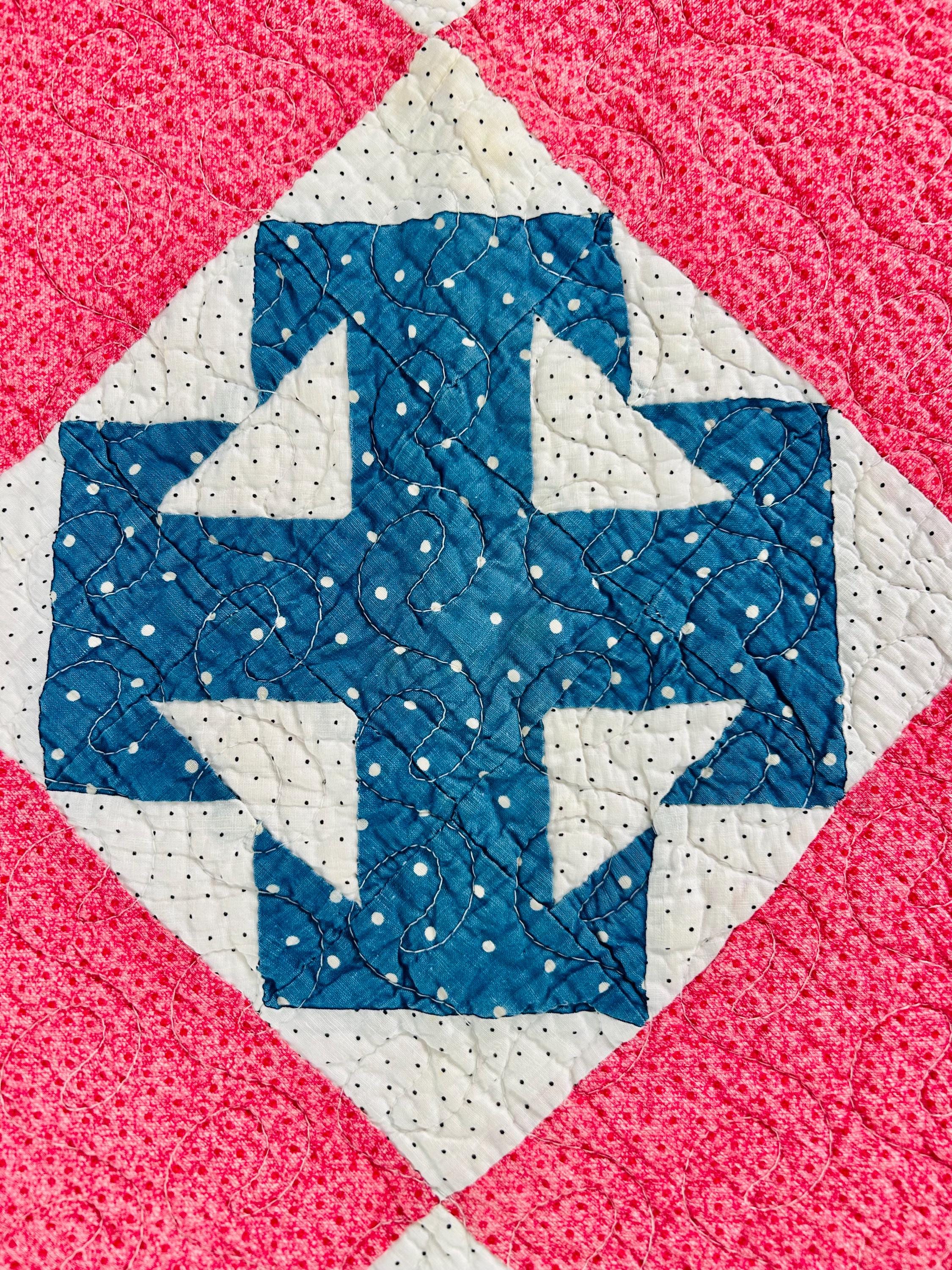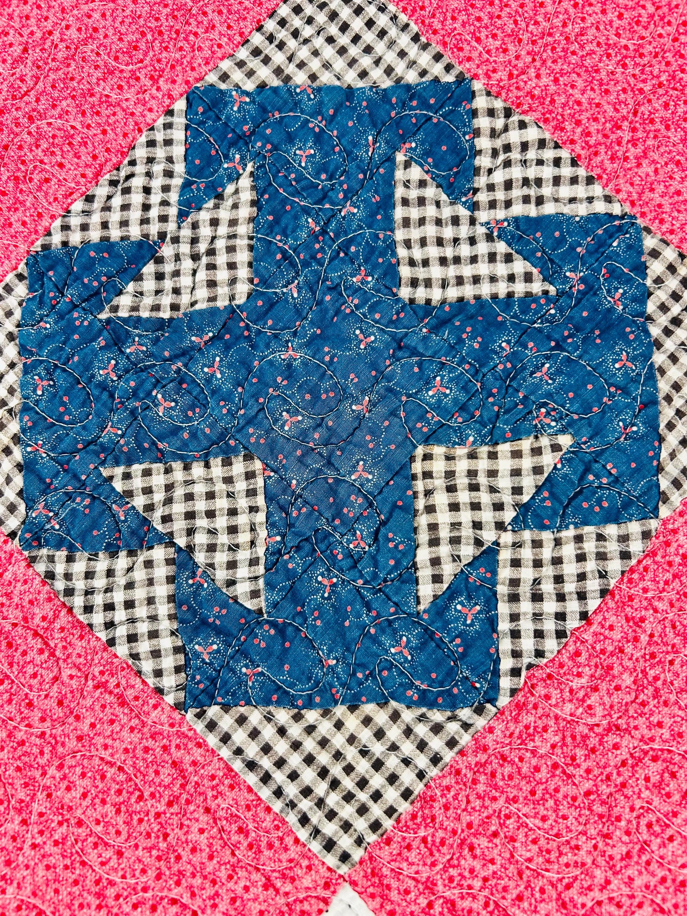 Details: • Pattern: Double T (Block Style) • Dimensions: 64” x 76” • Top Era: Circa 1880–1900 • Quilting: Modern Long-Arm Finished • Colors: Indigo Blue, Bubblegum Pink, Black/White Shirting