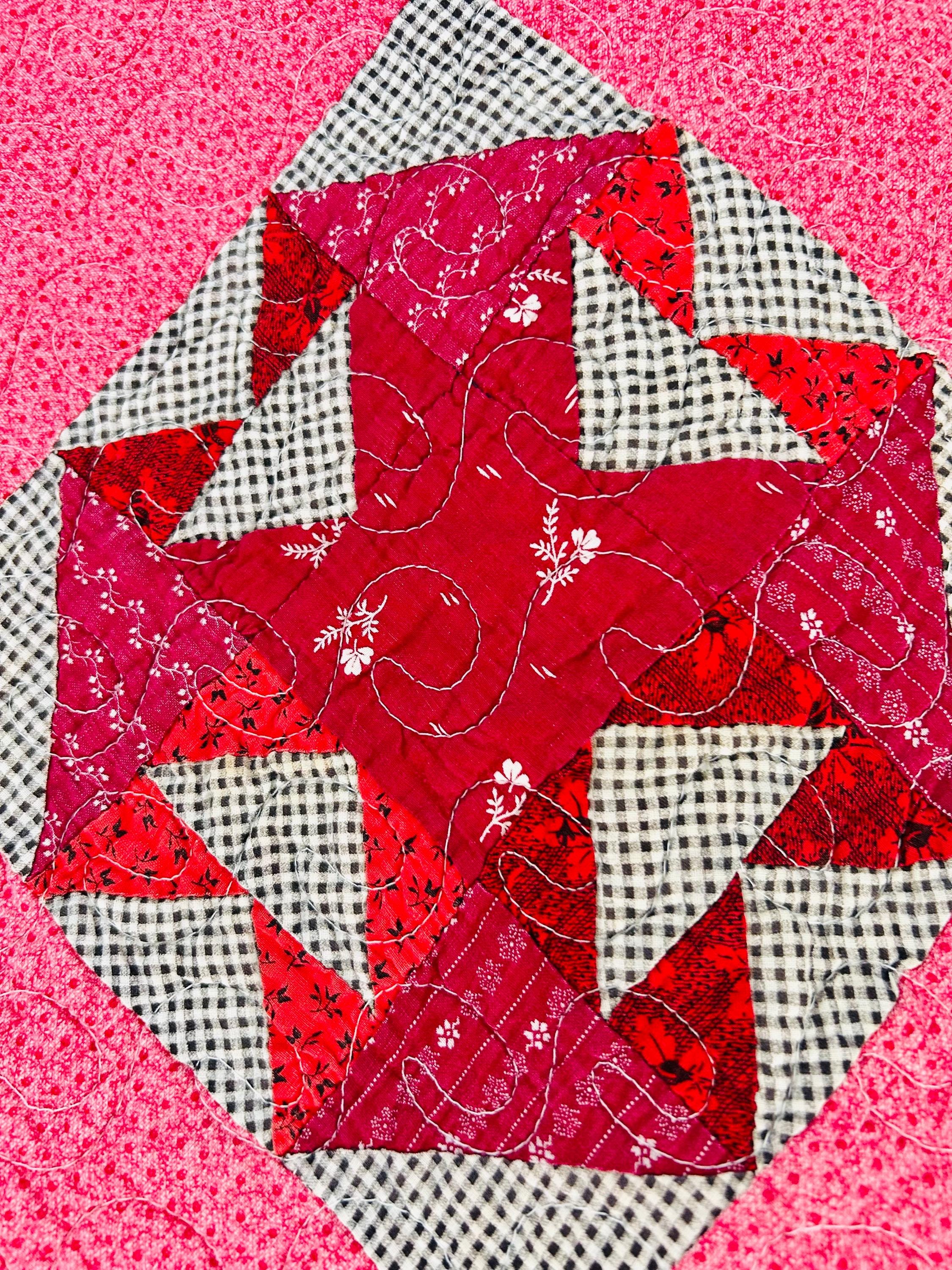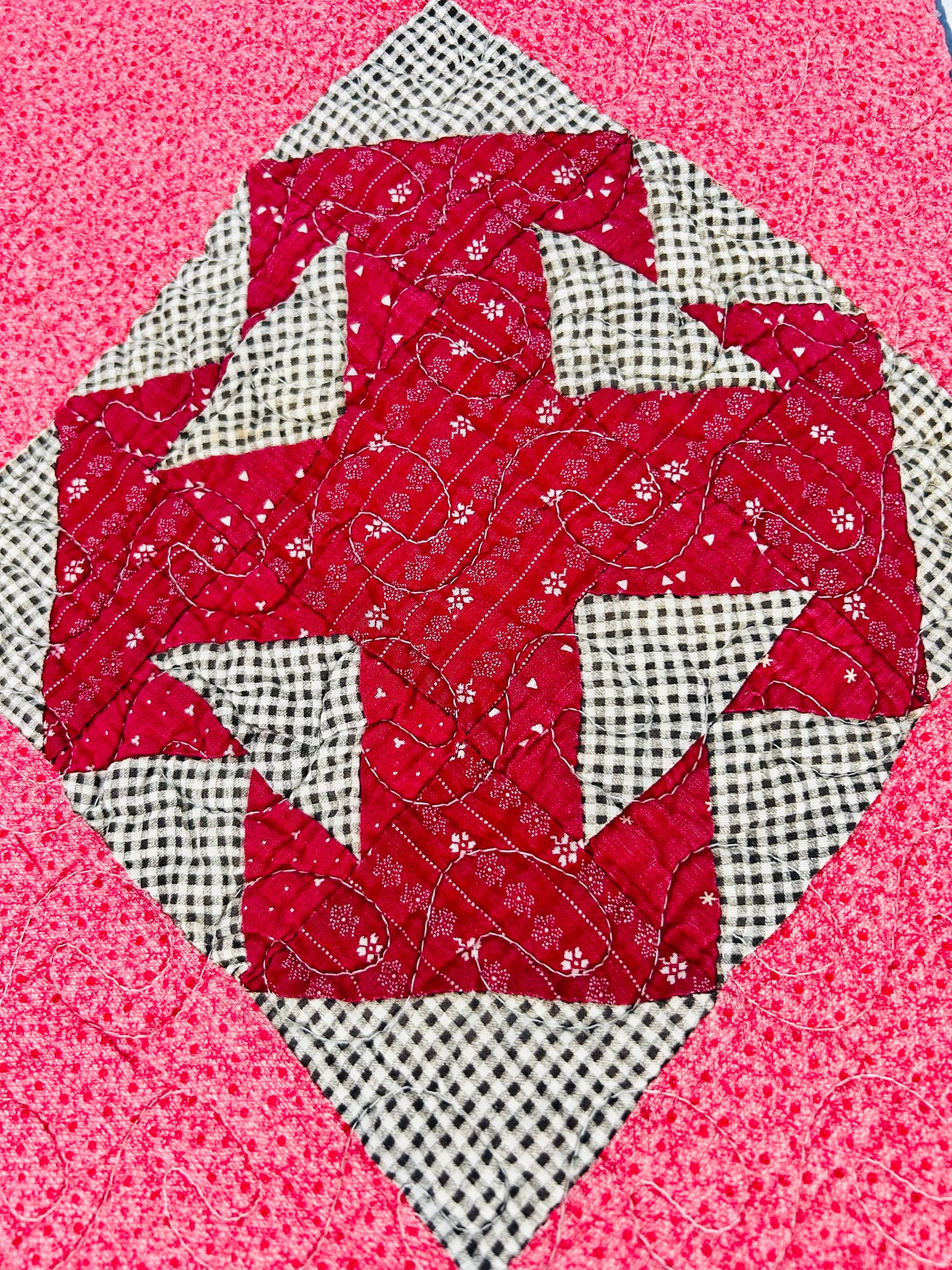 This striking quilt has an antique top that has been hand-pieced (likely between 1880 and 1910) and kept as an "orphan top" for over a century before being professionally finished with modern long-arm quilting. The quilting is in curlicues and swirls.