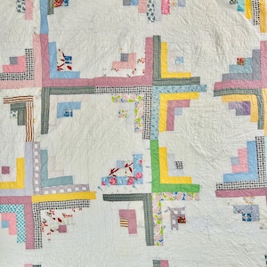 The Double T pattern is a classic geometric design that has been constructed from: • Indigo Discharge Prints: Deep navy blues with crisp white geometric "poked" patterns. • Antique "Double Pink": Also known as Bubblegum or Cinnamon pink, a staple of the late 19th-century palette. • Shirting Prints: The background features various "low volume" black-on-white and blue-on-white prints typical of the era.