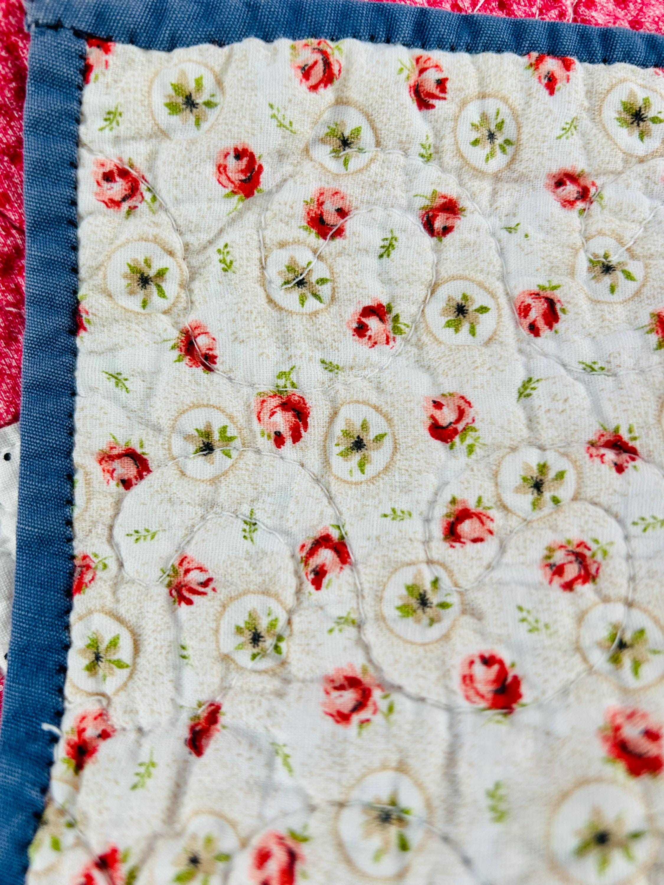 The back is a retro-cotton floral while the binding is very narrow blue cotton that has been machine stitched to the front and hand-stitched in very tiny stitches to the back. The cotton batting is very lightweight.