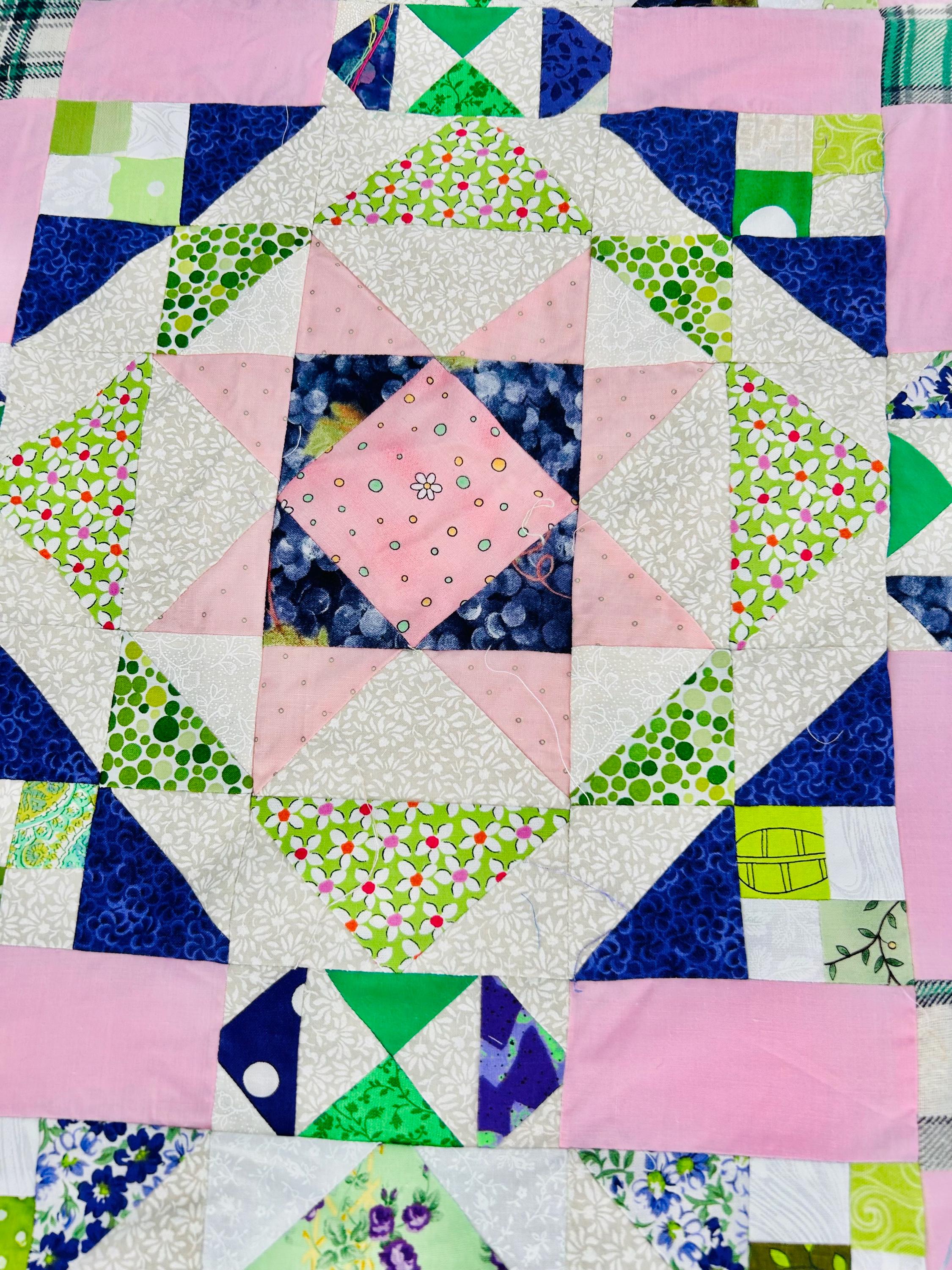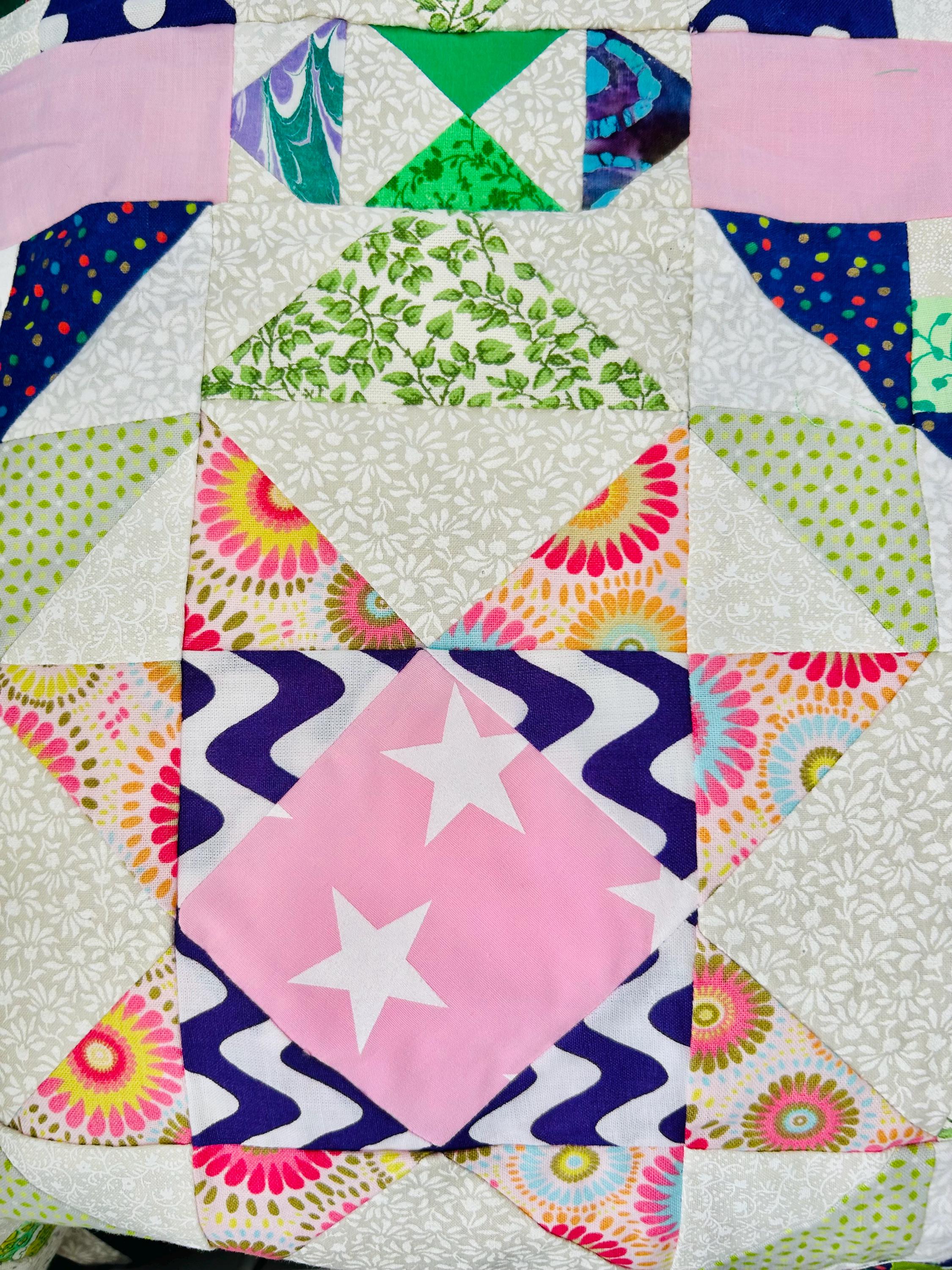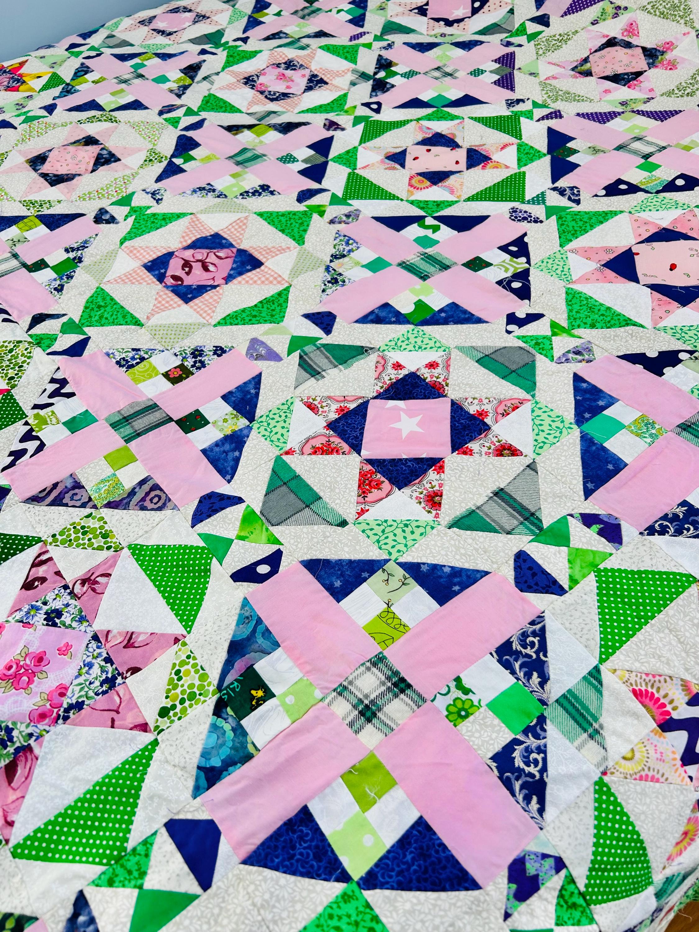 Th quilt top is in excellent condition with no issues noted. The piecing appears carefully constructed with crisp points and good alignment. Fabrics are cotton and consistent with early 2000s quilting cottons. Colors remain bright and unfaded.