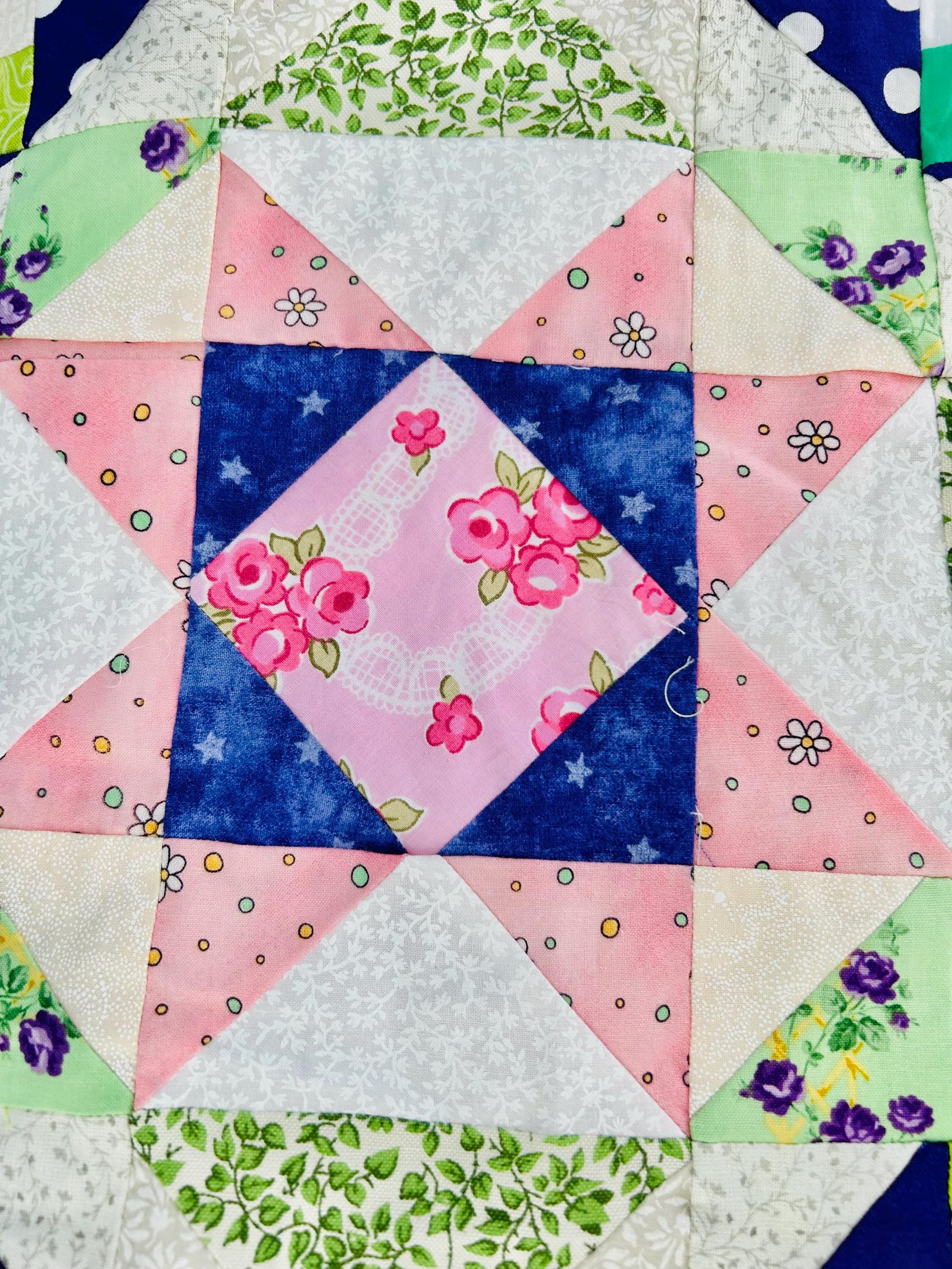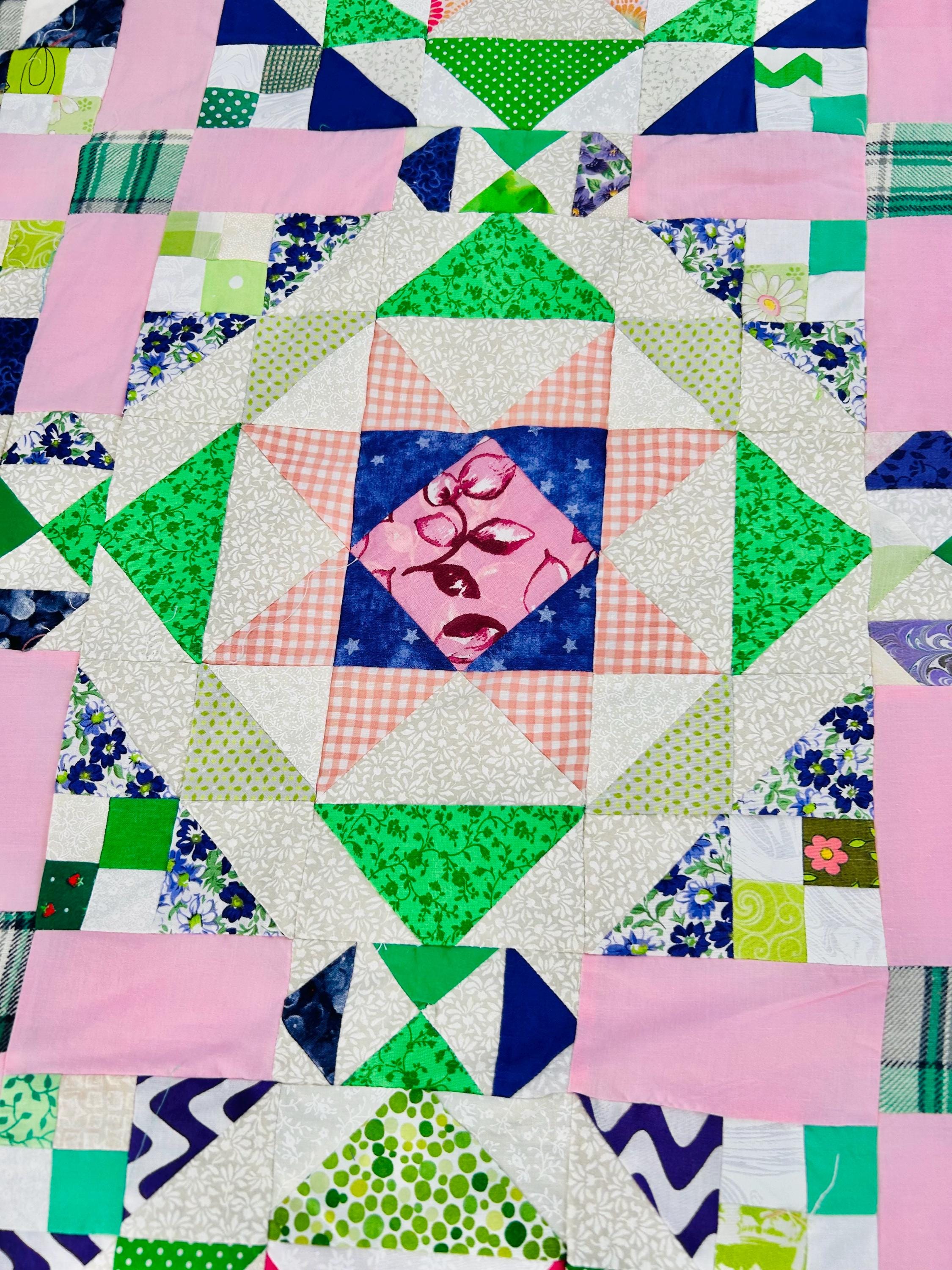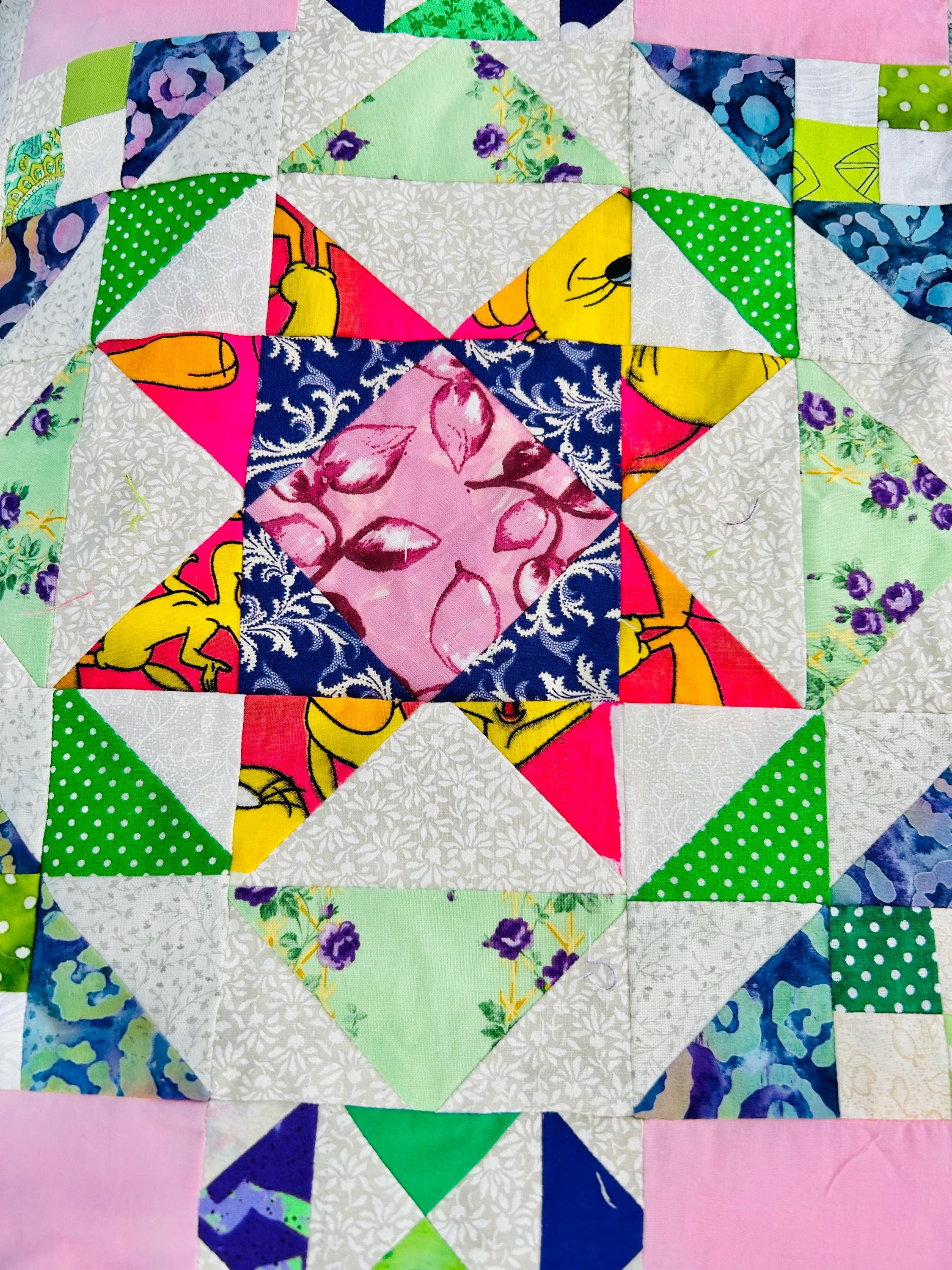 Th quilt top is in excellent condition with no issues noted. The piecing appears carefully constructed with crisp points and good alignment. Fabrics are cotton and consistent with early 2000s quilting cottons. Colors remain bright and unfaded.