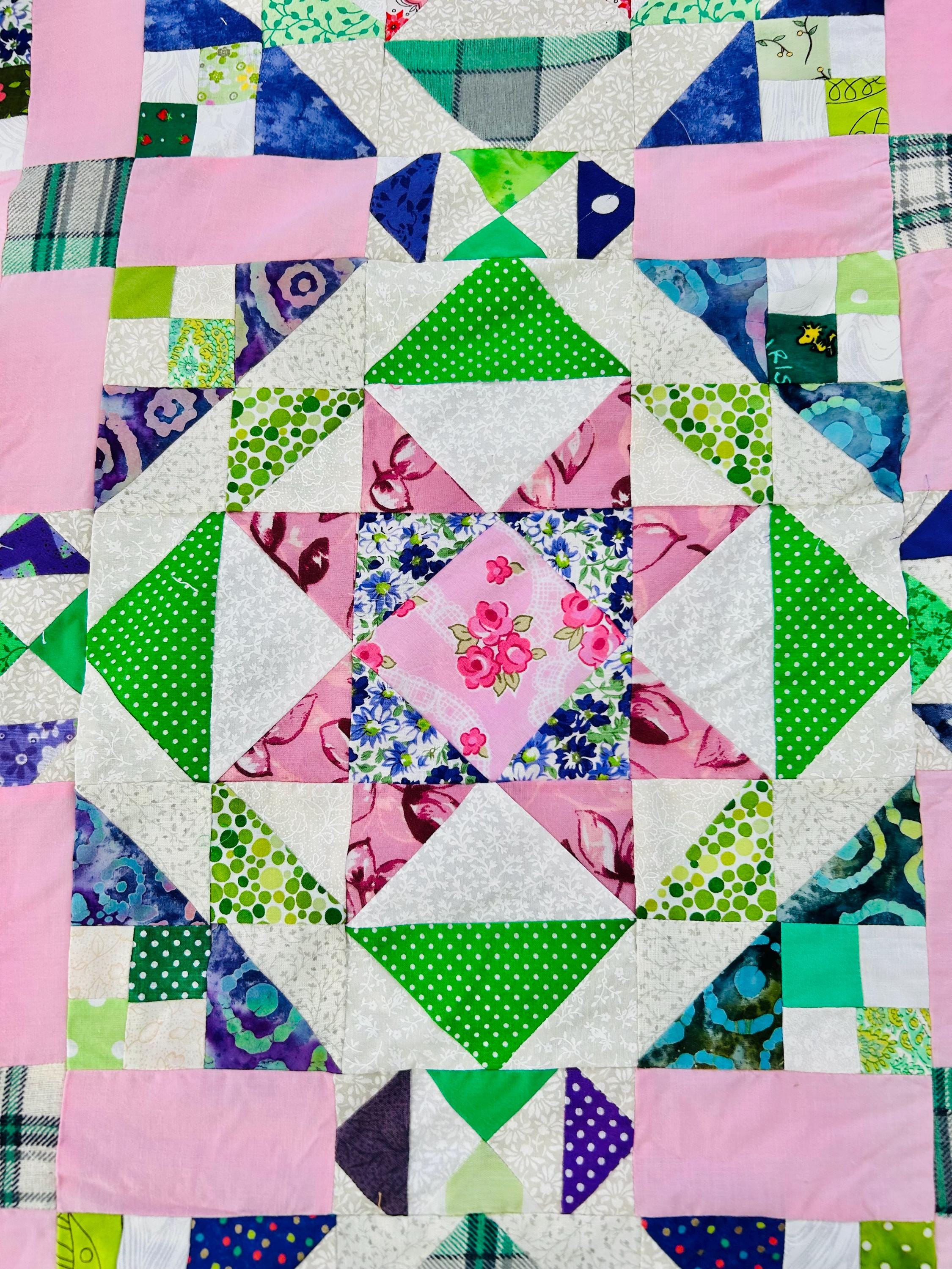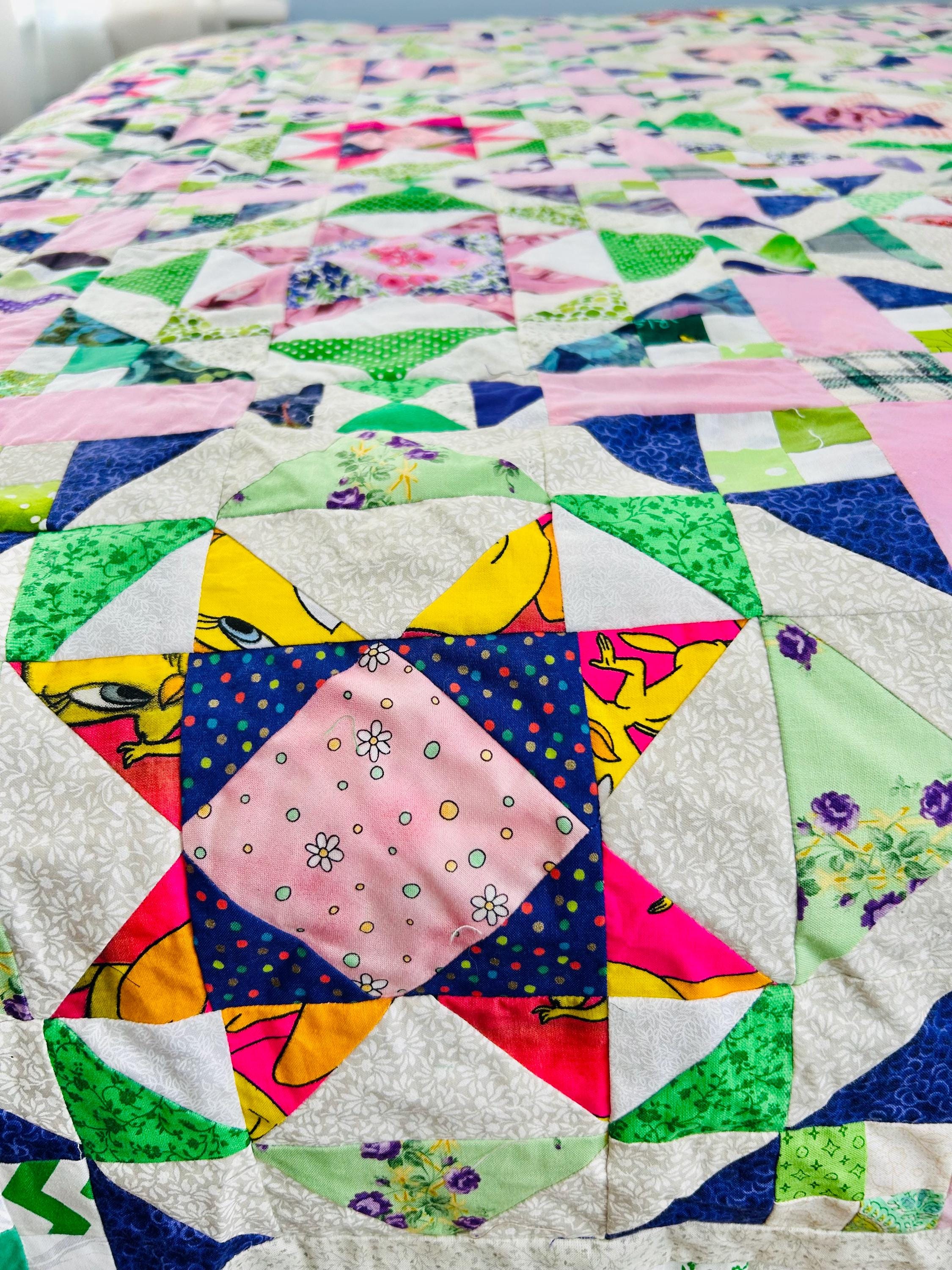 Details: • Date: Early 2000s • Size: 76” x 76” • Pattern: Ohio Star • Fabrics: Assorted cotton quilting prints (florals, novelty, geometrics, plaids) • Construction: Machine pieced • Condition: Excellent