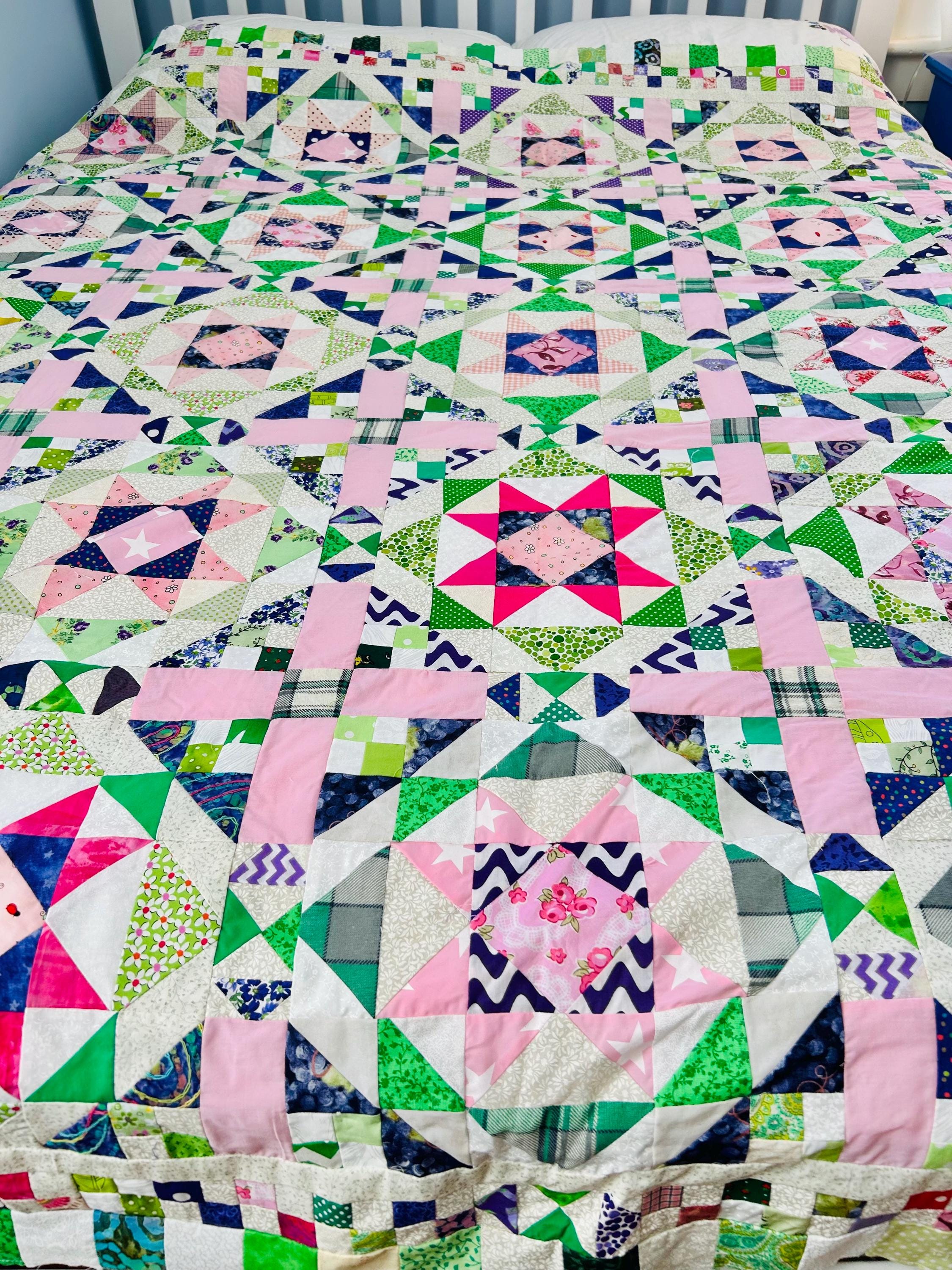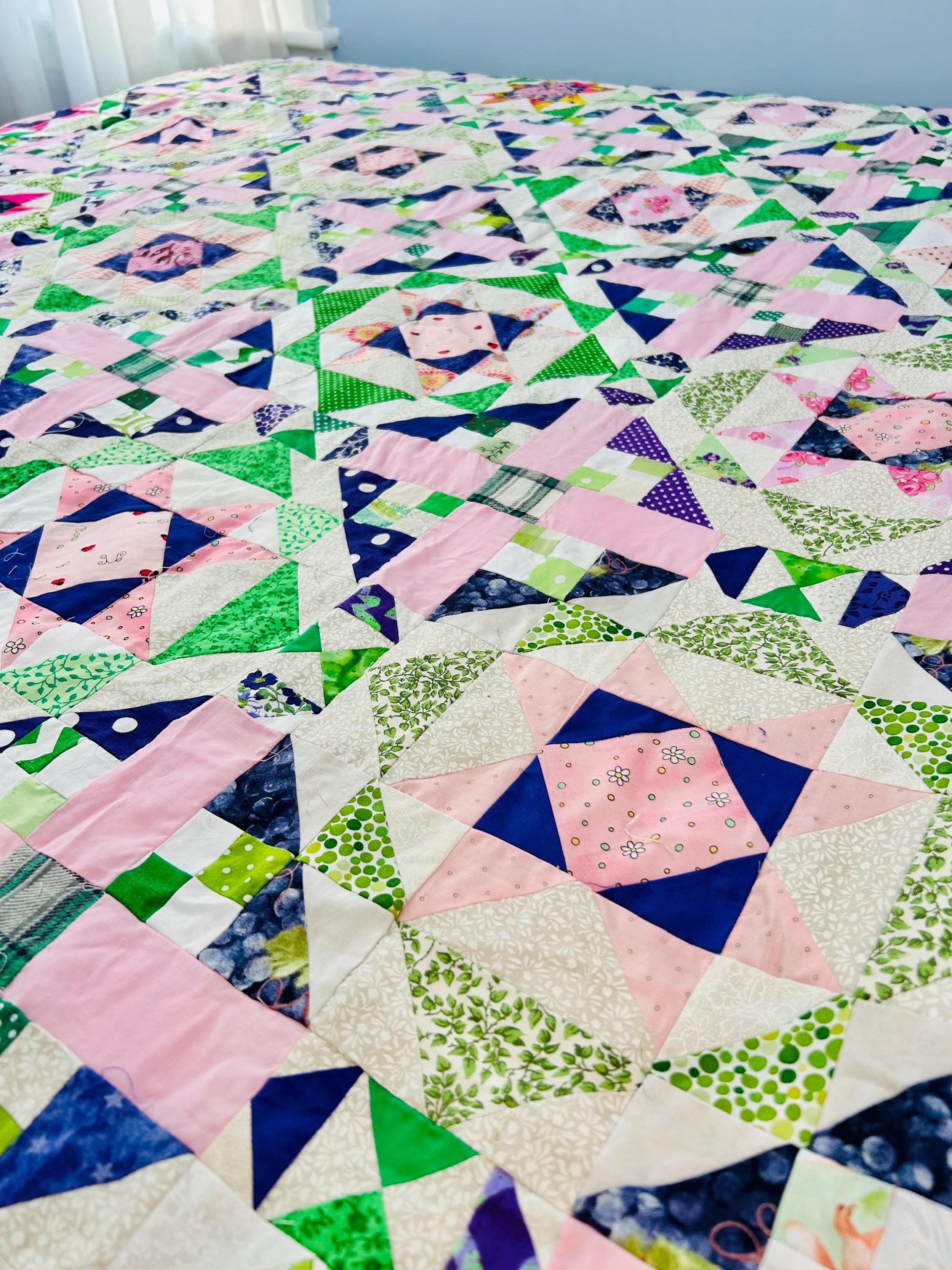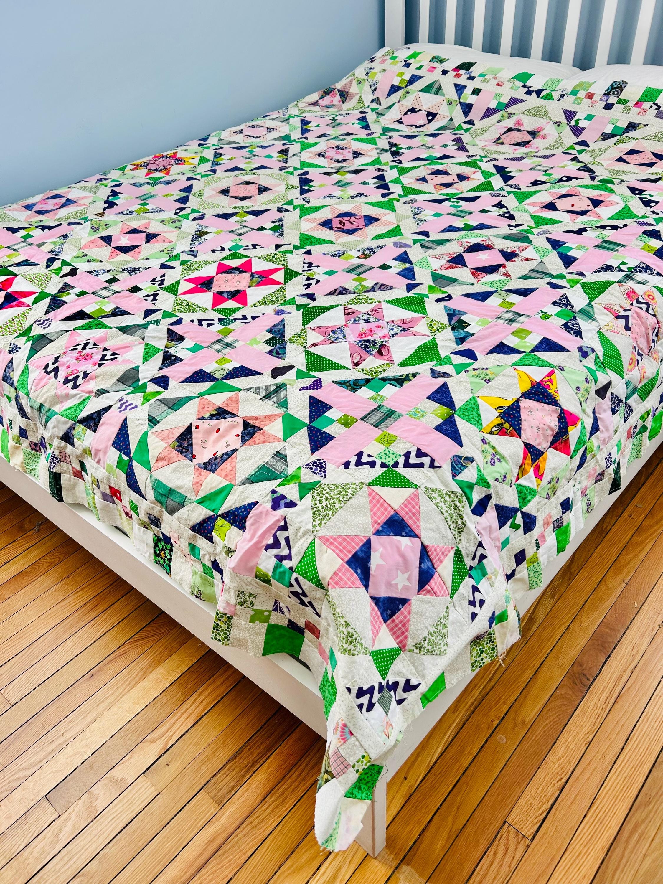 The quilt top is from a smoke-free, pet-free home and is pictured on a queen-size bed.
