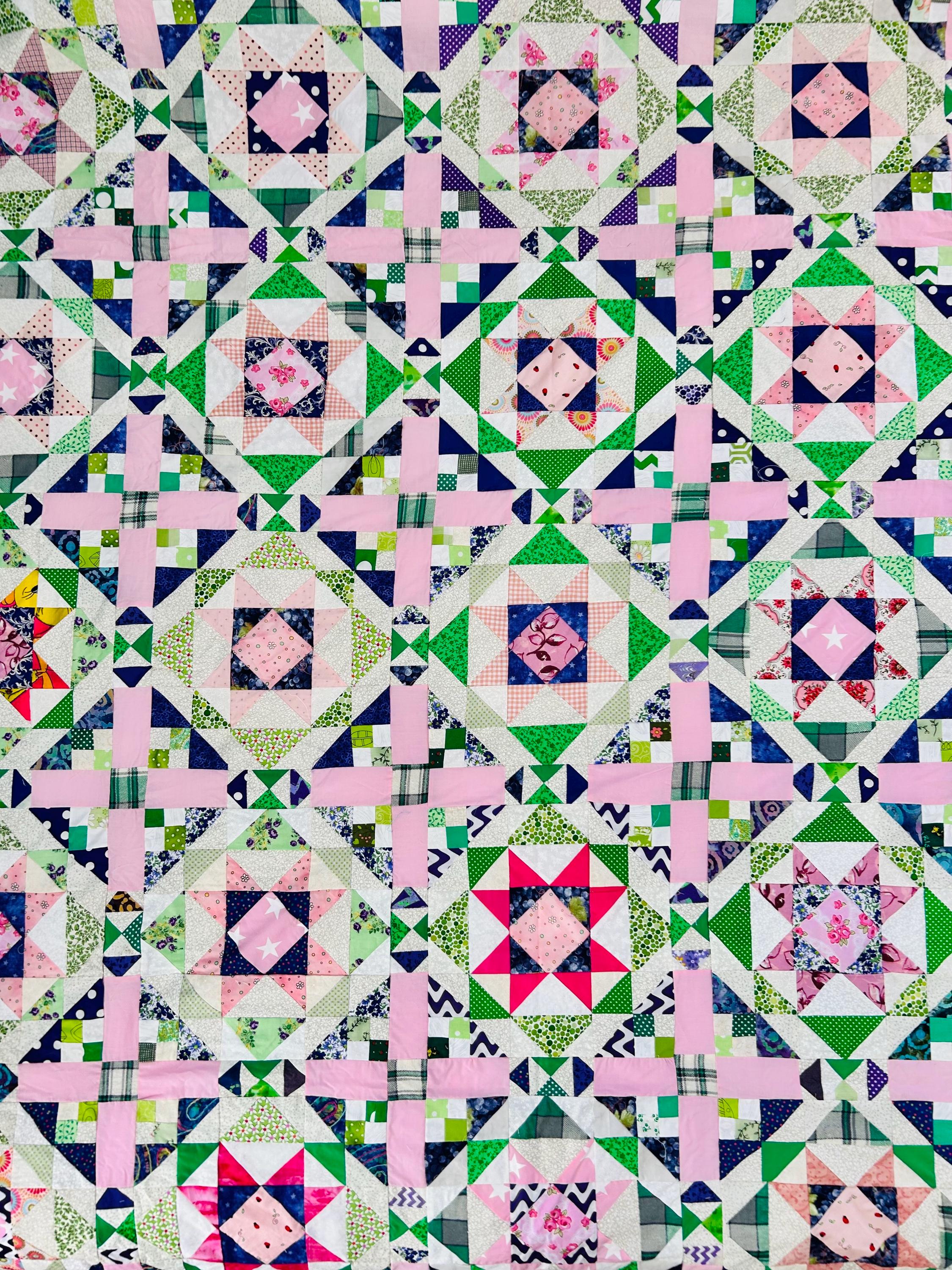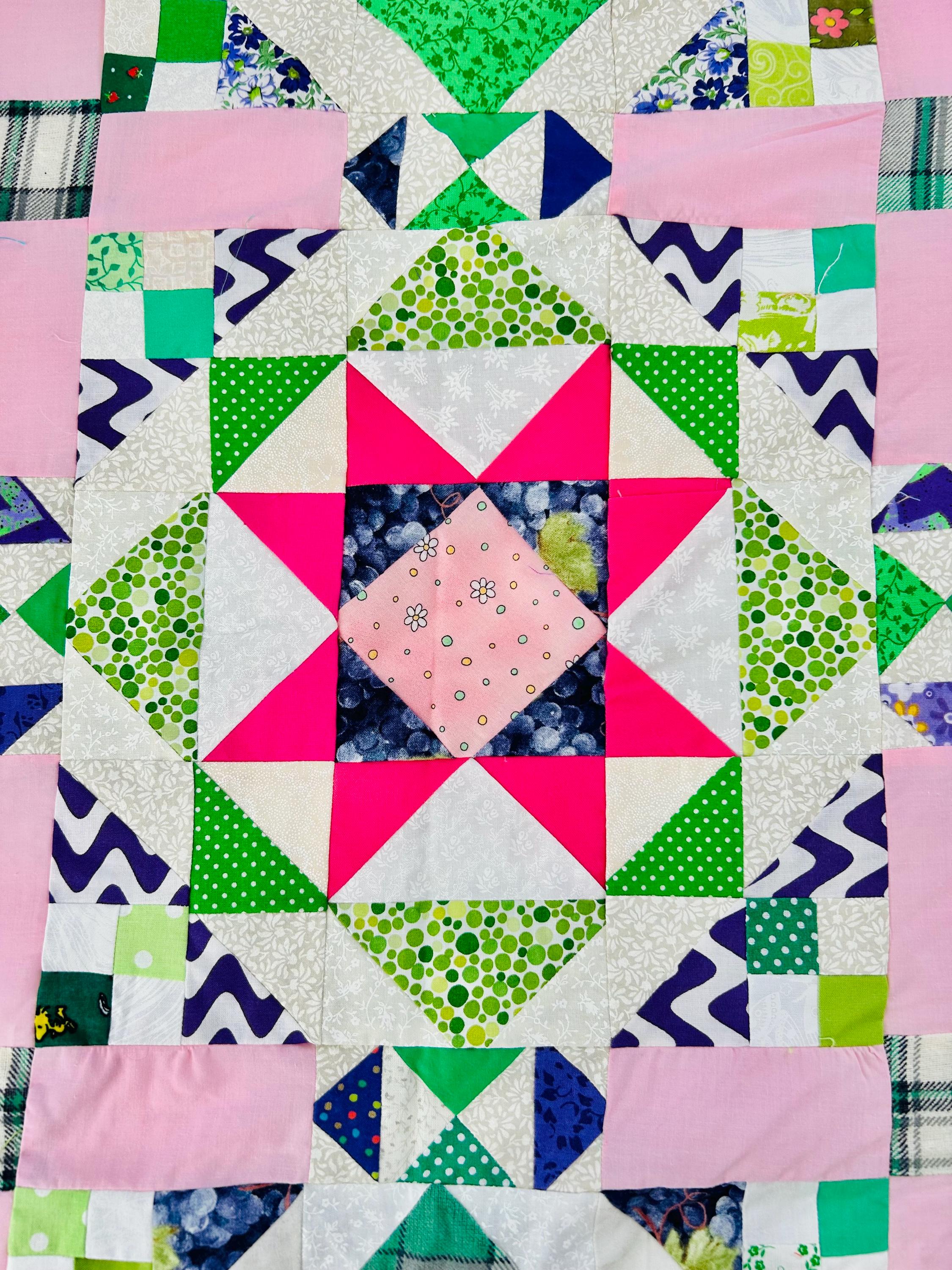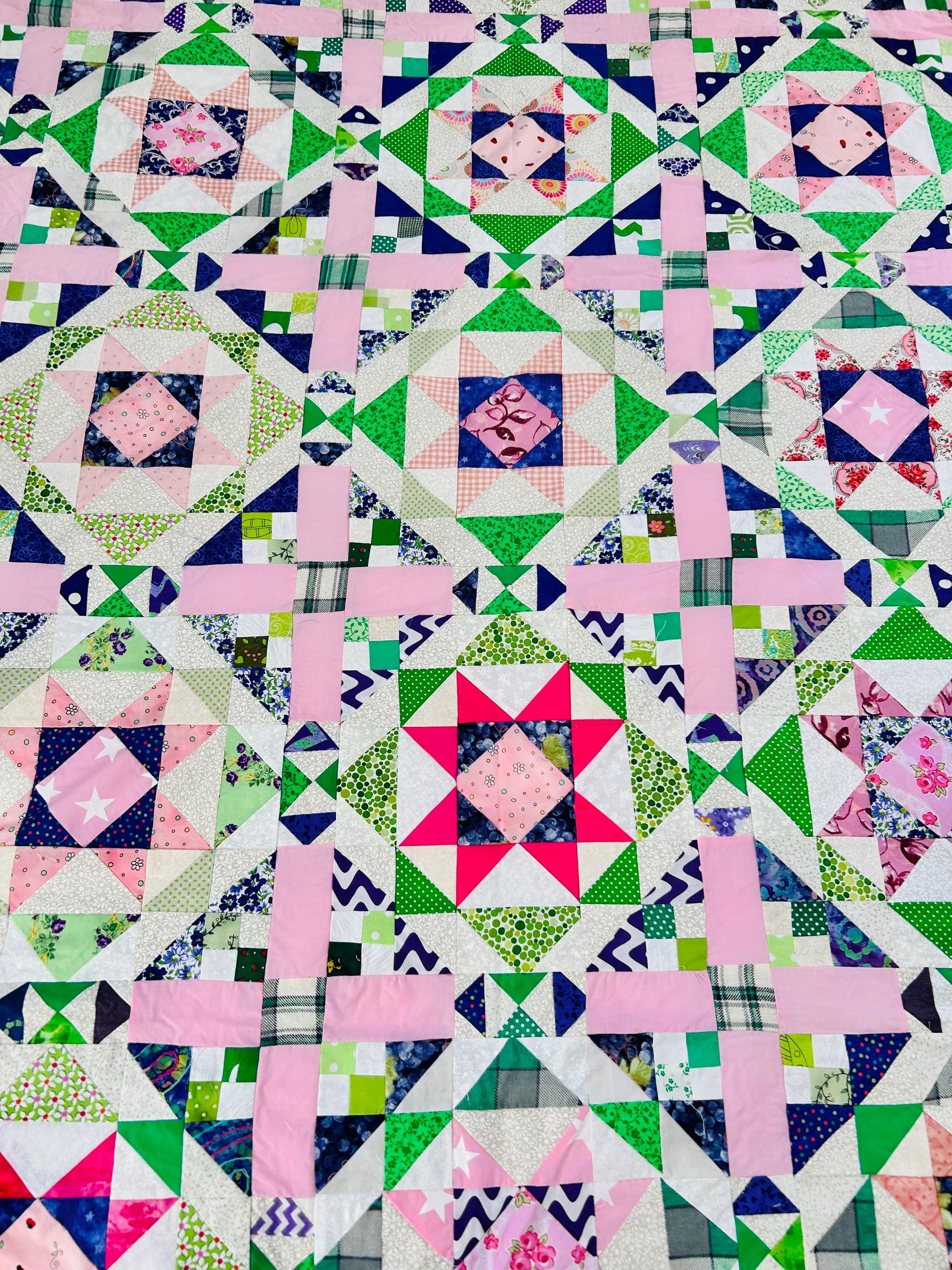 This is a cheerful and beautifully pieced modern Ohio Star Quilt Top dating to the early 2000s and featuring a mix of star blocks and scrappy patchwork sashing in pink, purple and green.