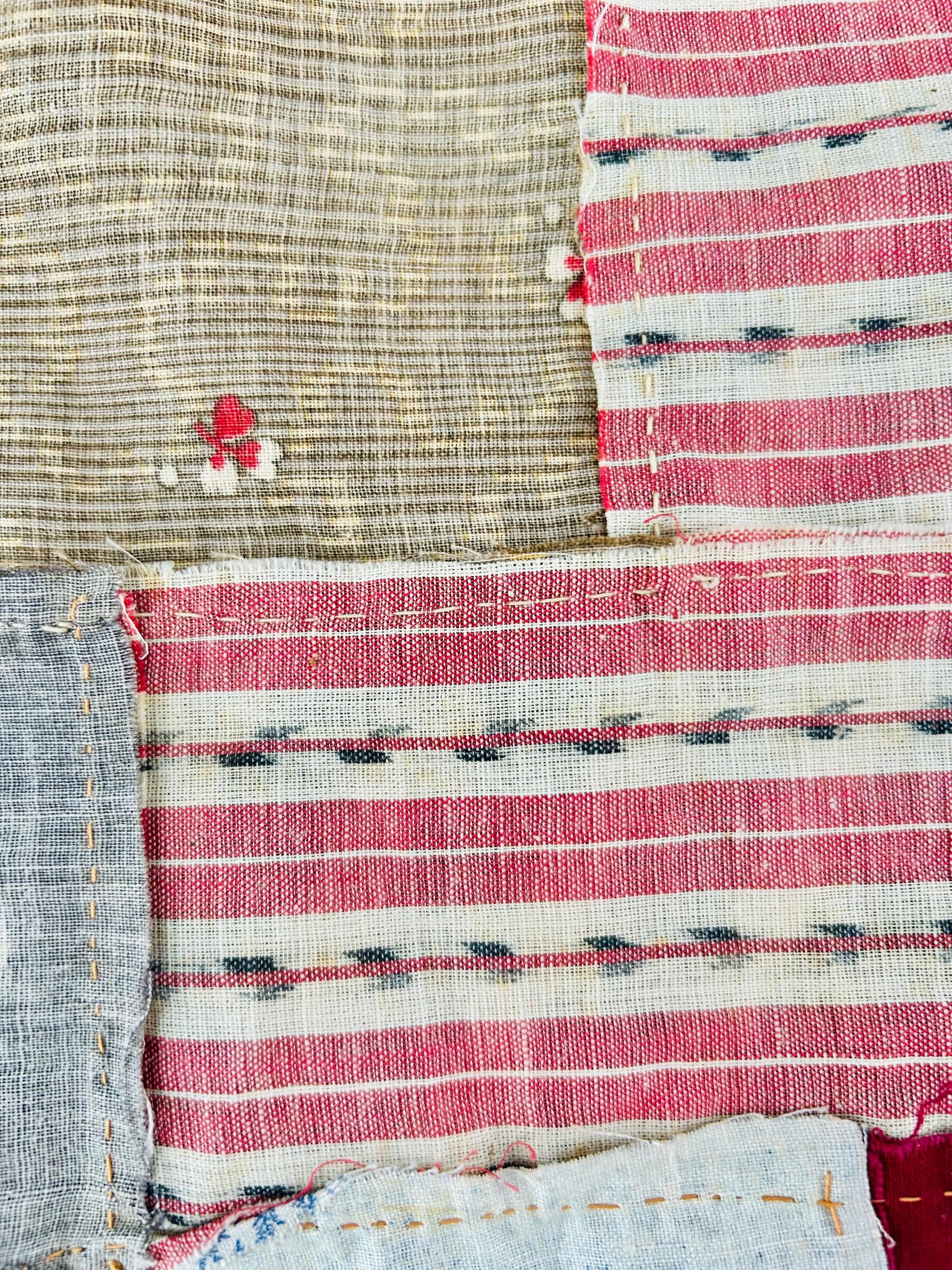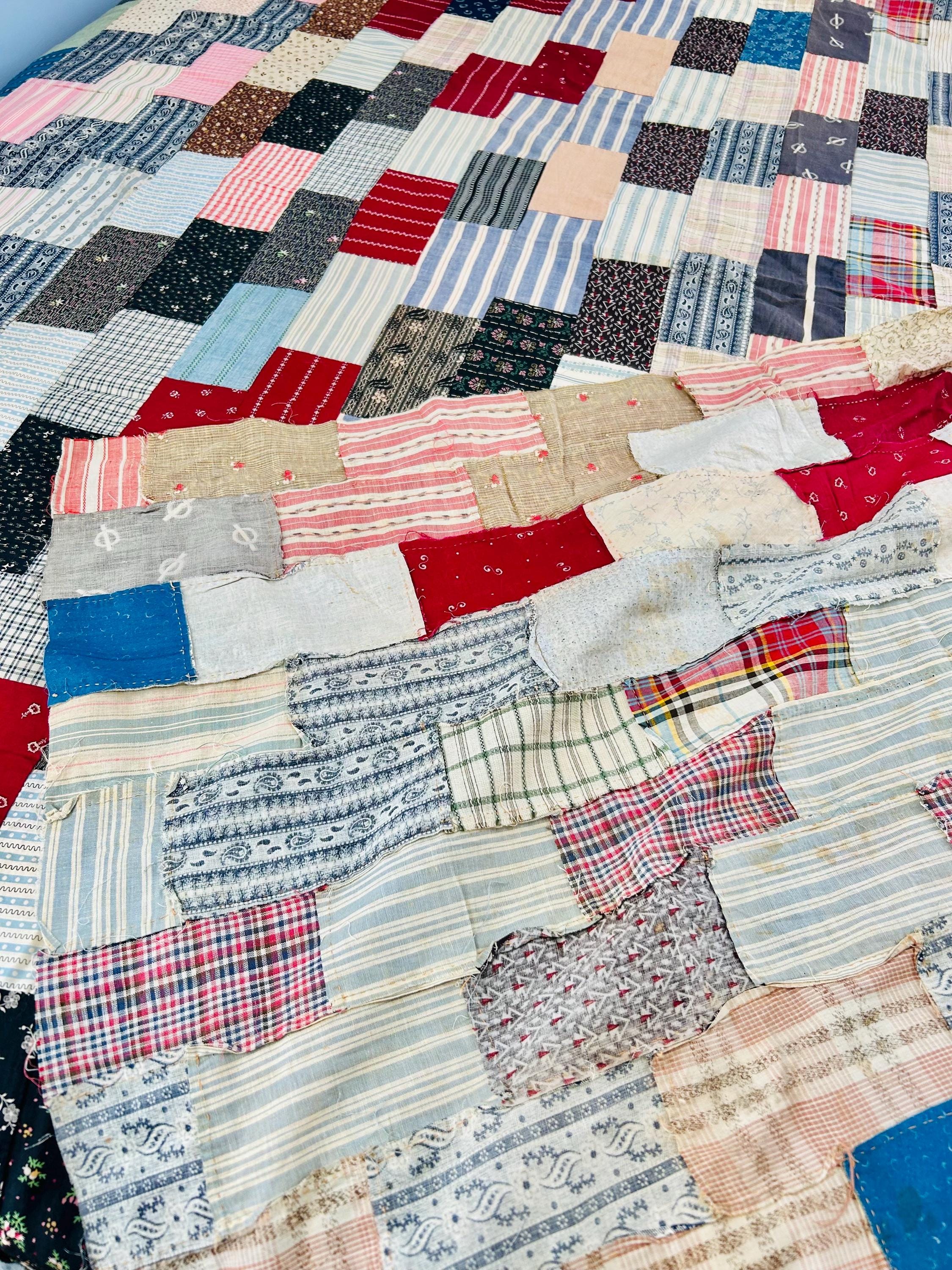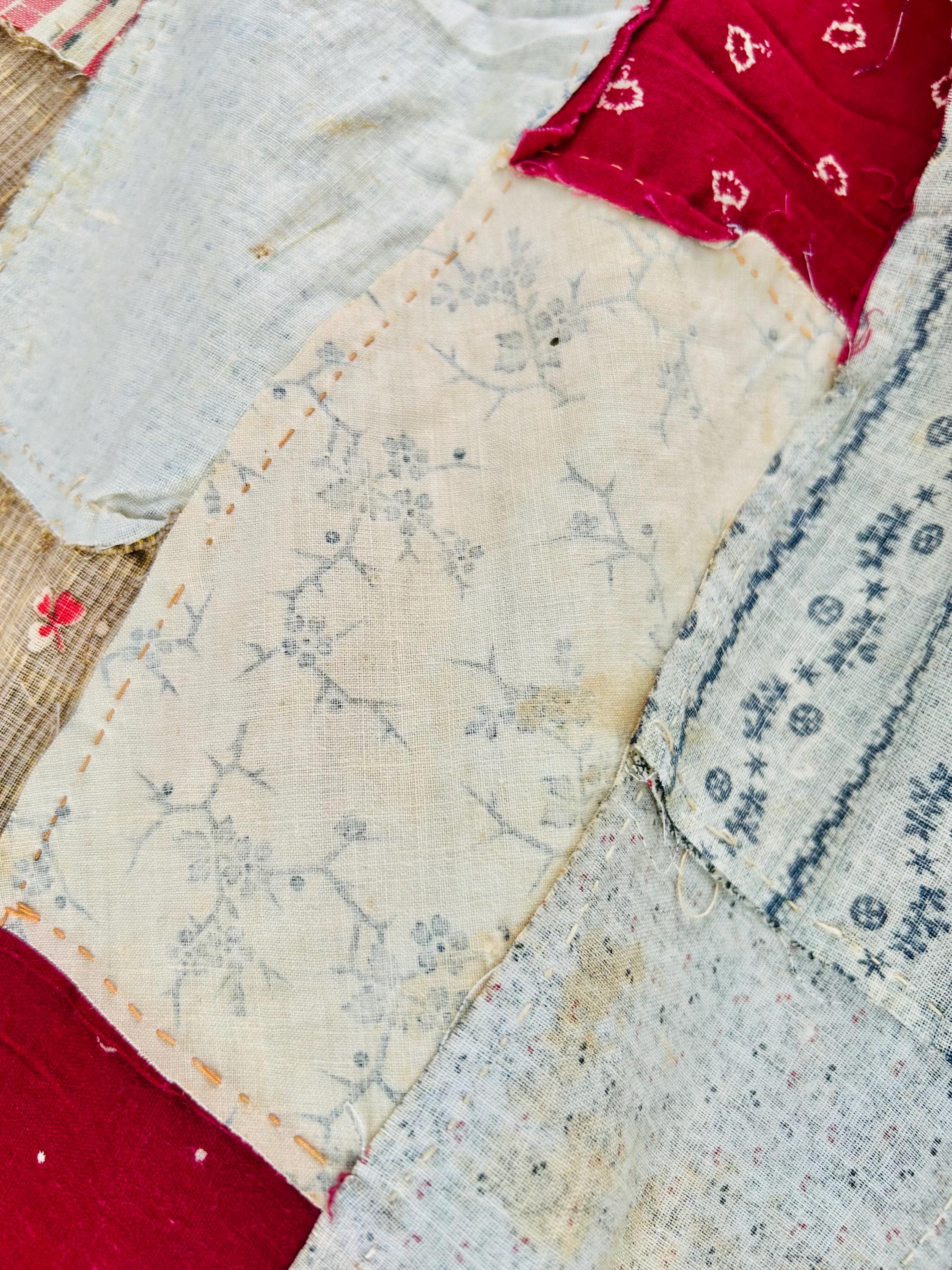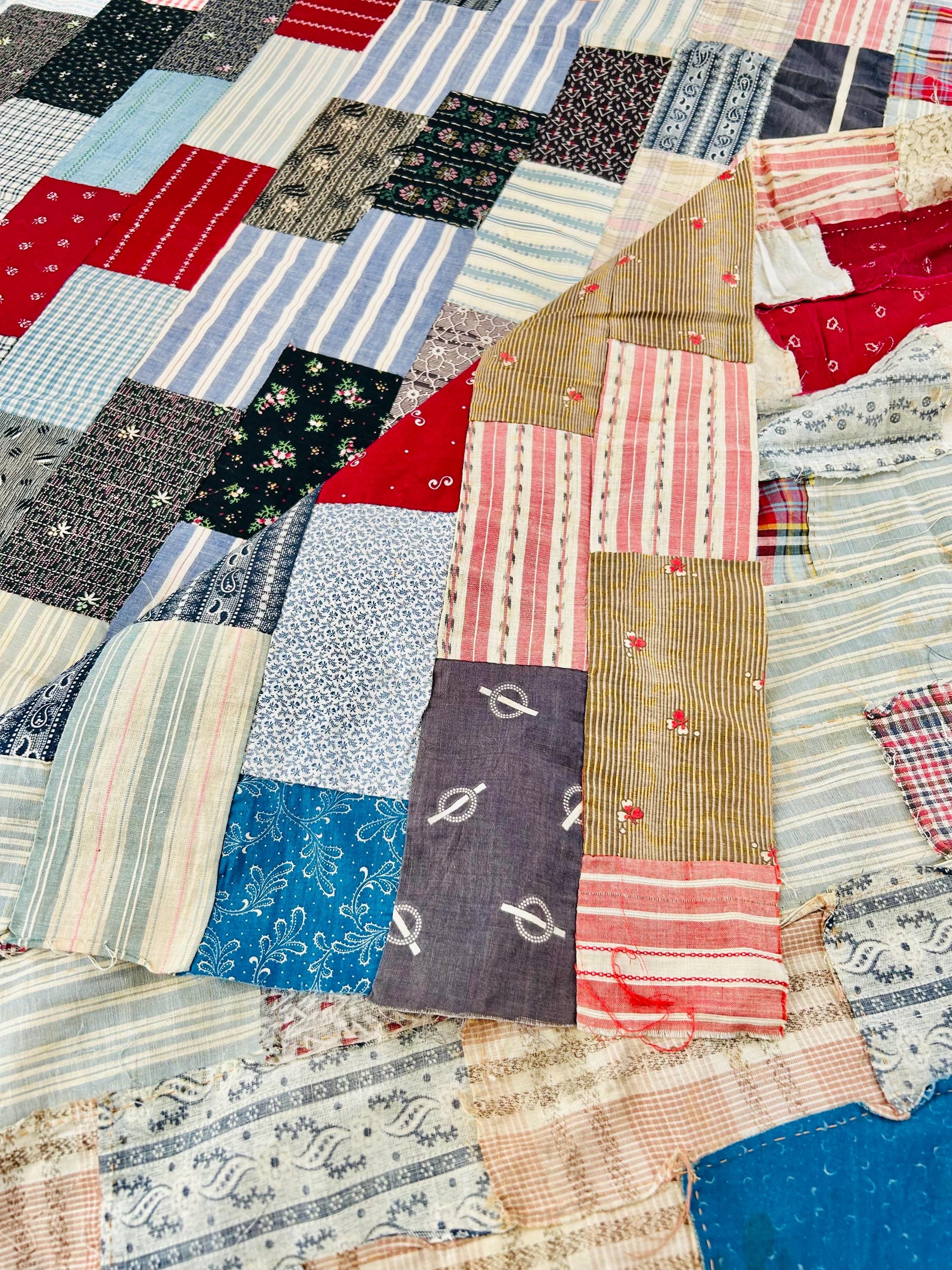 Details: • Entirely hand pieced • Visible hand basting stitches remain in places • Unquilted (quilt top only – no batting, no backing) • Cotton fabrics • Size: 80” x 100”