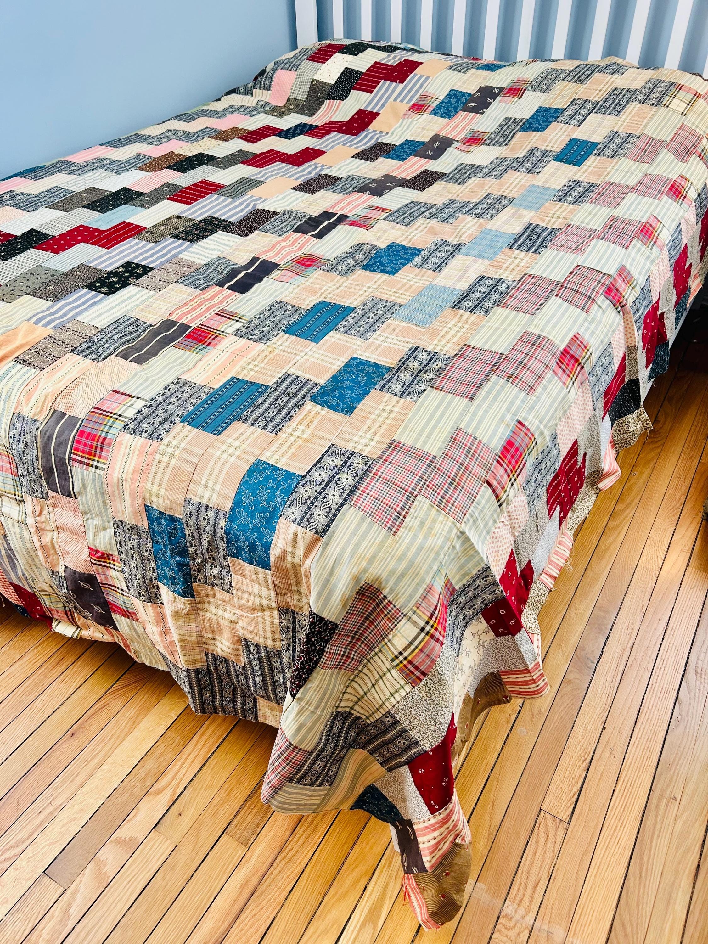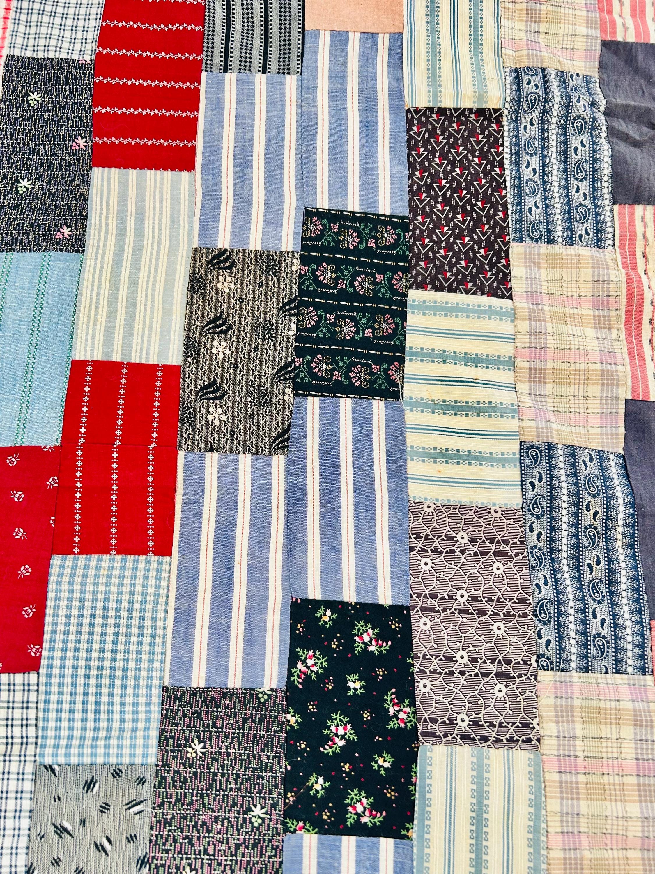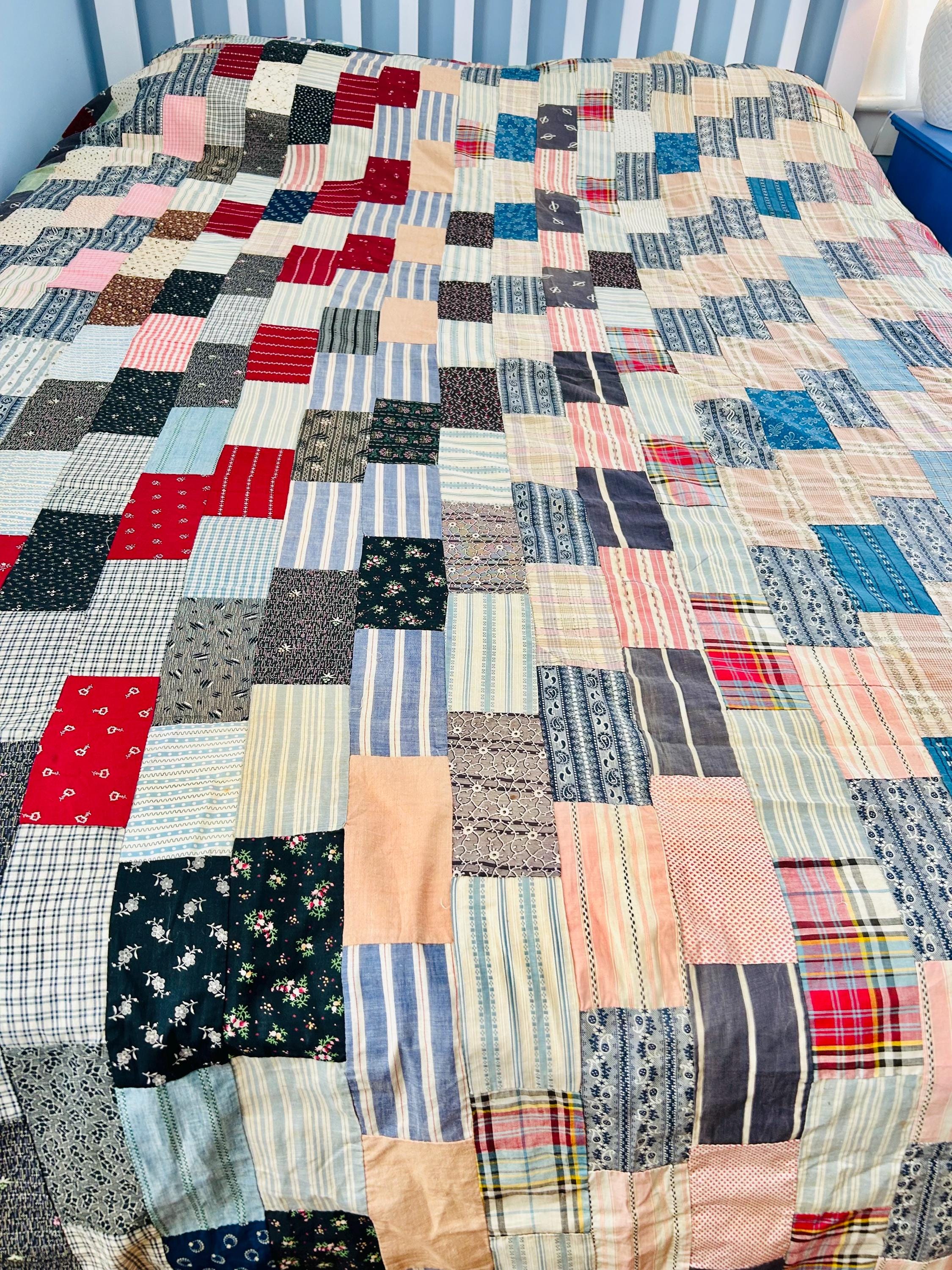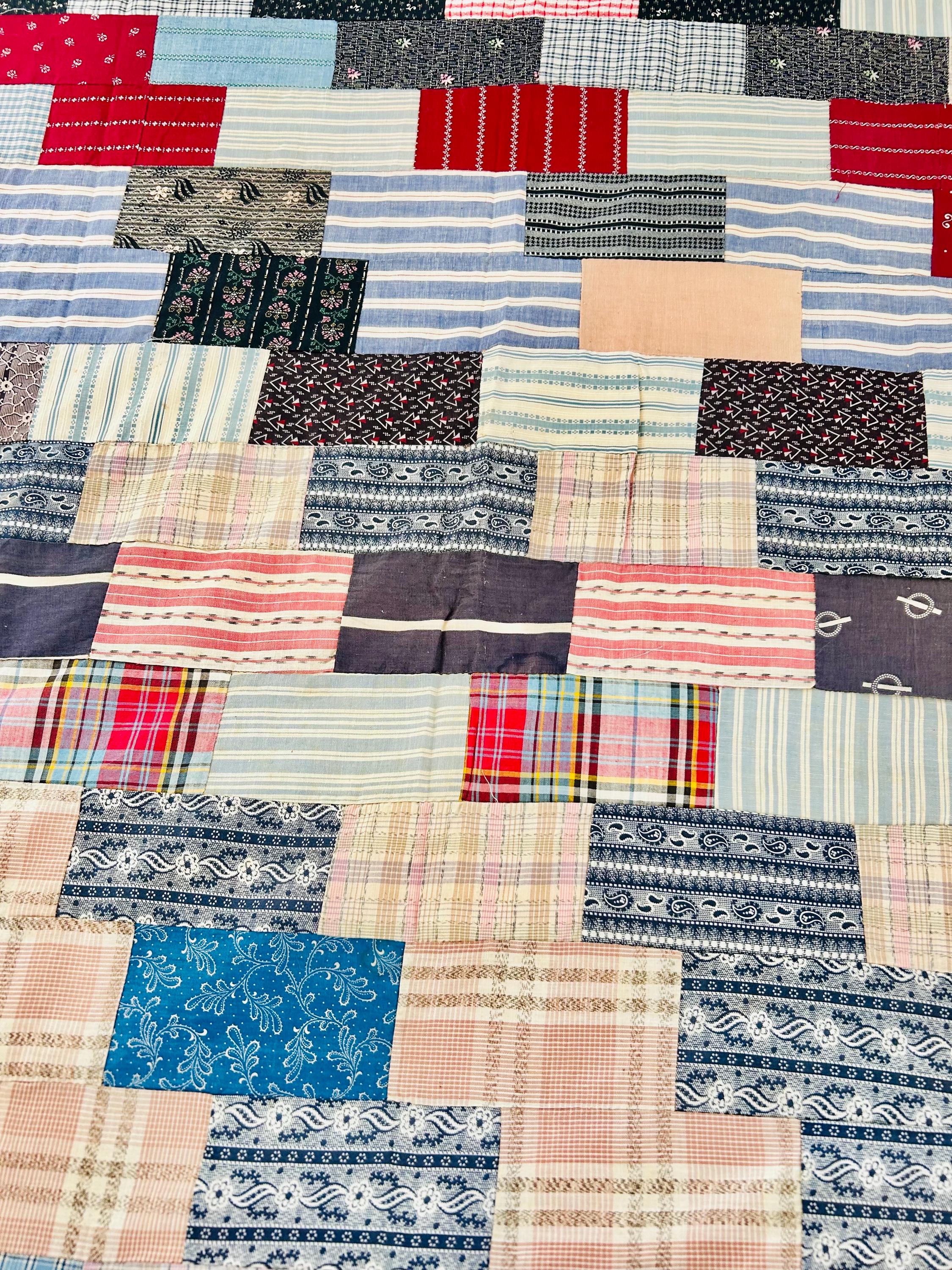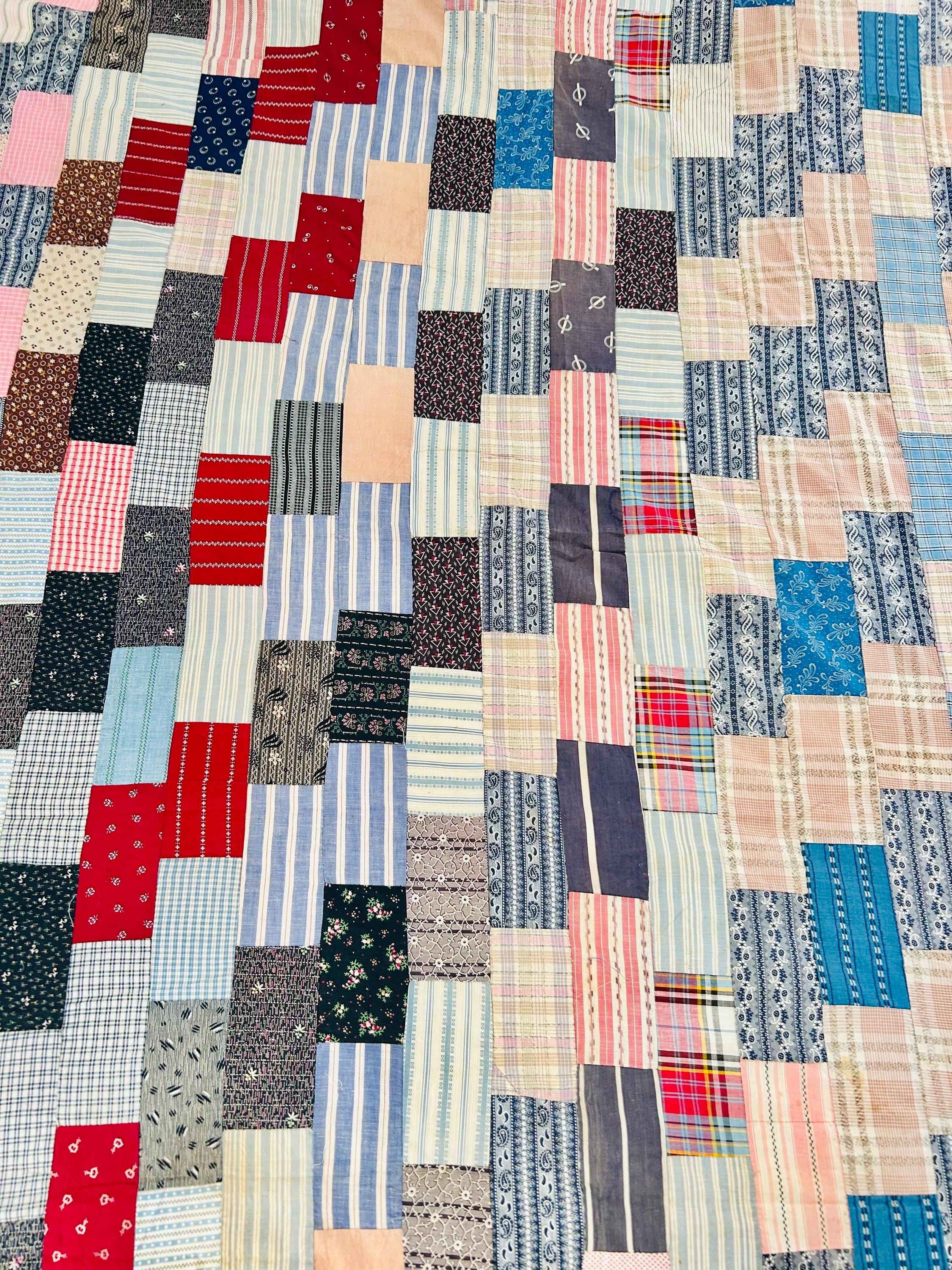 Details: • Entirely hand pieced • Visible hand basting stitches remain in places • Unquilted (quilt top only – no batting, no backing) • Cotton fabrics • Size: 80” x 100”