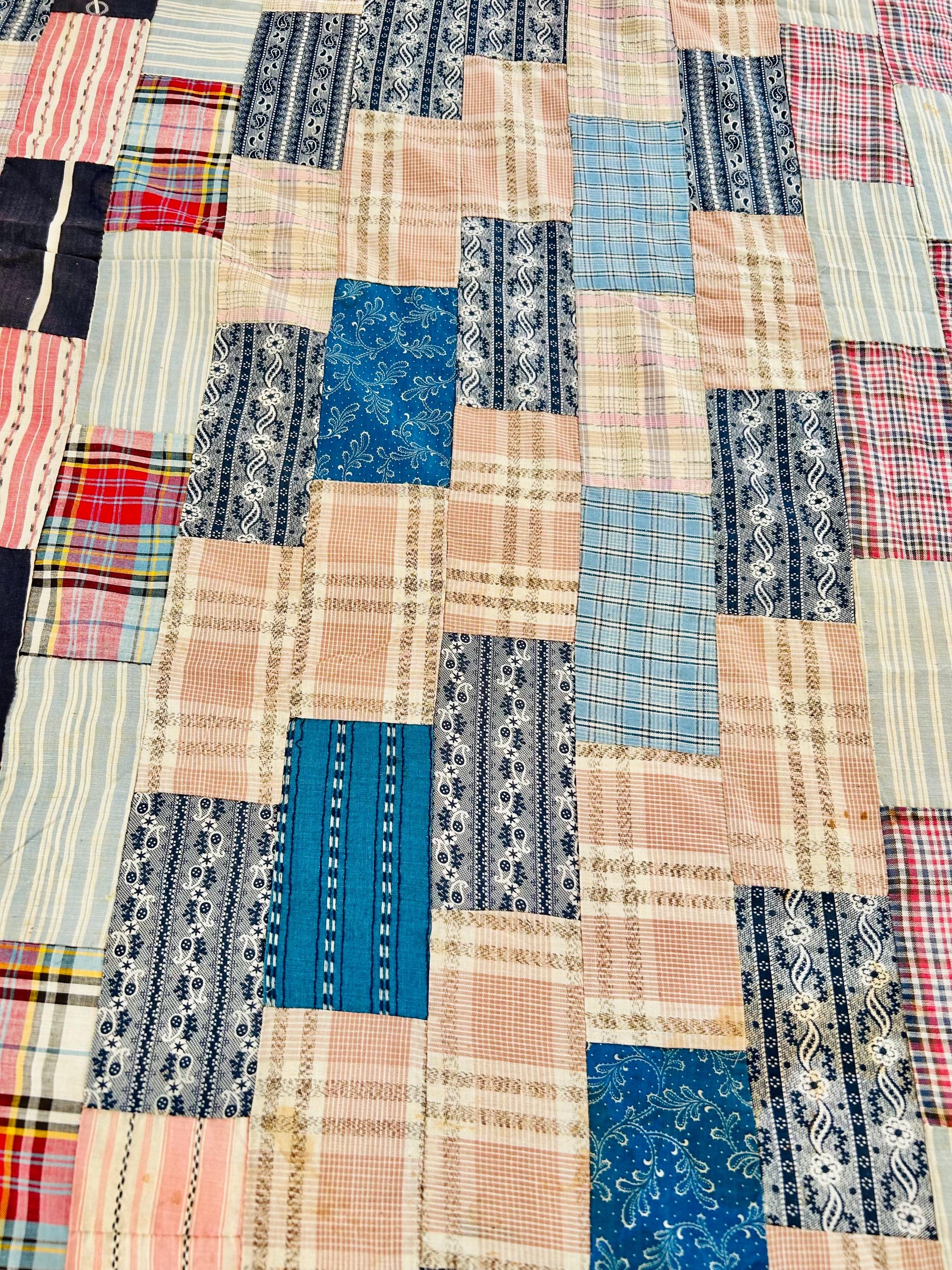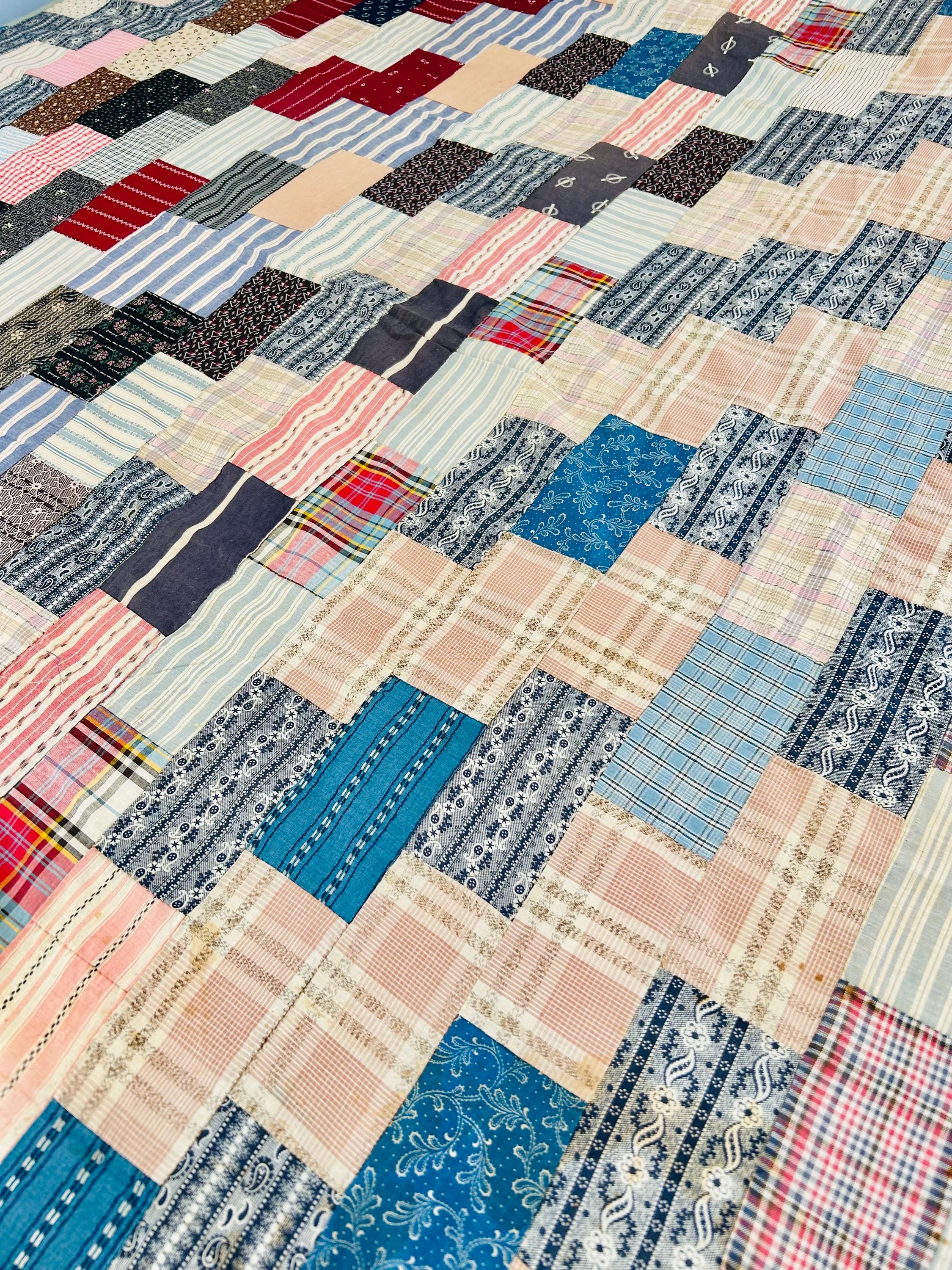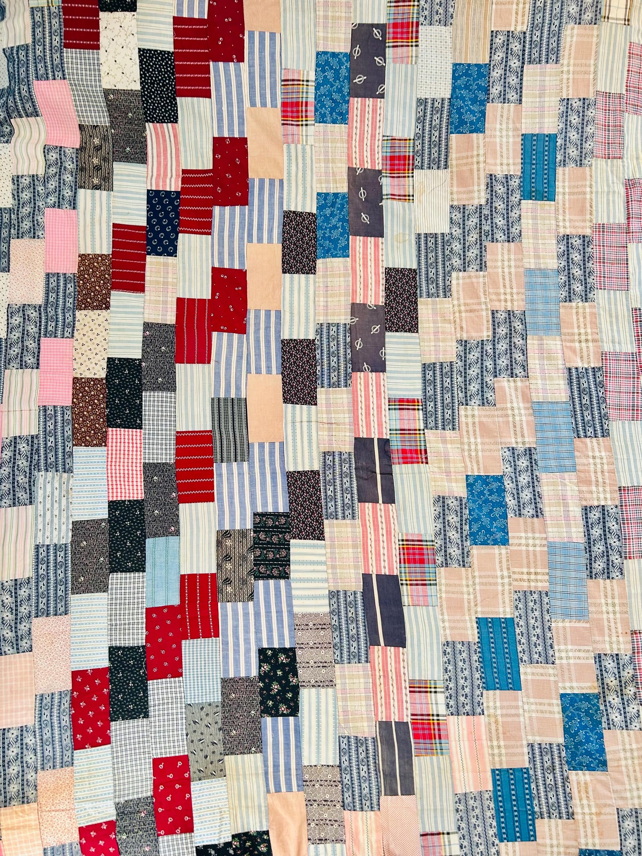 This is a wonderful oversized vintage Chevron or Stepped Zig-Zag Quilt Top dating to approximately the 1920s, this top is beautifully hand pieced from a rich assortment of period cotton fabrics, including classic striped shirtings, small-scale geometrics, florals, ticking stripes, and charming prints in turquoise, navy, red, peach, and soft blues.