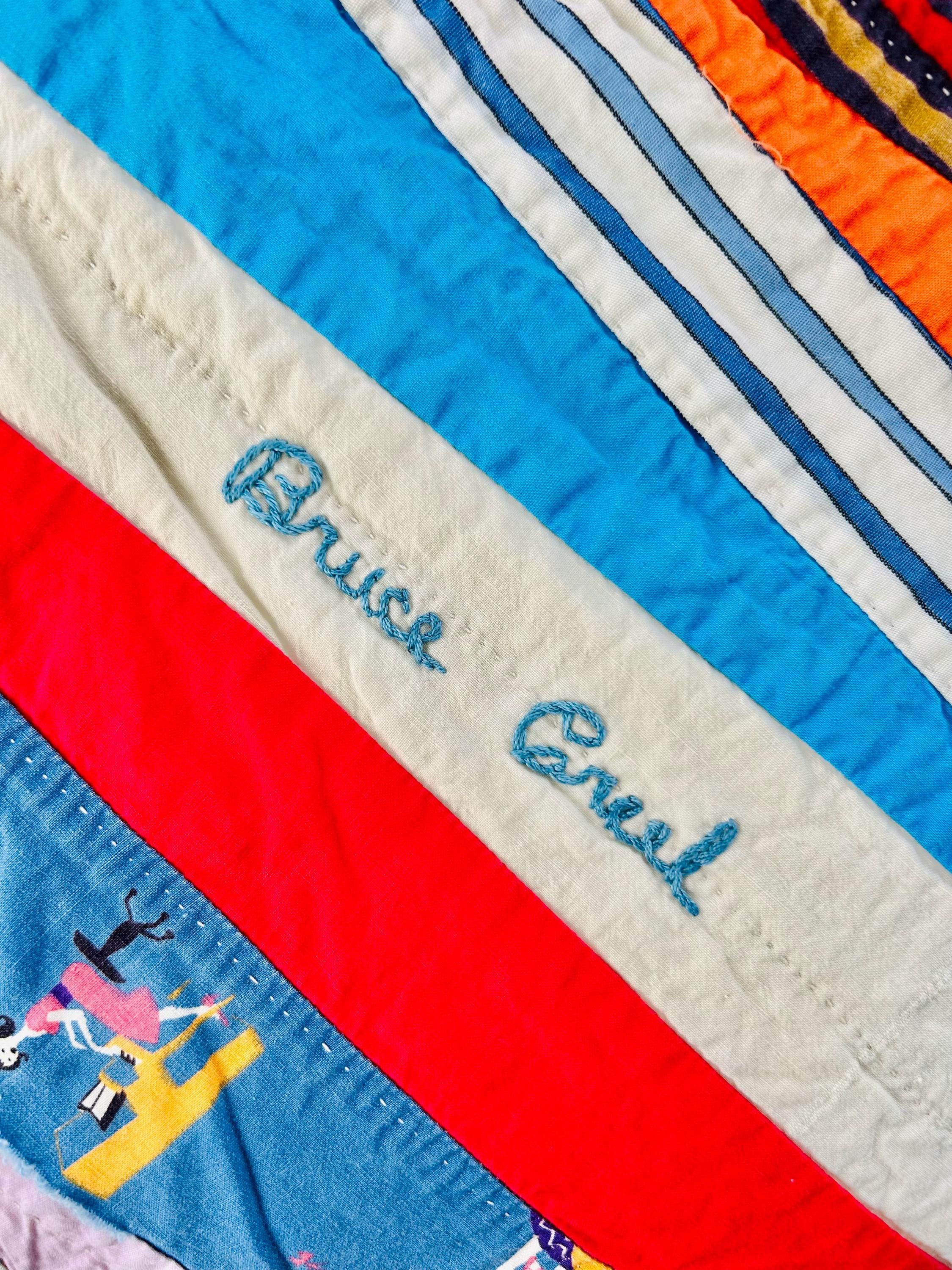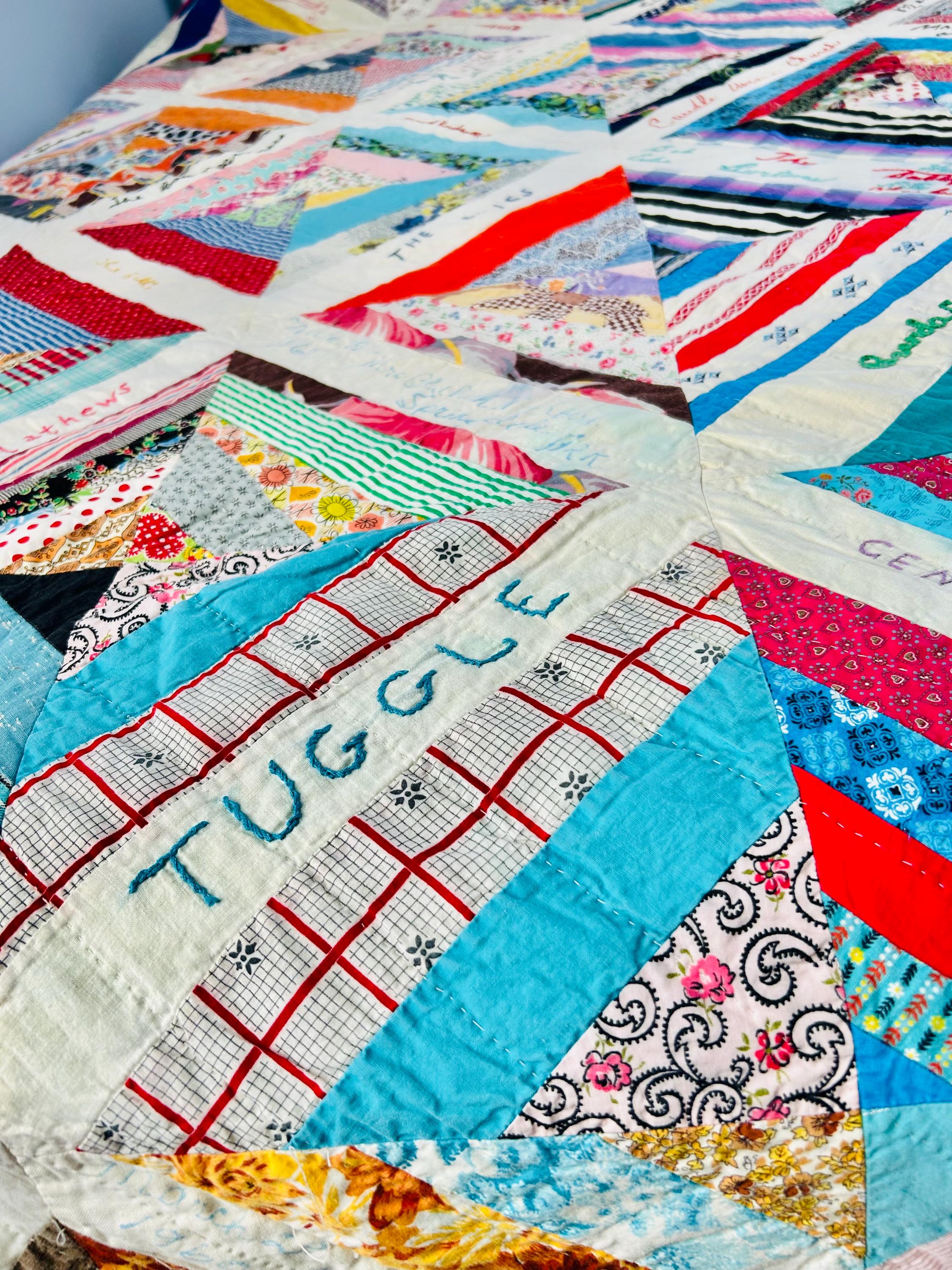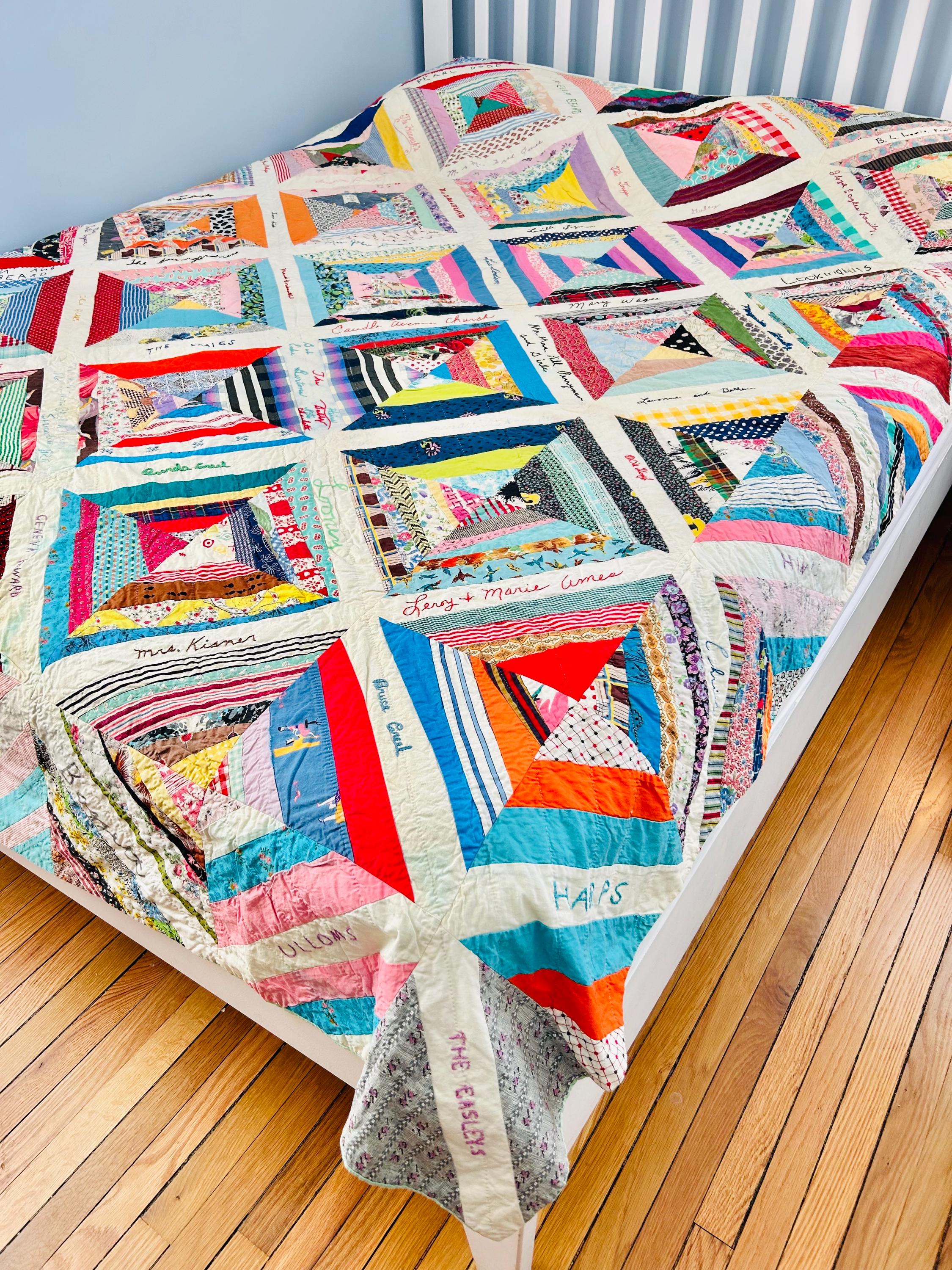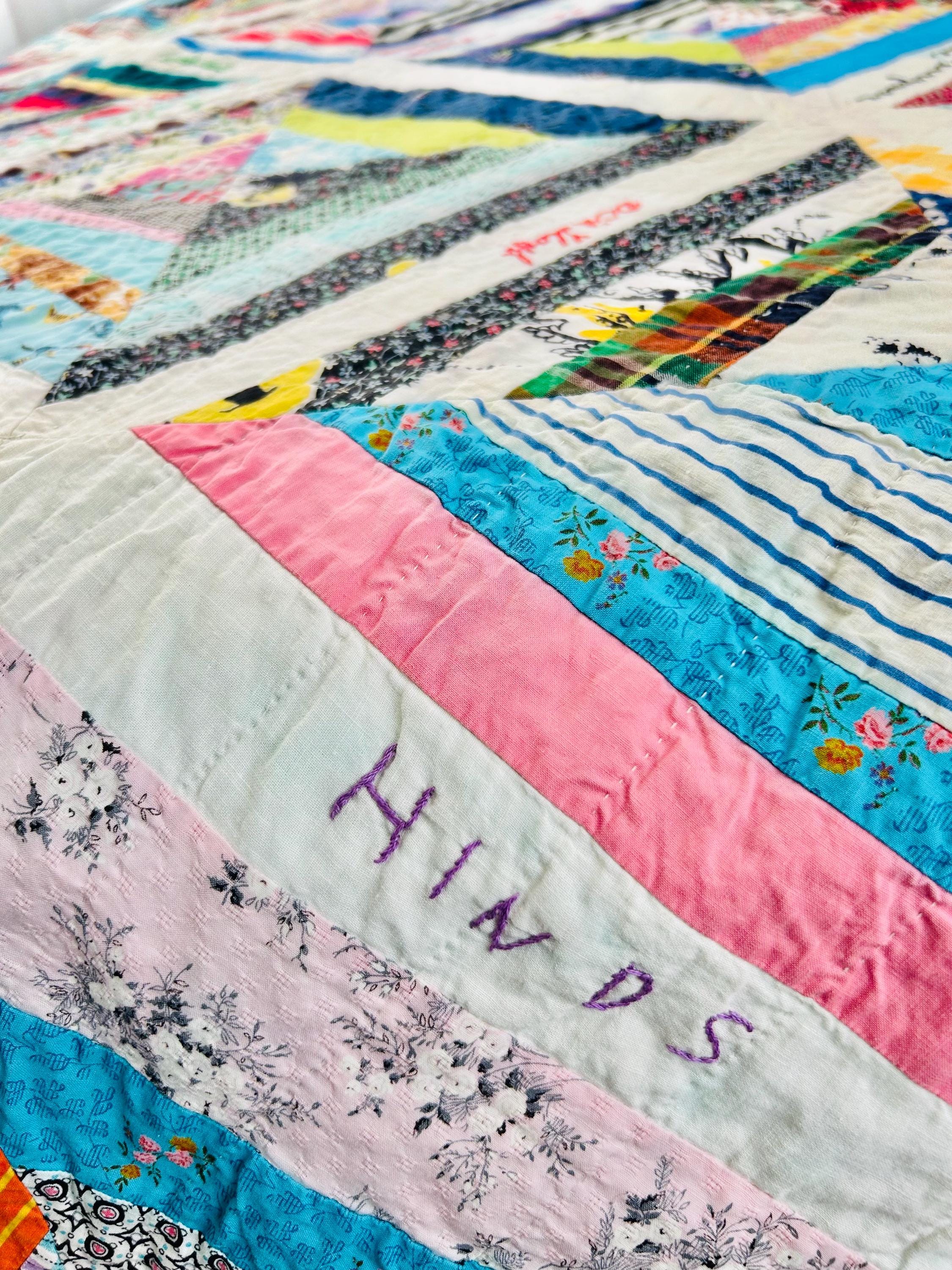 Details: • Date: March 29, 1960 • Location: "Springdale, Ark." (Embroidered on a featured panel) • Affiliation: "Caudle Avenue Church" • Names include: "The Craigs," "The Burtons," "Mrs. Beulah Hubbard," "The Baumgardners," and many more. • Fabric: A delightful mix of 1950s/60s cotton scraps, including ginghams, florals, stripes, and novelty prints. • Dimensions: 68” x 86” (Large enough for a Full or Queen bed)