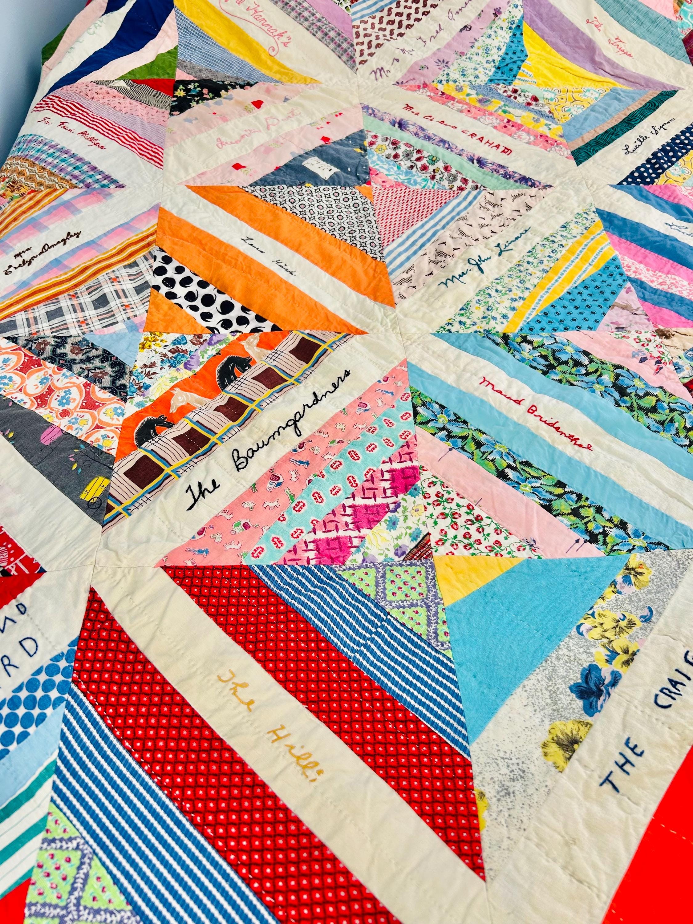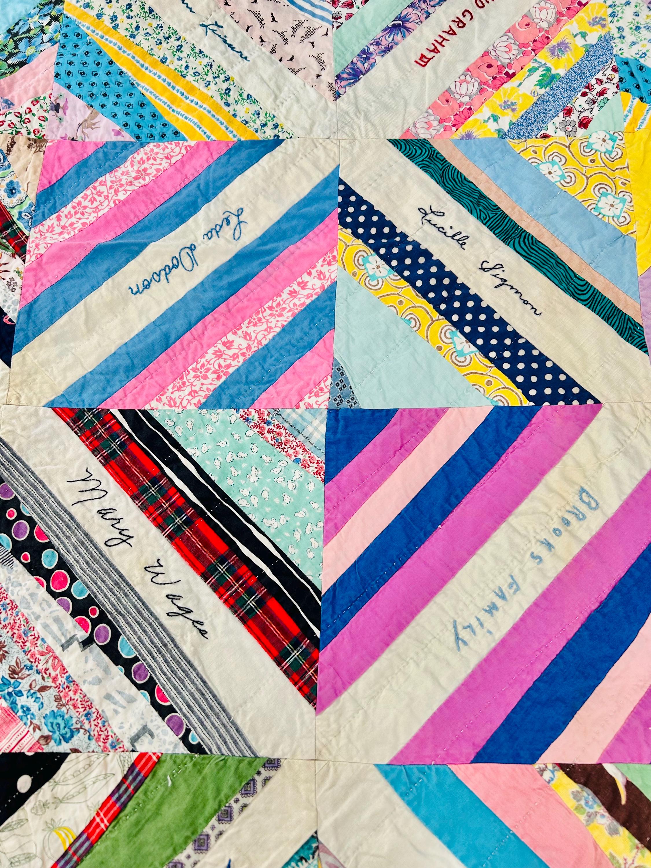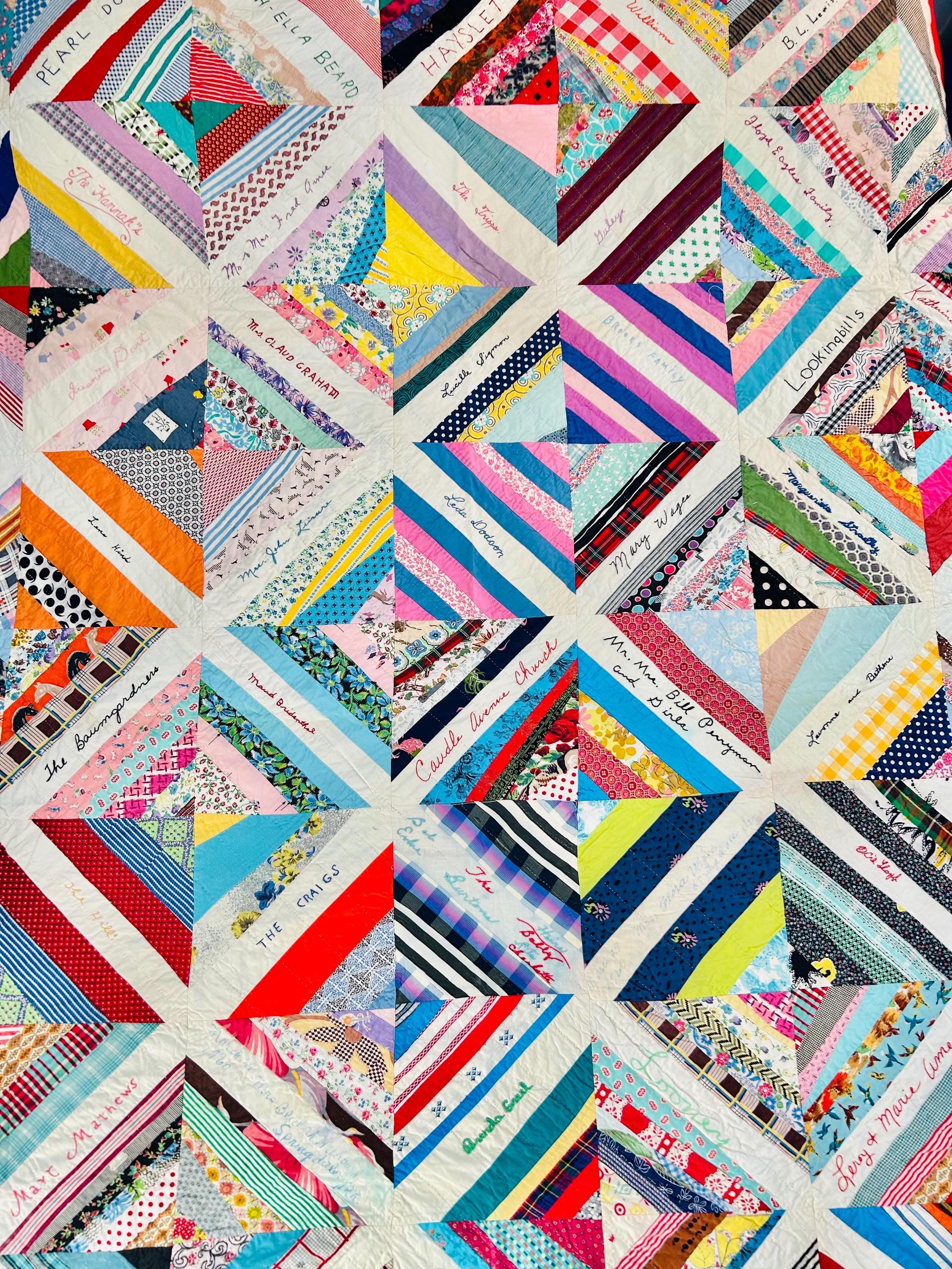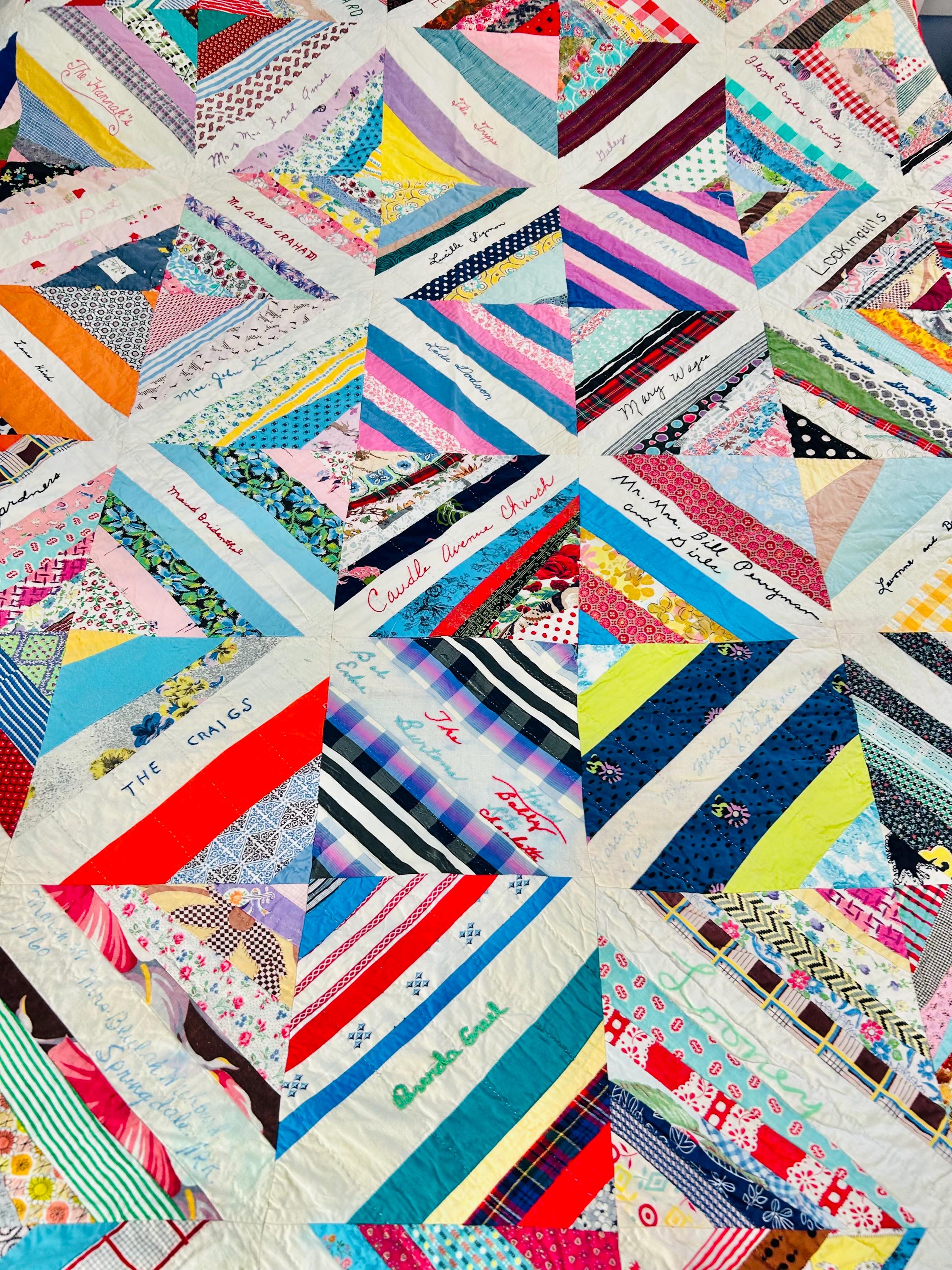 This hand-stitched "Friendship" or "Subscription" String Quilt is dated March 29, 1960, and was put together by members of the Caudle Avenue Baptist Church in Springdale, Arkansas. Signature quilts of this era (65 years ago) were often created as fundraisers or to commemorate church milestones, with community members paying a small fee to have their names immortalized in thread.