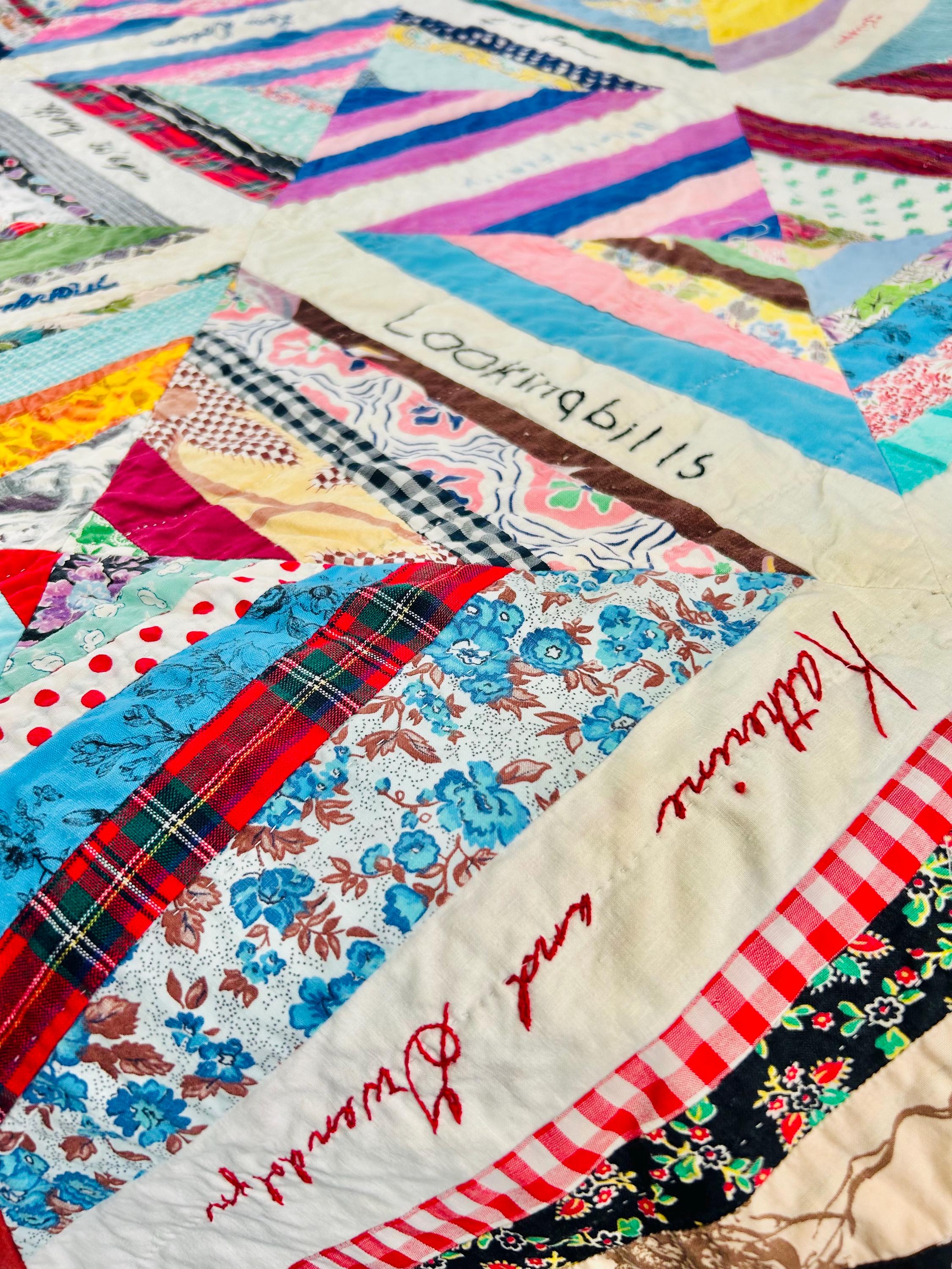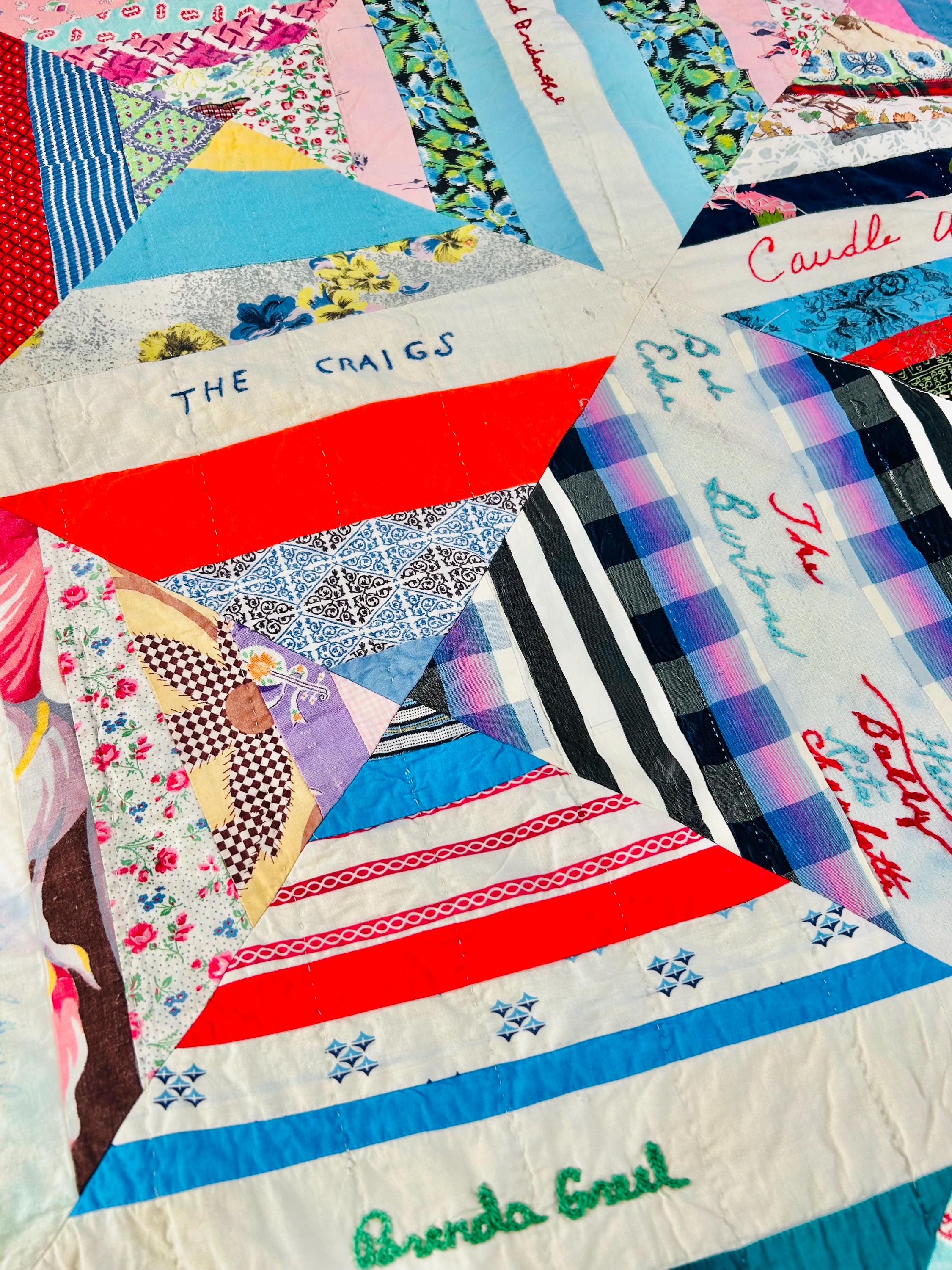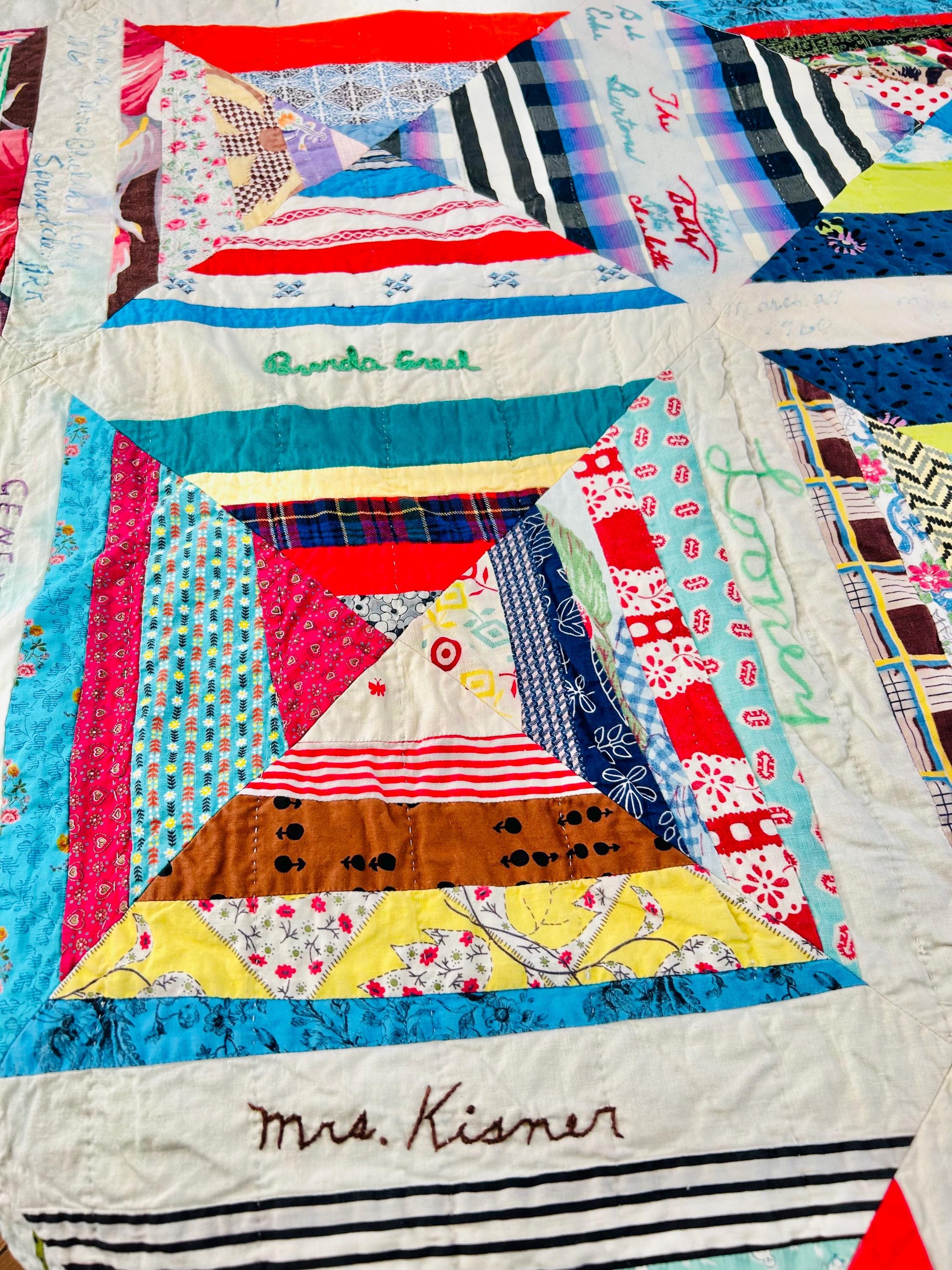 This hand-stitched "Friendship" or "Subscription" String Quilt is dated March 29, 1960, and was put together by members of the Caudle Avenue Baptist Church in Springdale, Arkansas. Signature quilts of this era (65 years ago) were often created as fundraisers or to commemorate church milestones, with community members paying a small fee to have their names immortalized in thread.