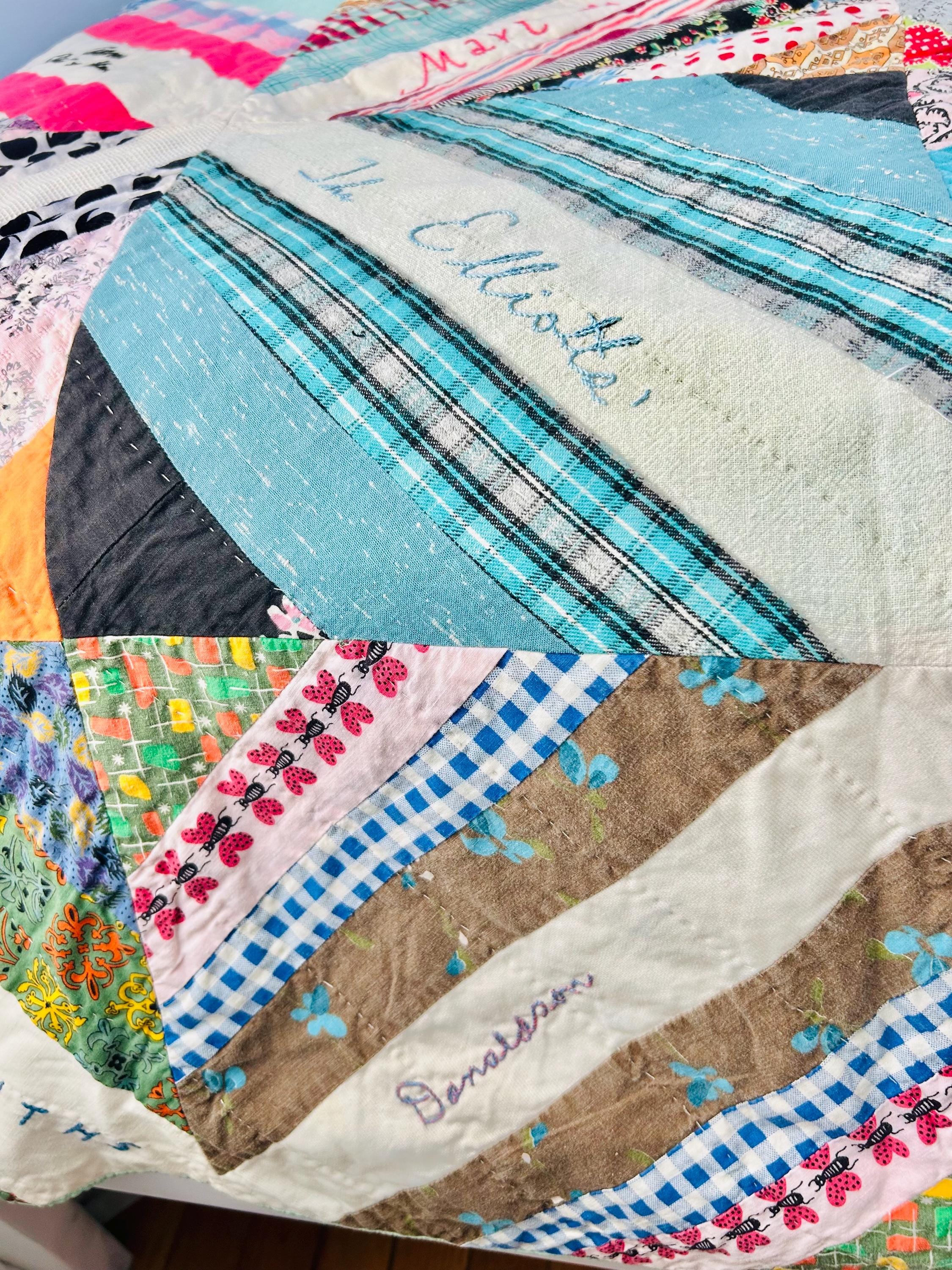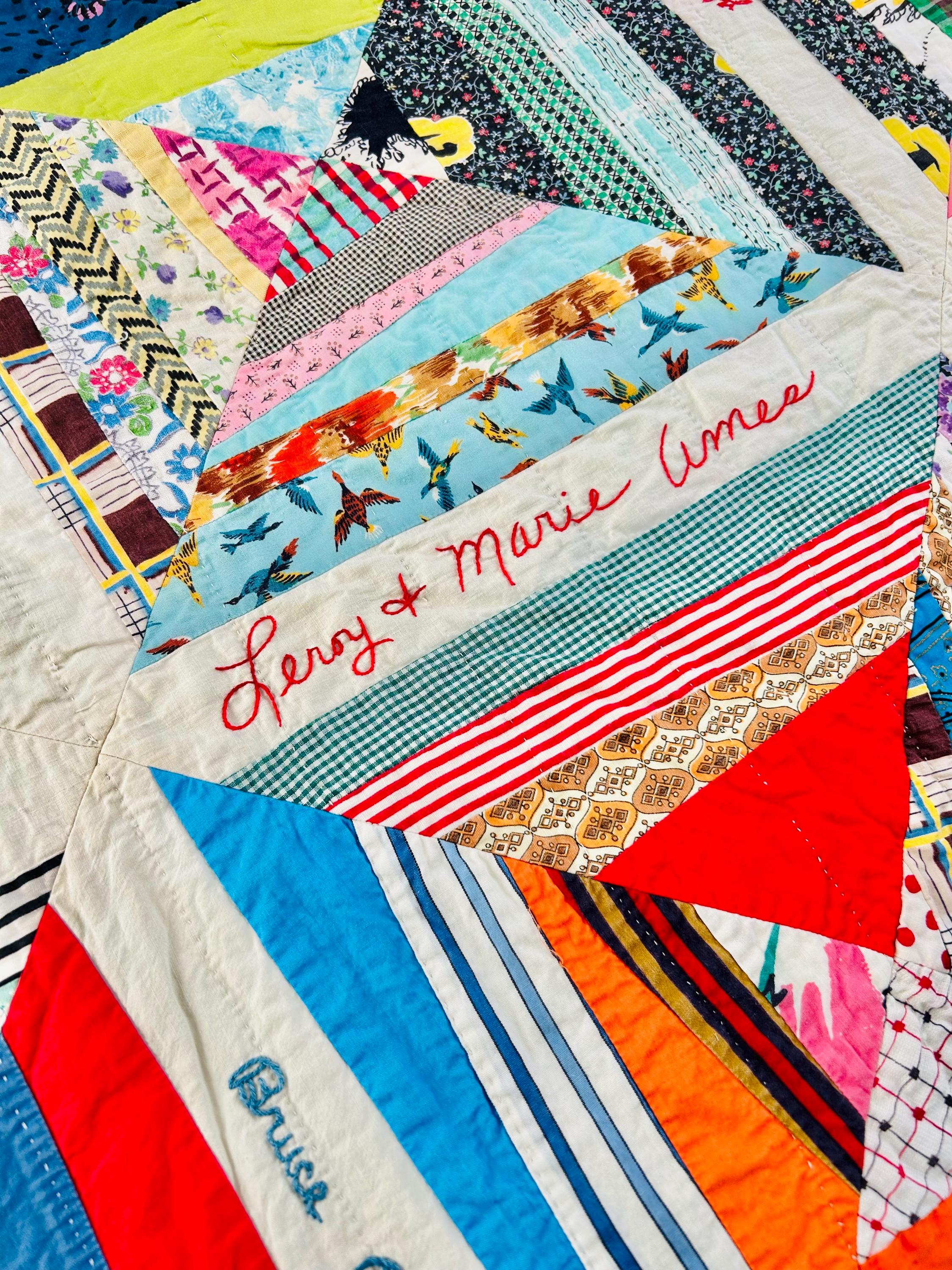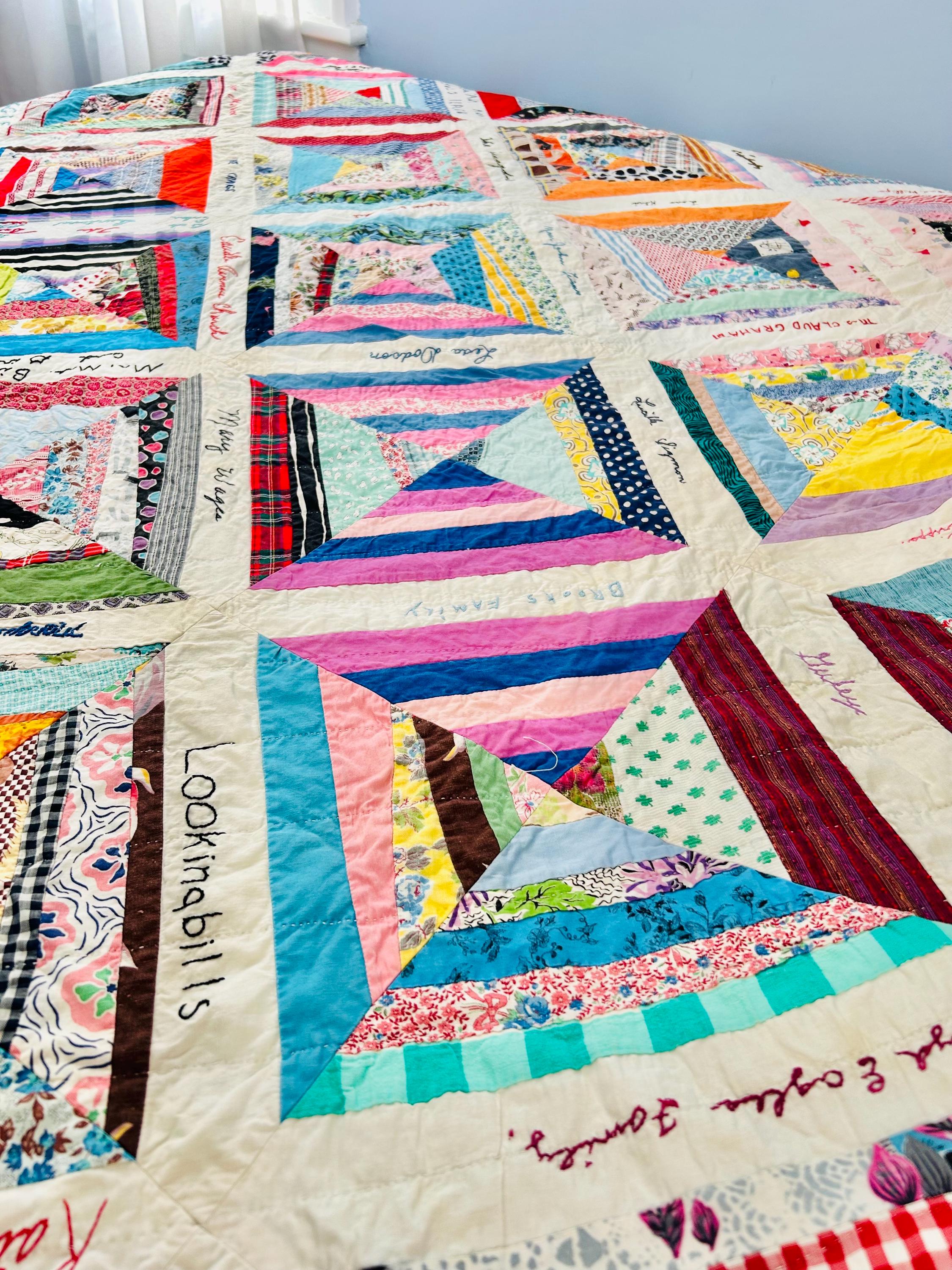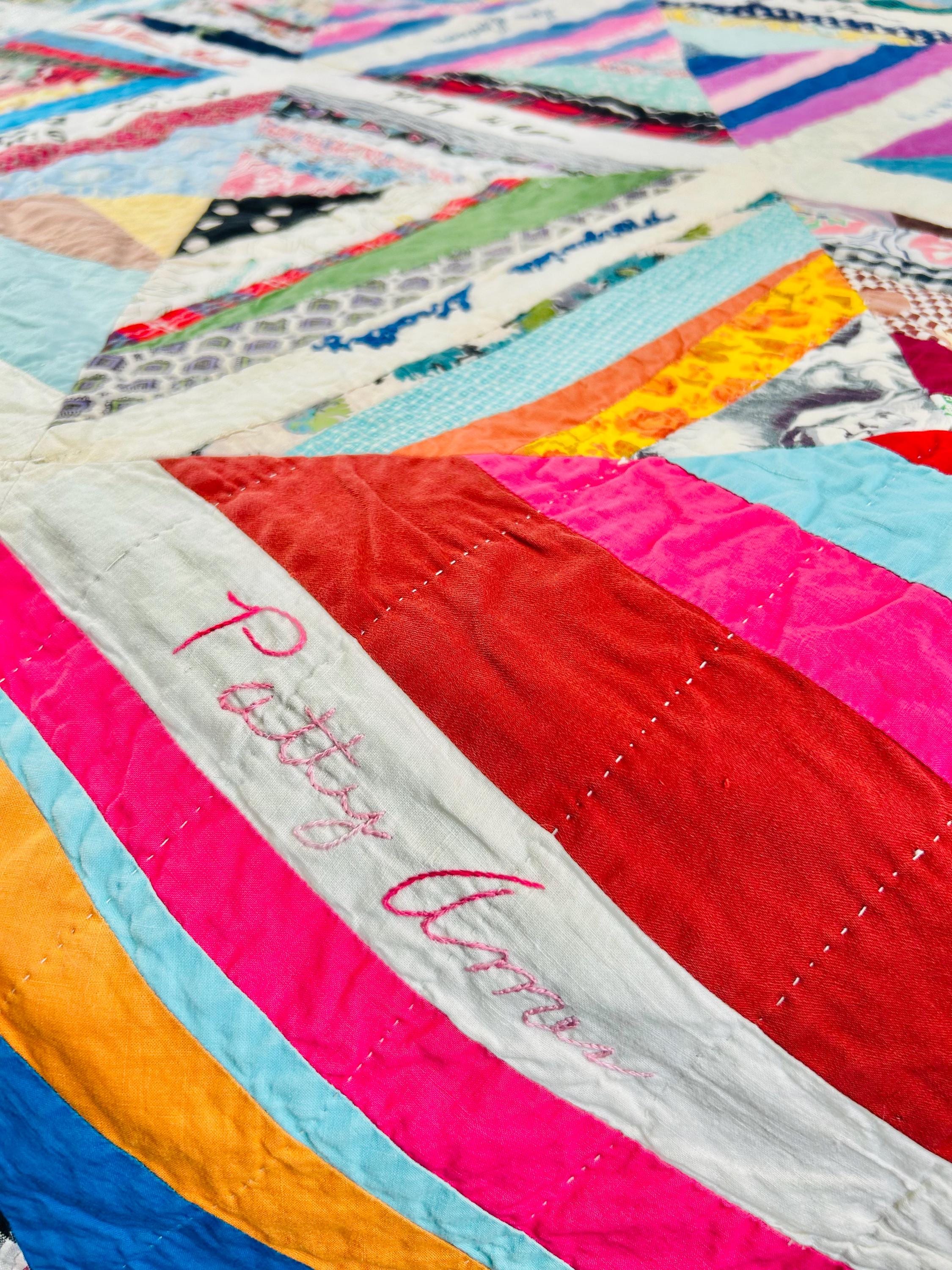 This hand-stitched "Friendship" or "Subscription" String Quilt is dated March 29, 1960, and was put together by members of the Caudle Avenue Baptist Church in Springdale, Arkansas. Signature quilts of this era (65 years ago) were often created as fundraisers or to commemorate church milestones, with community members paying a small fee to have their names immortalized in thread.