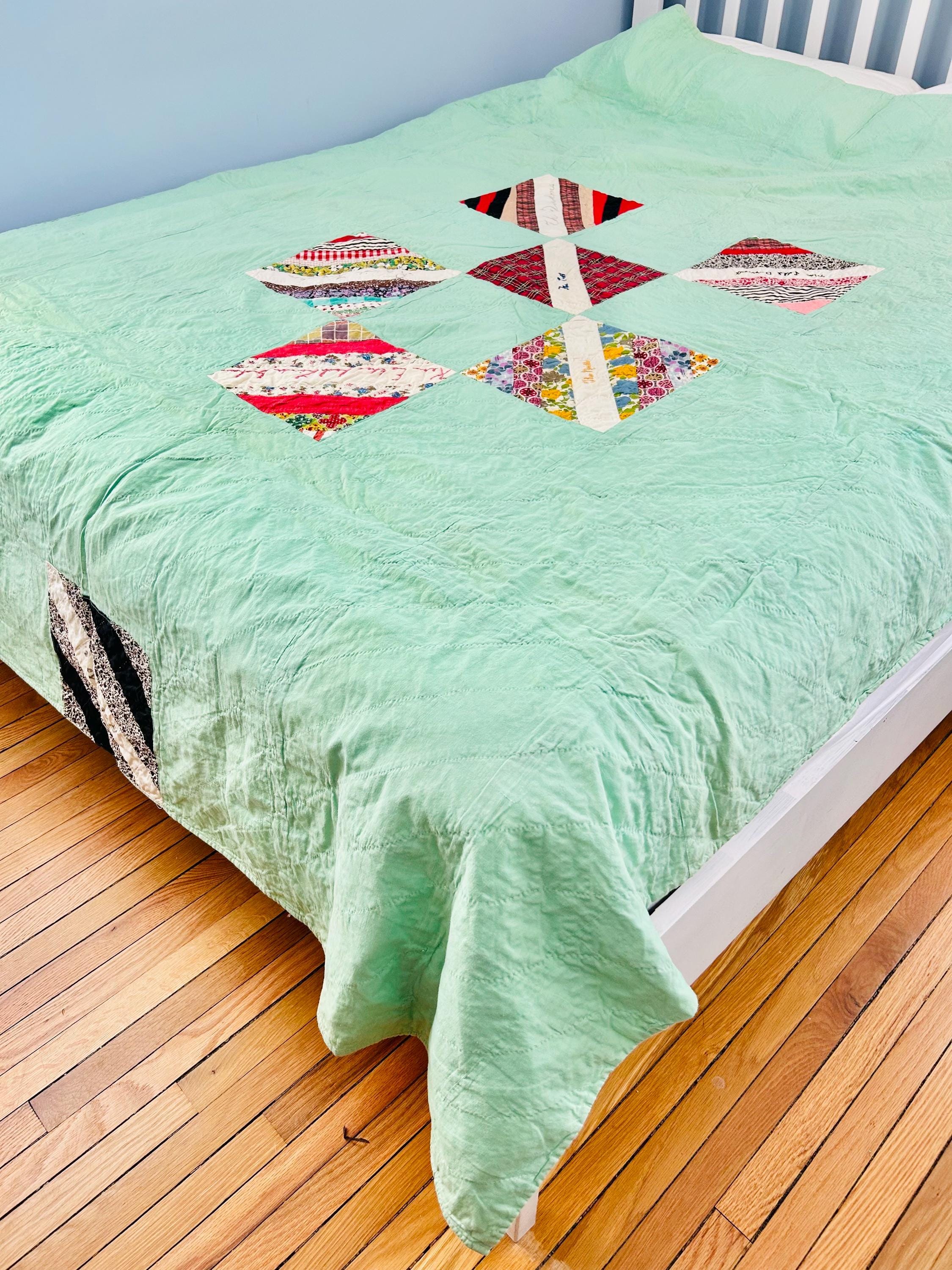 The mint-green cotton is turned to the front and hand-stitched to form the binding. There is no batting. The hand-quilting is in diagonals following the lines of the string-quilt patchwork.