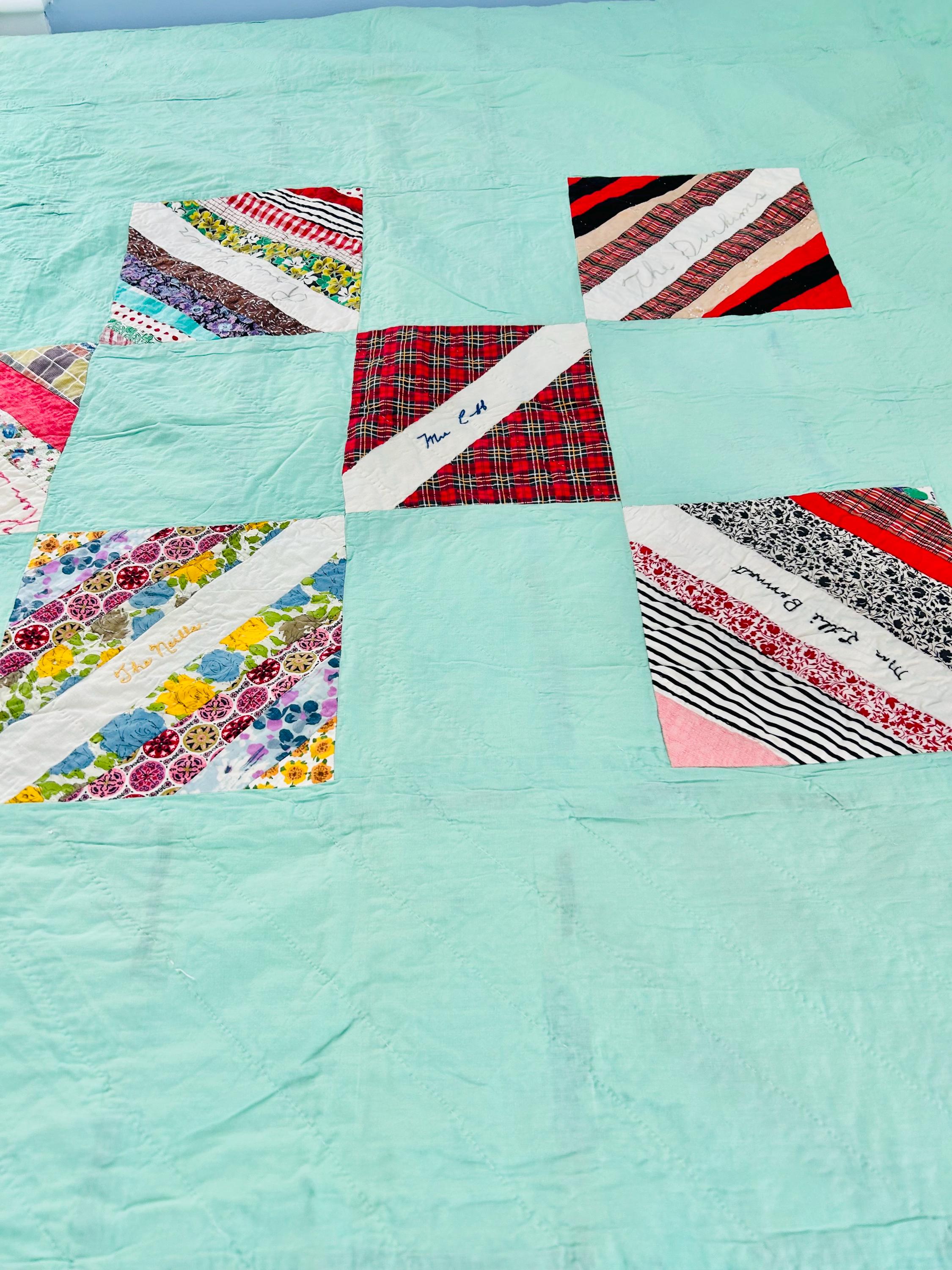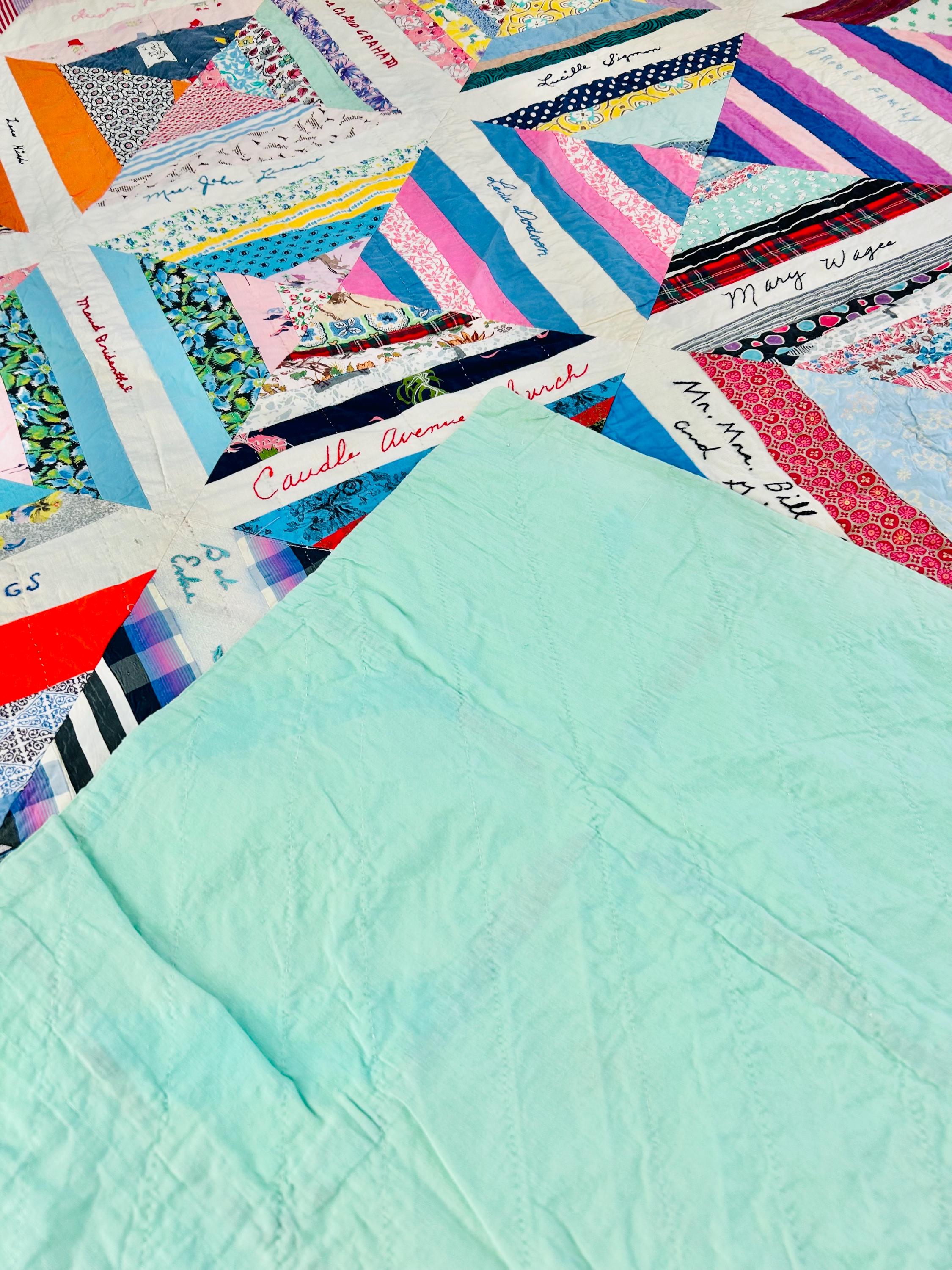 Unlike most traditional quilts, this one is a fully reversible "two-in-one" quilt with more signature blocks set in a "Medallion" layout on the back surrounded by beautiful mint-green cotton.
