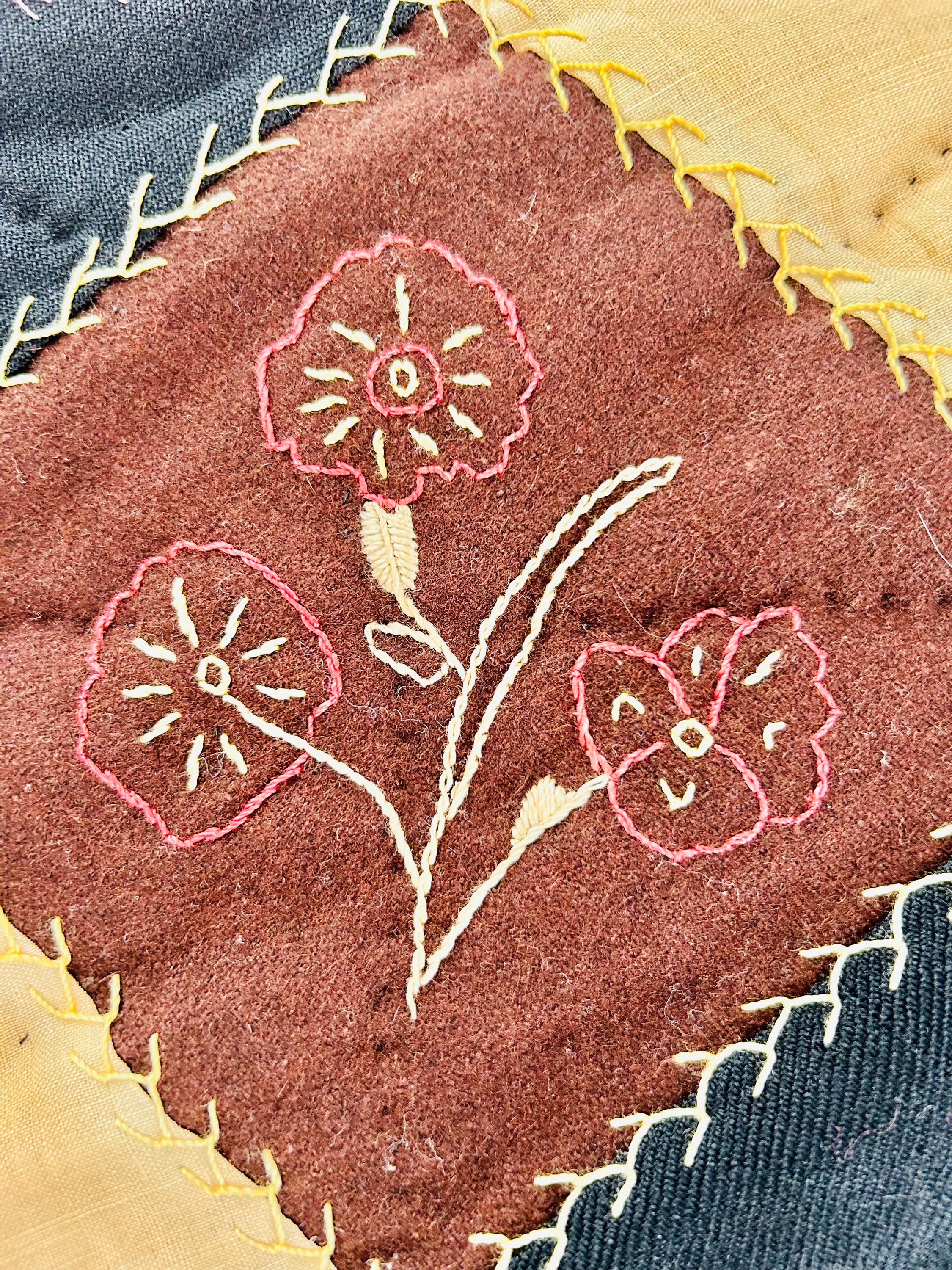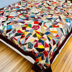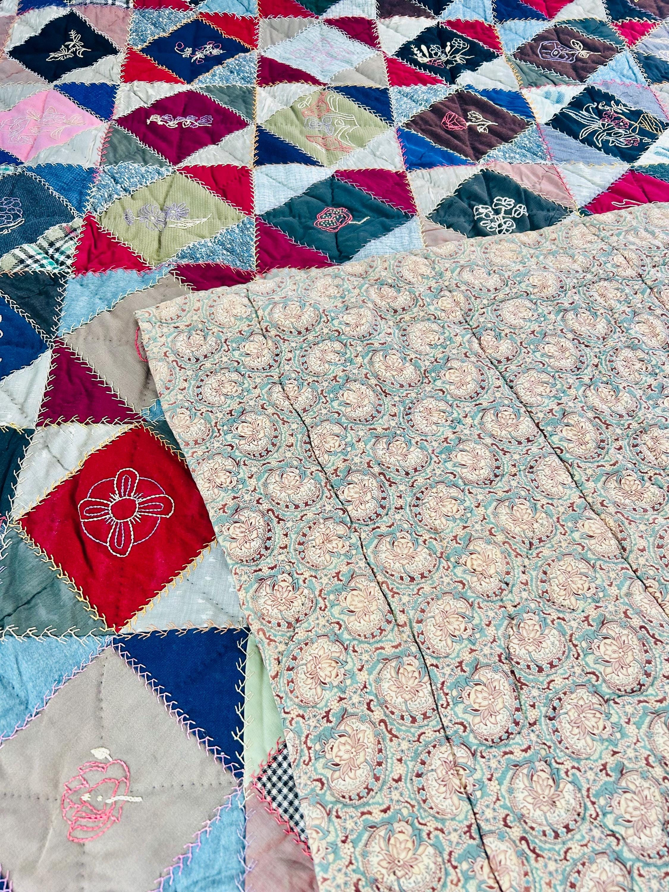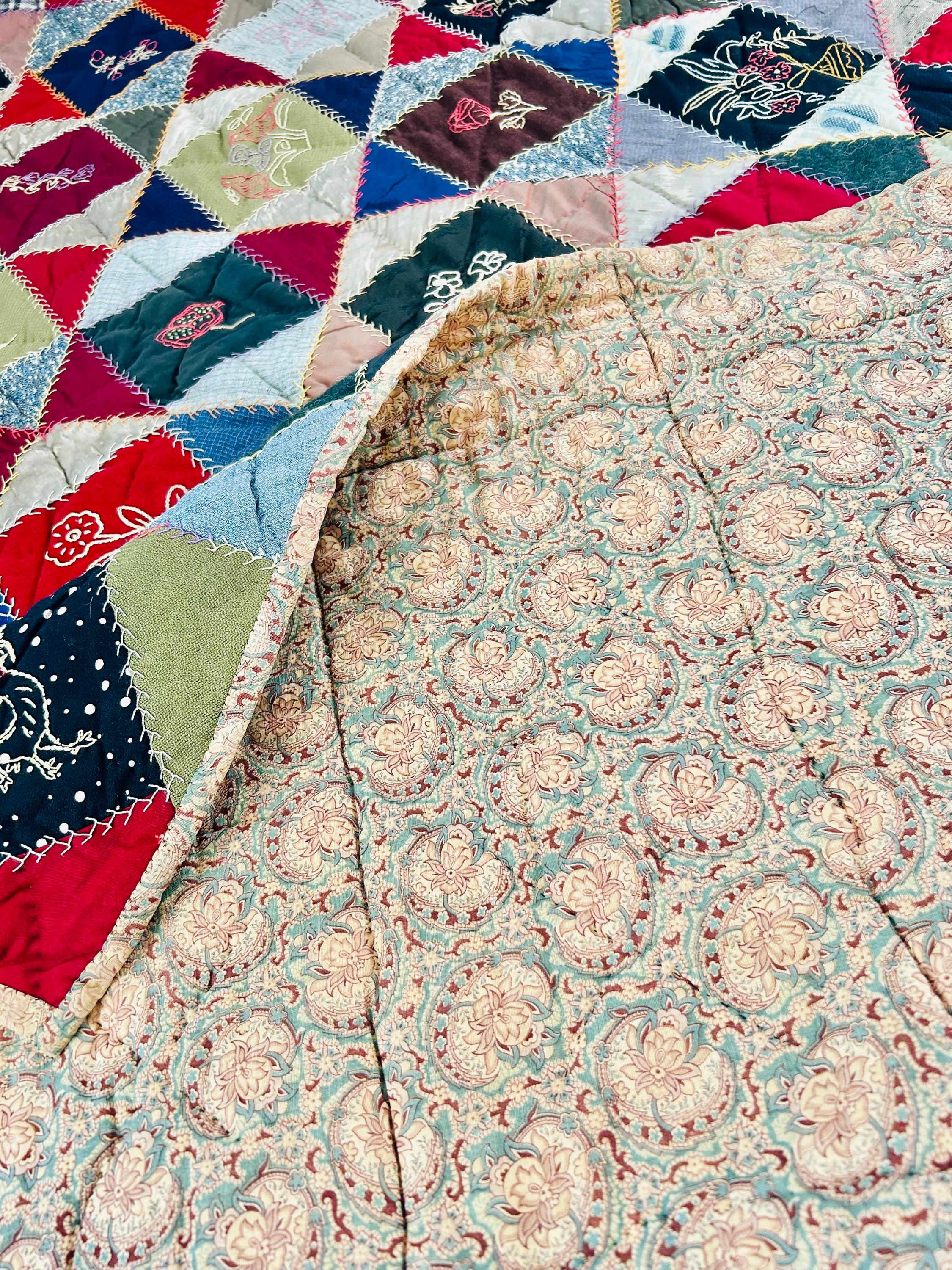 The backing is a soft paisley print cotton that has been turned to the front and hand-stitched to form the binding. Unlike most crazy quilts, this one has batting (light-to-medium weight) and is lightly quilted in black thread in outlines of the blocks.
