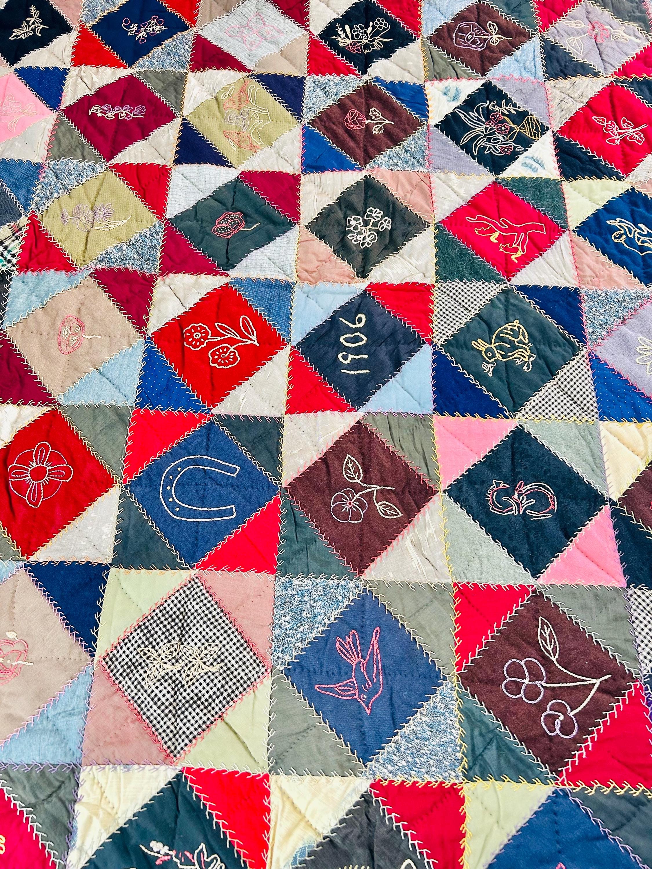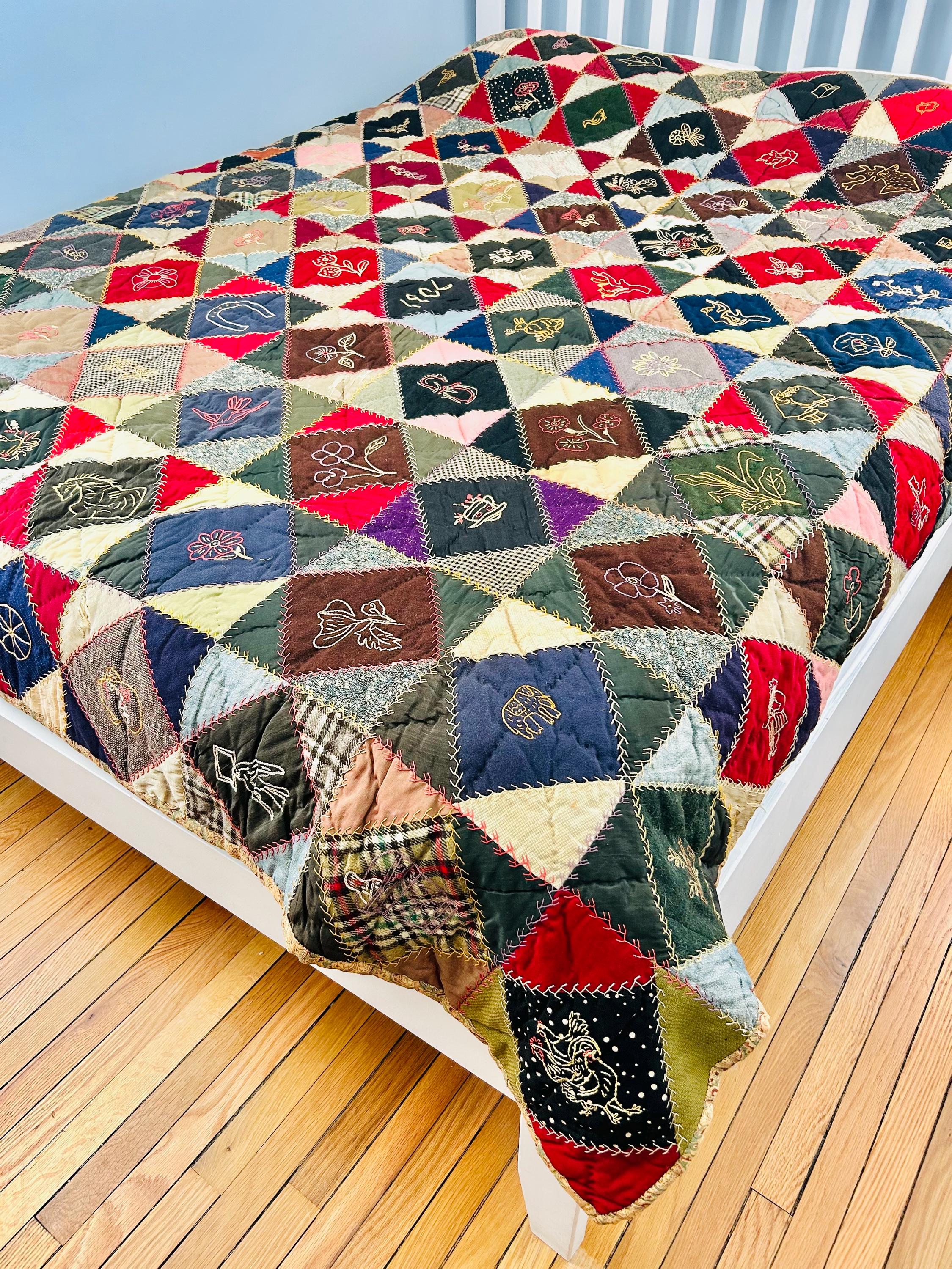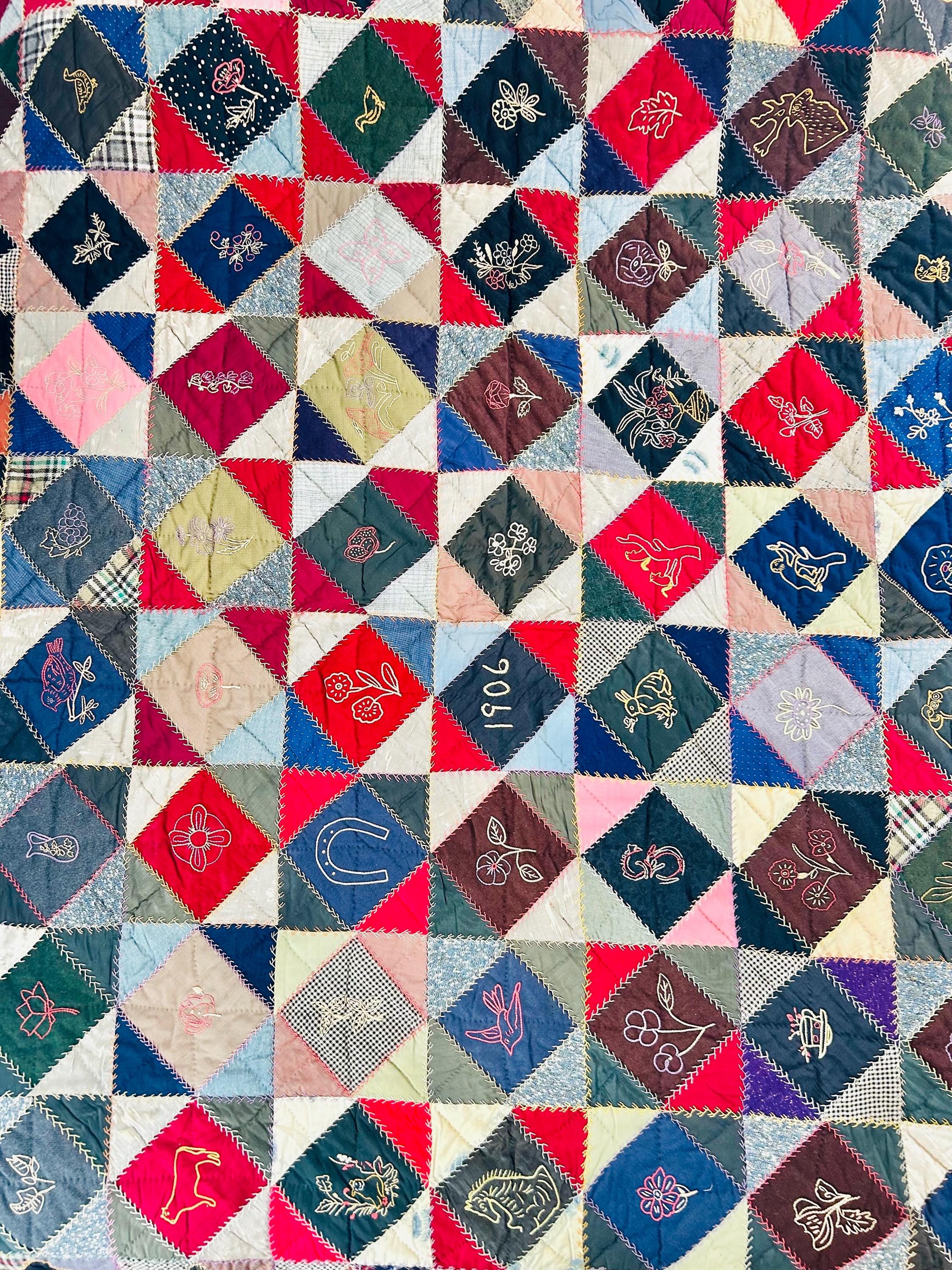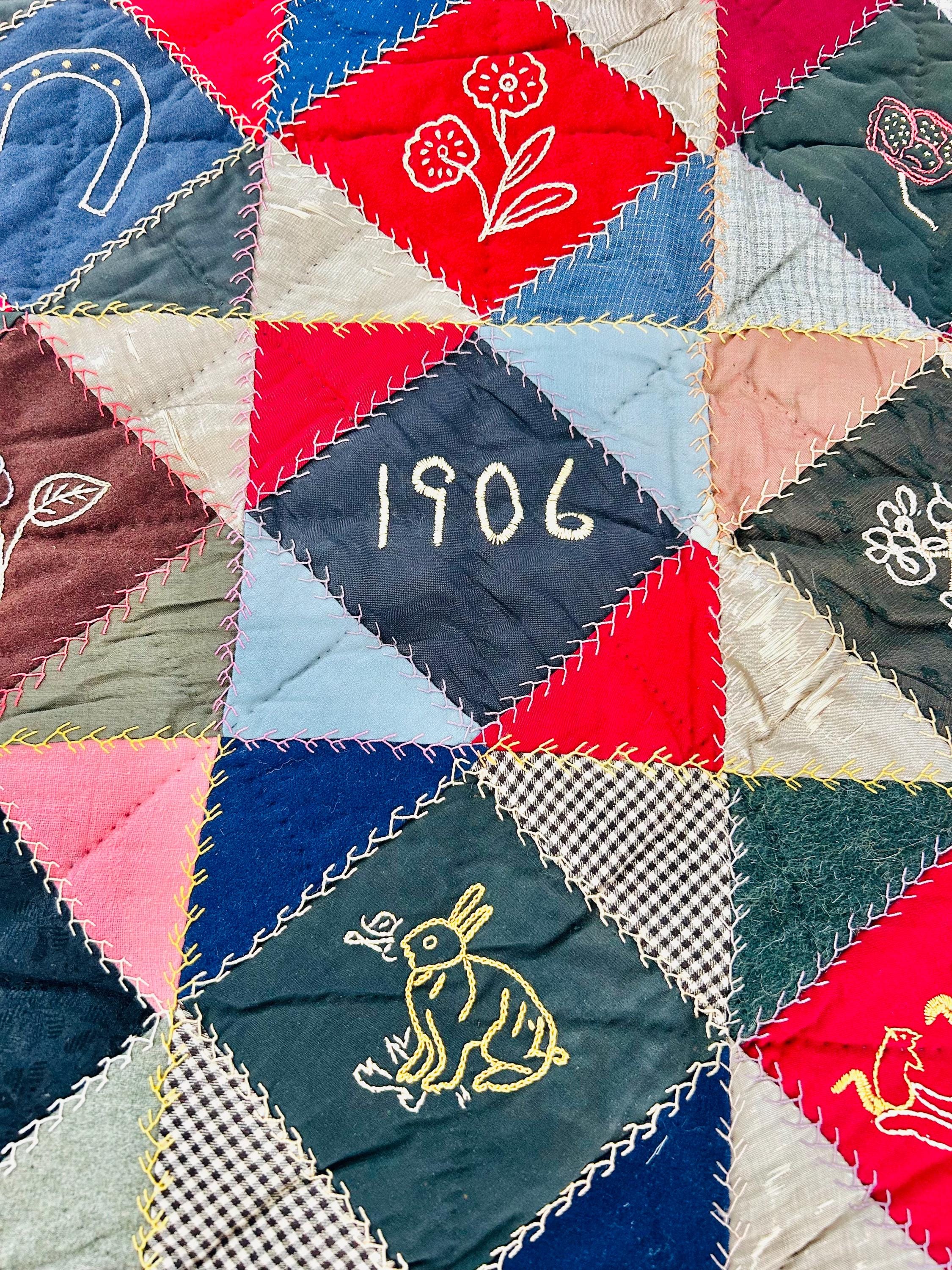 This is a wonderful antique Crazy Quilt Block Quilt, dated 1906, with charming hand-embroidered motifs and rich early 20th-century fabrics. Unlike the asymmetrical crazy quilts, this quilt is constructed in an organized block setting of pieced diamonds, with each diamond featuring hand embroidery—birds, rabbits, horses, flowers, a horseshoe, a moose, and even a sweet little girl figure—stitched in cheerful outline work.