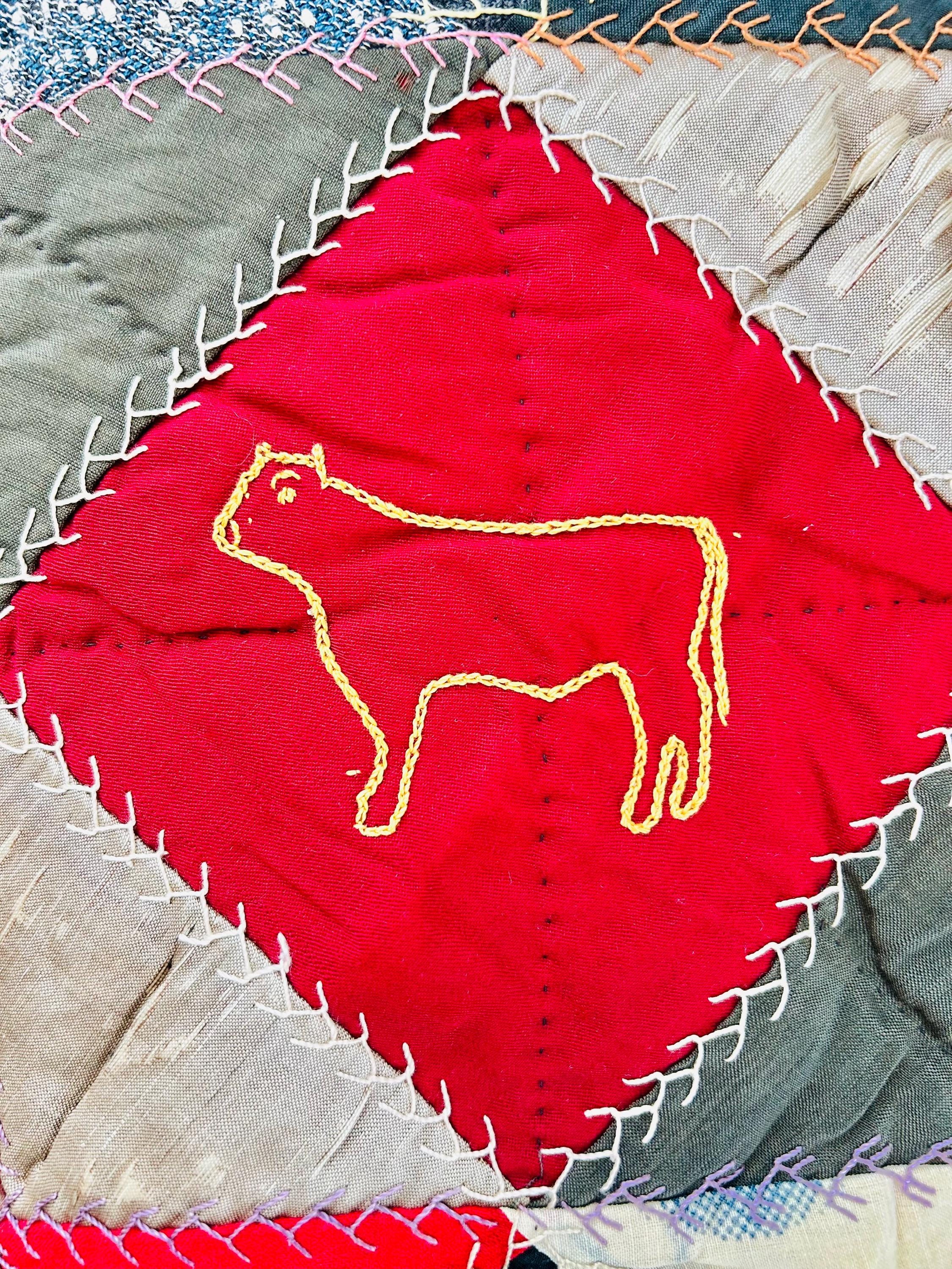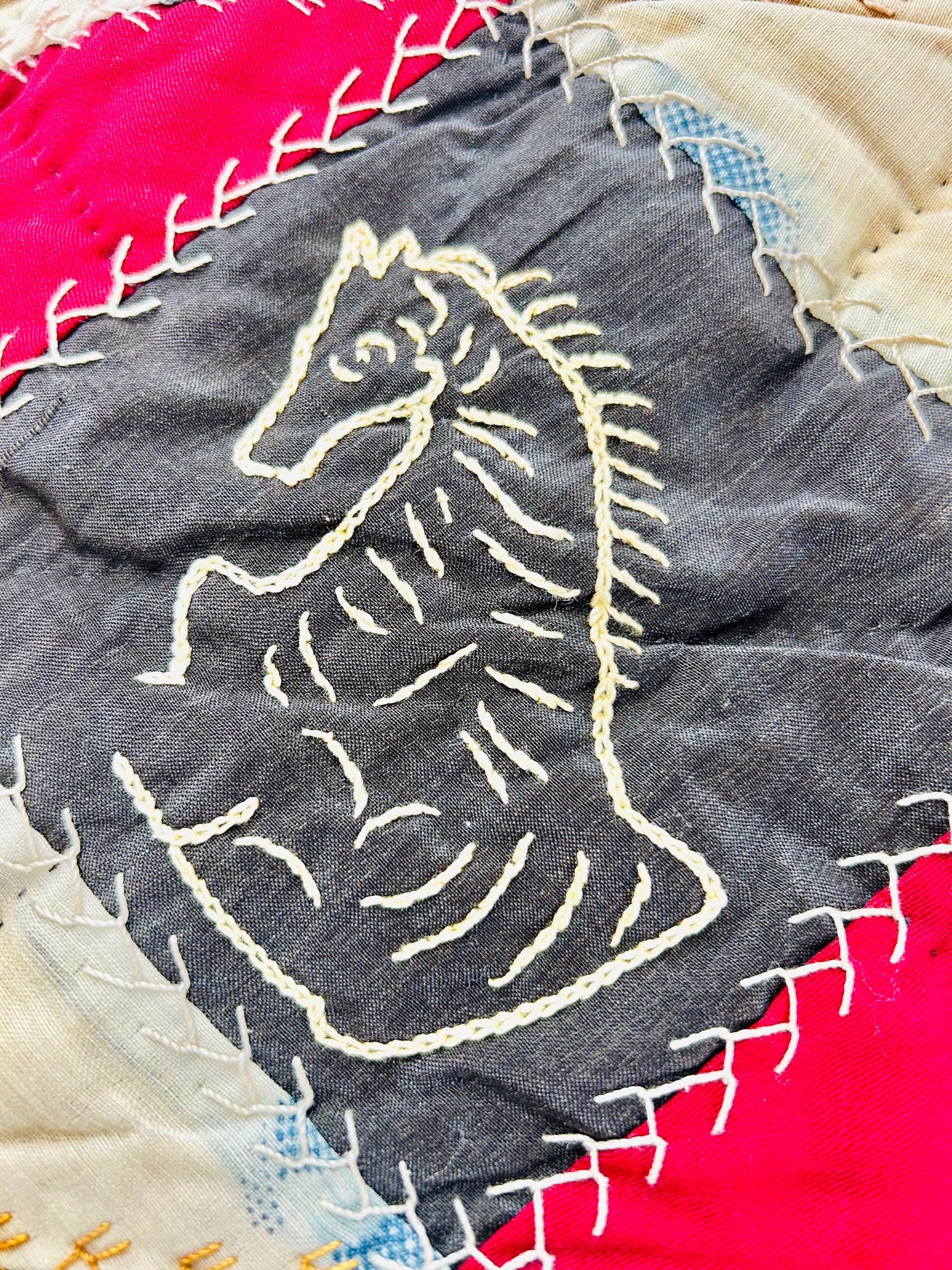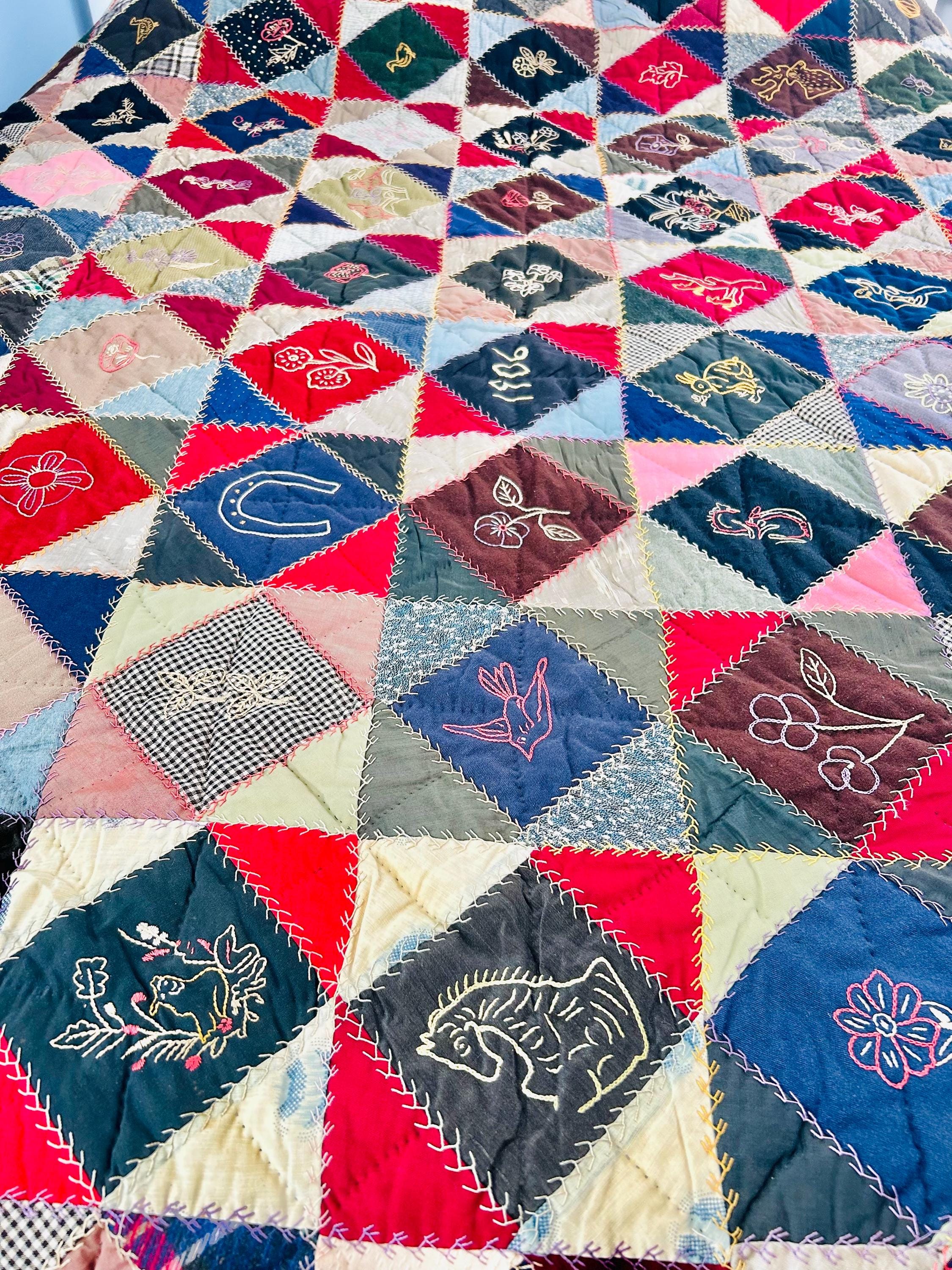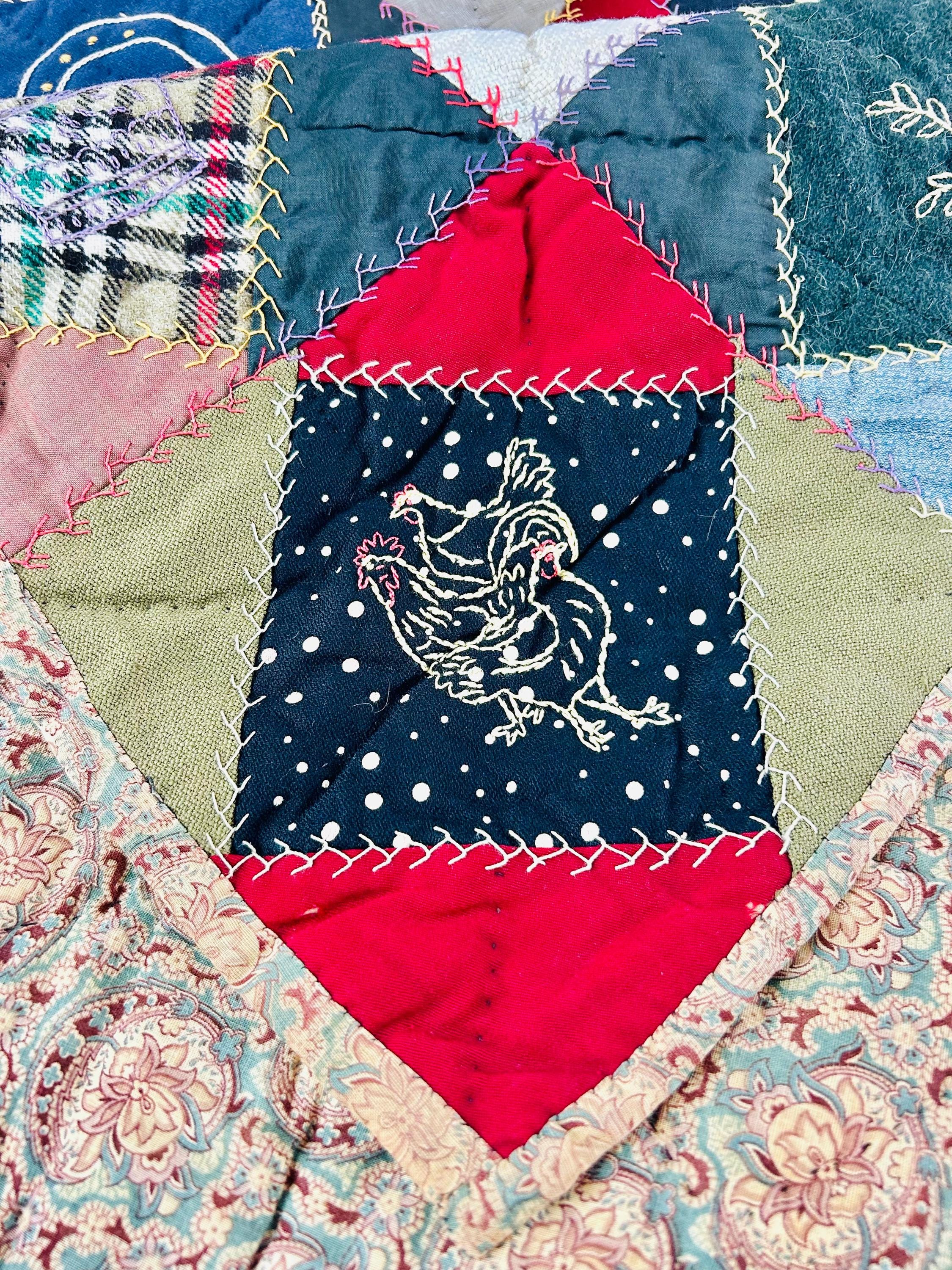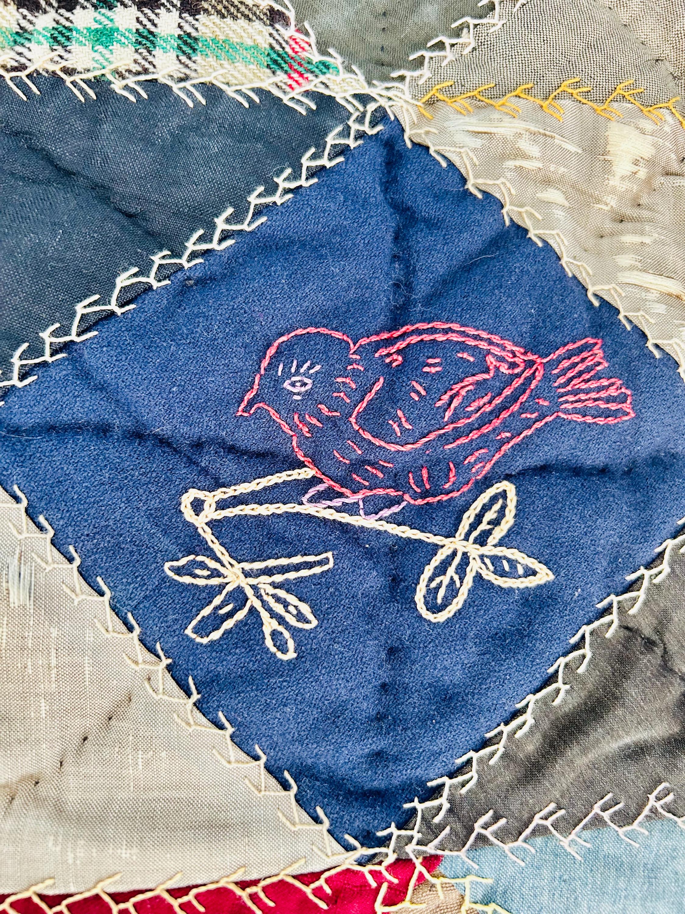 This is a wonderful antique Crazy Quilt Block Quilt, dated 1906, with charming hand-embroidered motifs and rich early 20th-century fabrics. Unlike the asymmetrical crazy quilts, this quilt is constructed in an organized block setting of pieced diamonds, with each diamond featuring hand embroidery—birds, rabbits, horses, flowers, a horseshoe, a moose, and even a sweet little girl figure—stitched in cheerful outline work.