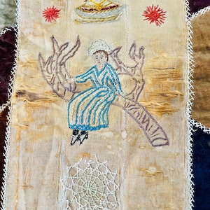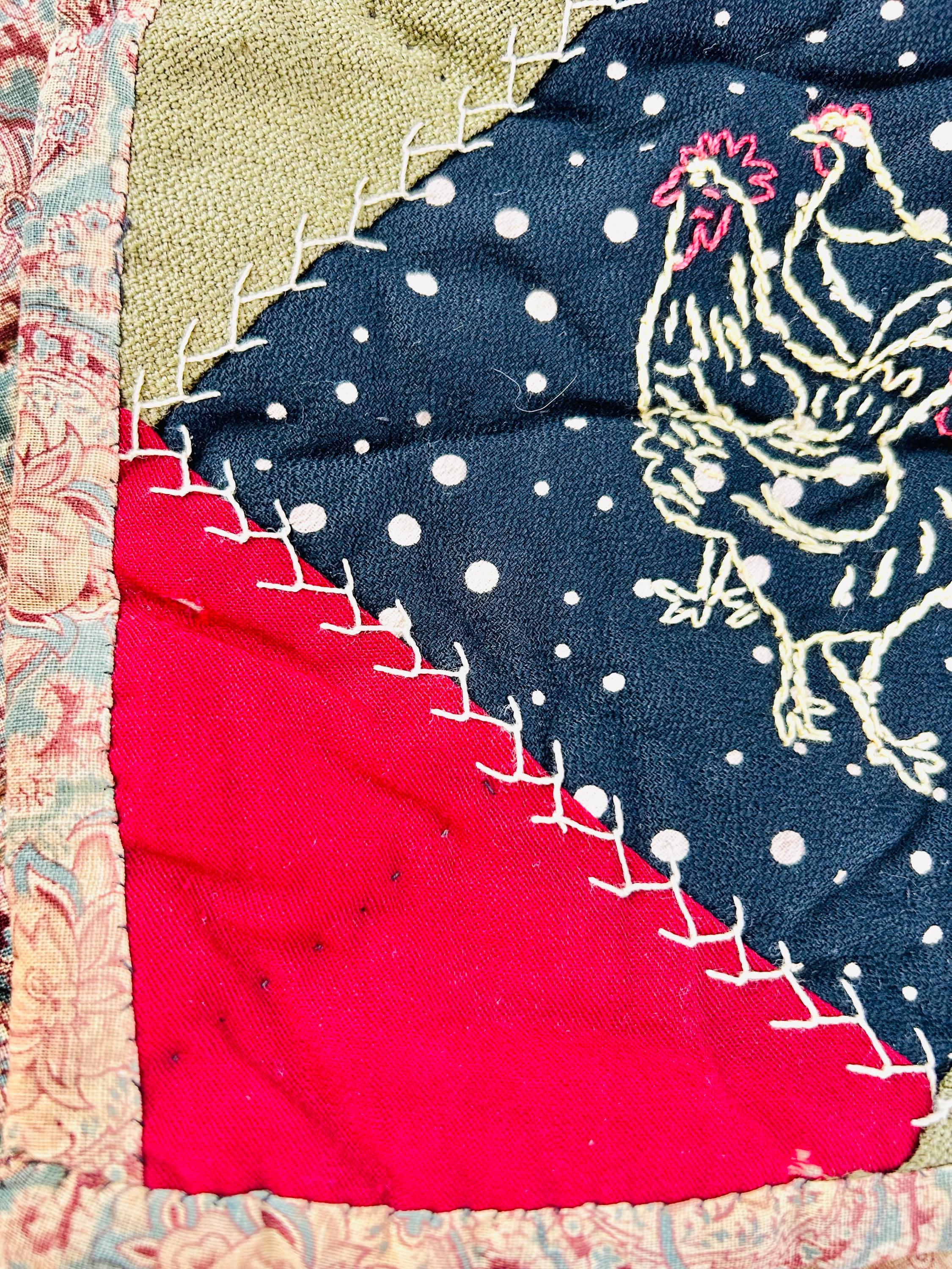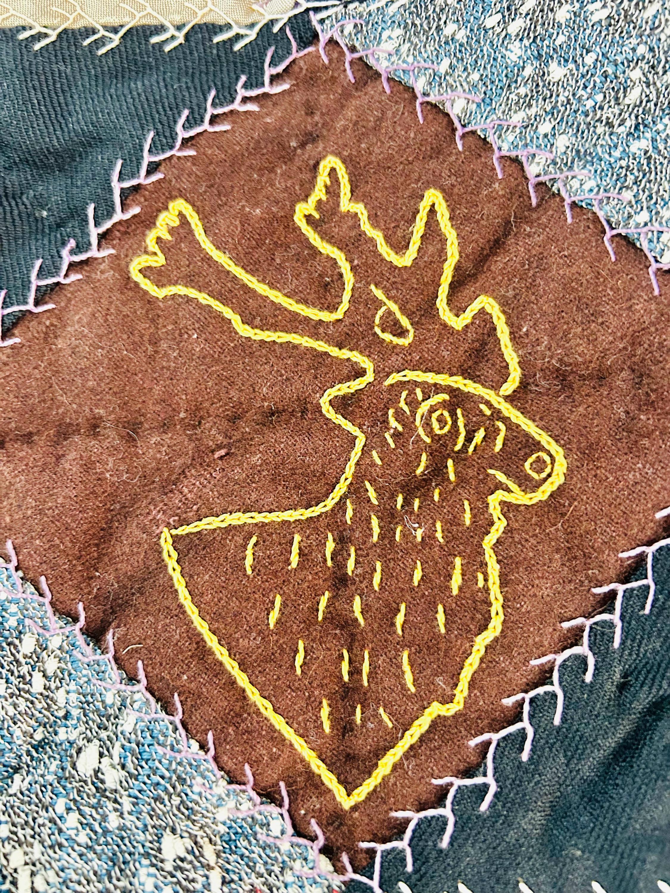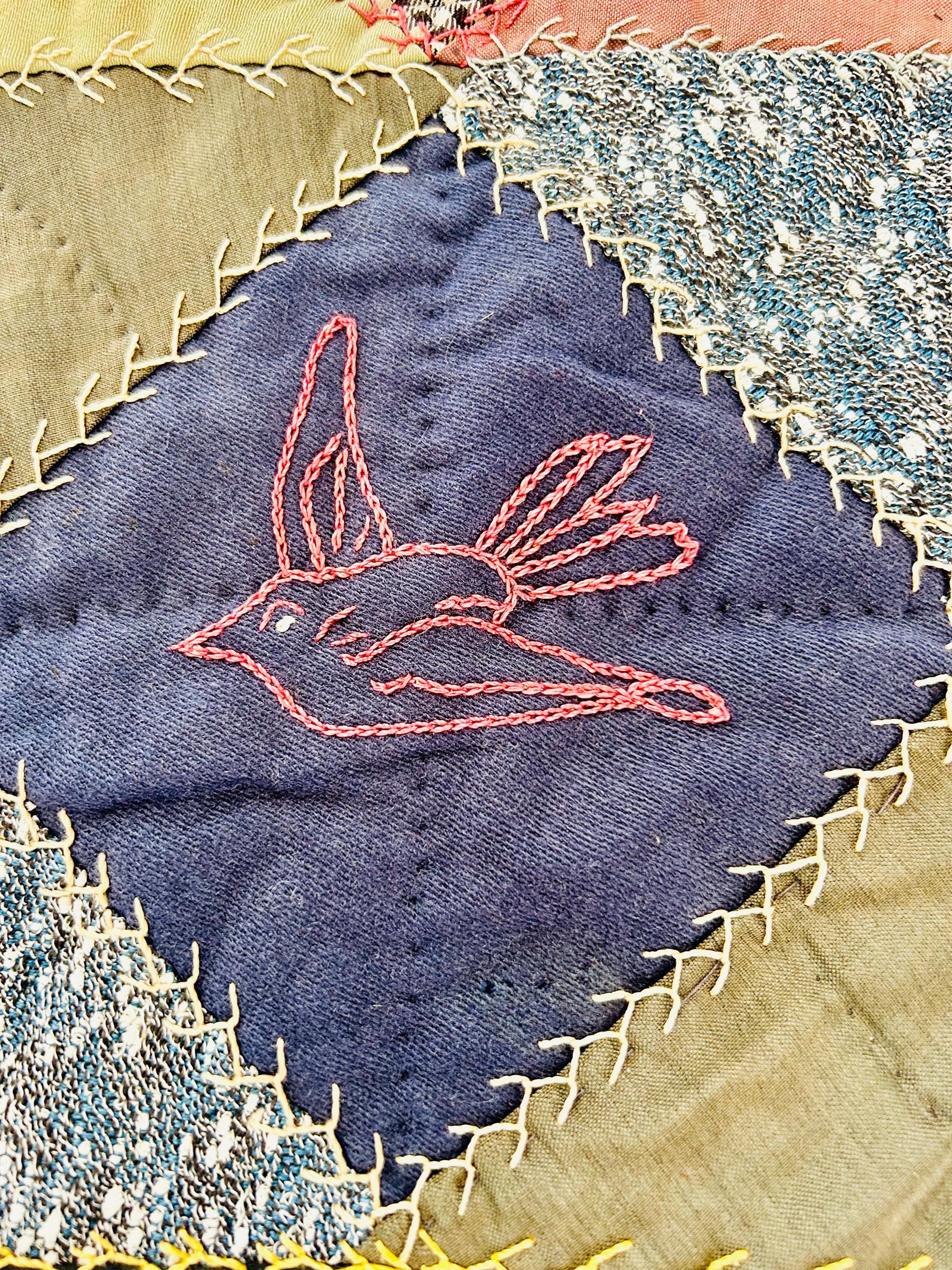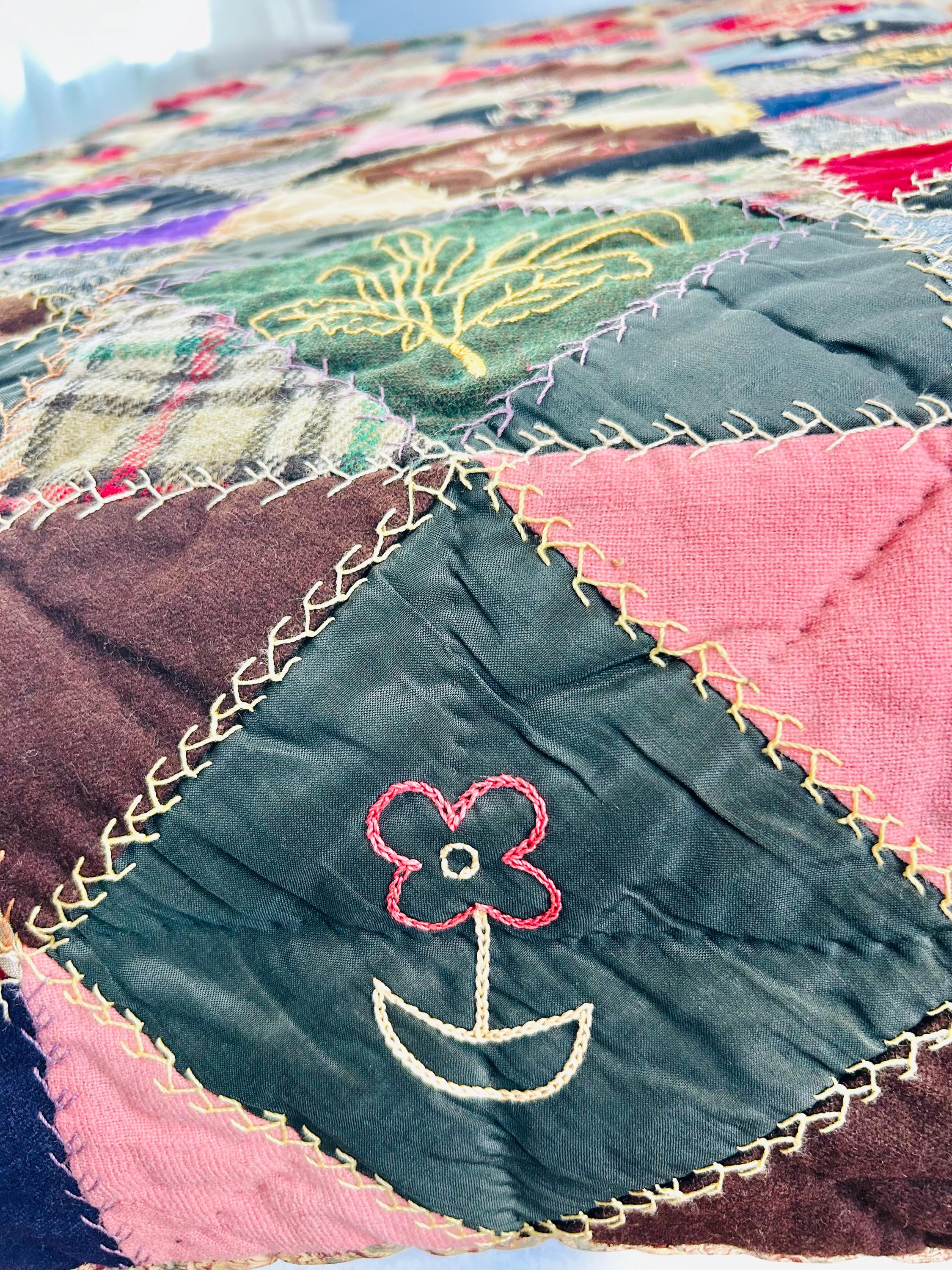 This is a wonderful antique Crazy Quilt Block Quilt, dated 1906, with charming hand-embroidered motifs and rich early 20th-century fabrics. Unlike the asymmetrical crazy quilts, this quilt is constructed in an organized block setting of pieced diamonds, with each diamond featuring hand embroidery—birds, rabbits, horses, flowers, a horseshoe, a moose, and even a sweet little girl figure—stitched in cheerful outline work.