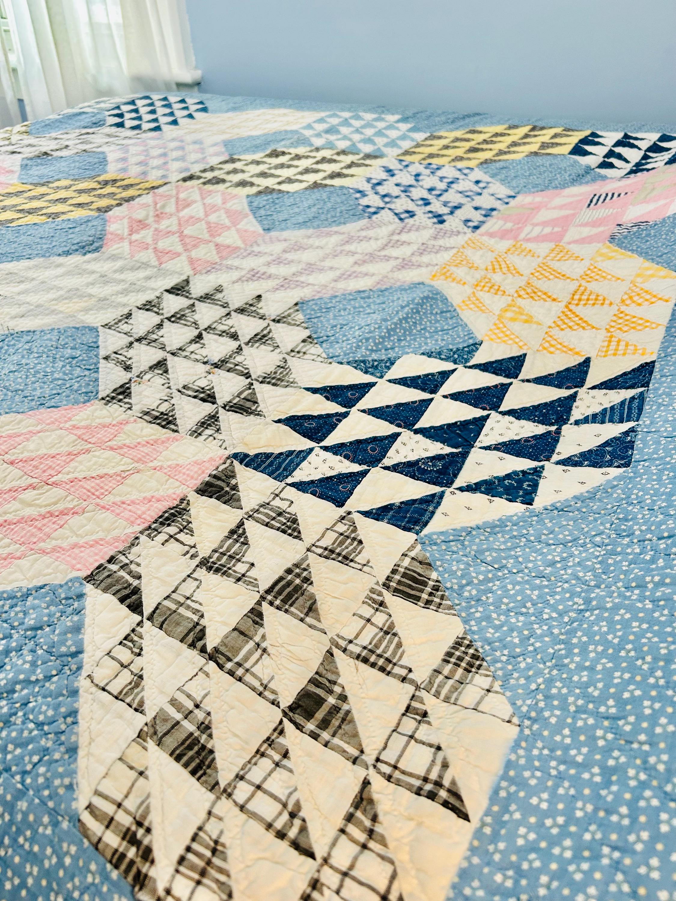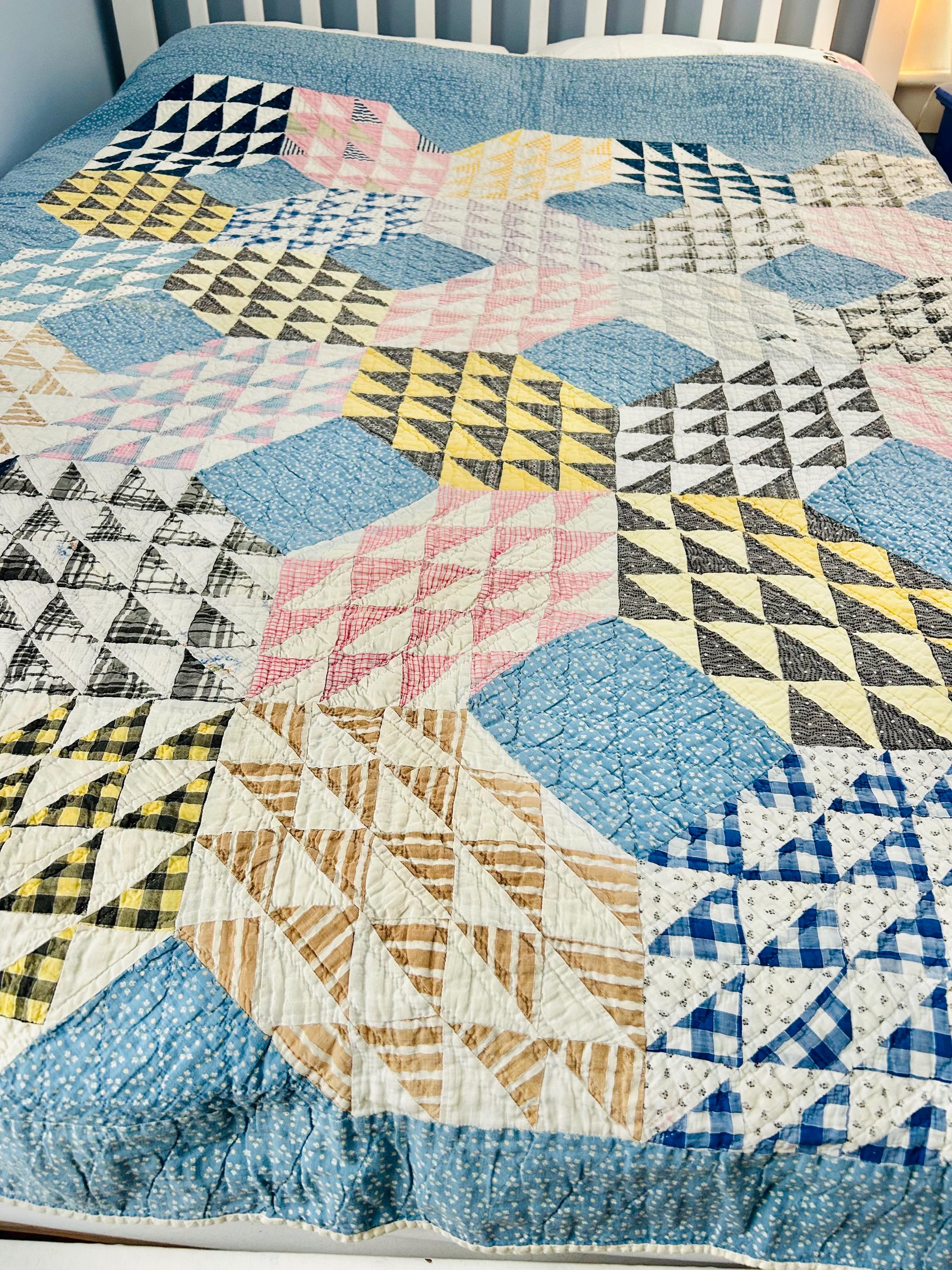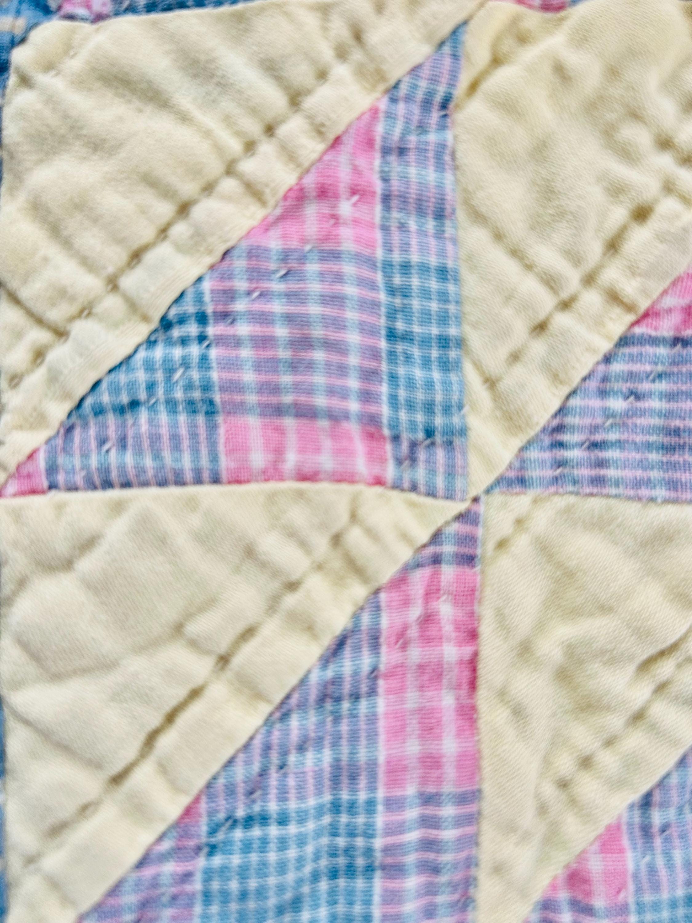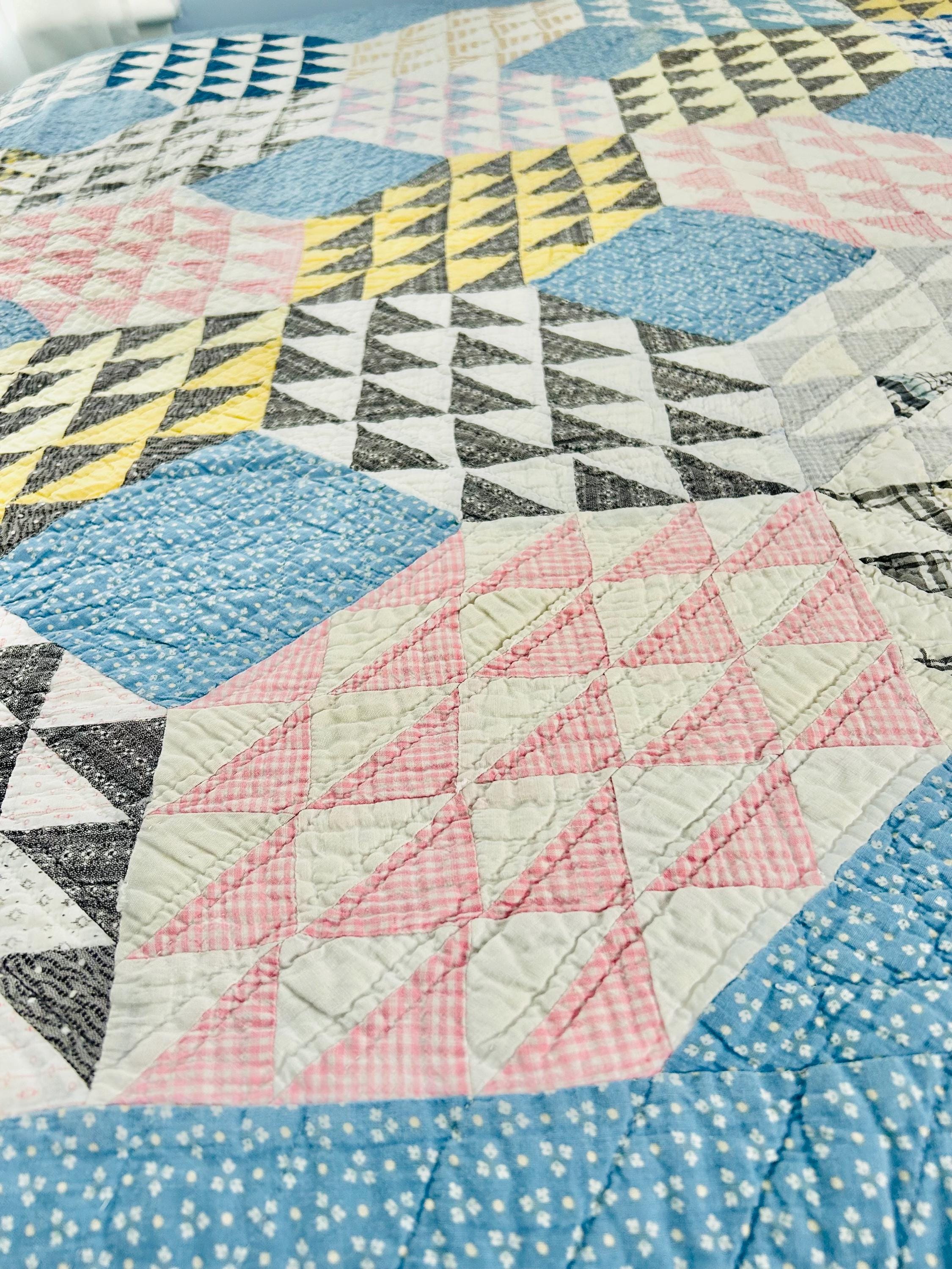 Details: • Pattern Name: Ocean Waves • Estimated Age: Circa 1930s (Depression Era) • Dimensions: 66" x 80" • Construction: Hand-pieced and hand-quilted • Materials: 100% Cotton (mix of feed sacks, ginghams, and calico prints); Muslin backing • Color Palette: Nile Green, Maize Yellow, Copen Blue, Rose Pink, and Indigo/Navy accents