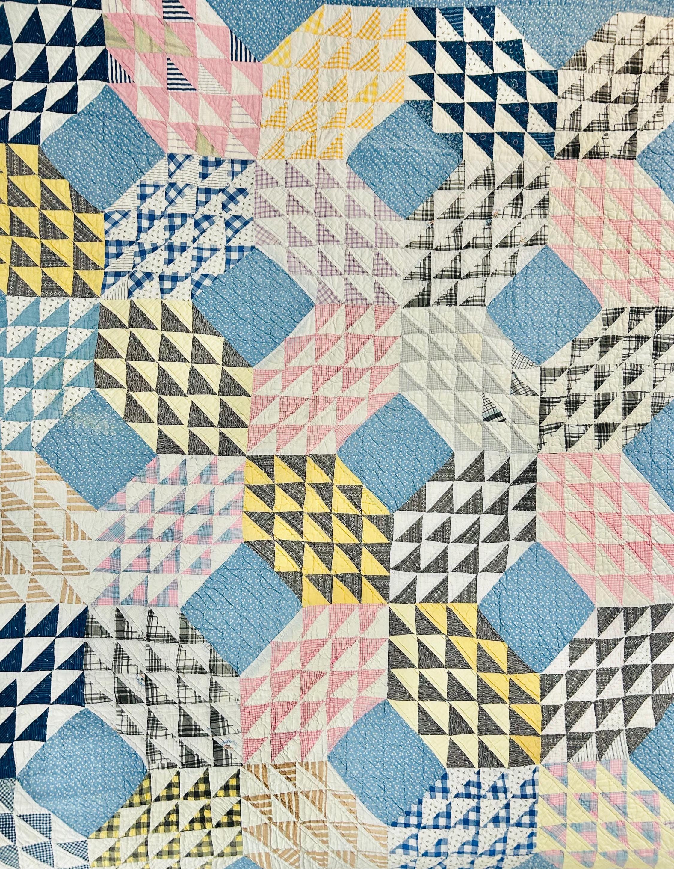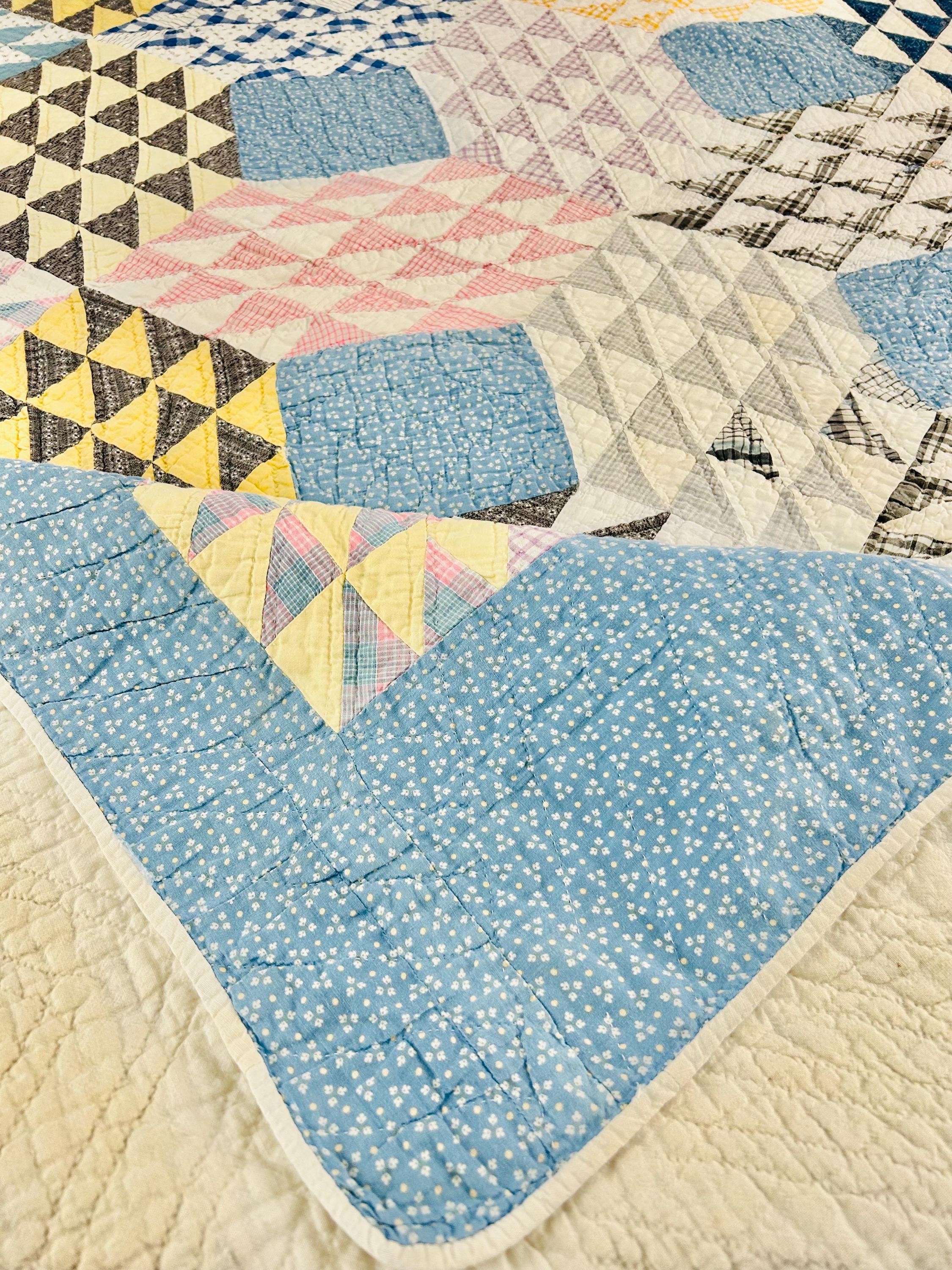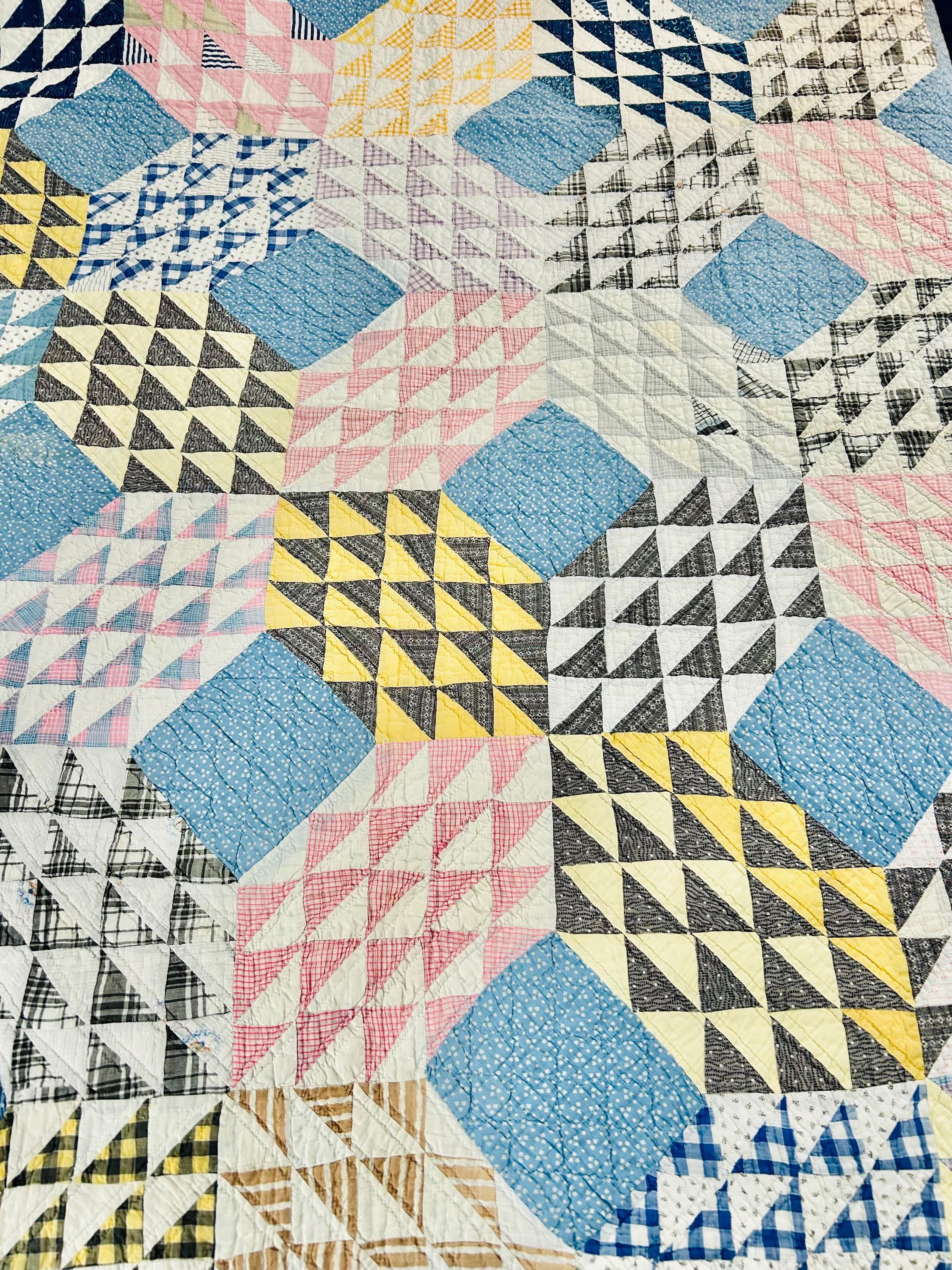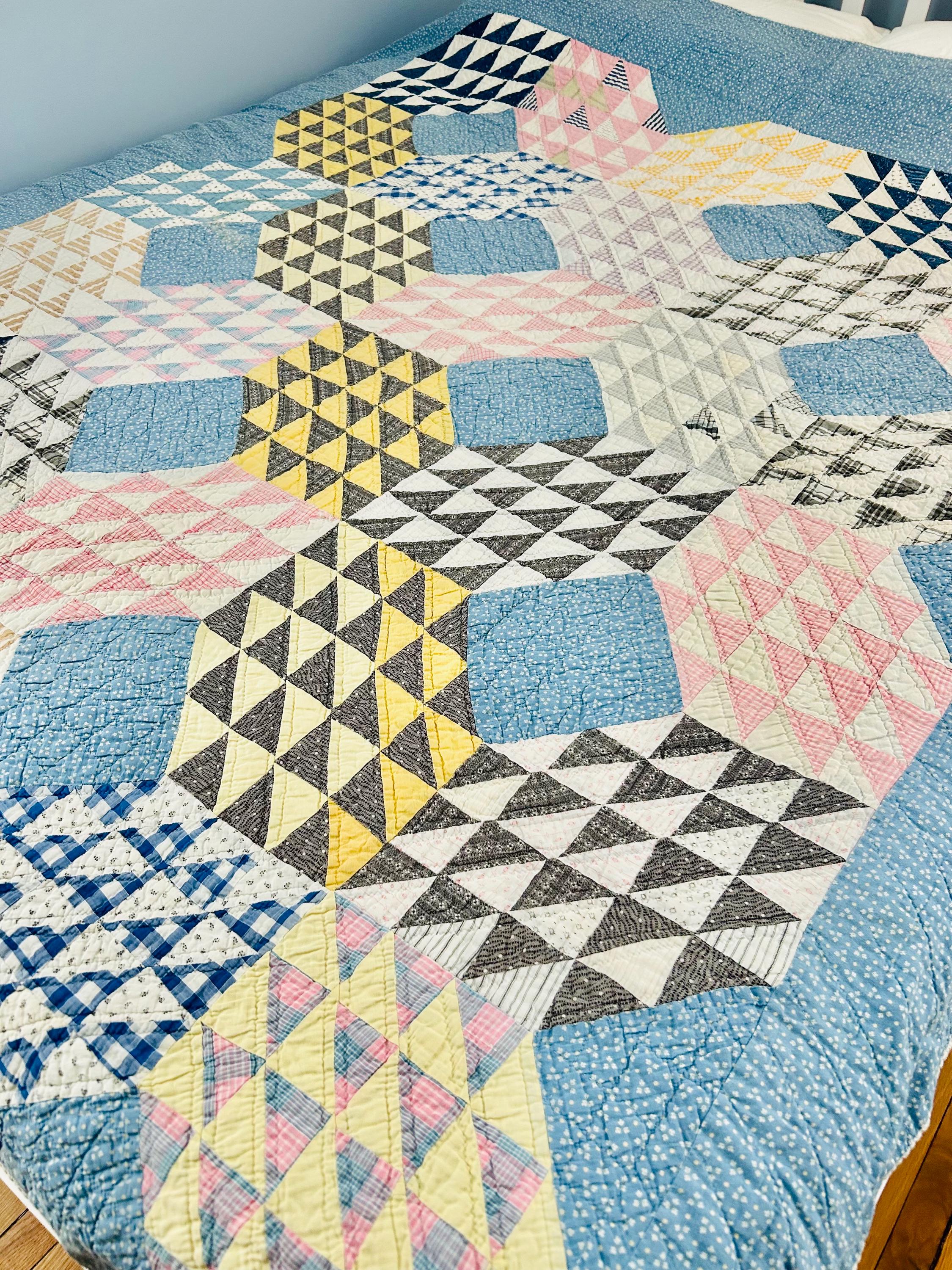 Details: • Pattern Name: Ocean Waves • Estimated Age: Circa 1930s (Depression Era) • Dimensions: 66" x 80" • Construction: Hand-pieced and hand-quilted • Materials: 100% Cotton (mix of feed sacks, ginghams, and calico prints); Muslin backing • Color Palette: Nile Green, Maize Yellow, Copen Blue, Rose Pink, and Indigo/Navy accents