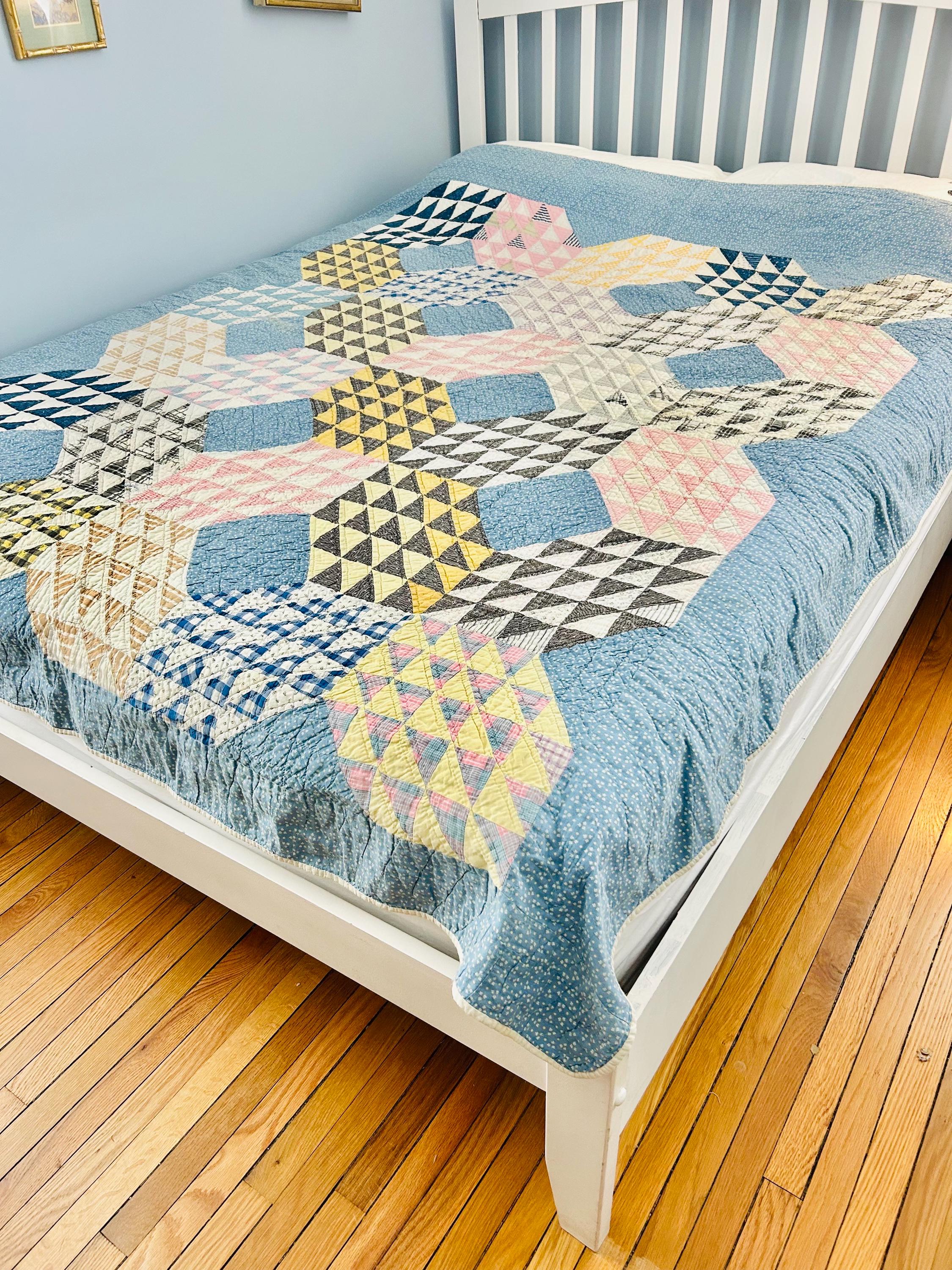 The quilt is from a smoke-free, pet-free home and is pictured on a queen-size bed.