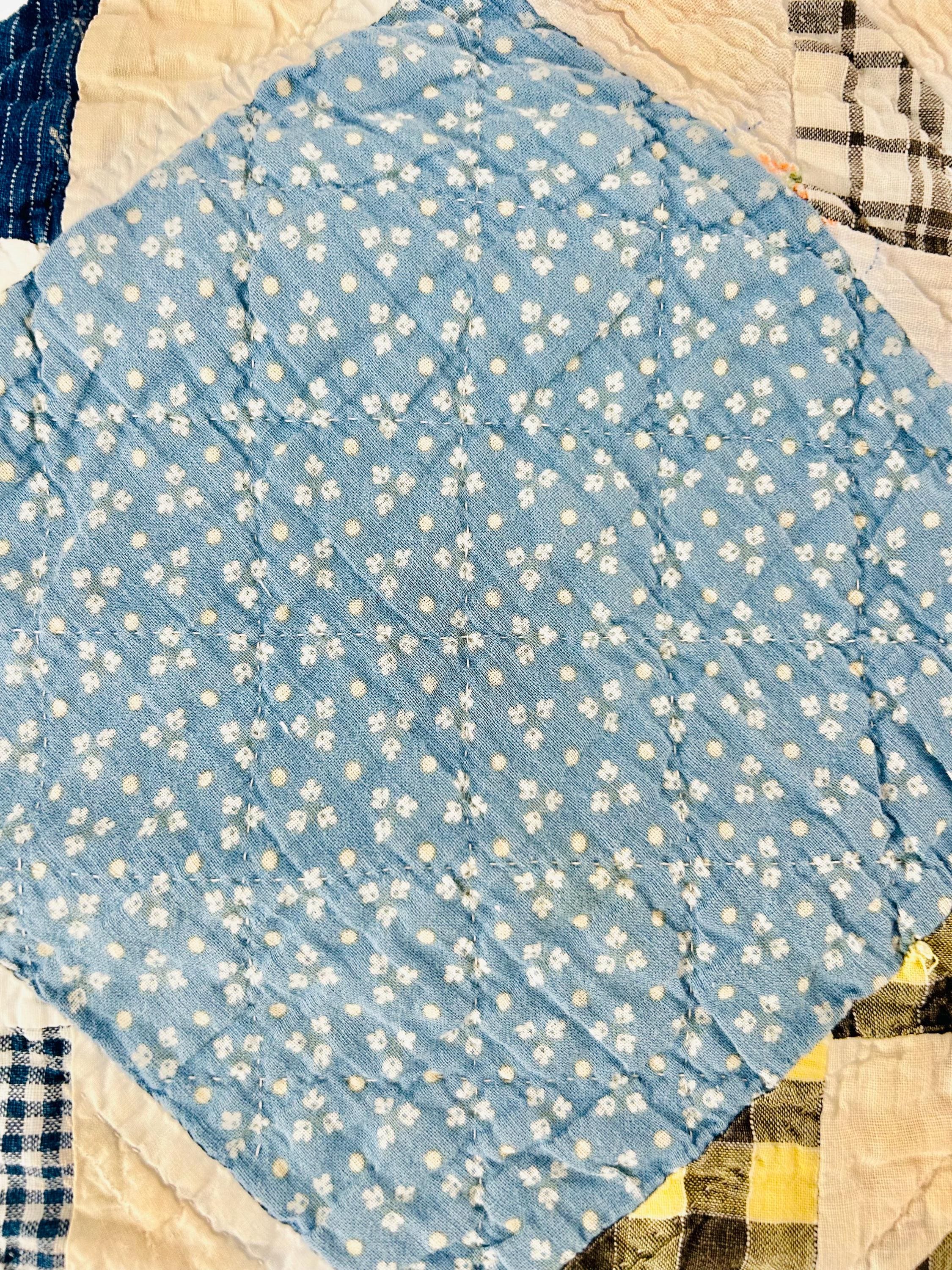 This is a charming 1930s "Ocean Waves" Hand-Quilted Scrap Quilt made of period fabrics, including pastel ginghams, floral feed sacks, and indigo shirting prints. The piece is beautifully hand-quilted in outlines of the patchwork, flowers in the blue-floral blocks and in double and triple diagonals along the four-sided border.