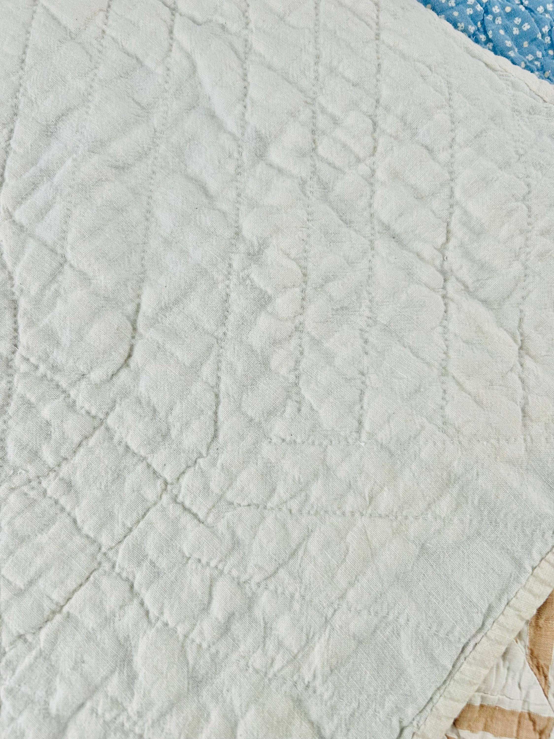 The back is cream-muslin with some light remnants of feedsack printing, while the binding is very narrow cream-muslin that has been hand-stitched to both sides. The cotton batting is lightweight.