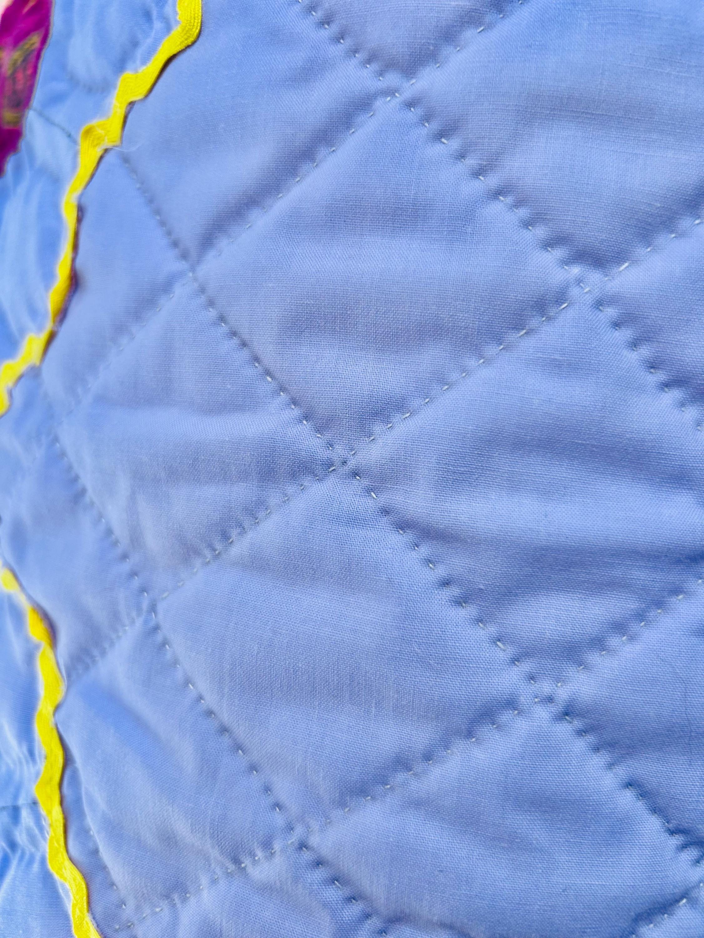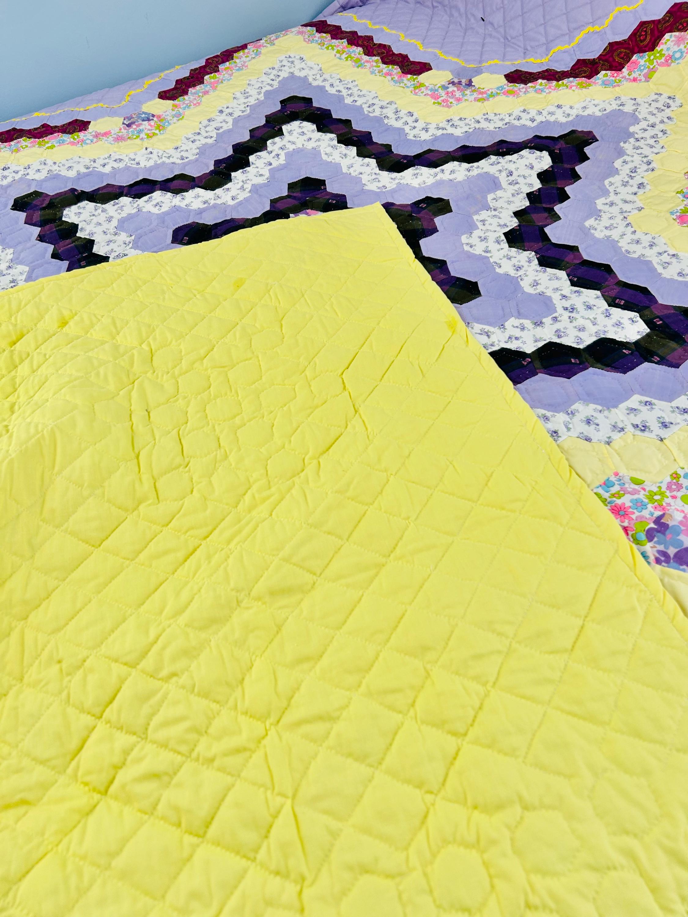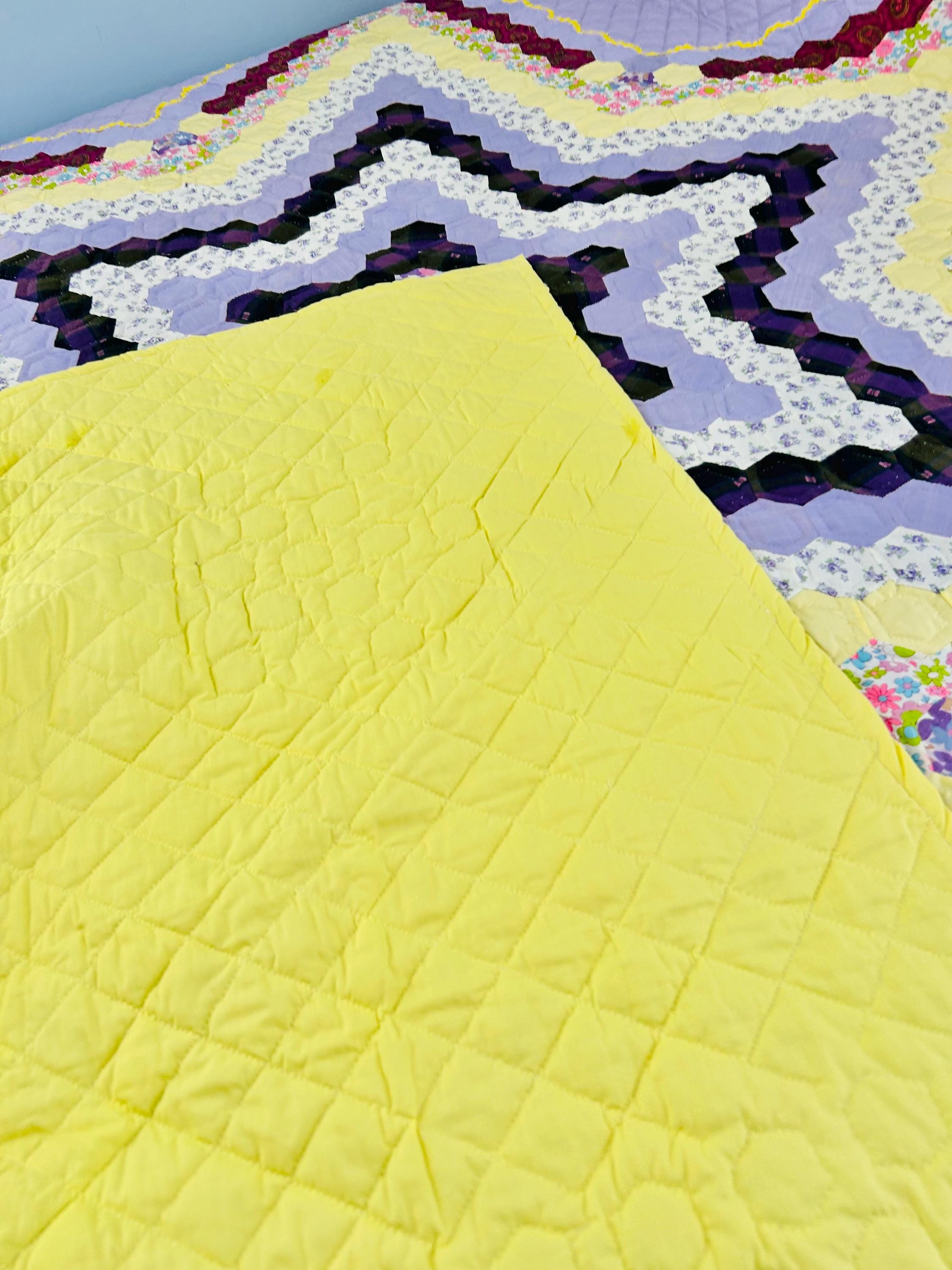 The back is yellow cotton that has been turned to the front and machine-stitched to form the binding. The batting is lightweight.