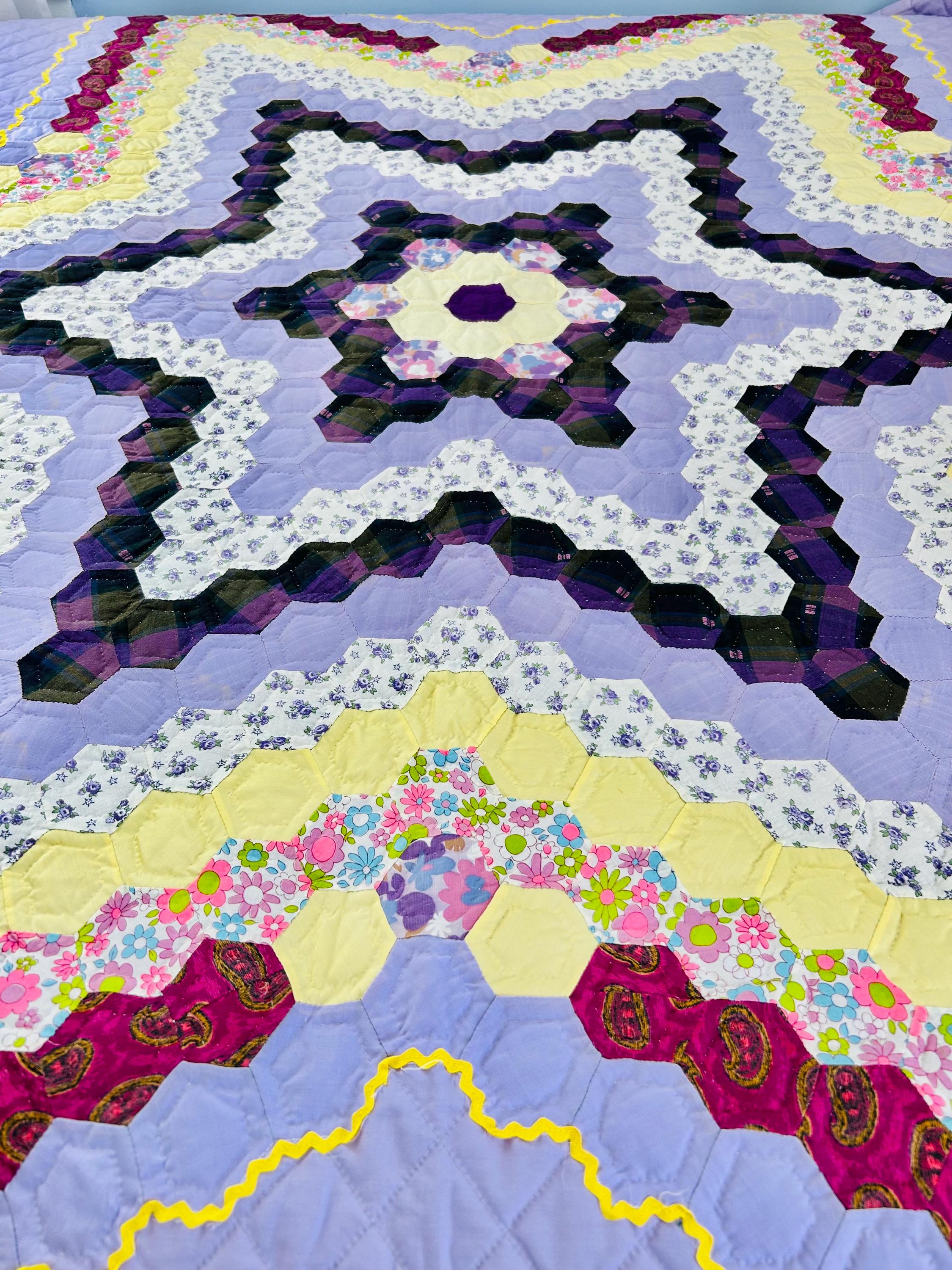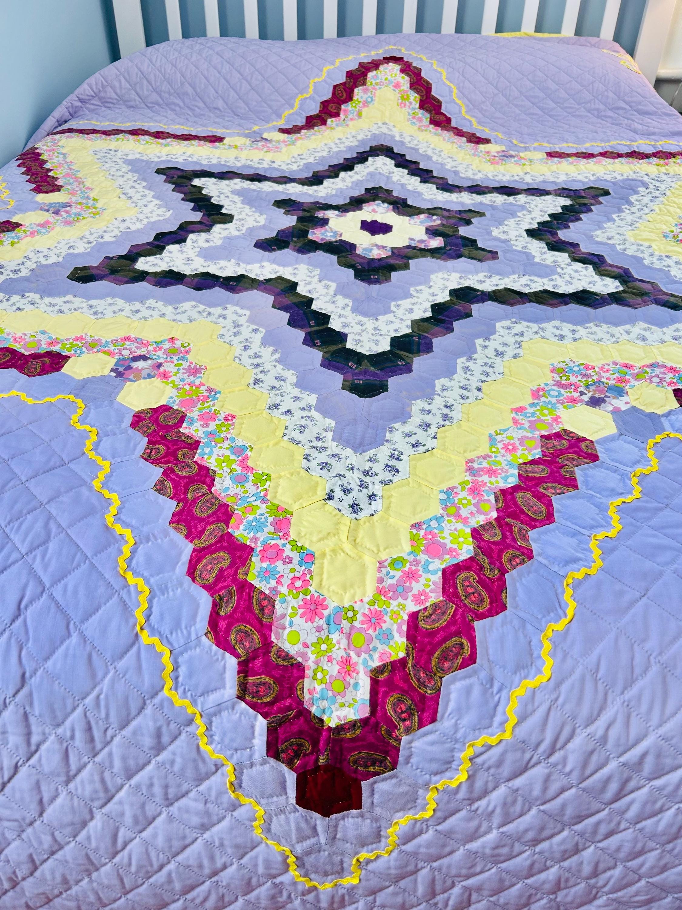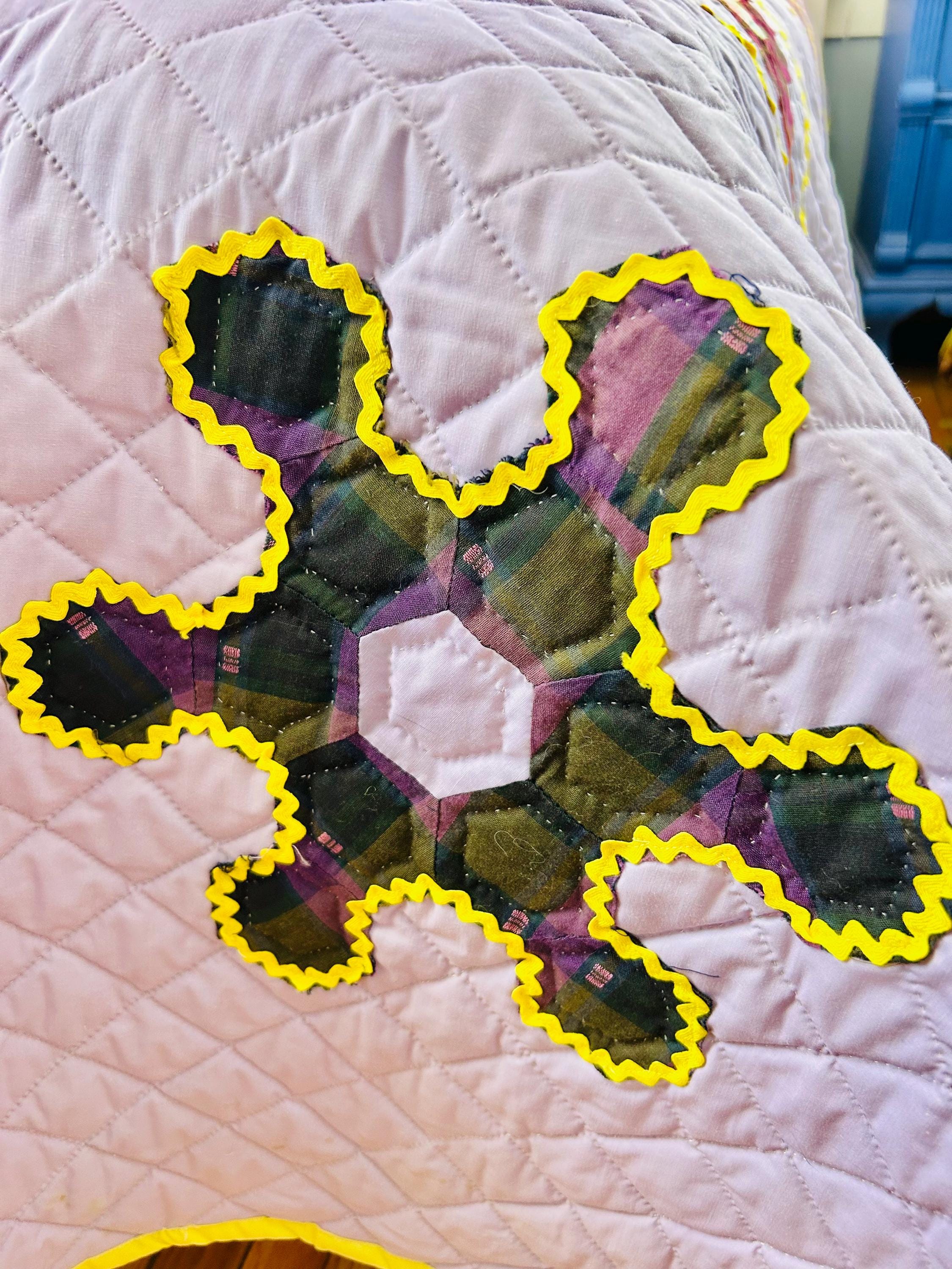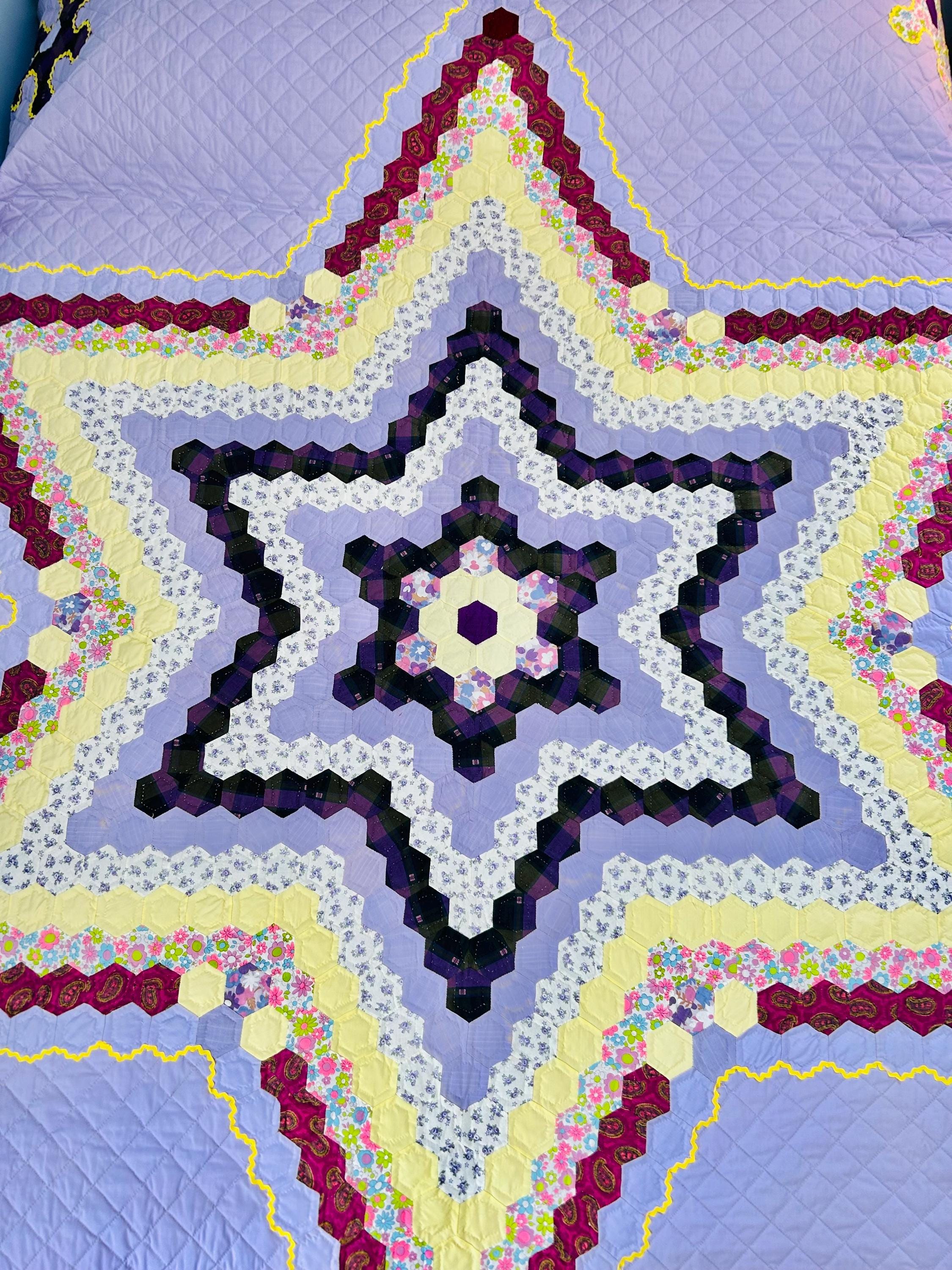 Details • Date: Circa 1960–early 1970s • Pattern: Hexagon Medallion Star • Size: 80” x 102” • Construction: Hand-pieced hexagons, all hand-quilted • Quilting: Hand-quilted in outlines of the hexagons and cross-hatches • Embellishment: Yellow rickrack outlining star and appliqué motifs • Fabrics: 1960s florals, paisleys, plaids, and solids • Backing: Solid bright yellow cotton • Batting: Lightweight