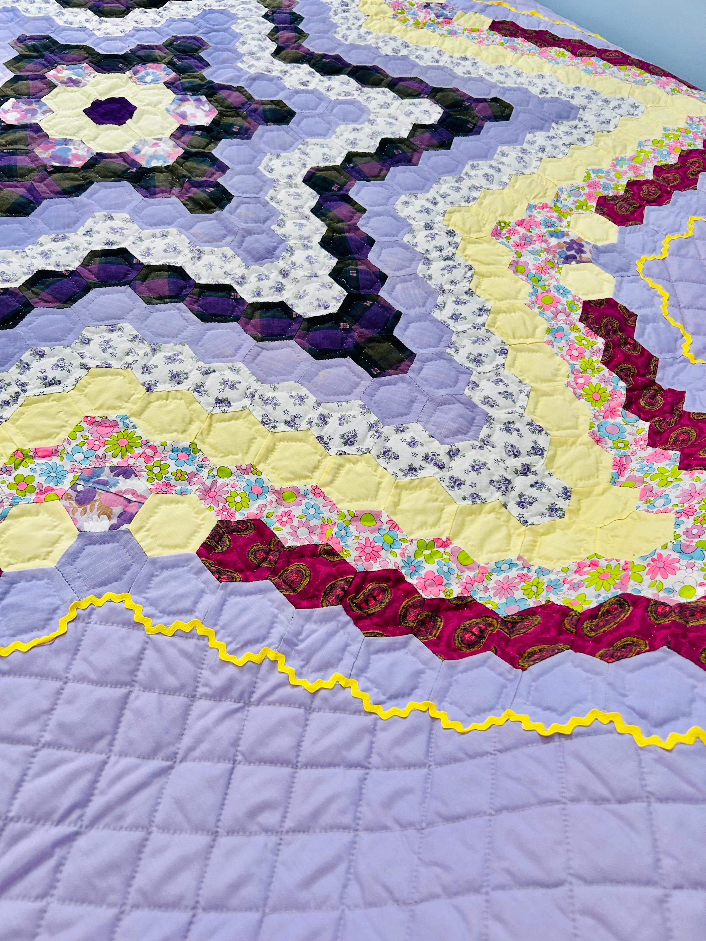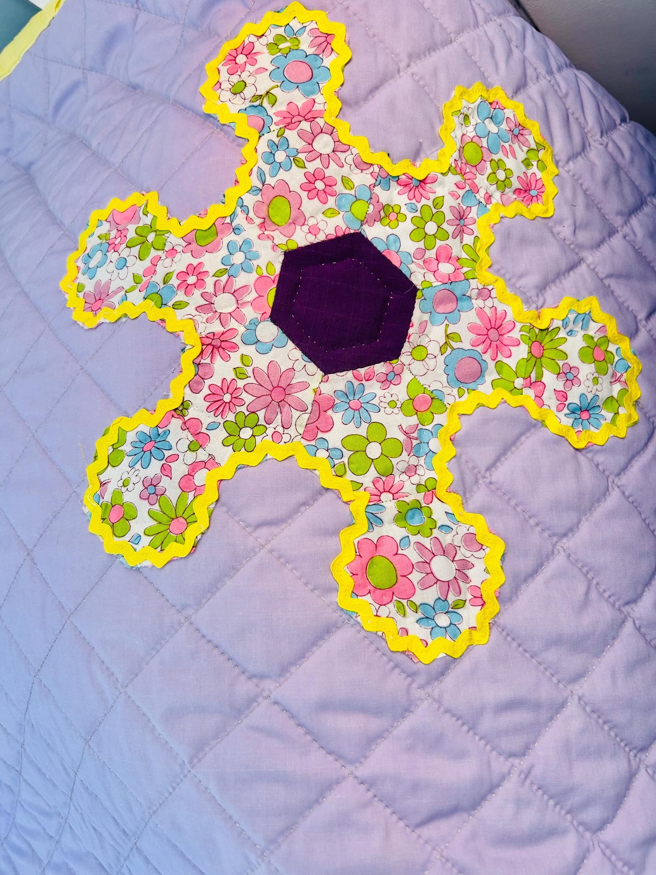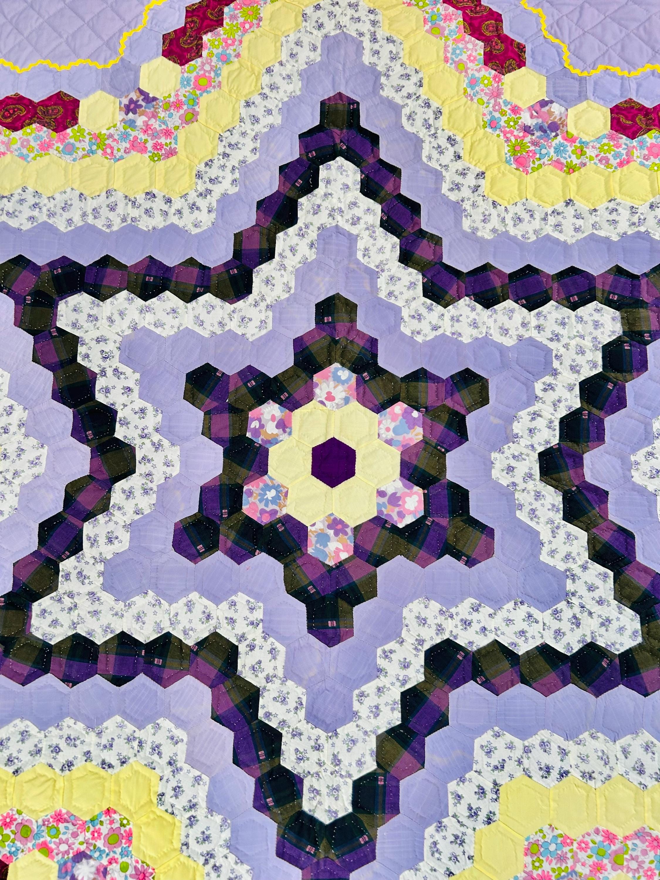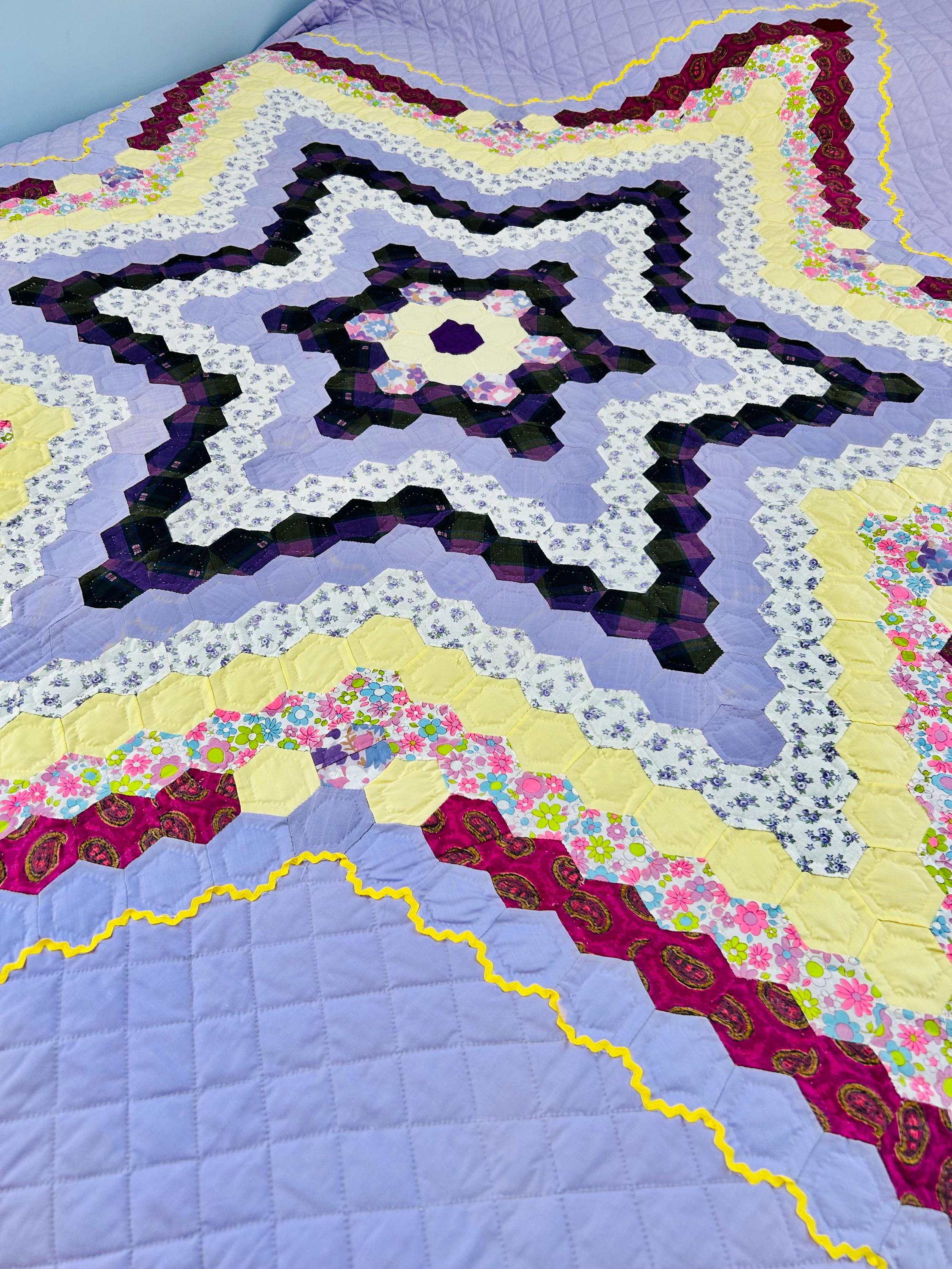 Details • Date: Circa 1960–early 1970s • Pattern: Hexagon Medallion Star • Size: 80” x 102” • Construction: Hand-pieced hexagons, all hand-quilted • Quilting: Hand-quilted in outlines of the hexagons and cross-hatches • Embellishment: Yellow rickrack outlining star and appliqué motifs • Fabrics: 1960s florals, paisleys, plaids, and solids • Backing: Solid bright yellow cotton • Batting: Lightweight
