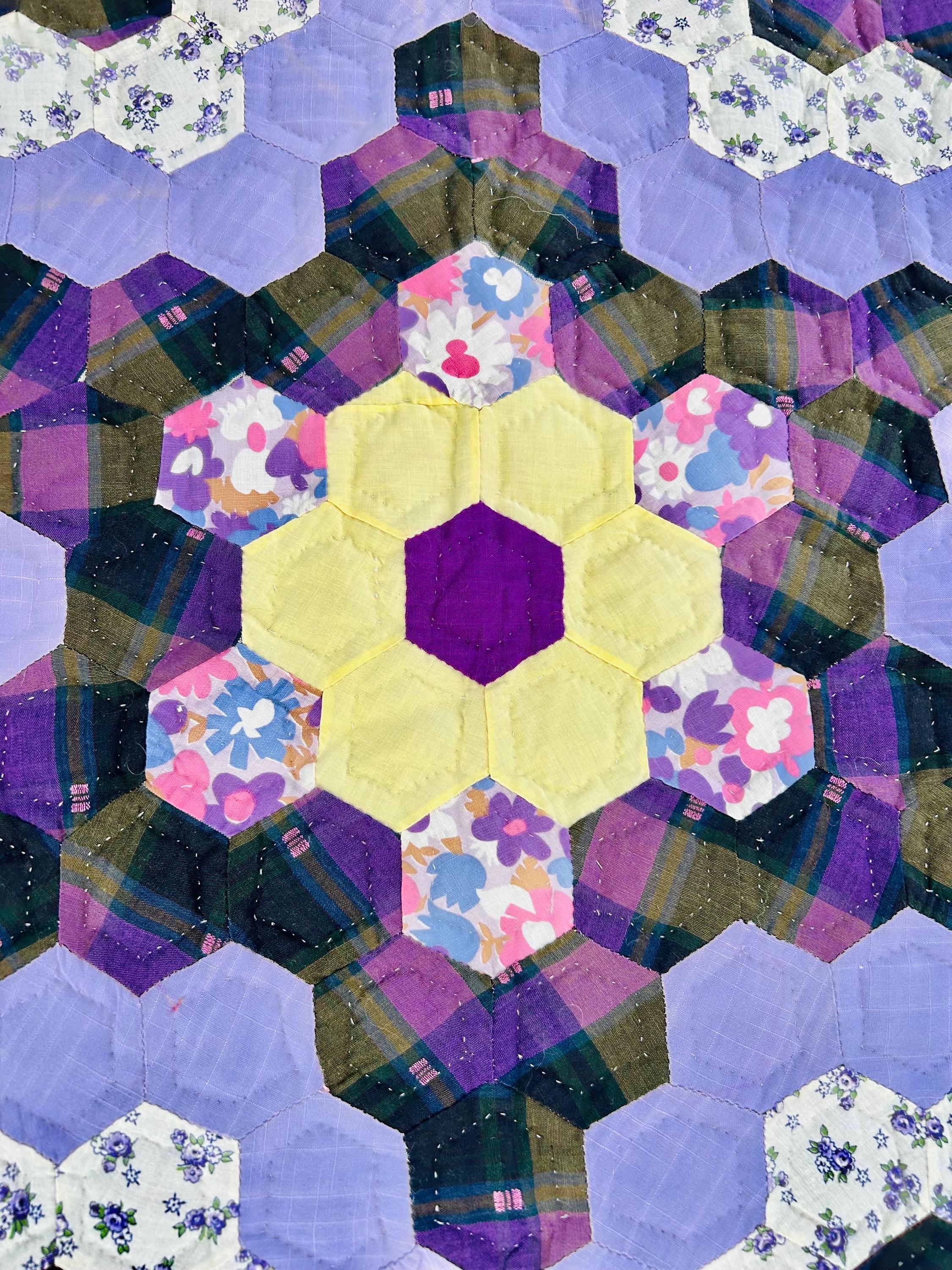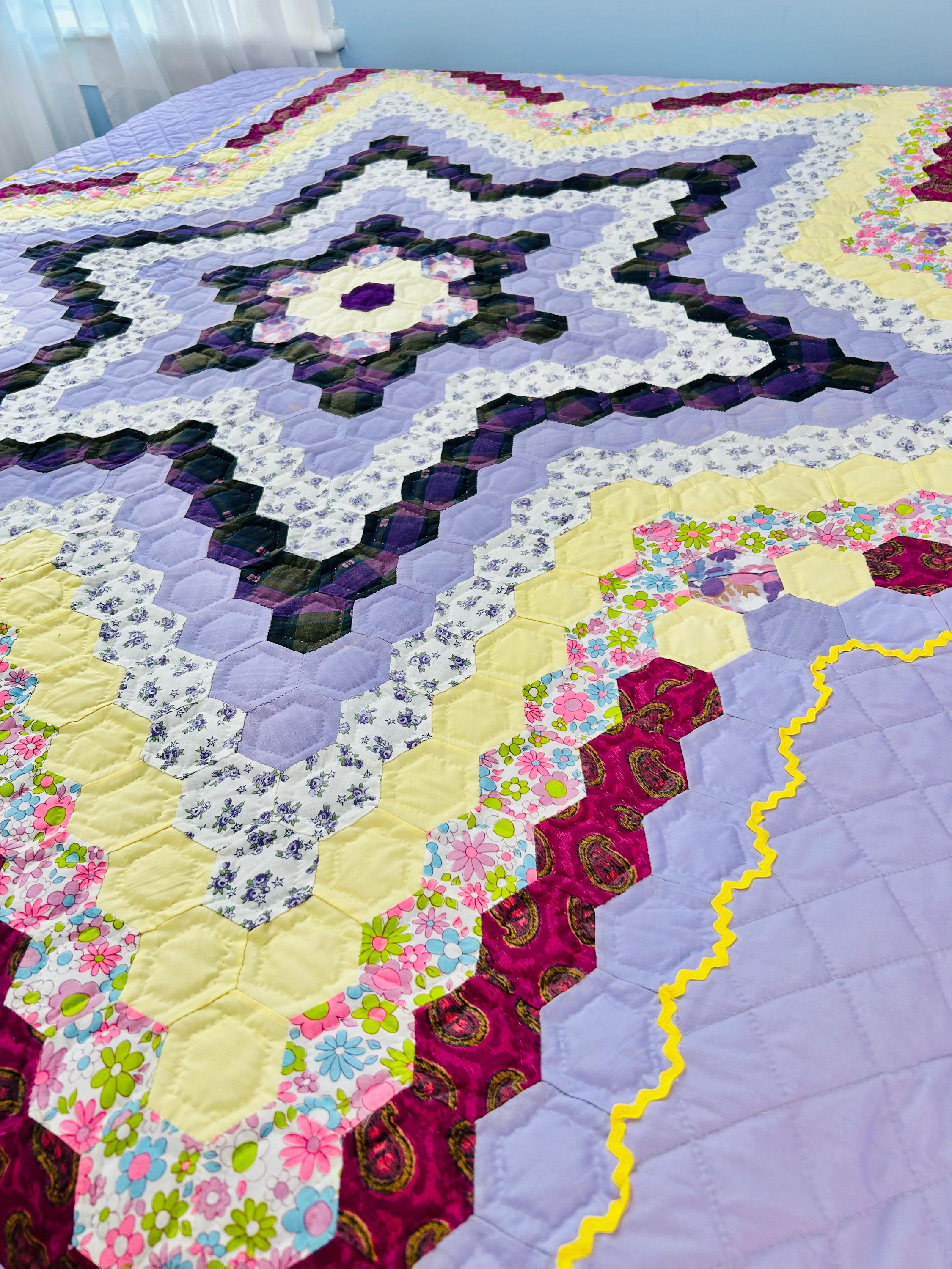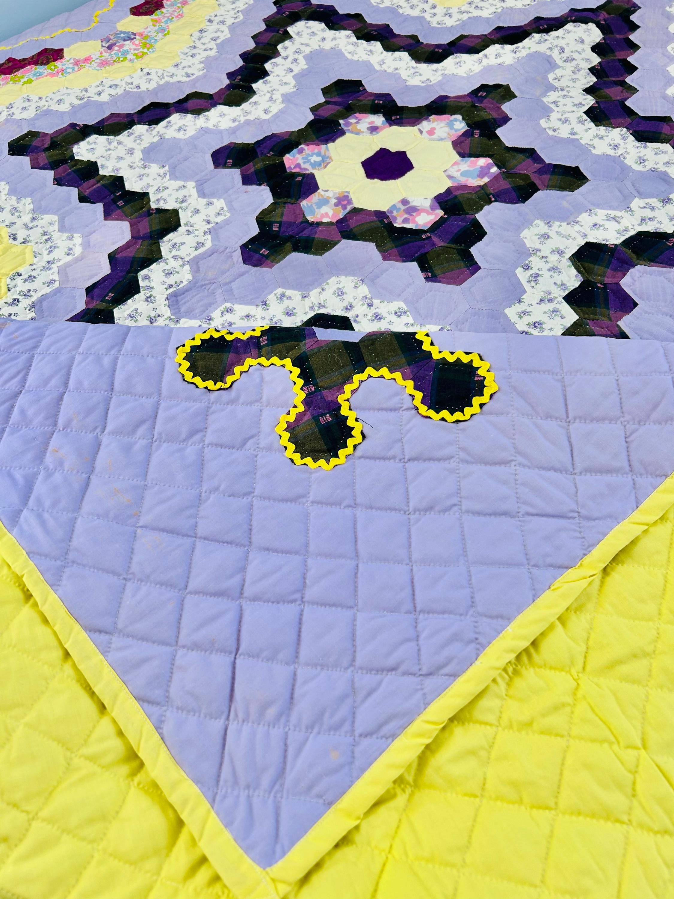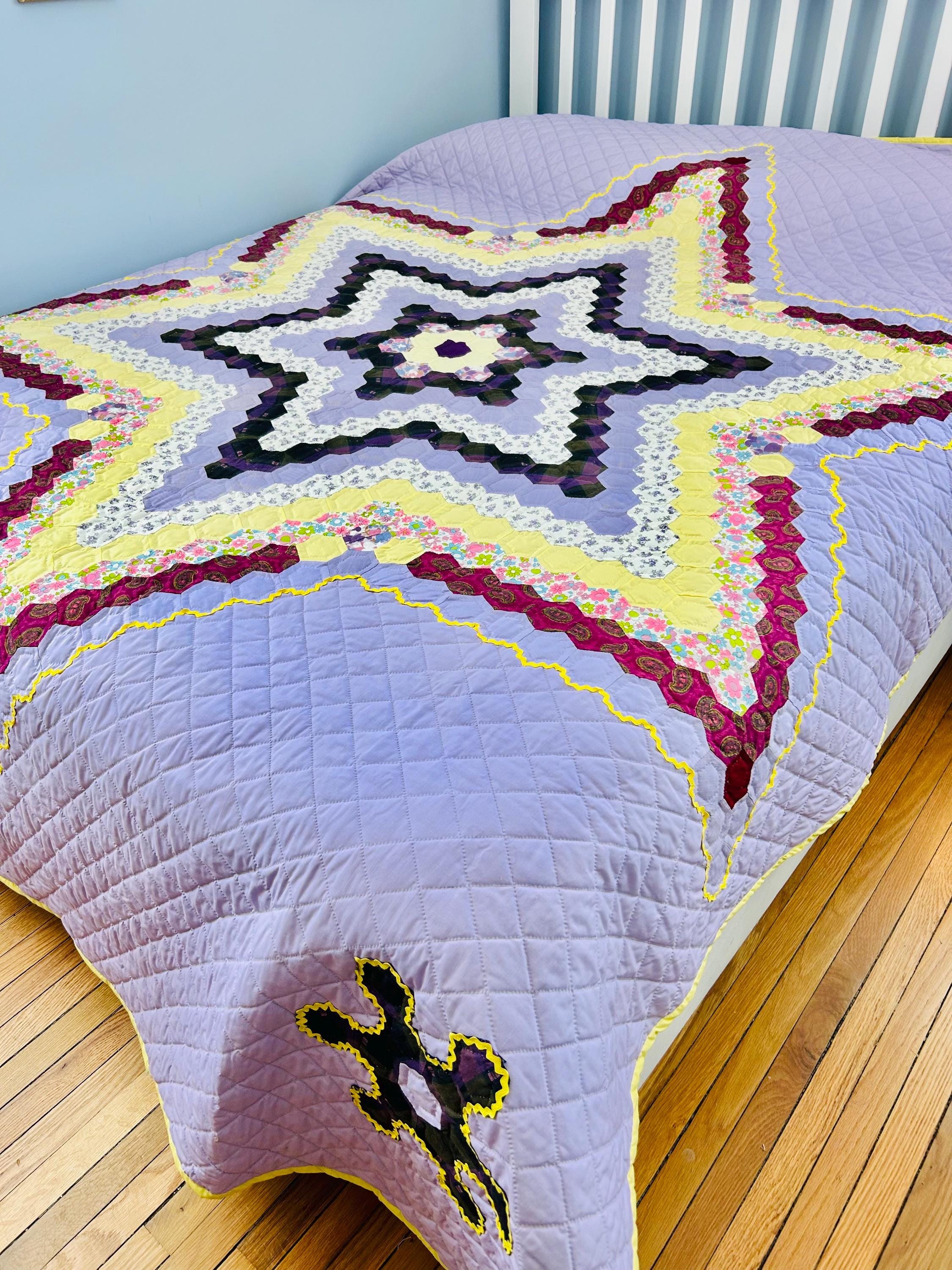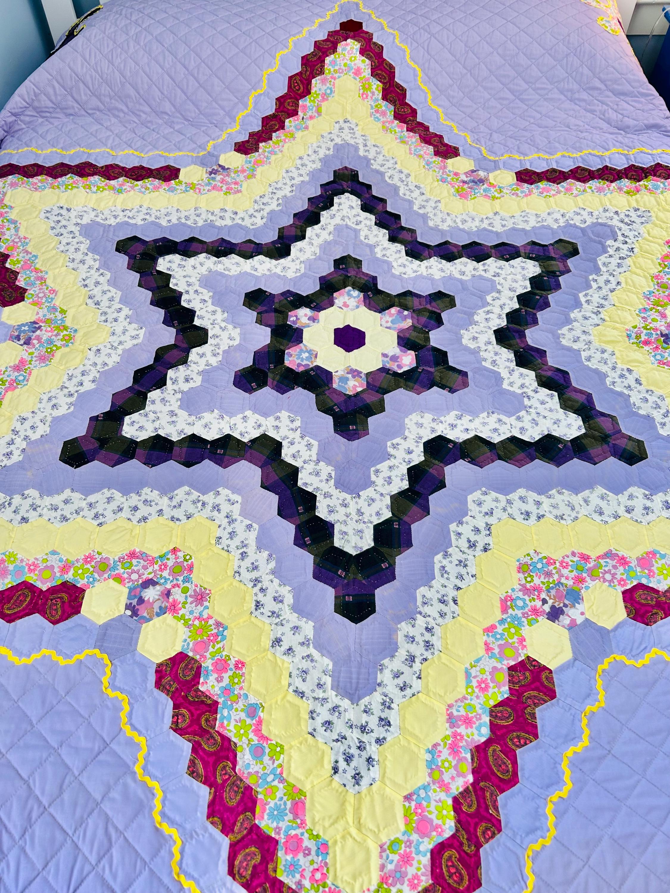 Details • Date: Circa 1960–early 1970s • Pattern: Hexagon Medallion Star • Size: 80” x 102” • Construction: Hand-pieced hexagons, all hand-quilted • Quilting: Hand-quilted in outlines of the hexagons and cross-hatches • Embellishment: Yellow rickrack outlining star and appliqué motifs • Fabrics: 1960s florals, paisleys, plaids, and solids • Backing: Solid bright yellow cotton • Batting: Lightweight