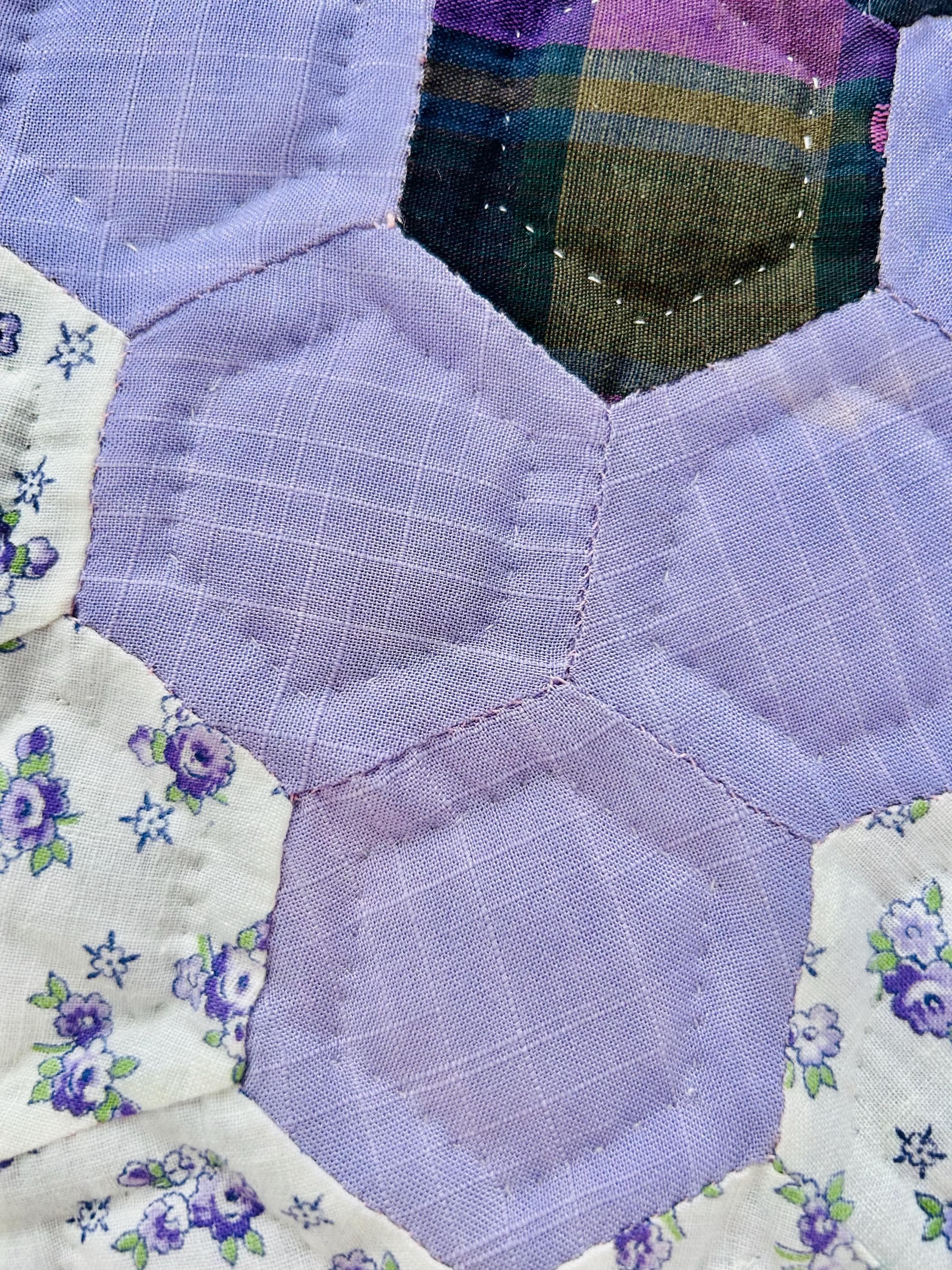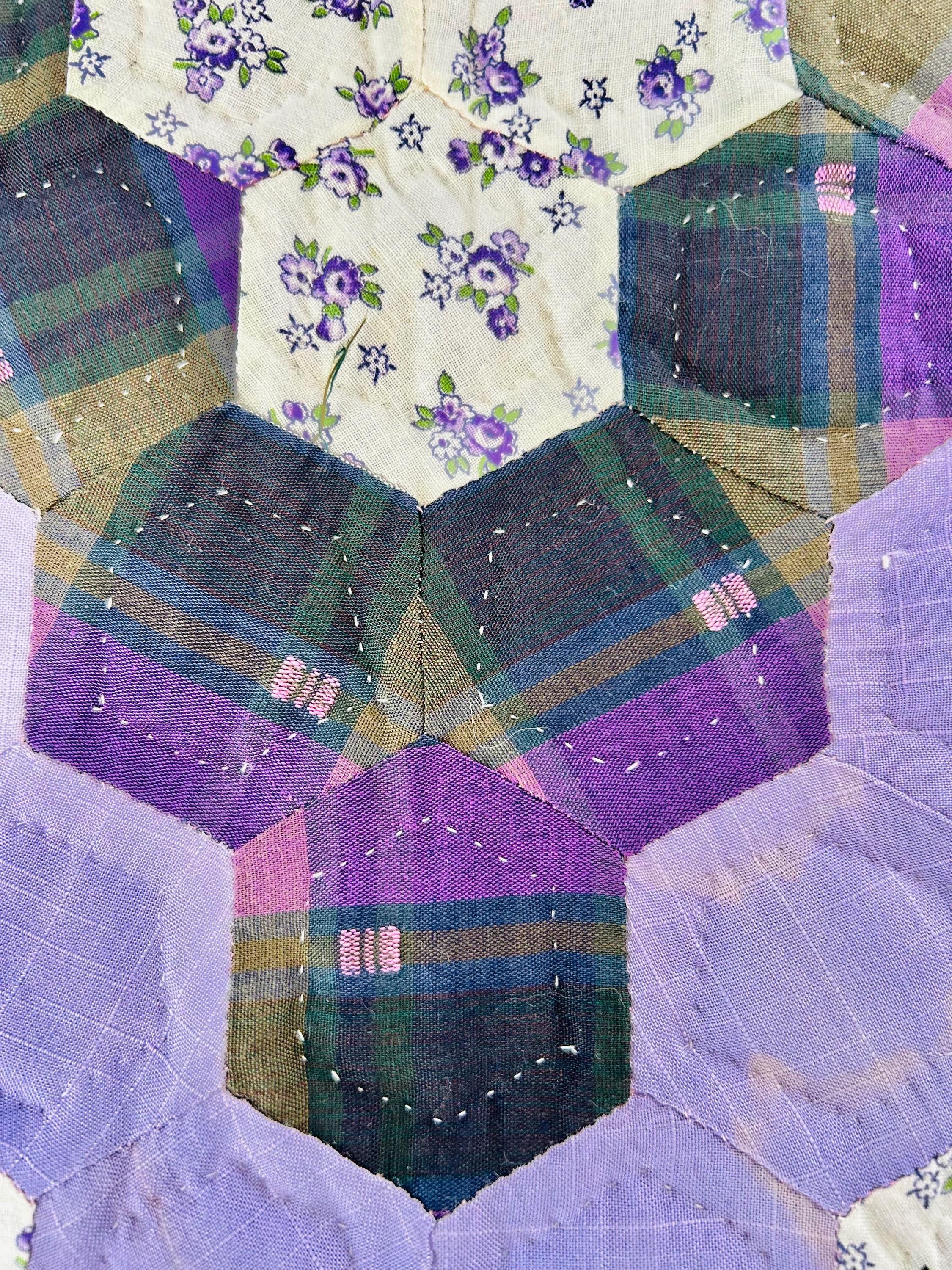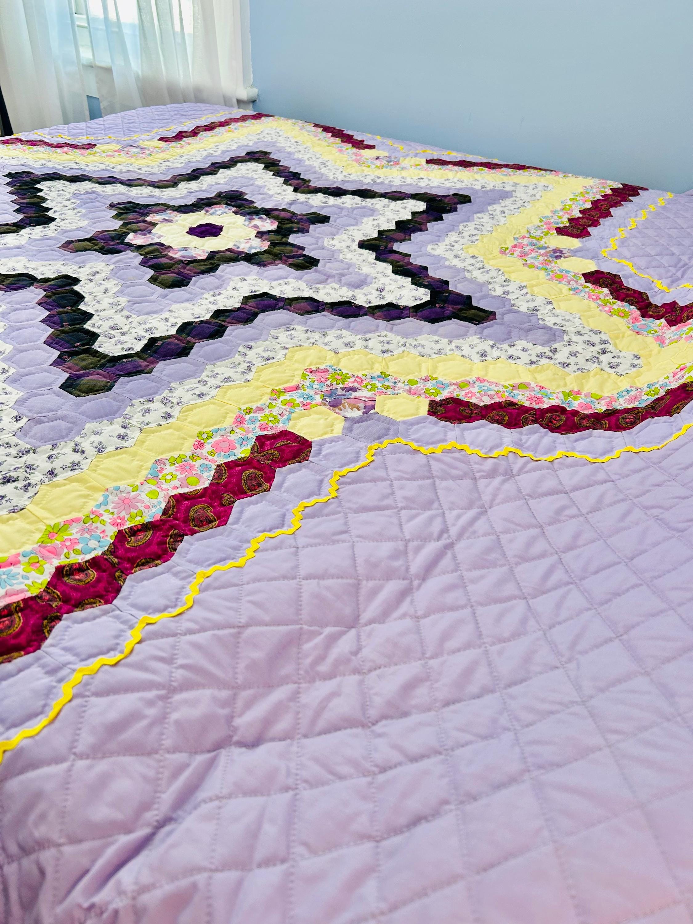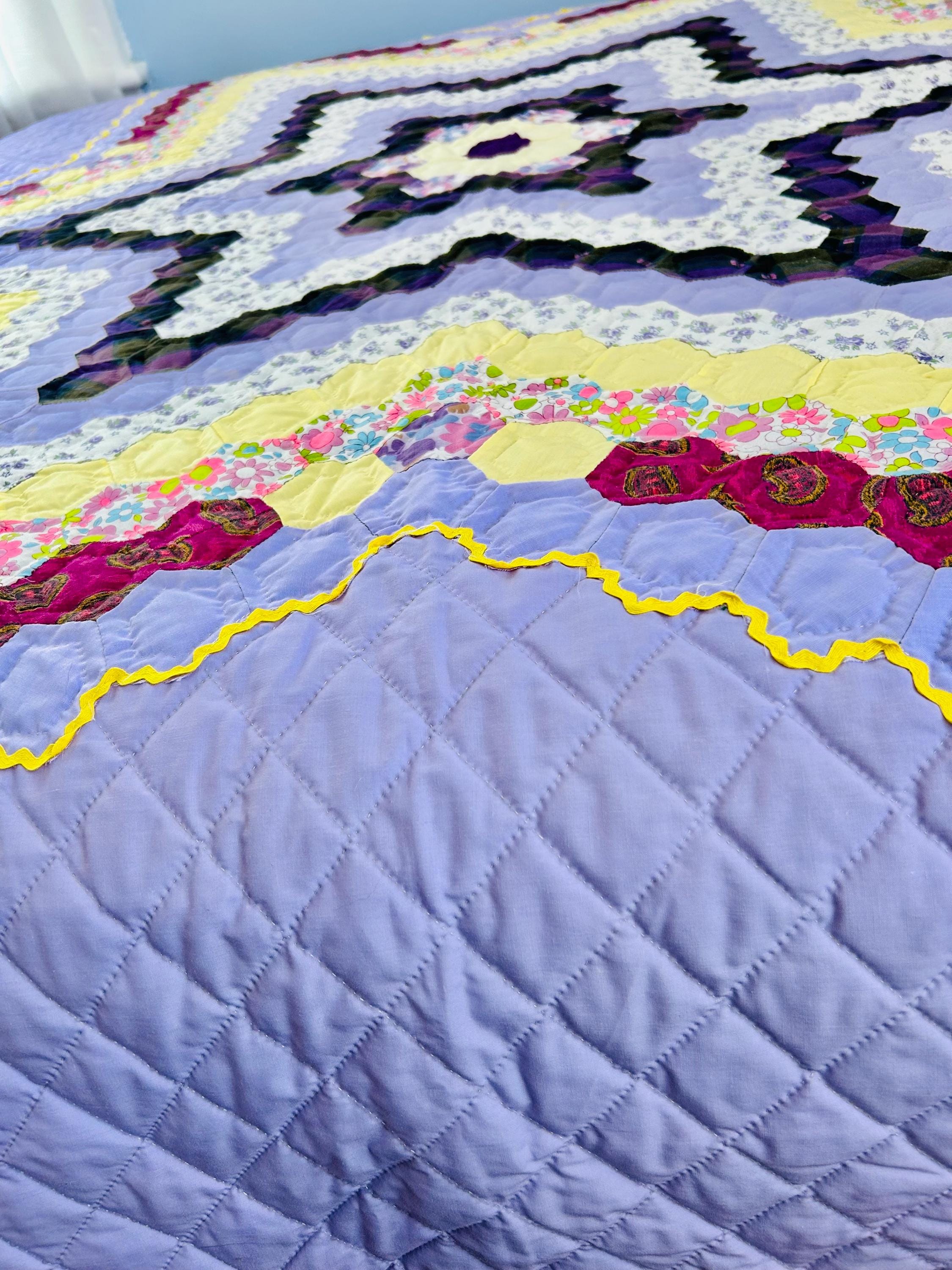 Details • Date: Circa 1960–early 1970s • Pattern: Hexagon Medallion Star • Size: 80” x 102” • Construction: Hand-pieced hexagons, all hand-quilted • Quilting: Hand-quilted in outlines of the hexagons and cross-hatches • Embellishment: Yellow rickrack outlining star and appliqué motifs • Fabrics: 1960s florals, paisleys, plaids, and solids • Backing: Solid bright yellow cotton • Batting: Lightweight