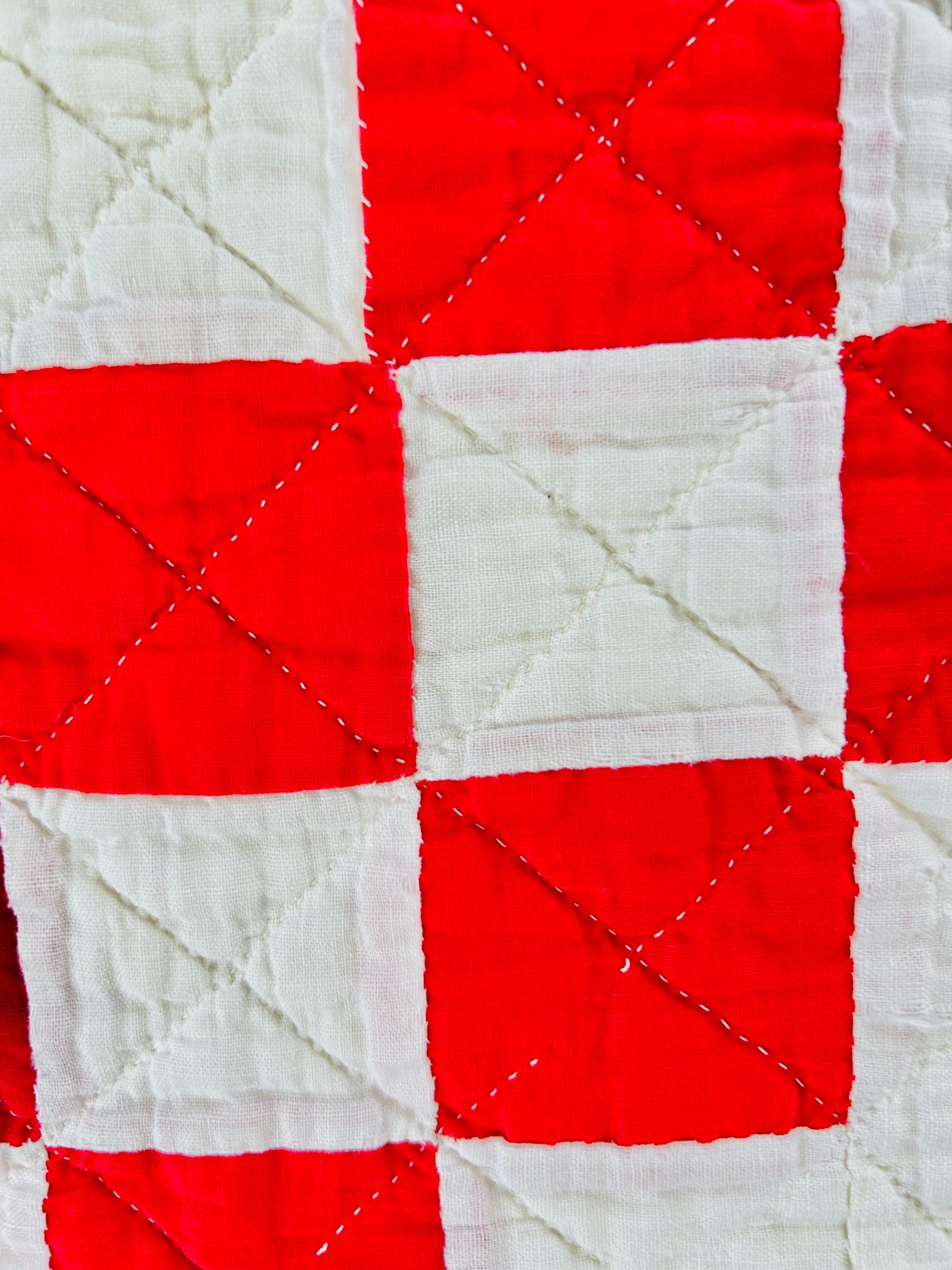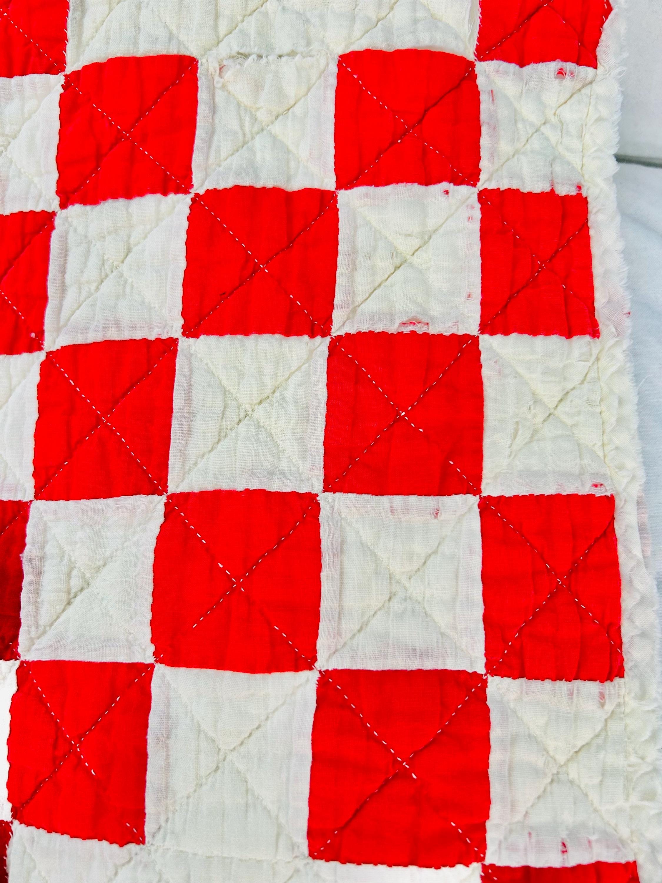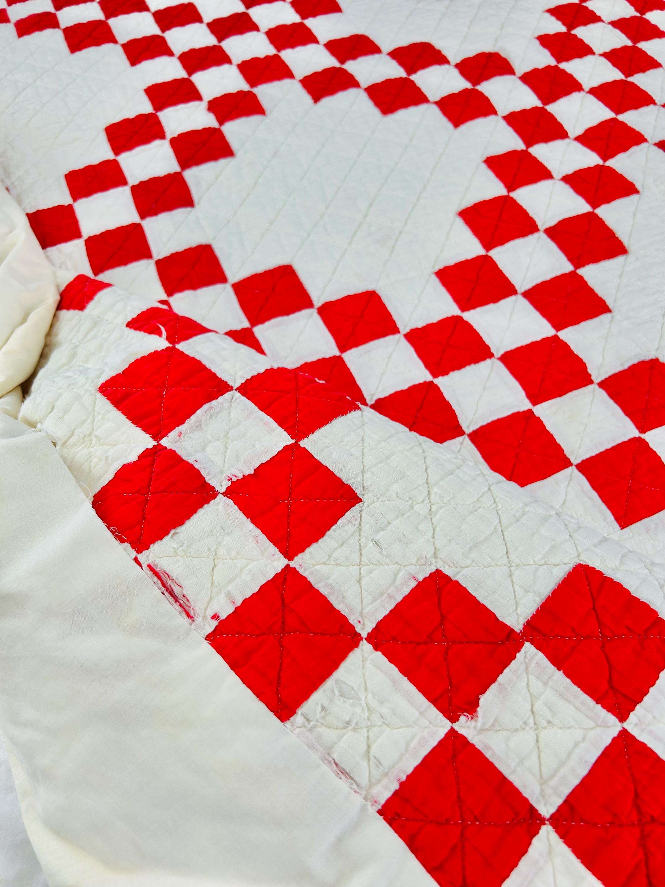 Details • Pattern: Double Irish Chain • Date: Circa 1930s–early 1940s • Size: 76” x 78” • Materials: Cotton top, cotton batting, cotton backing • Construction: Hand pieced and hand quilted • Color: Red and white • Condition: Cutter condition – fabric loss, fraying, thinning, and edge wear present. Structurally intact but not suitable for heavy use.
