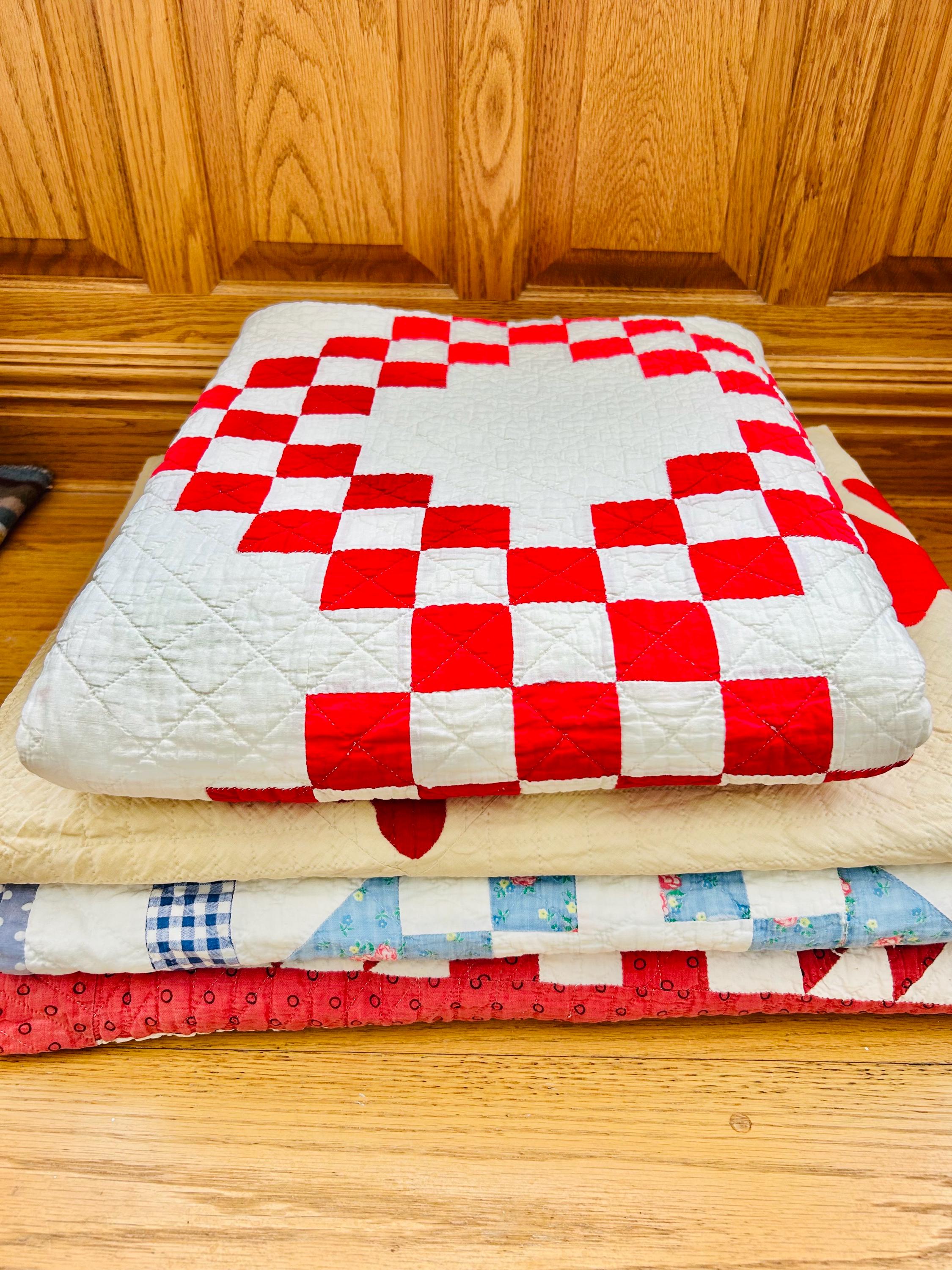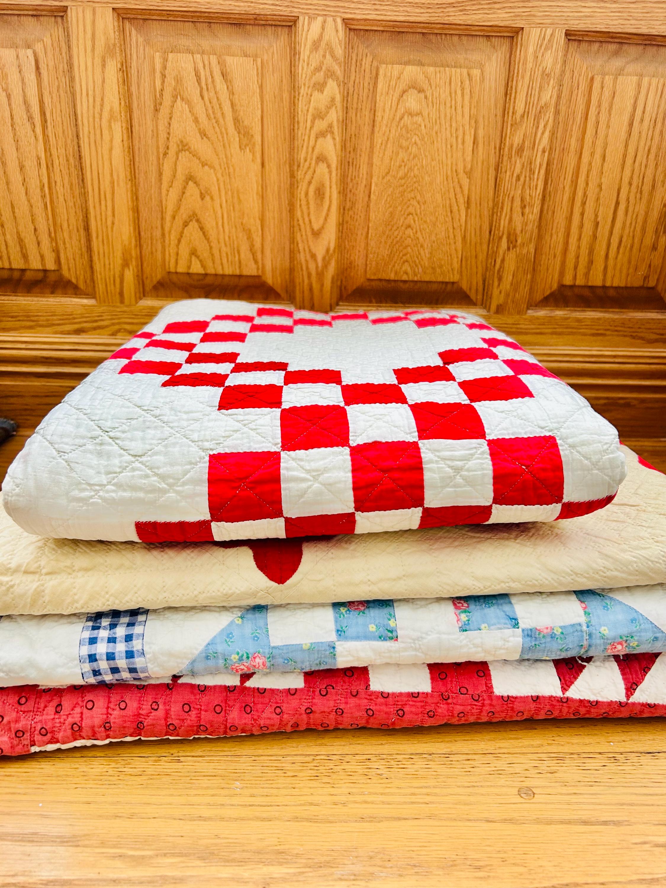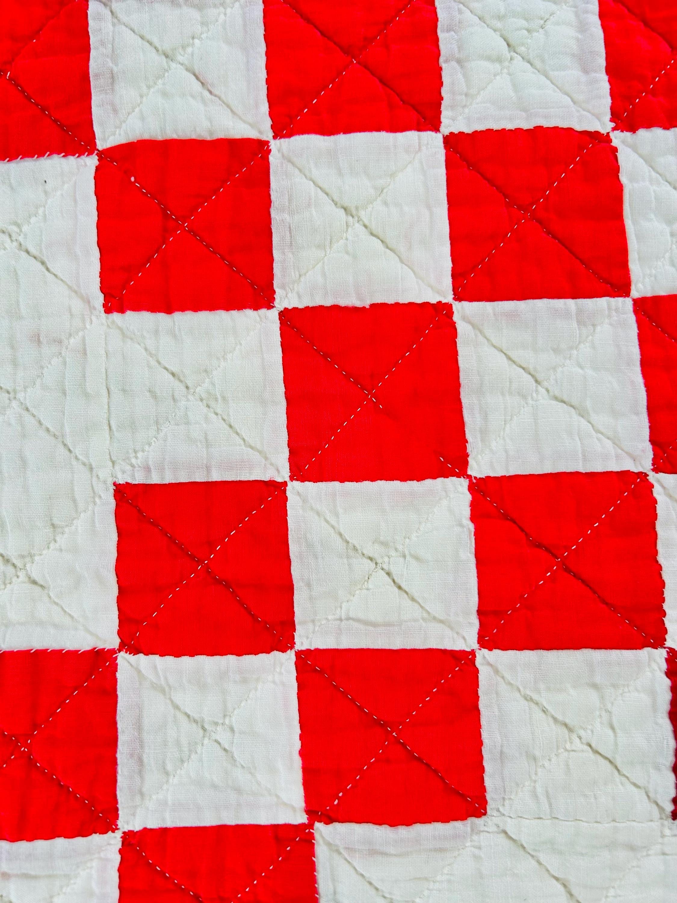 Details • Pattern: Double Irish Chain • Date: Circa 1930s–early 1940s • Size: 76” x 78” • Materials: Cotton top, cotton batting, cotton backing • Construction: Hand pieced and hand quilted • Color: Red and white • Condition: Cutter condition – fabric loss, fraying, thinning, and edge wear present. Structurally intact but not suitable for heavy use.