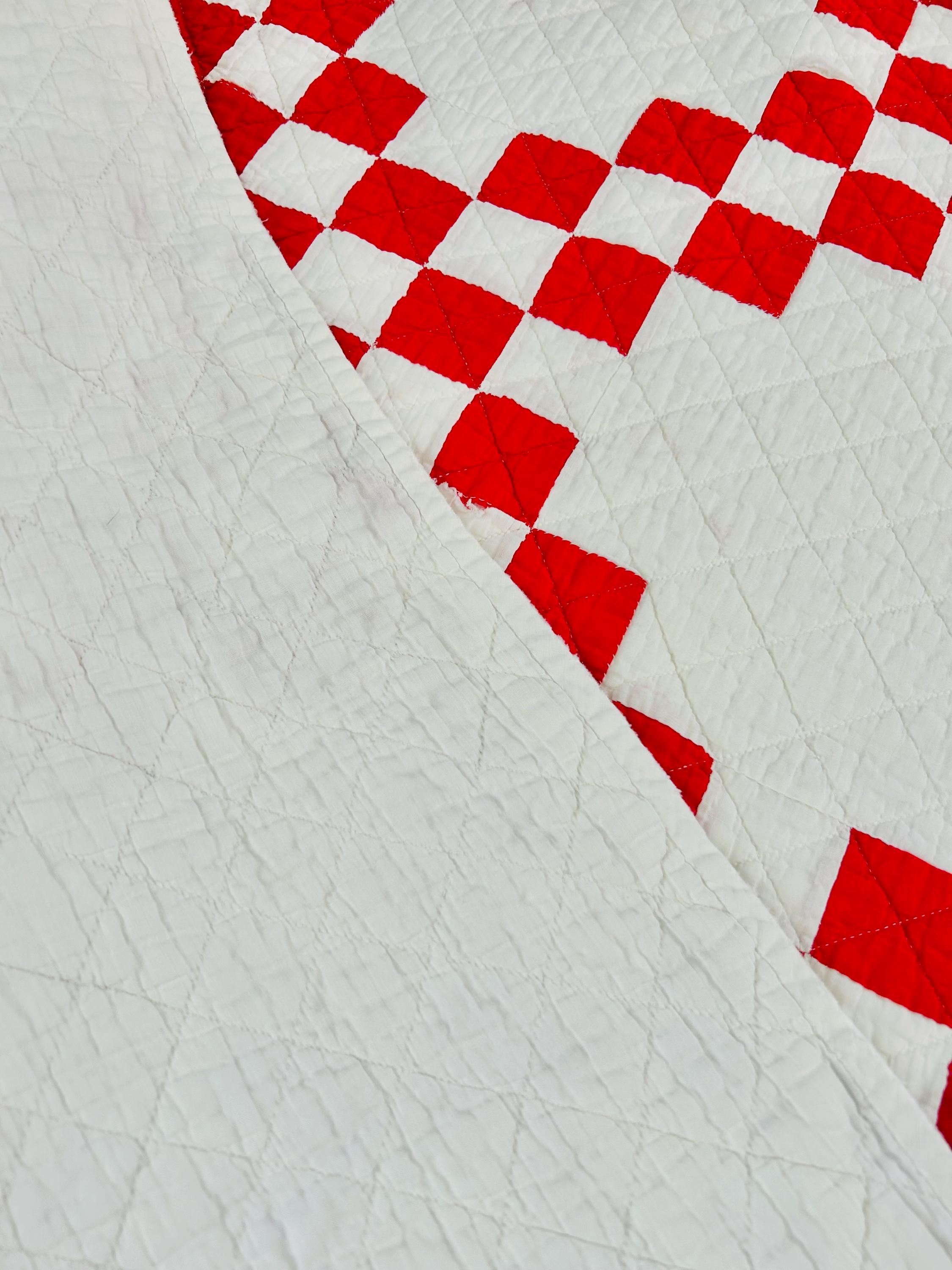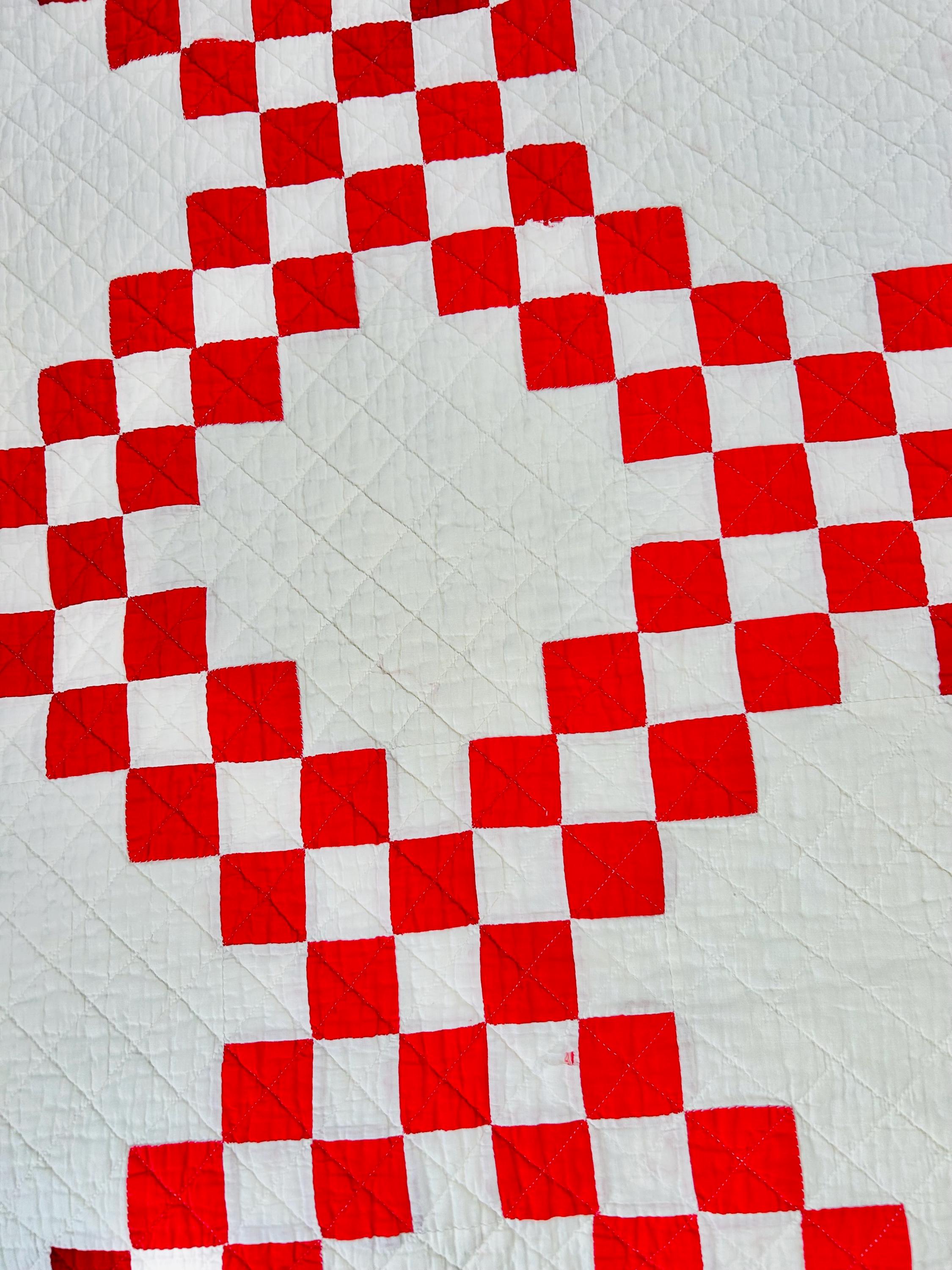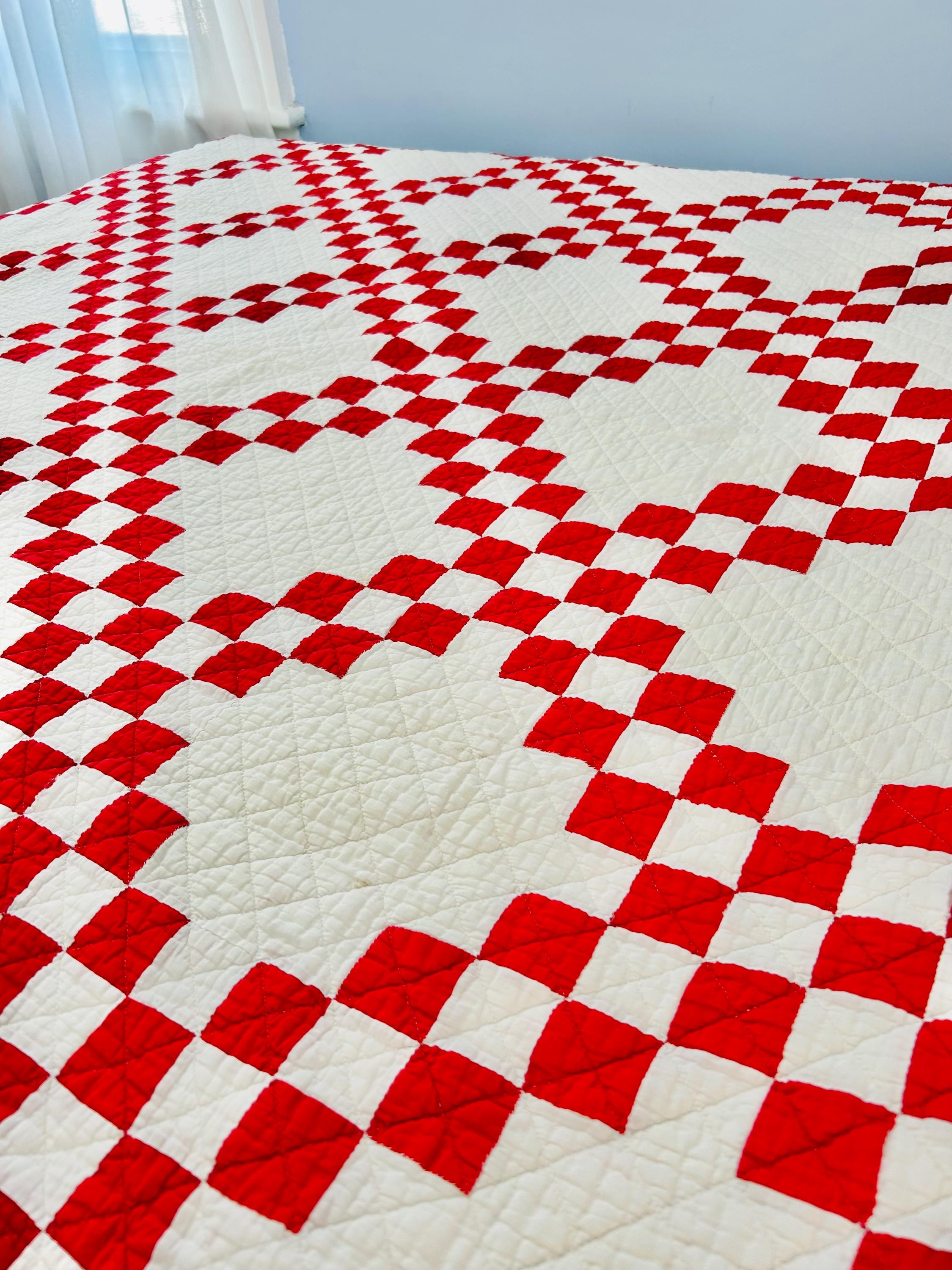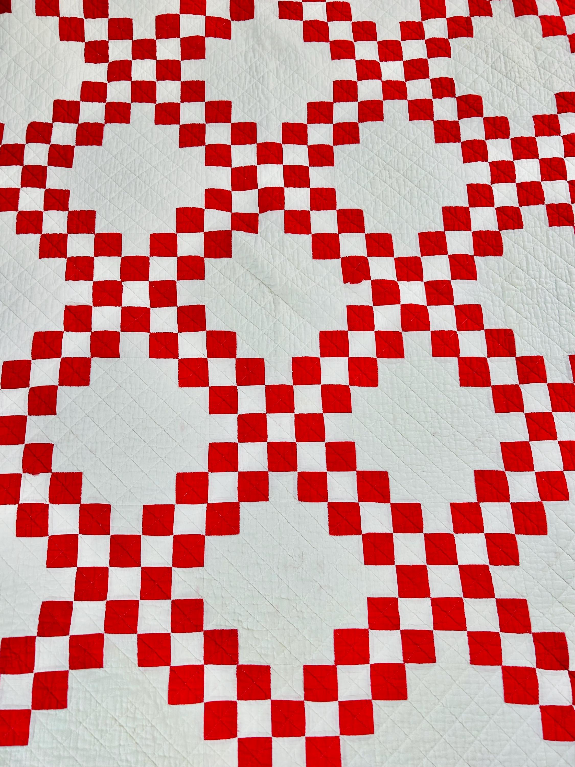 This is a classic American farmhouse quilt in bold red and white and a Double Irish Chain pattern, dating to the 1930s through 1940s. Entirely hand pieced and hand quilted, the quilting features diagonal crosshatching in the white blocks and hand-stitched X motifs in the red squares.