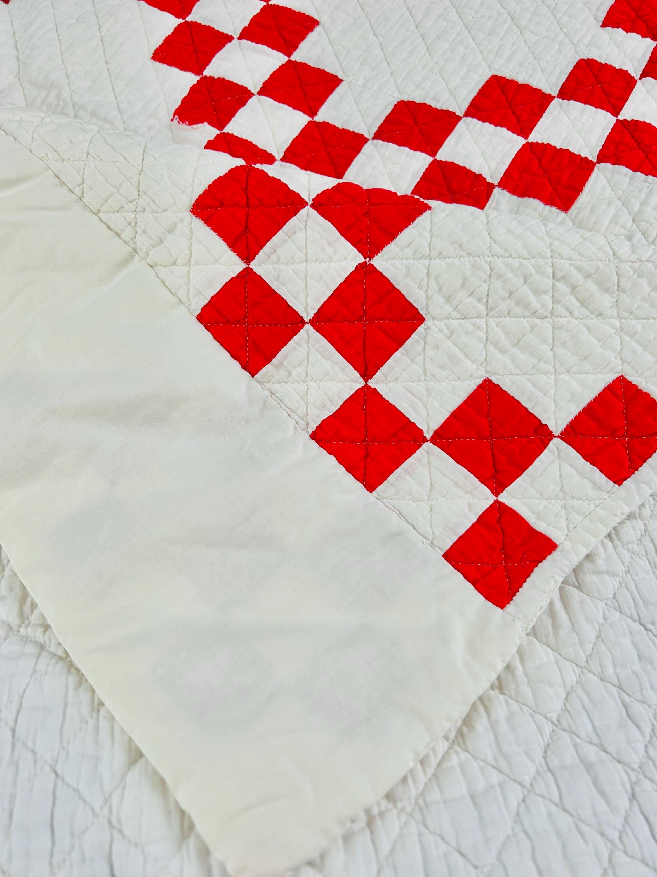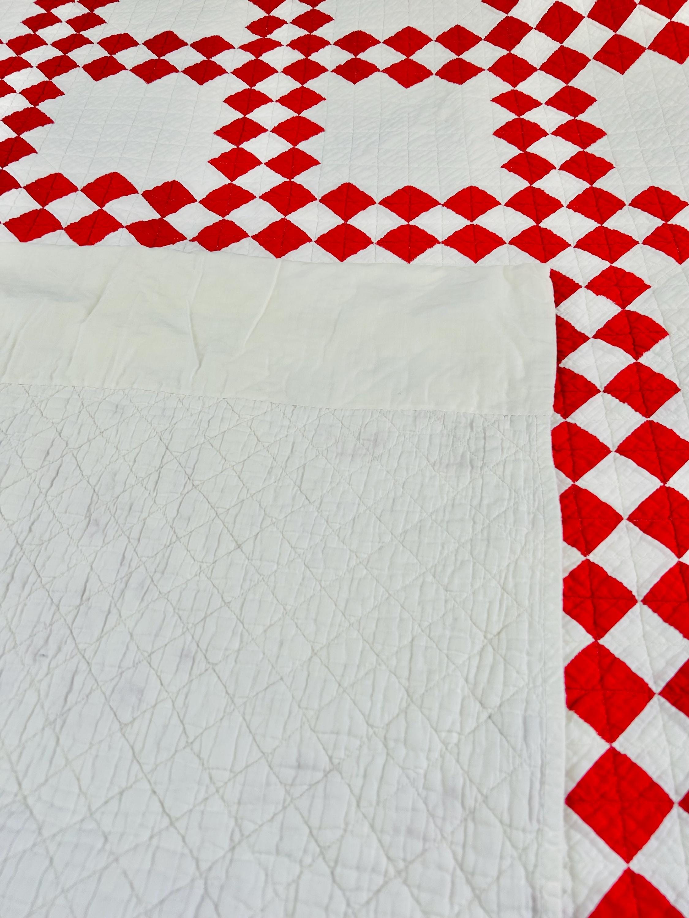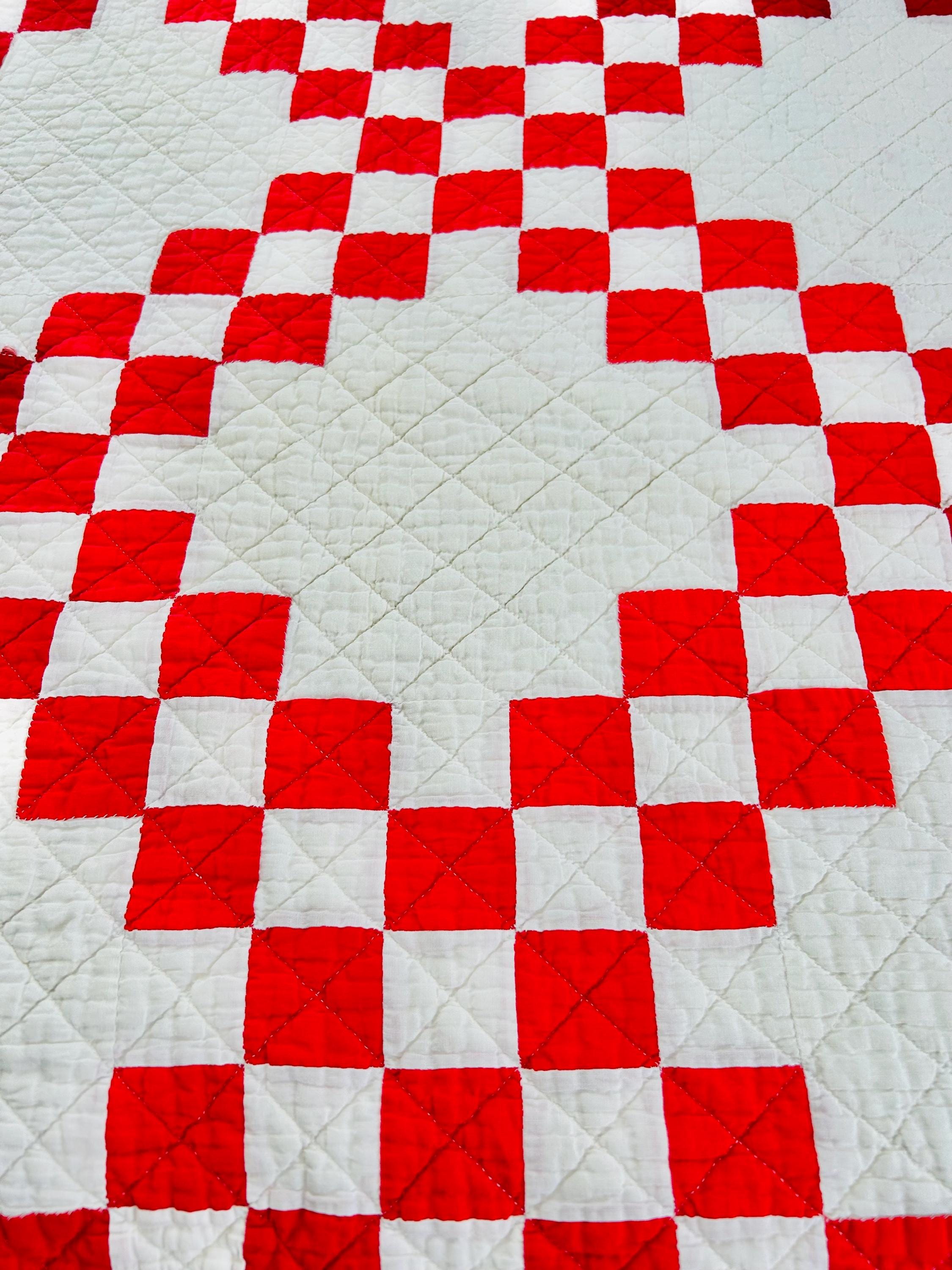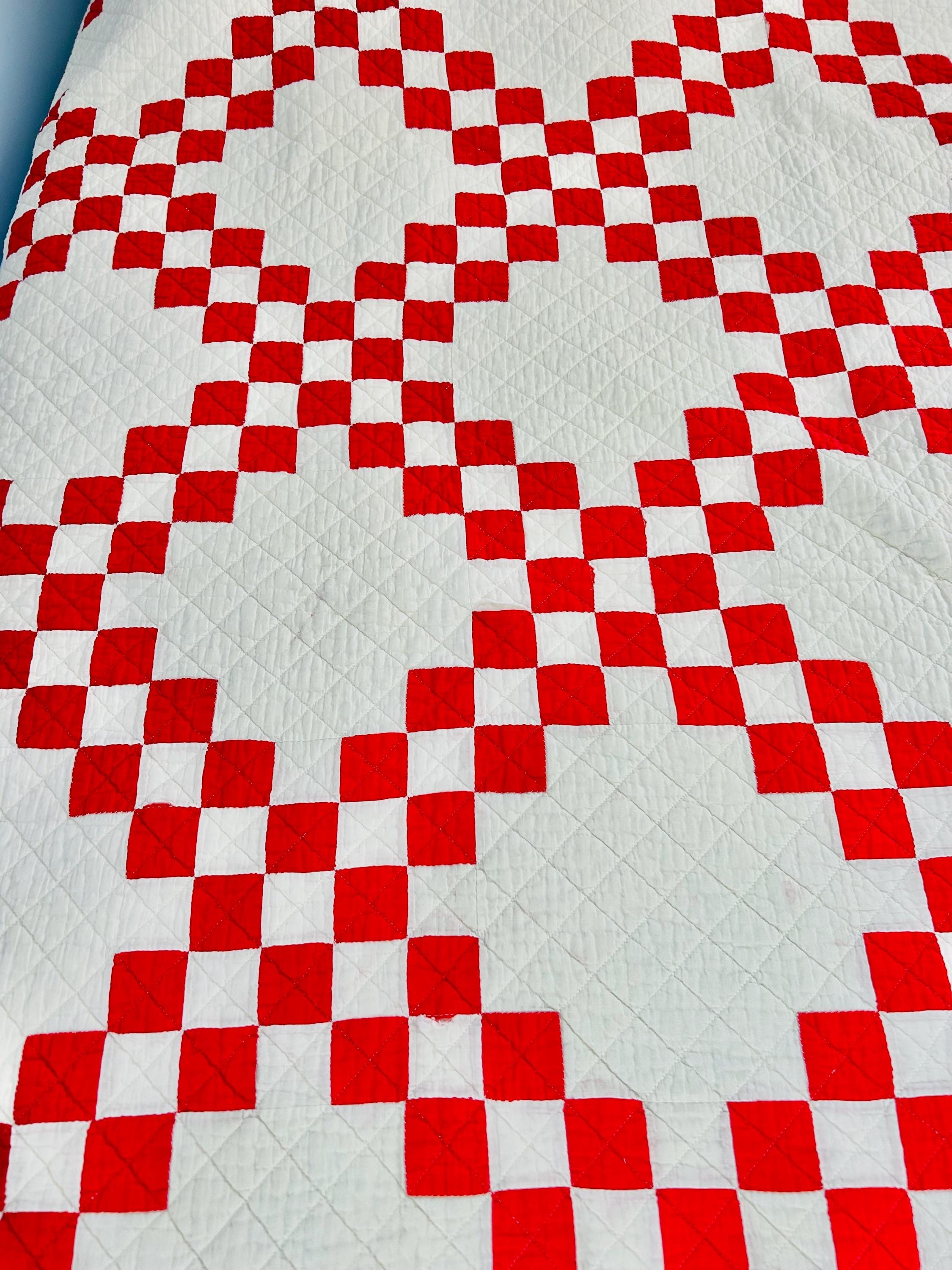 This is a classic American farmhouse quilt in bold red and white and a Double Irish Chain pattern, dating to the 1930s through 1940s. Entirely hand pieced and hand quilted, the quilting features diagonal crosshatching in the white blocks and hand-stitched X motifs in the red squares.
