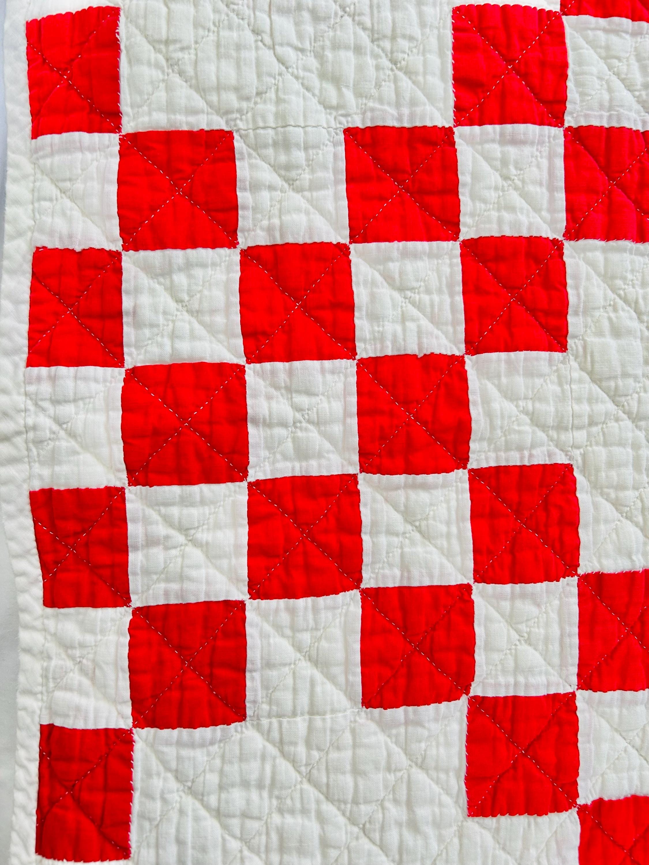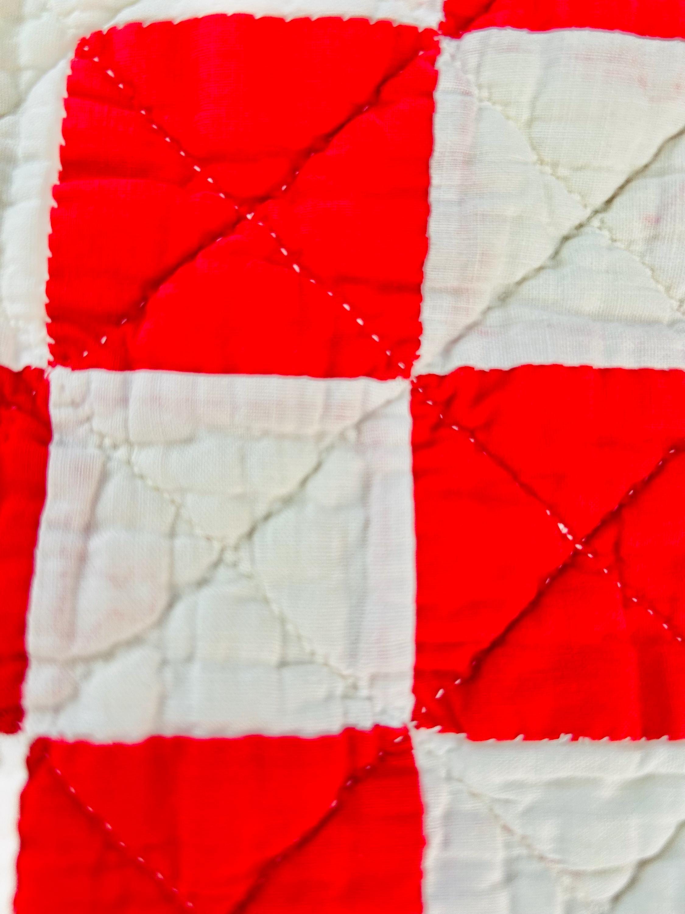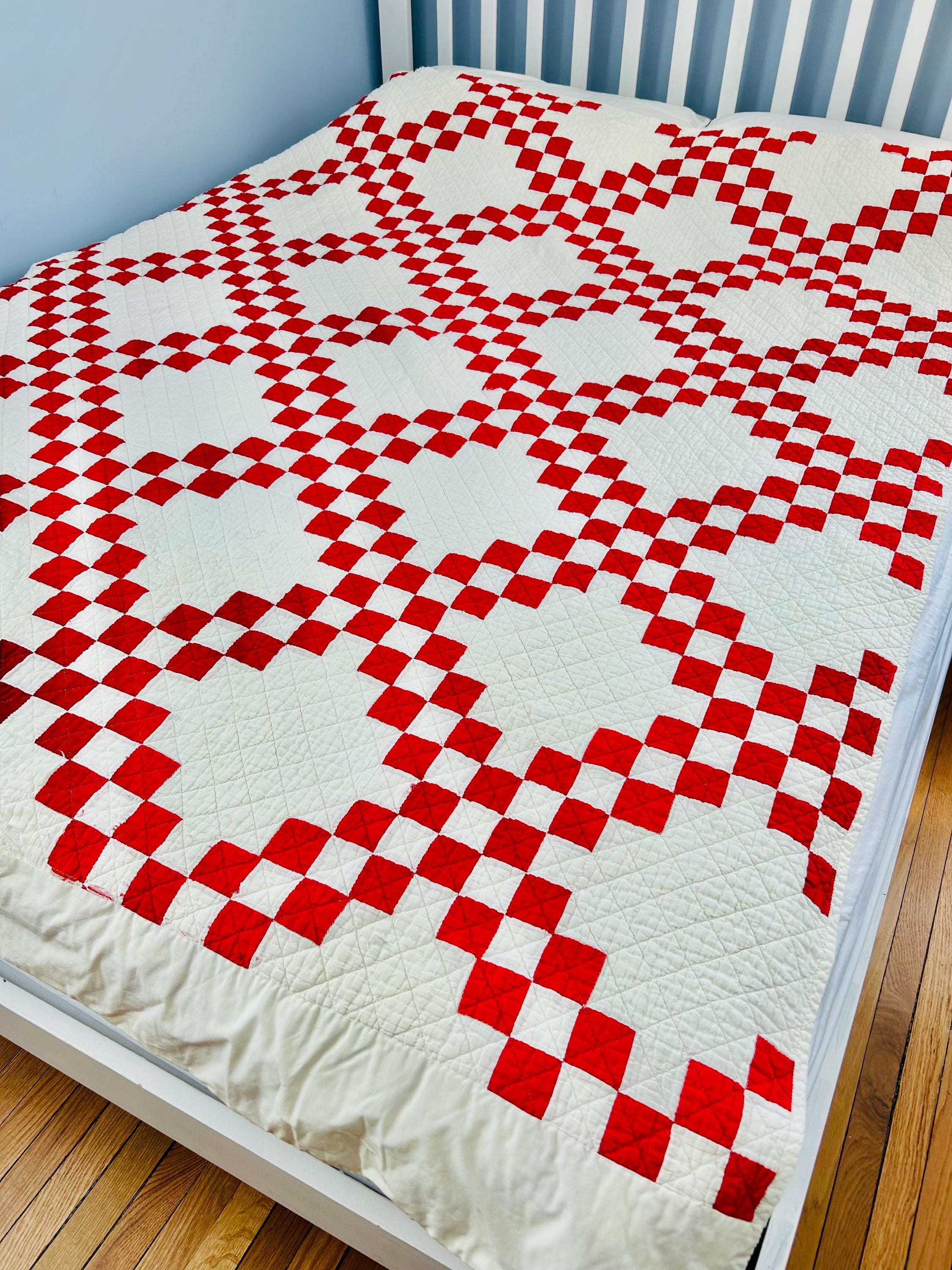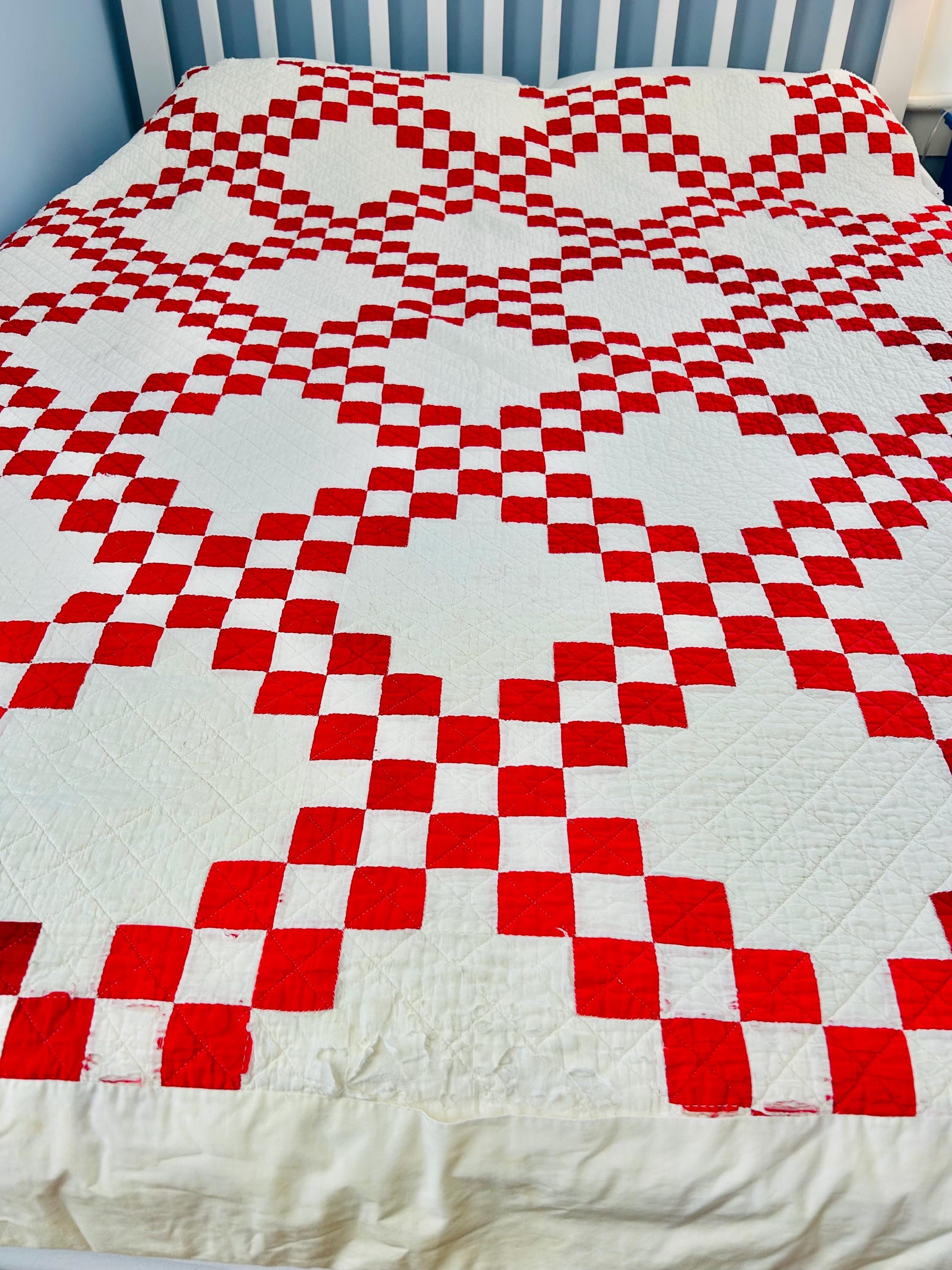 This is a classic American farmhouse quilt in bold red and white and a Double Irish Chain pattern, dating to the 1930s through 1940s. Entirely hand pieced and hand quilted, the quilting features diagonal crosshatching in the white blocks and hand-stitched X motifs in the red squares.