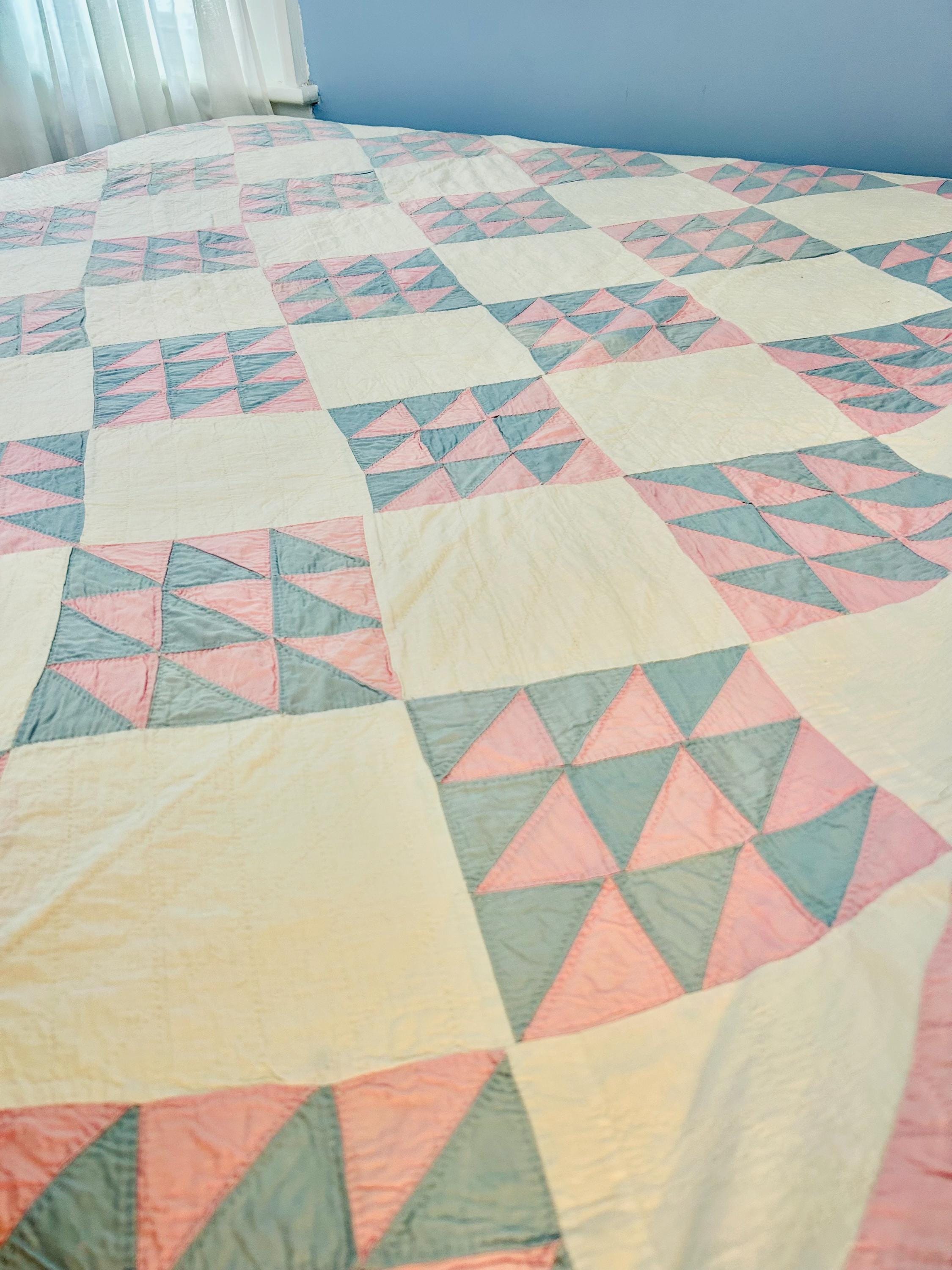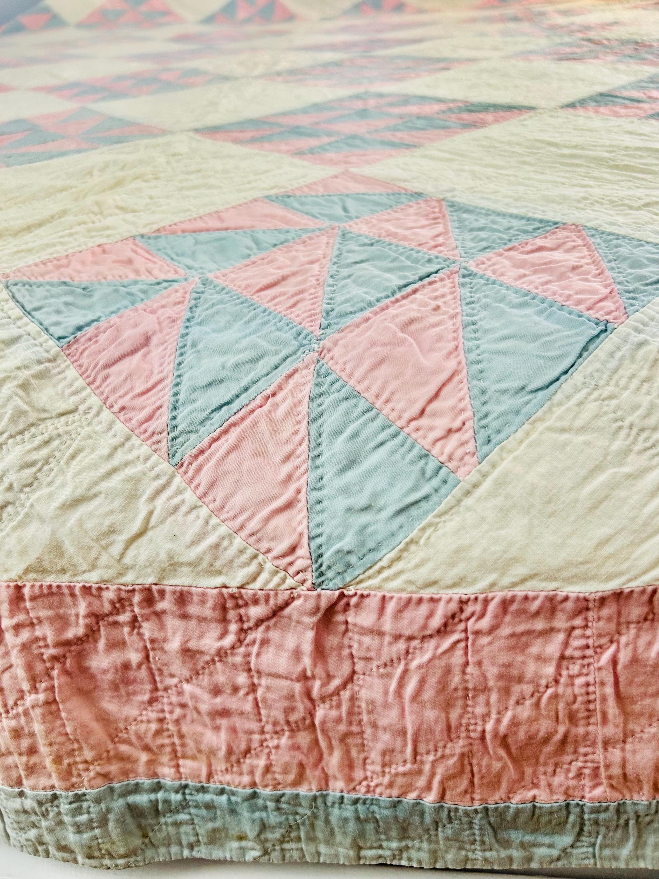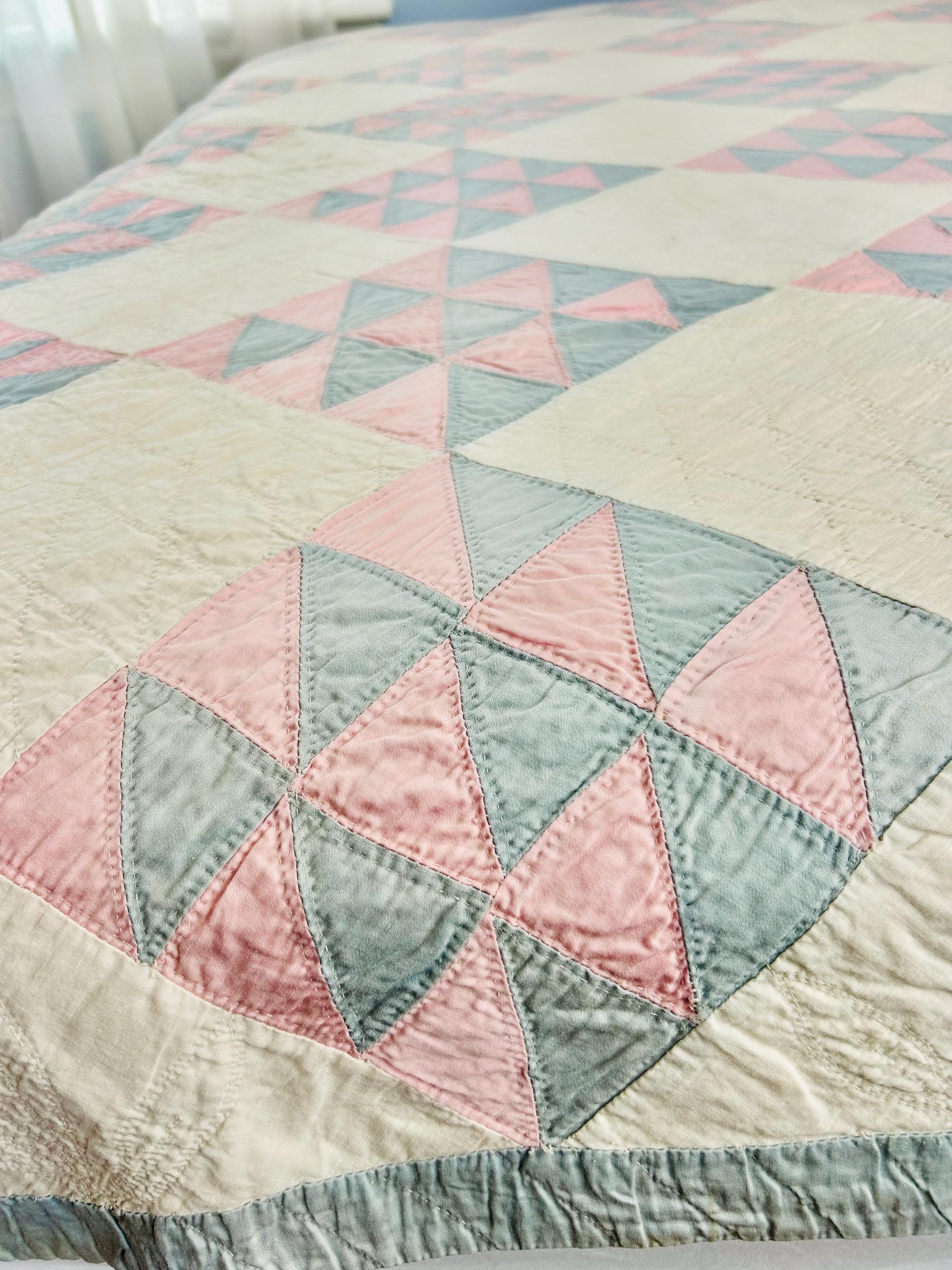 ✨ Details: • Size: Approx. 66” x 78” • Era: Circa 1930s – 1940s. • Pattern: Birds in the Air (Geometric Triangles). • Material: 100% Cotton fabrics and batting. • Construction: Hand-pieced and meticulously hand-quilted. • Stitch Integrity: Hand-quilting is strong and intact across the piece.