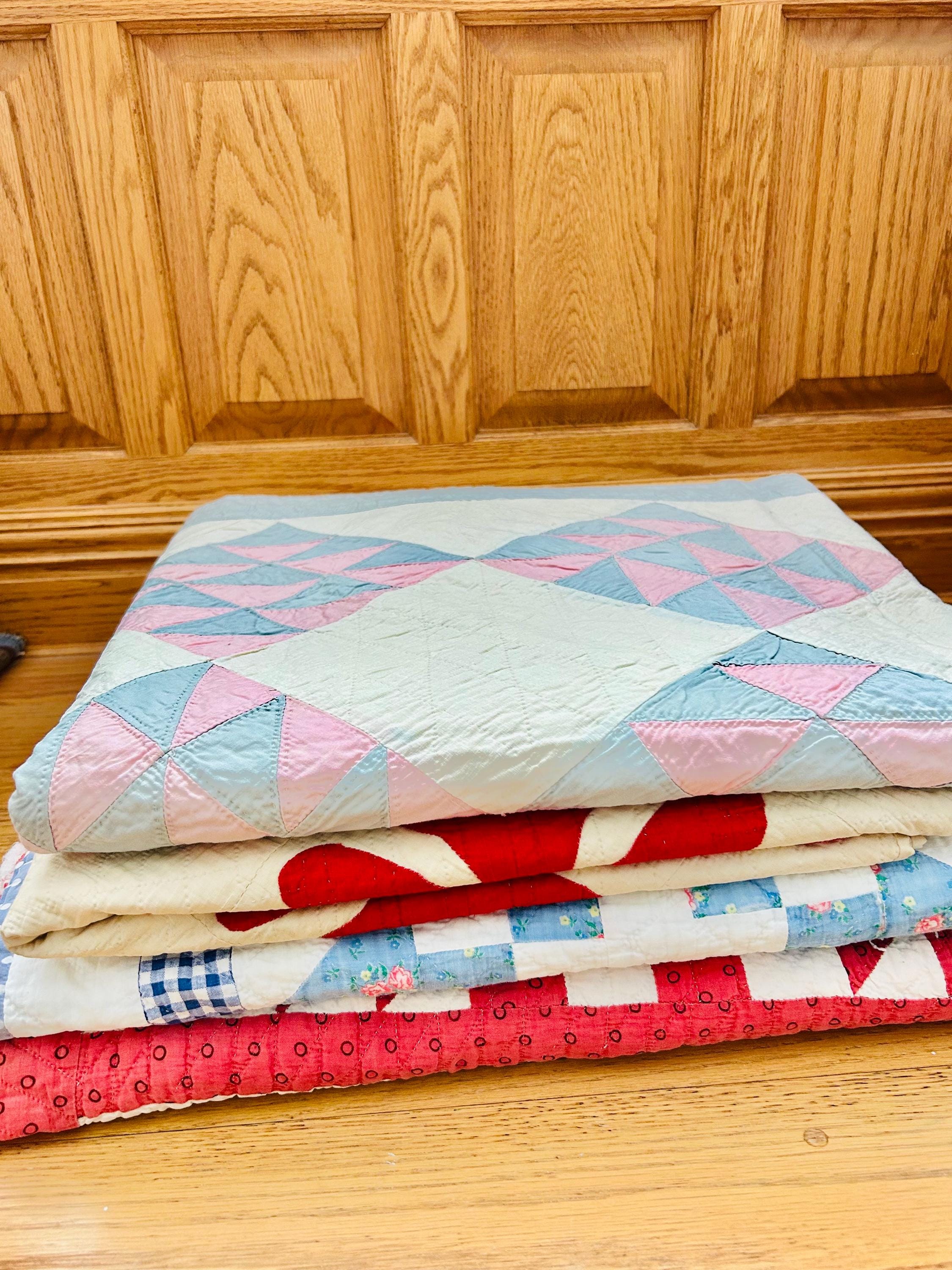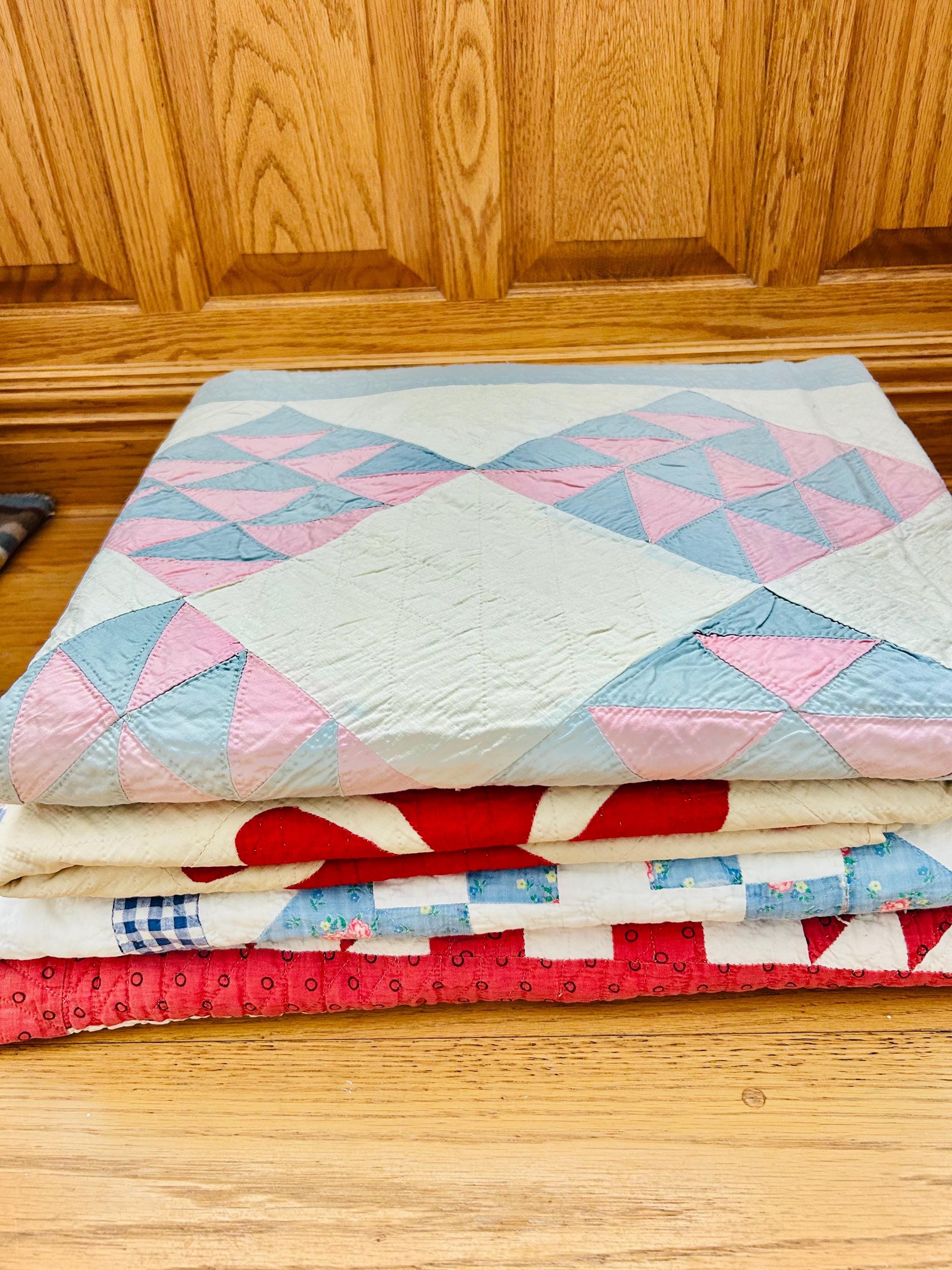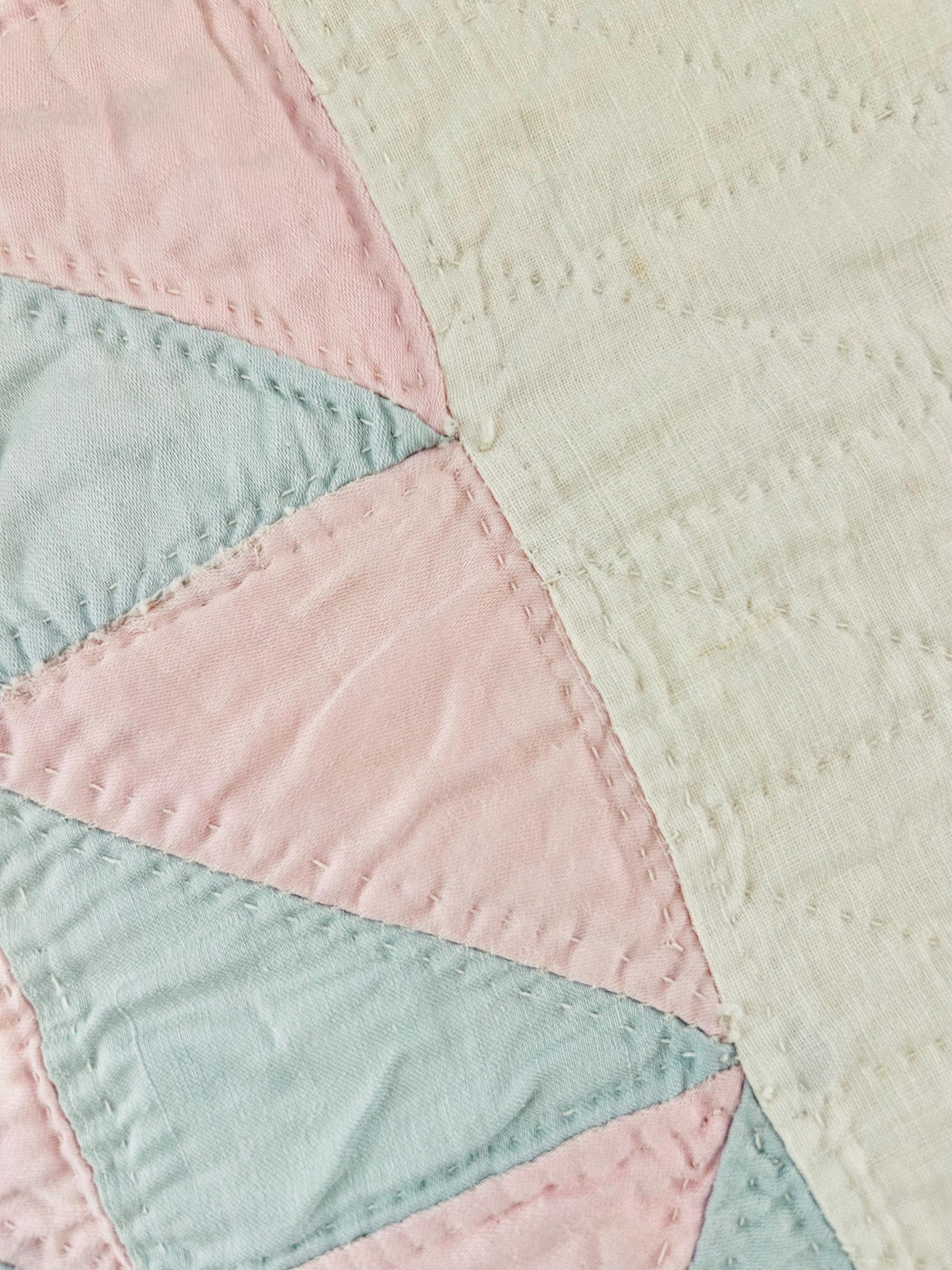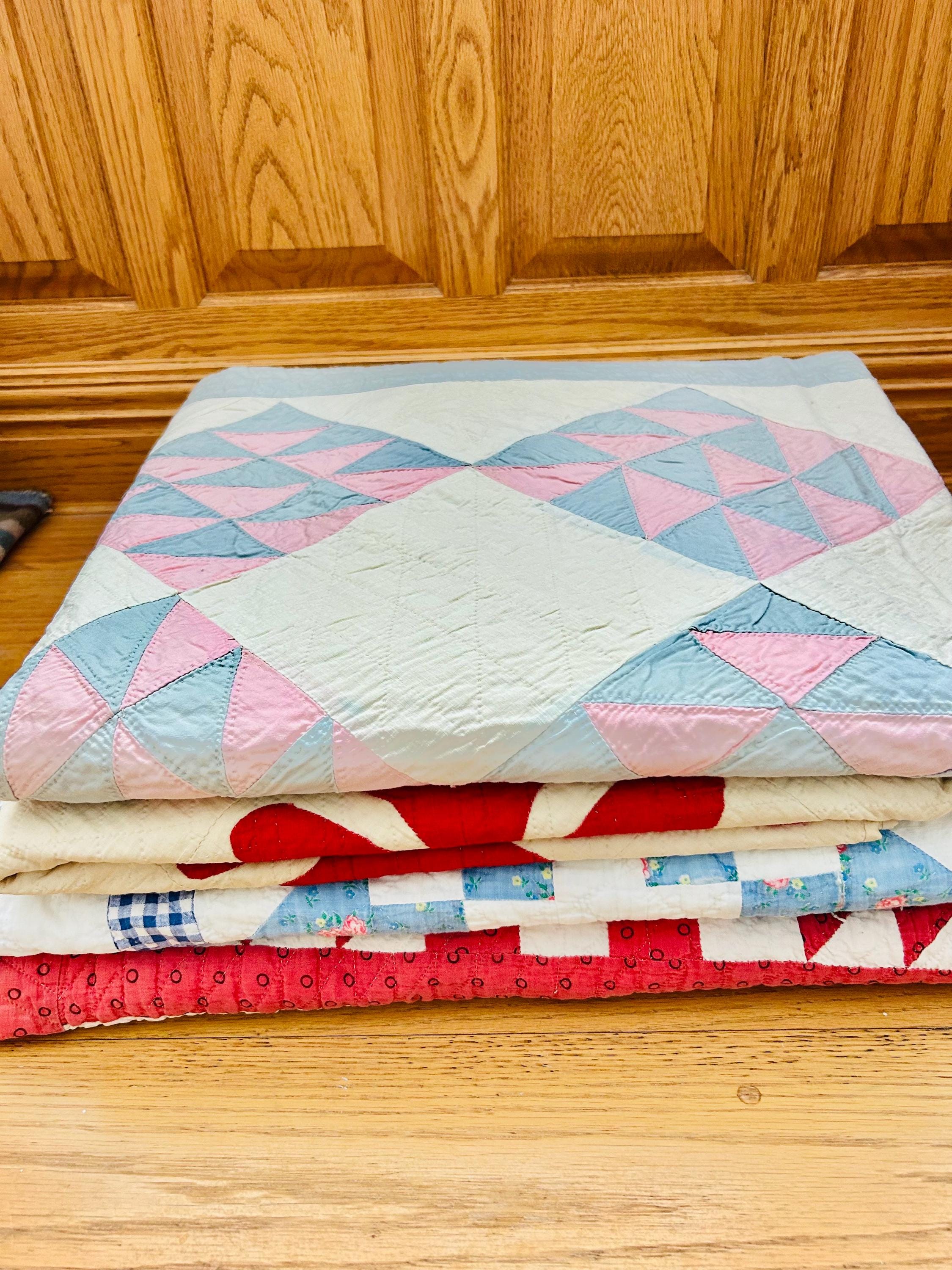 ✨ Details: • Size: Approx. 66” x 78” • Era: Circa 1930s – 1940s. • Pattern: Birds in the Air (Geometric Triangles). • Material: 100% Cotton fabrics and batting. • Construction: Hand-pieced and meticulously hand-quilted. • Stitch Integrity: Hand-quilting is strong and intact across the piece.