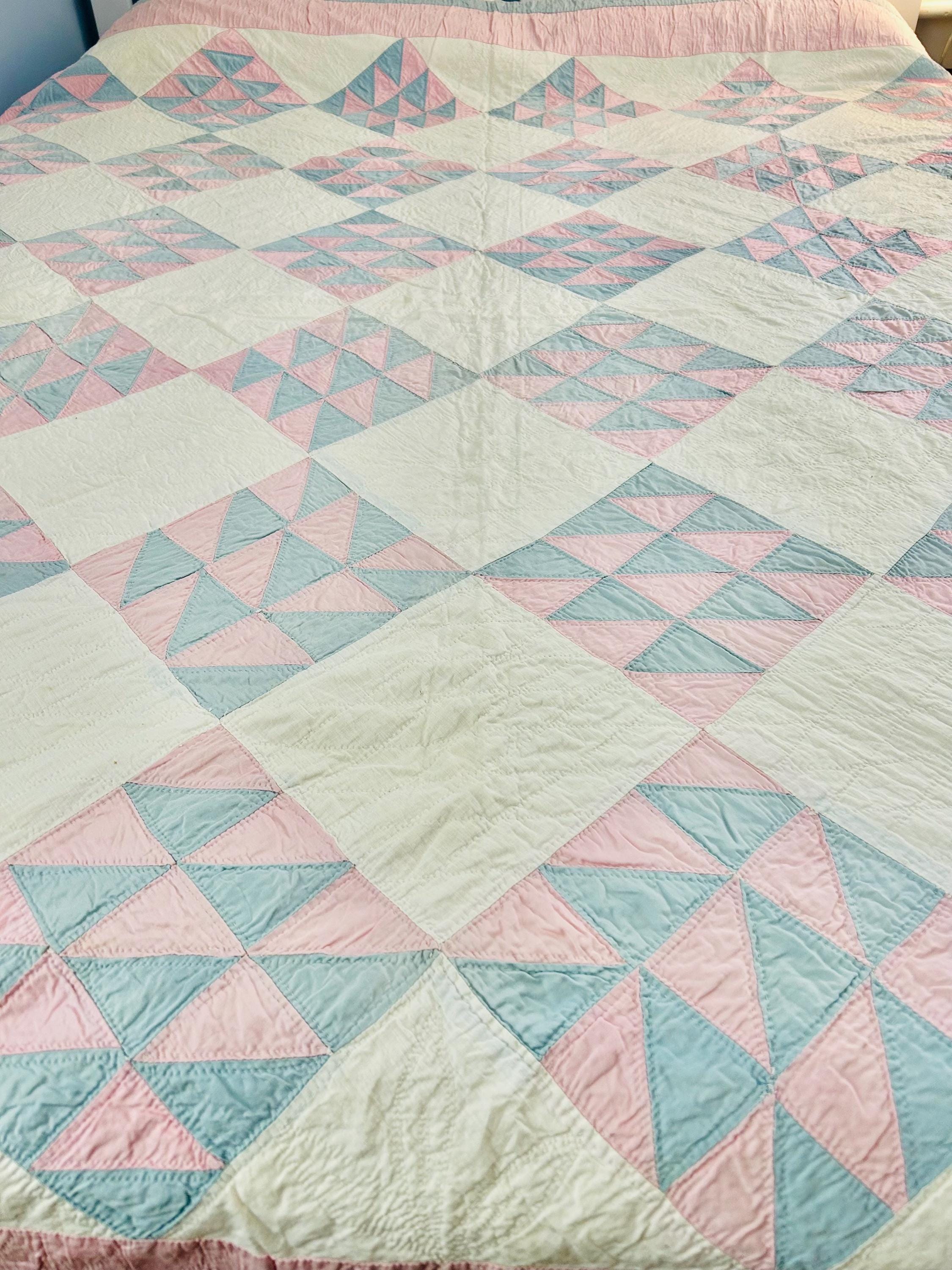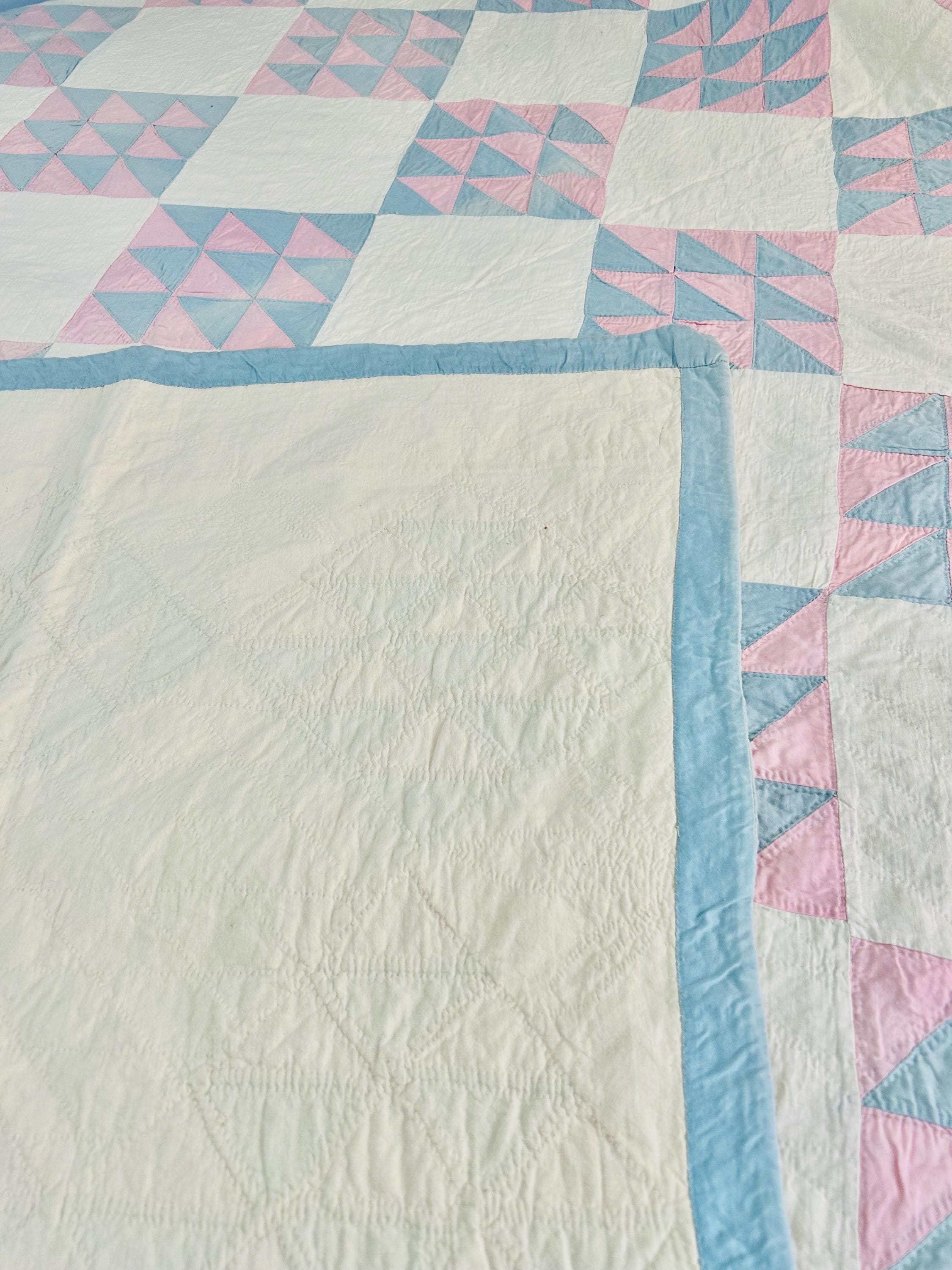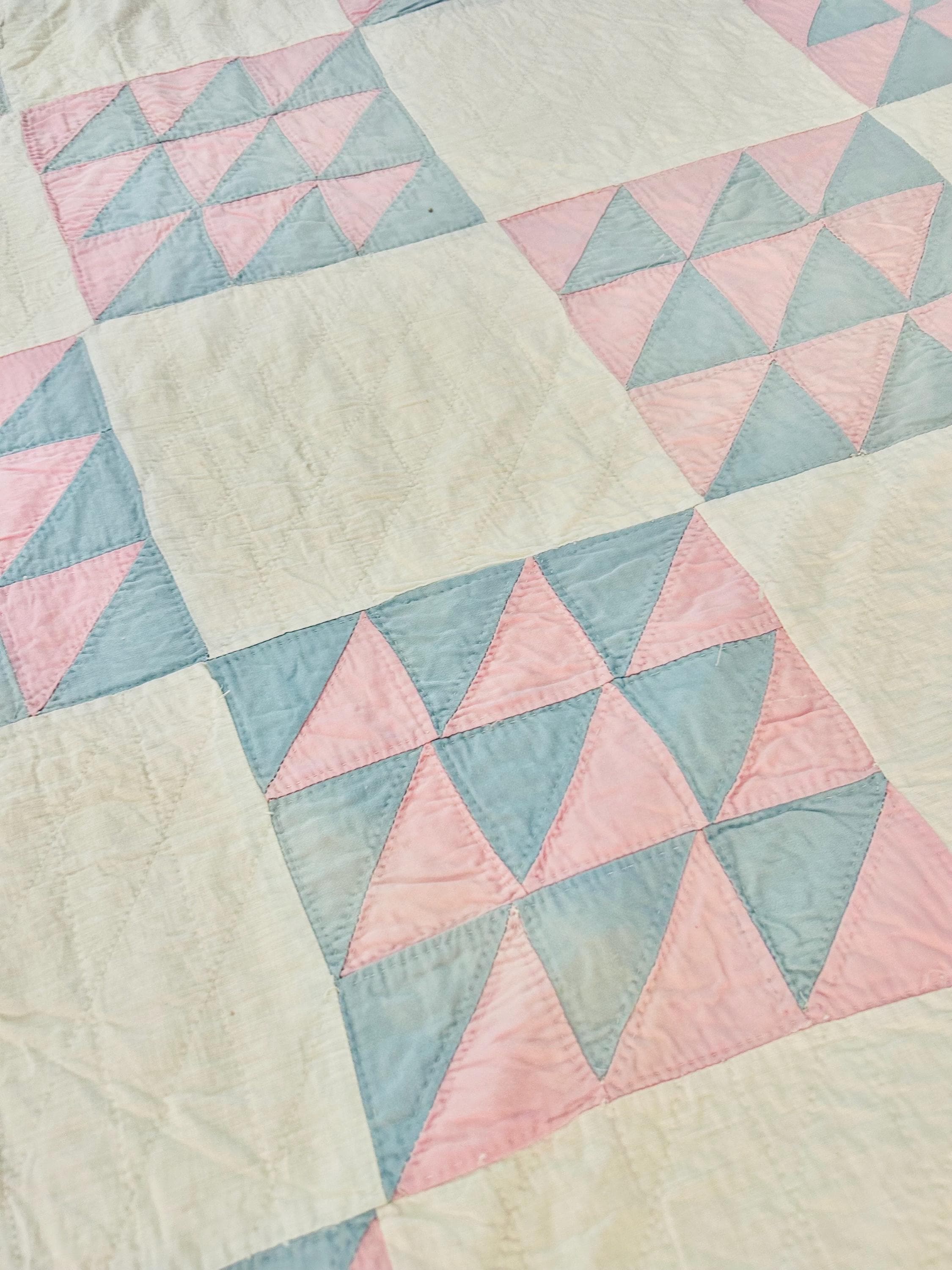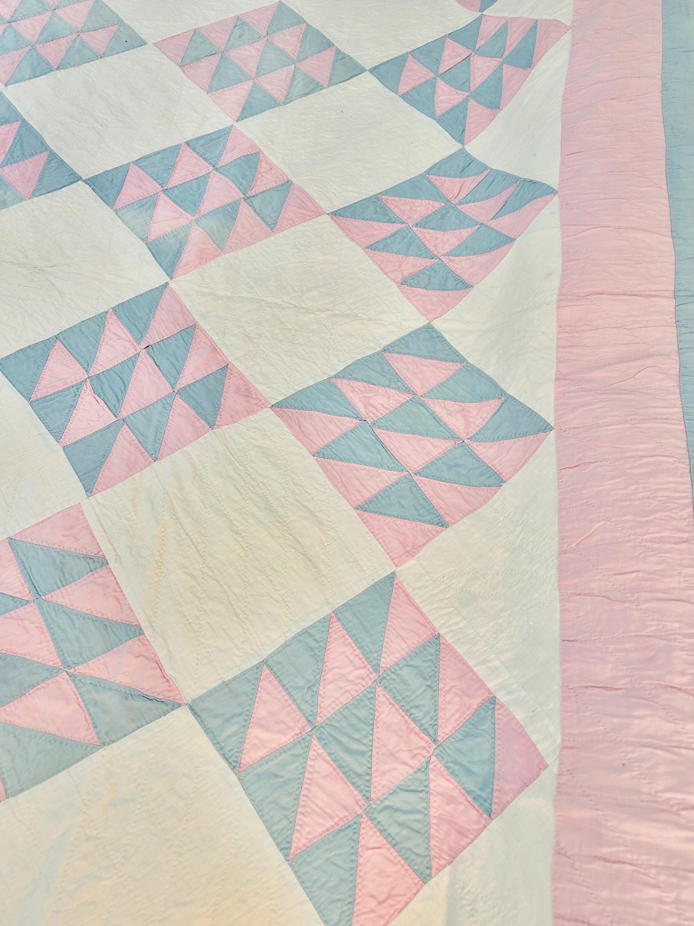 This is a lovely Depression-Era "Birds in the Air" Quilt, featuring the classic geometric pattern. The quilt features alternating pink and blue triangle blocks and solid white blocks, with hand-quilting in outlines of the patchwork and - in the white blocks - in beautiful flower motifs.