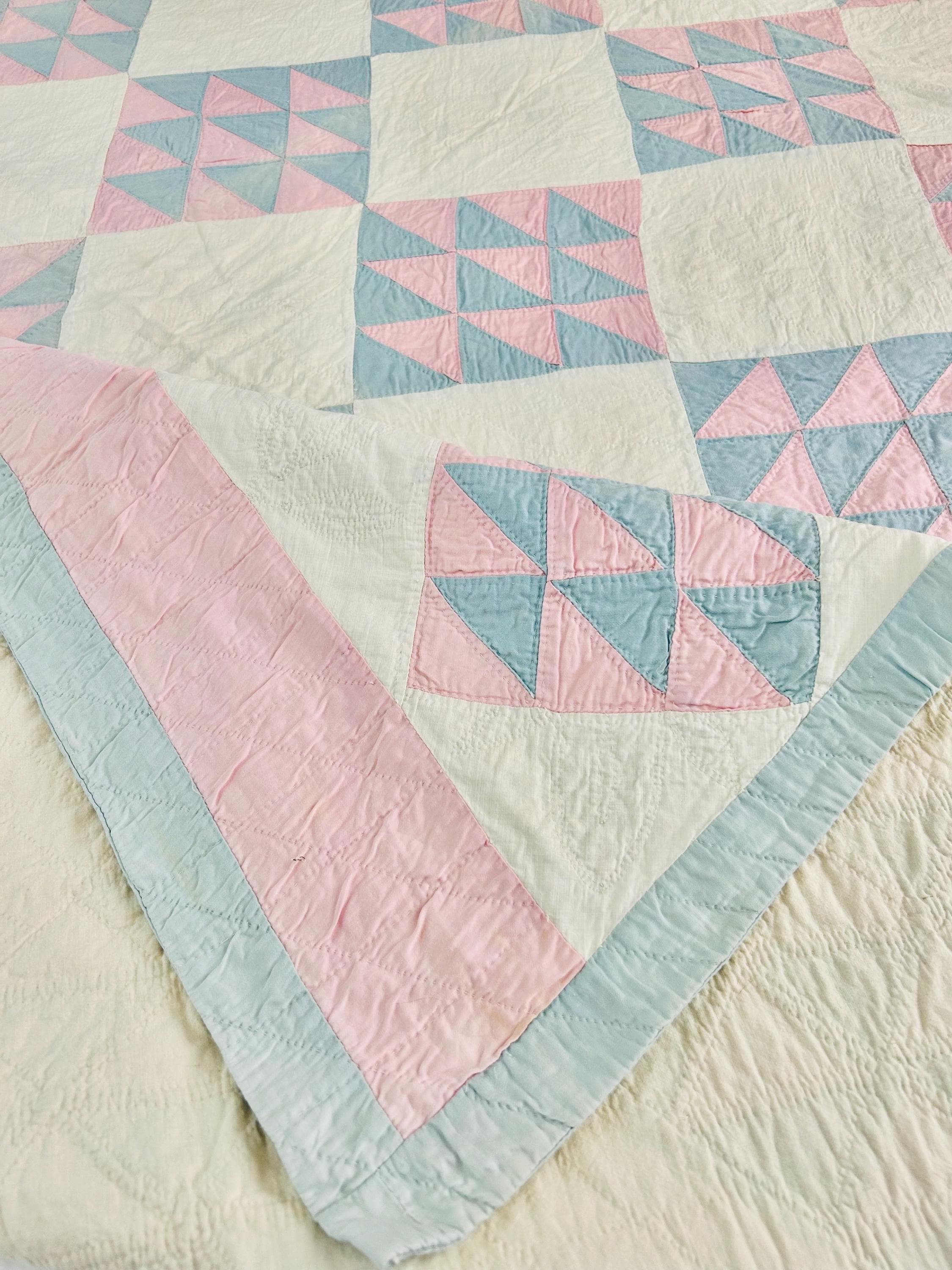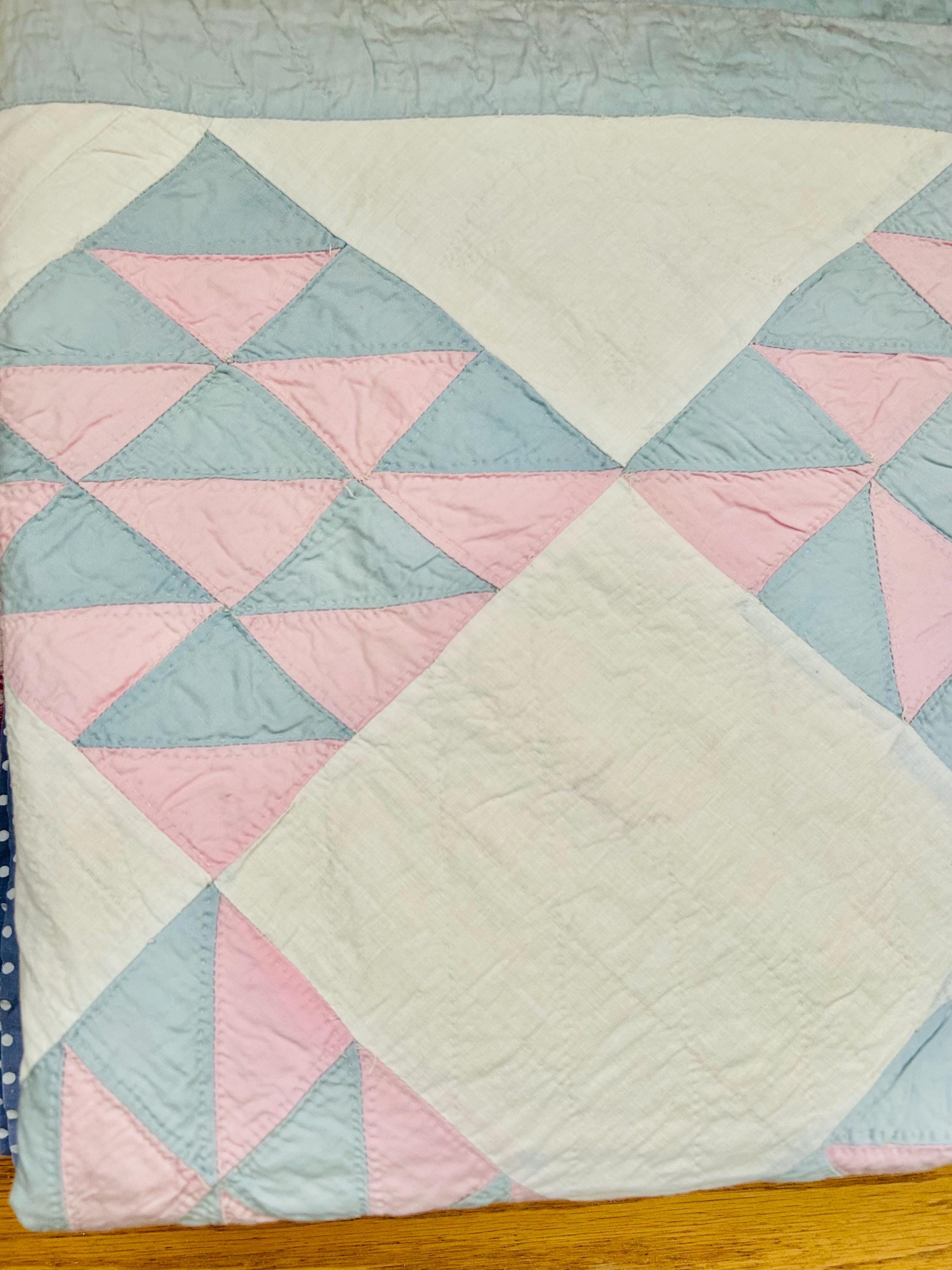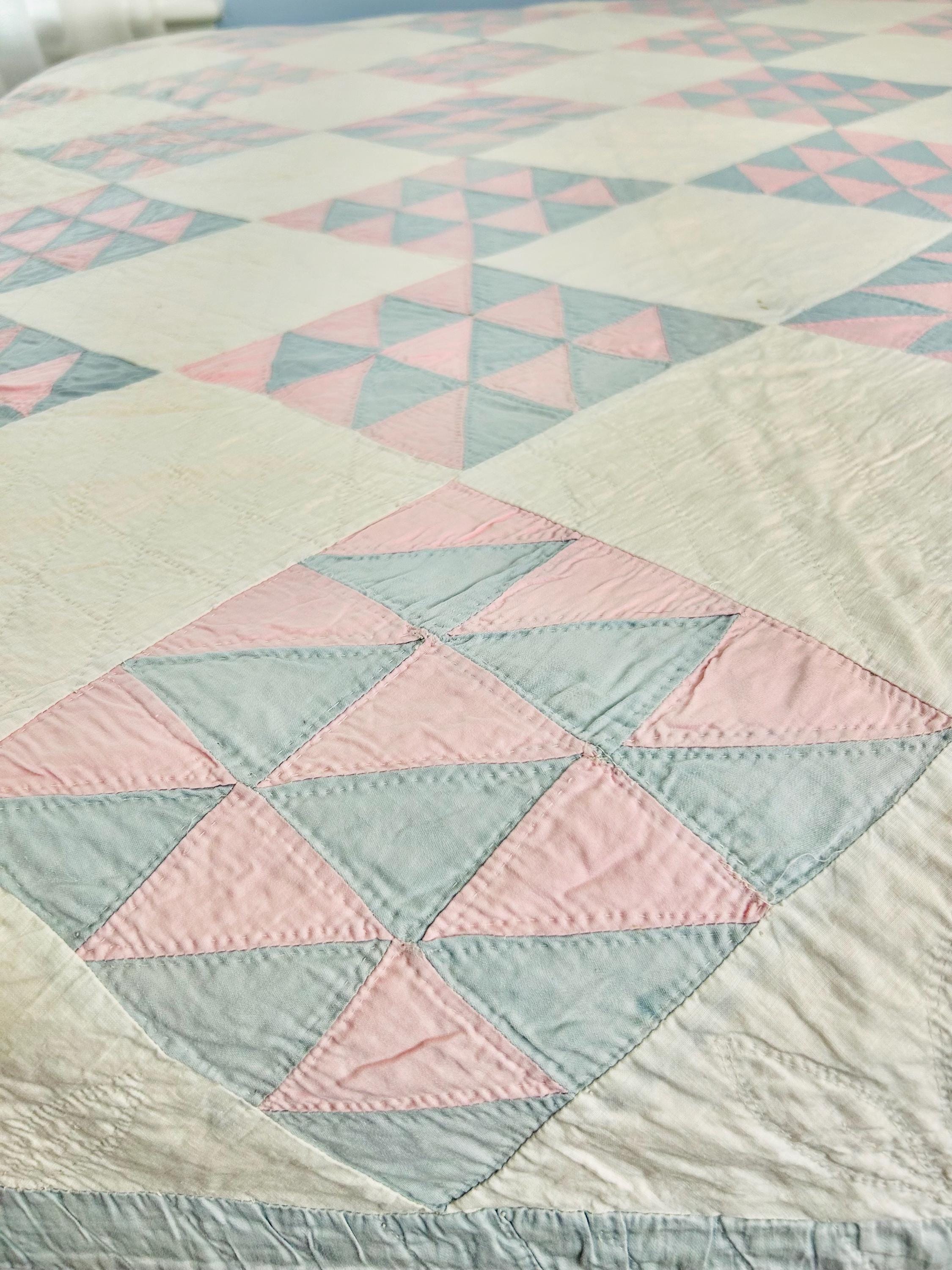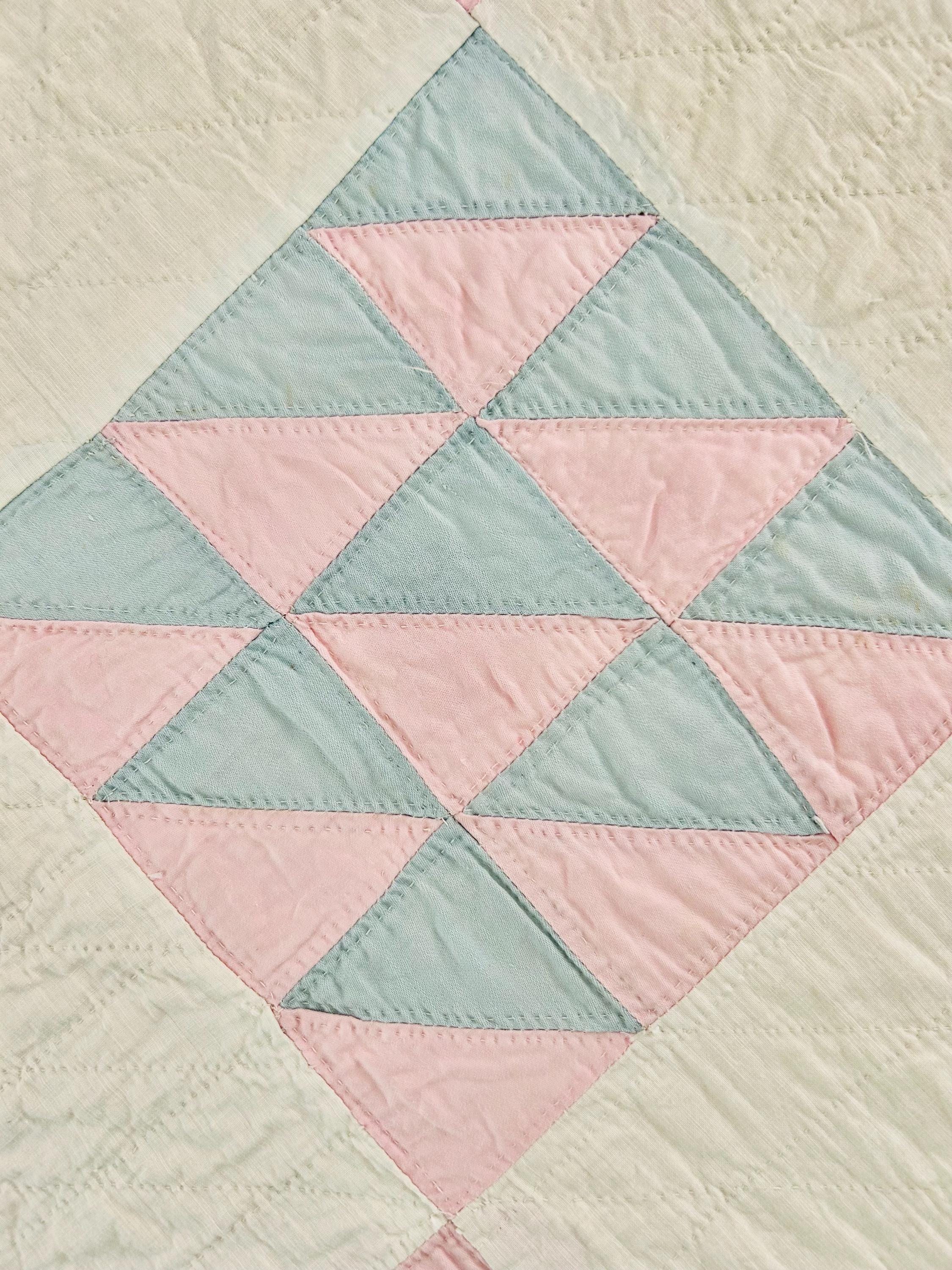 This is a lovely Depression-Era "Birds in the Air" Quilt, featuring the classic geometric pattern. The quilt features alternating pink and blue triangle blocks and solid white blocks, with hand-quilting in outlines of the patchwork and - in the white blocks - in beautiful flower motifs.