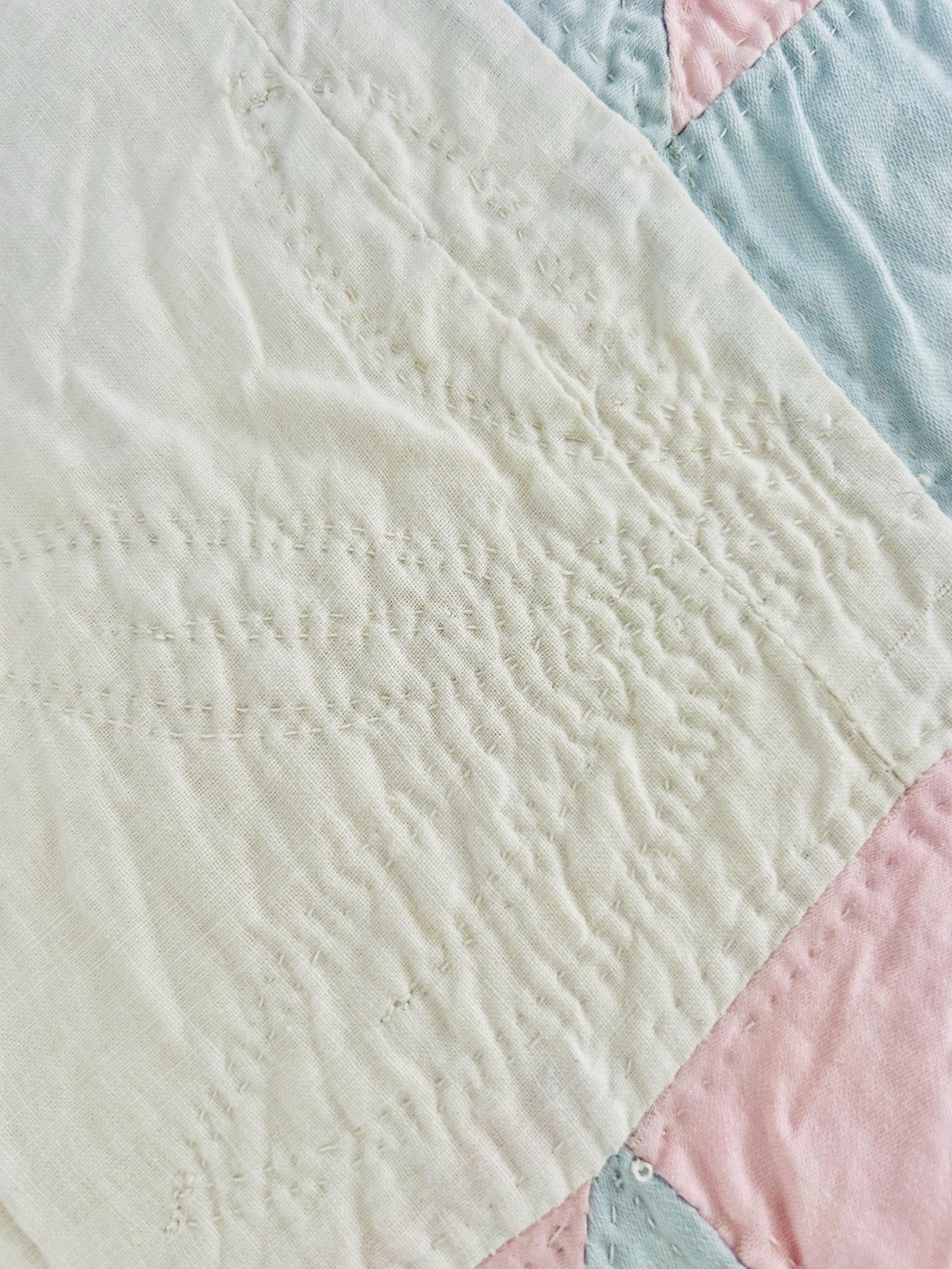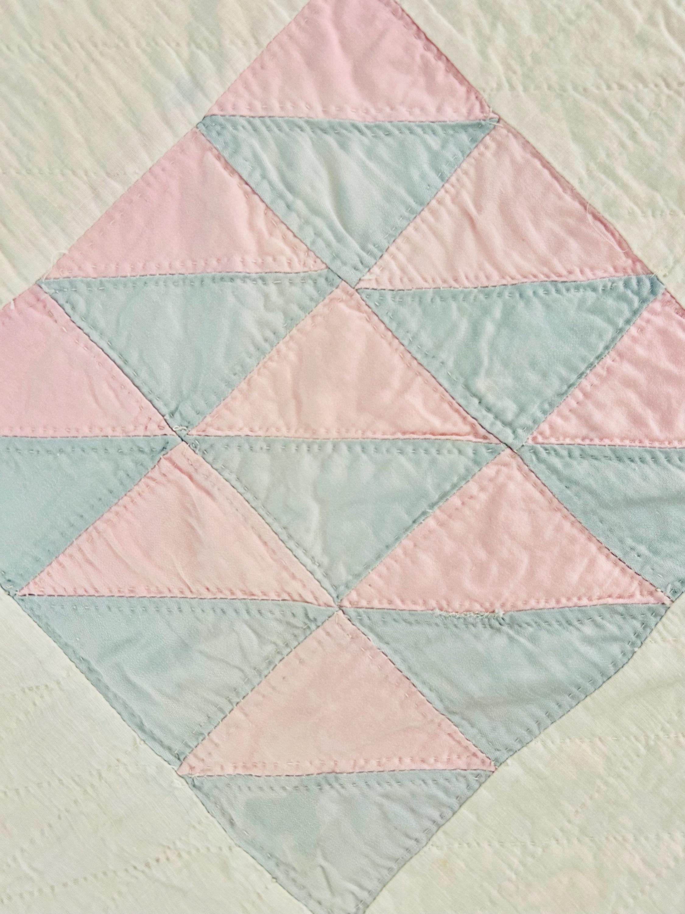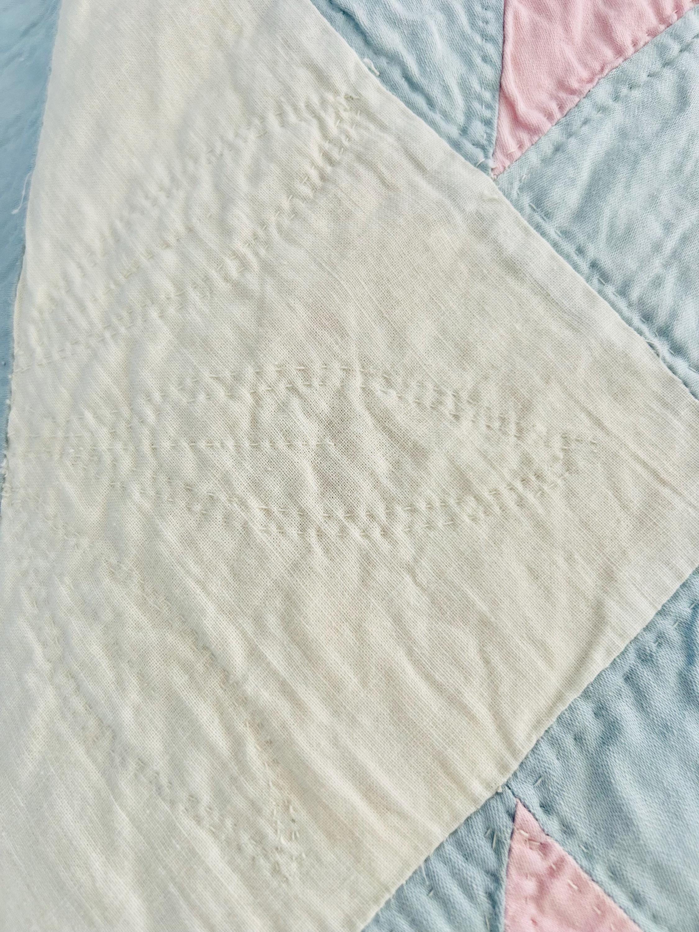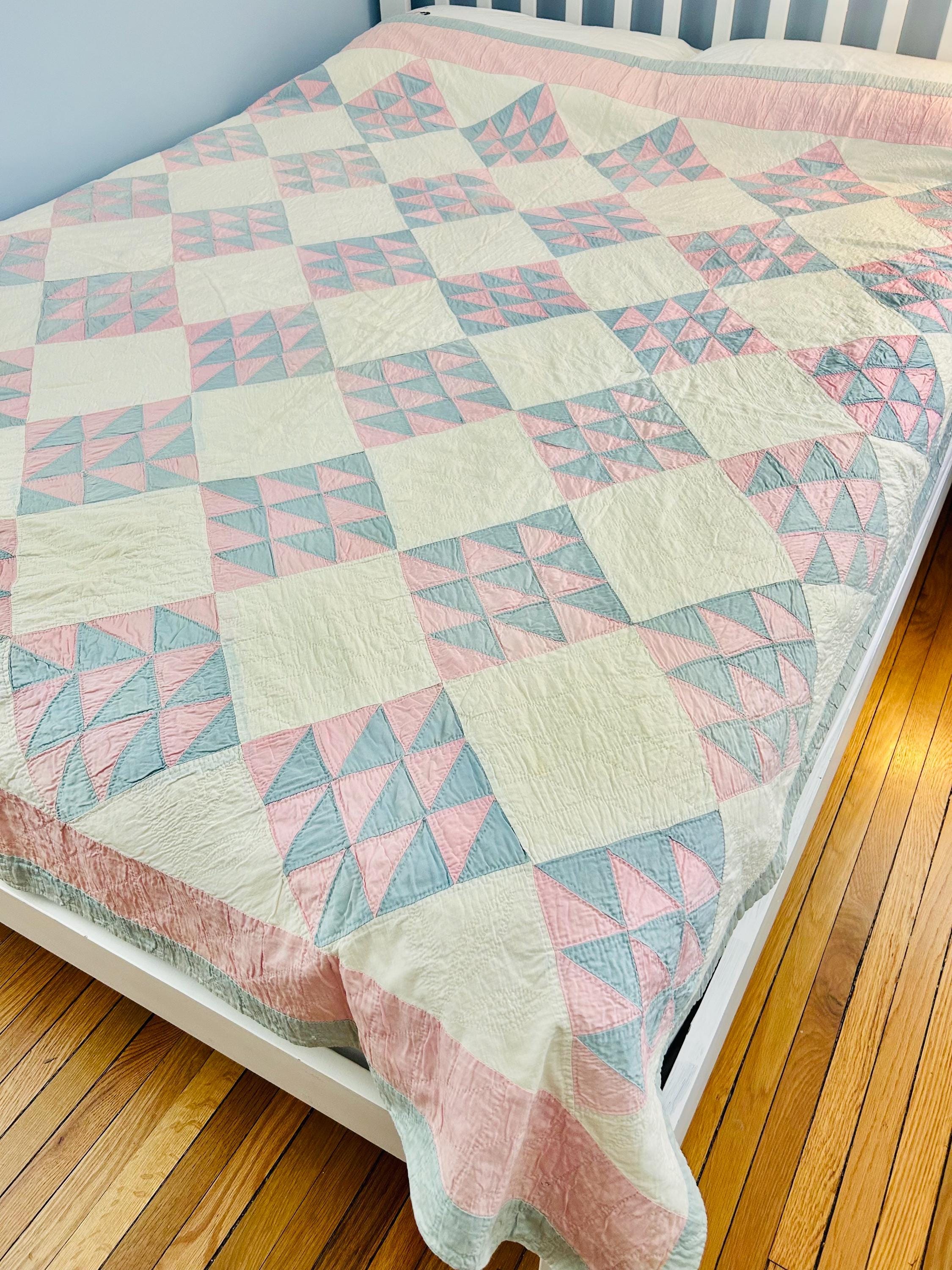 This is a lovely Depression-Era "Birds in the Air" Quilt, featuring the classic geometric pattern. The quilt features alternating pink and blue triangle blocks and solid white blocks, with hand-quilting in outlines of the patchwork and - in the white blocks - in beautiful flower motifs.