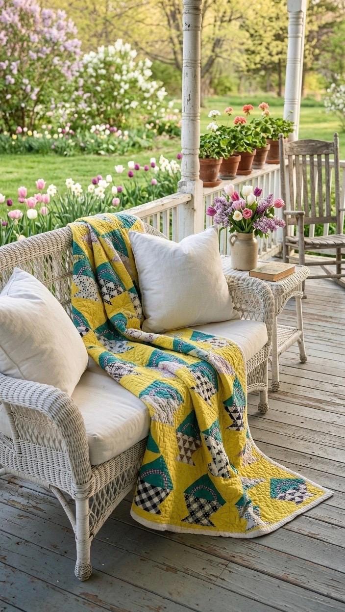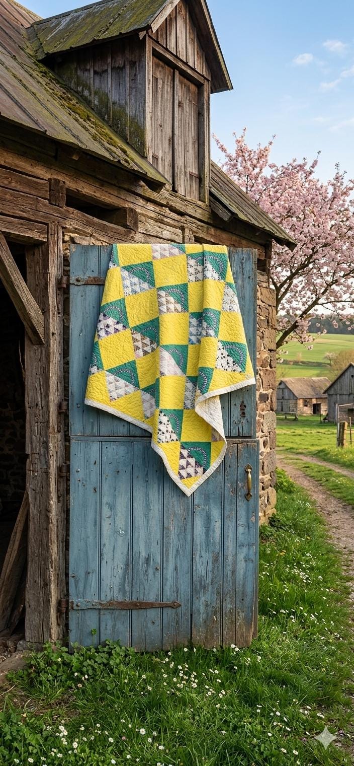 Details • Pattern: Basket quilt • Date: 1930s (Depression Era) • Size: 79” x 86” • Construction: Hand pieced and hand quilted • Fabrics: Assorted 1930s cotton prints with bright yellow setting blocks • Colors: Yellow, green, cream, and multicolor prints • Layout: Baskets set on point in diagonal rows • Batting: Lightweight cotton batting