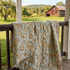The quilt is from a smoke-free, pet-free home and is pictured on a queen-size bed.