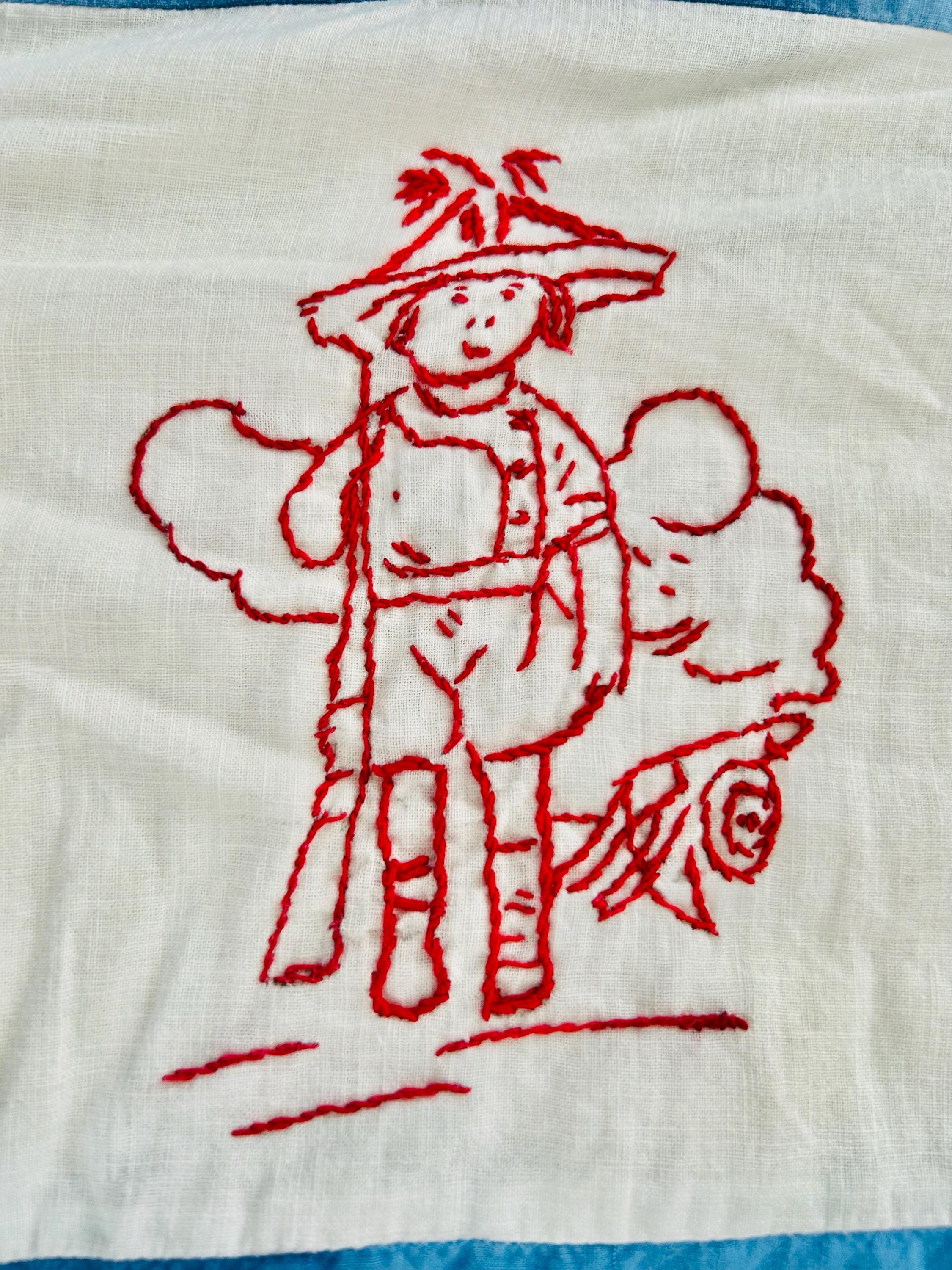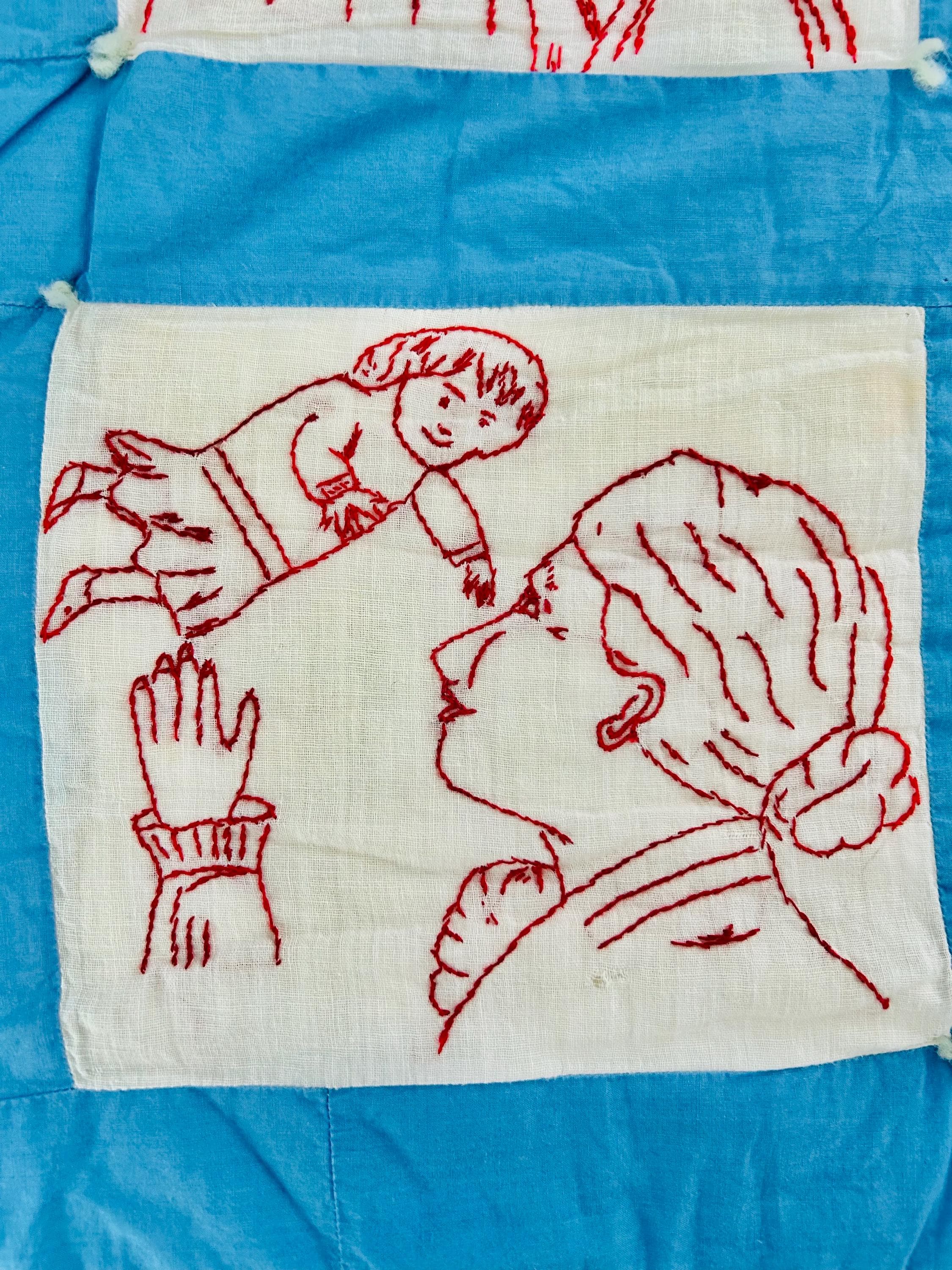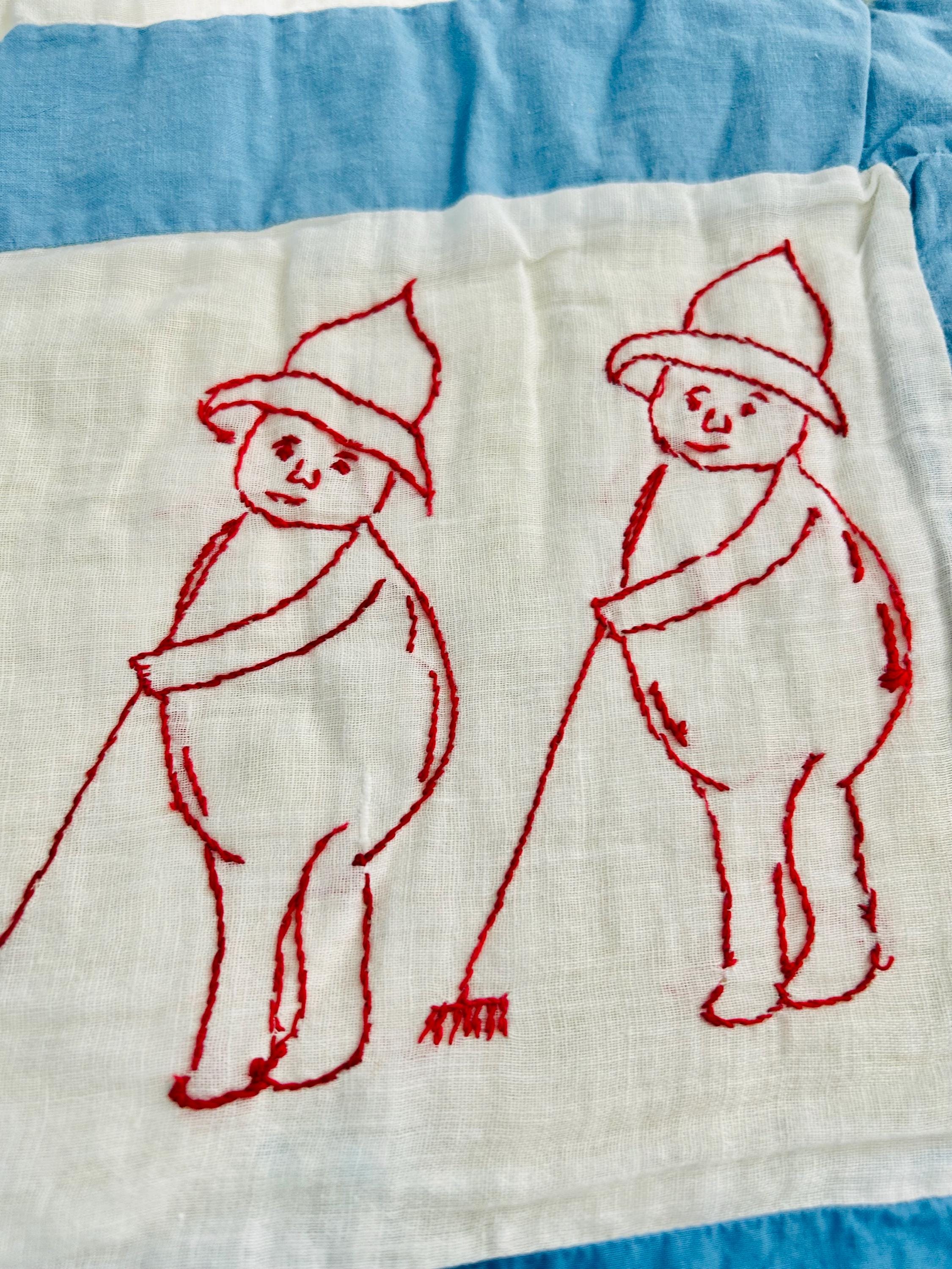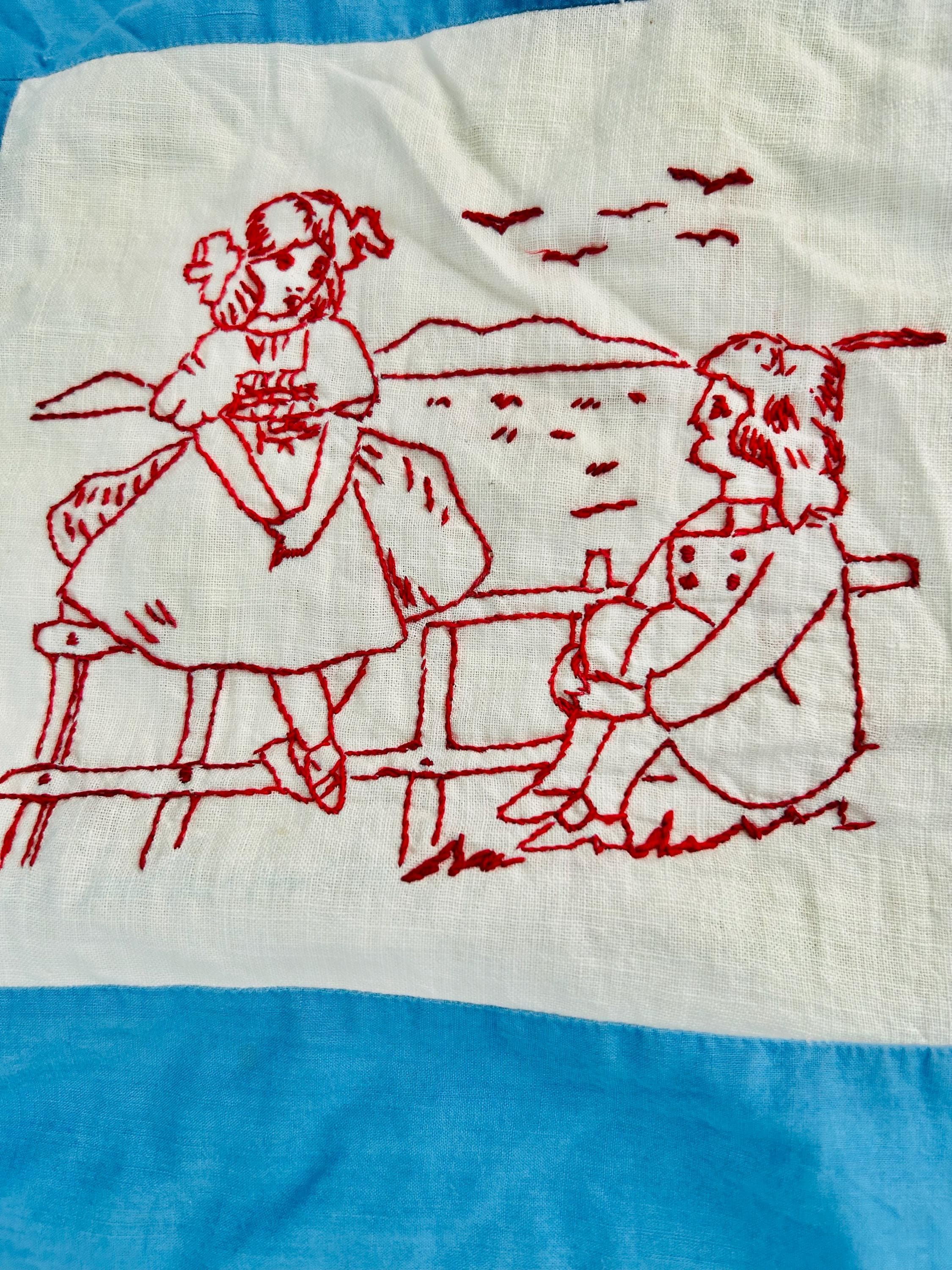 Crafted during the height of the Redwork movement (c. 1910–1925), this quilt showcases the iconic Turkey Red colorfast embroidery on a white ground, framed by vibrant cornflower blue sashing. The quilt is hand-tied (not quilted).