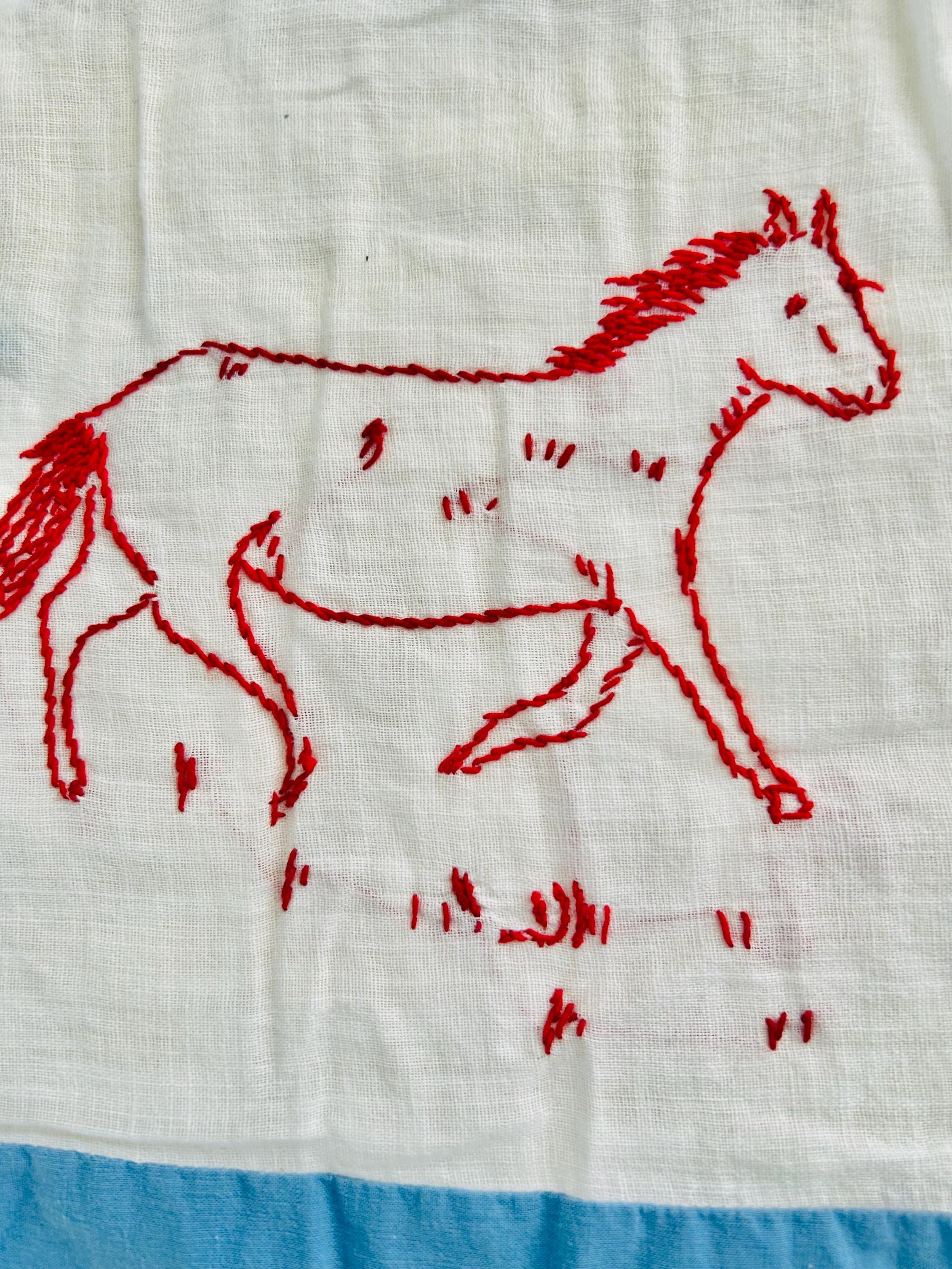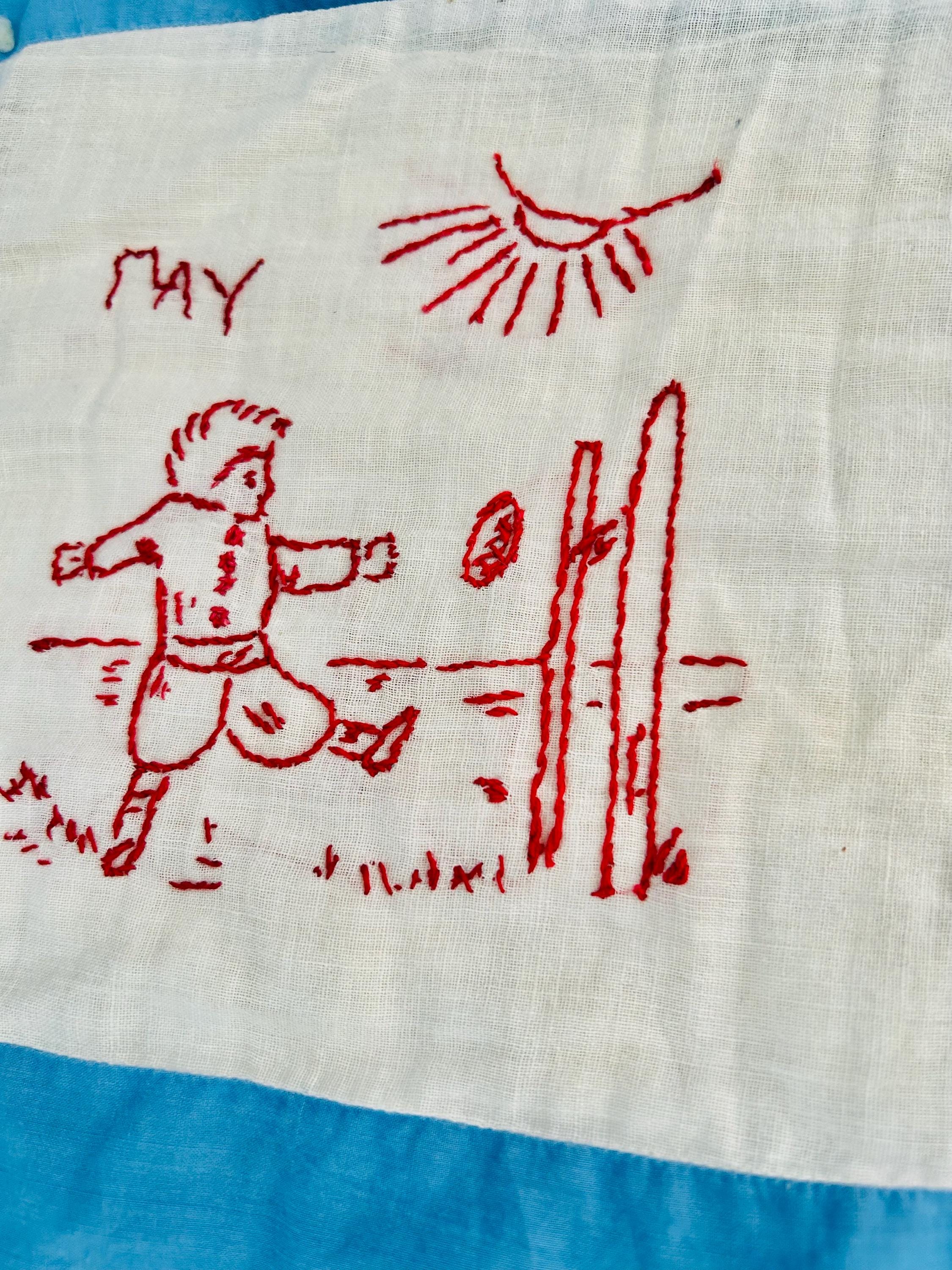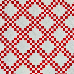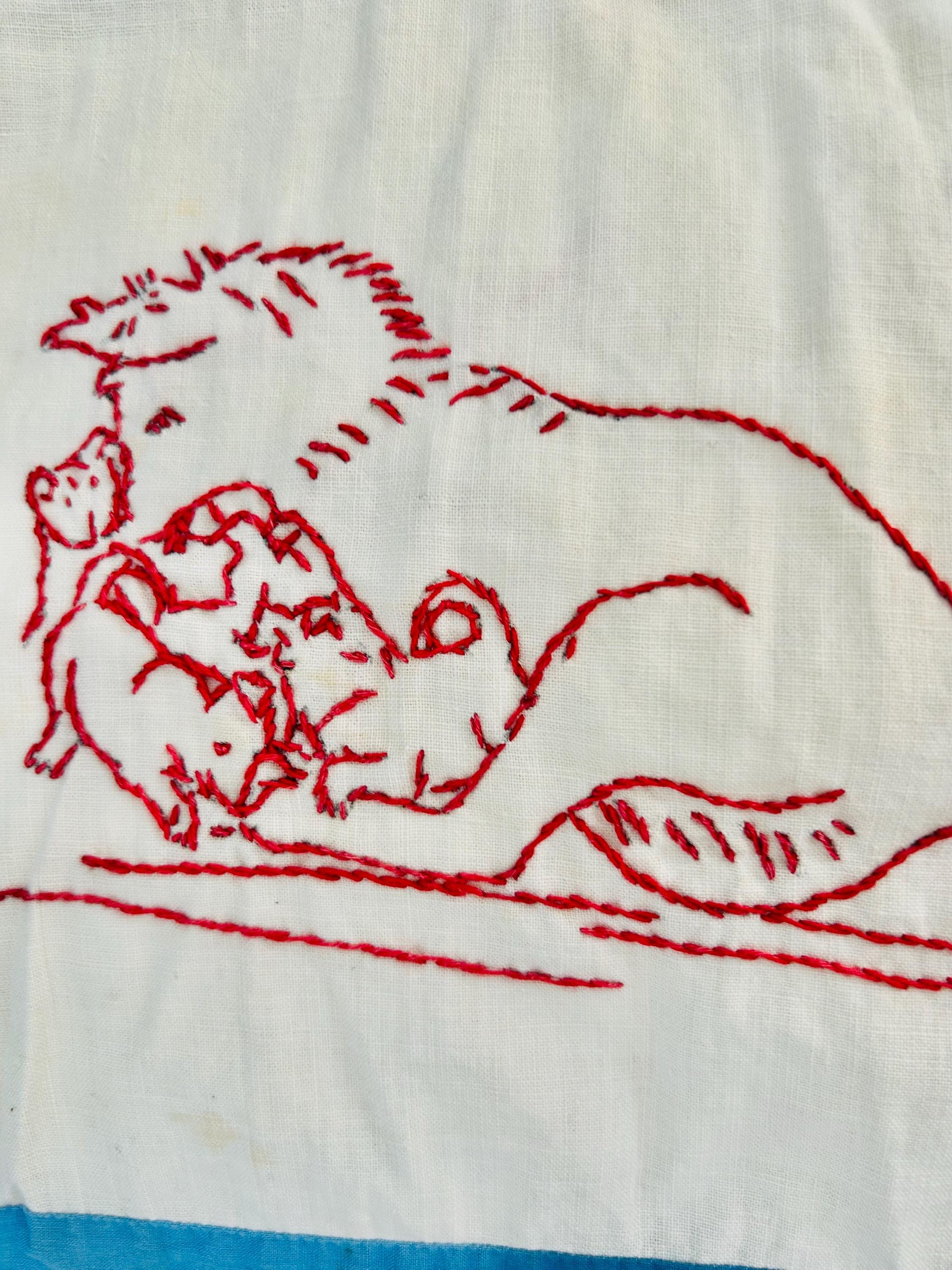 Crafted during the height of the Redwork movement (c. 1910–1925), this quilt showcases the iconic Turkey Red colorfast embroidery on a white ground, framed by vibrant cornflower blue sashing. The quilt is hand-tied (not quilted).