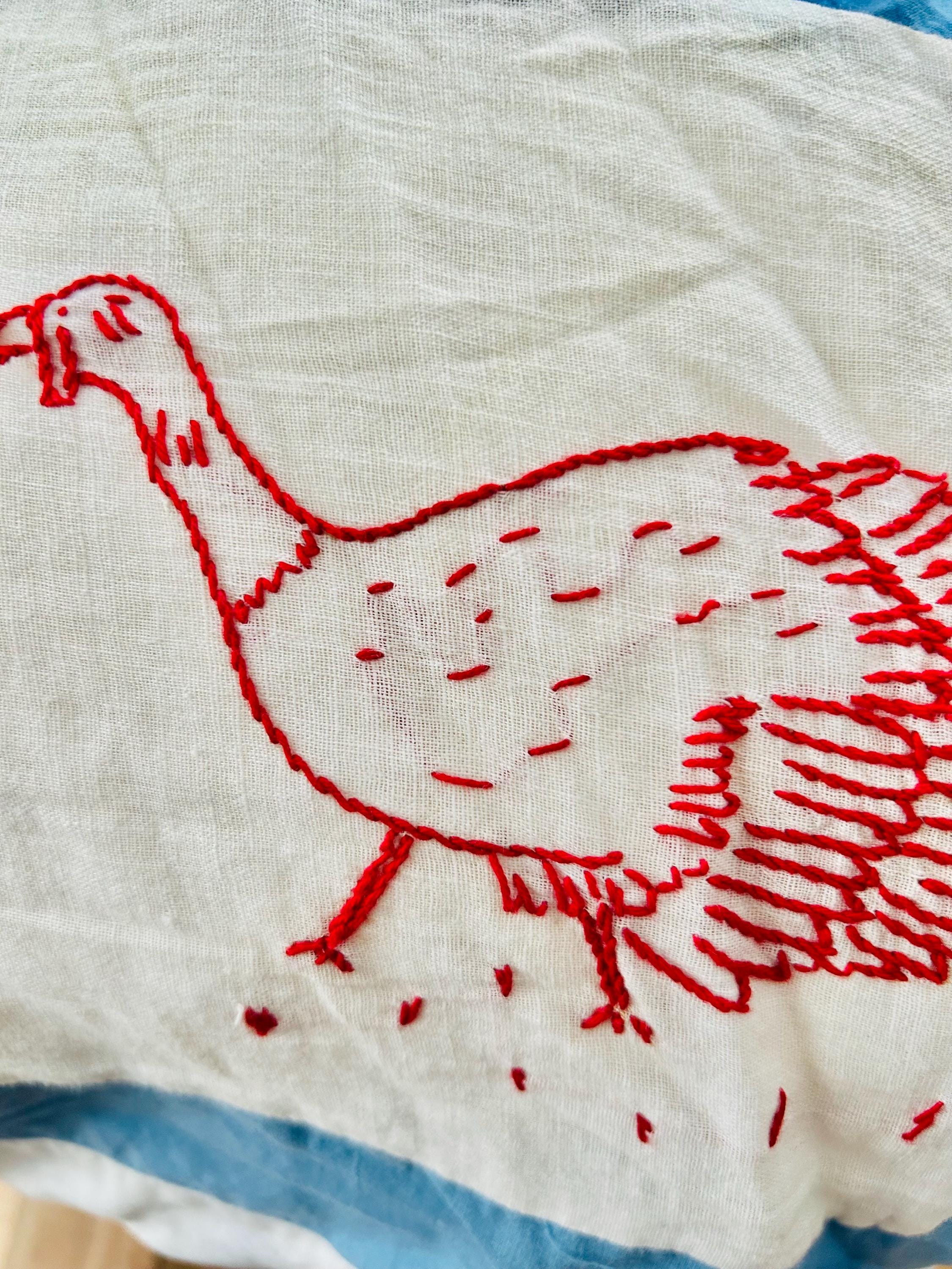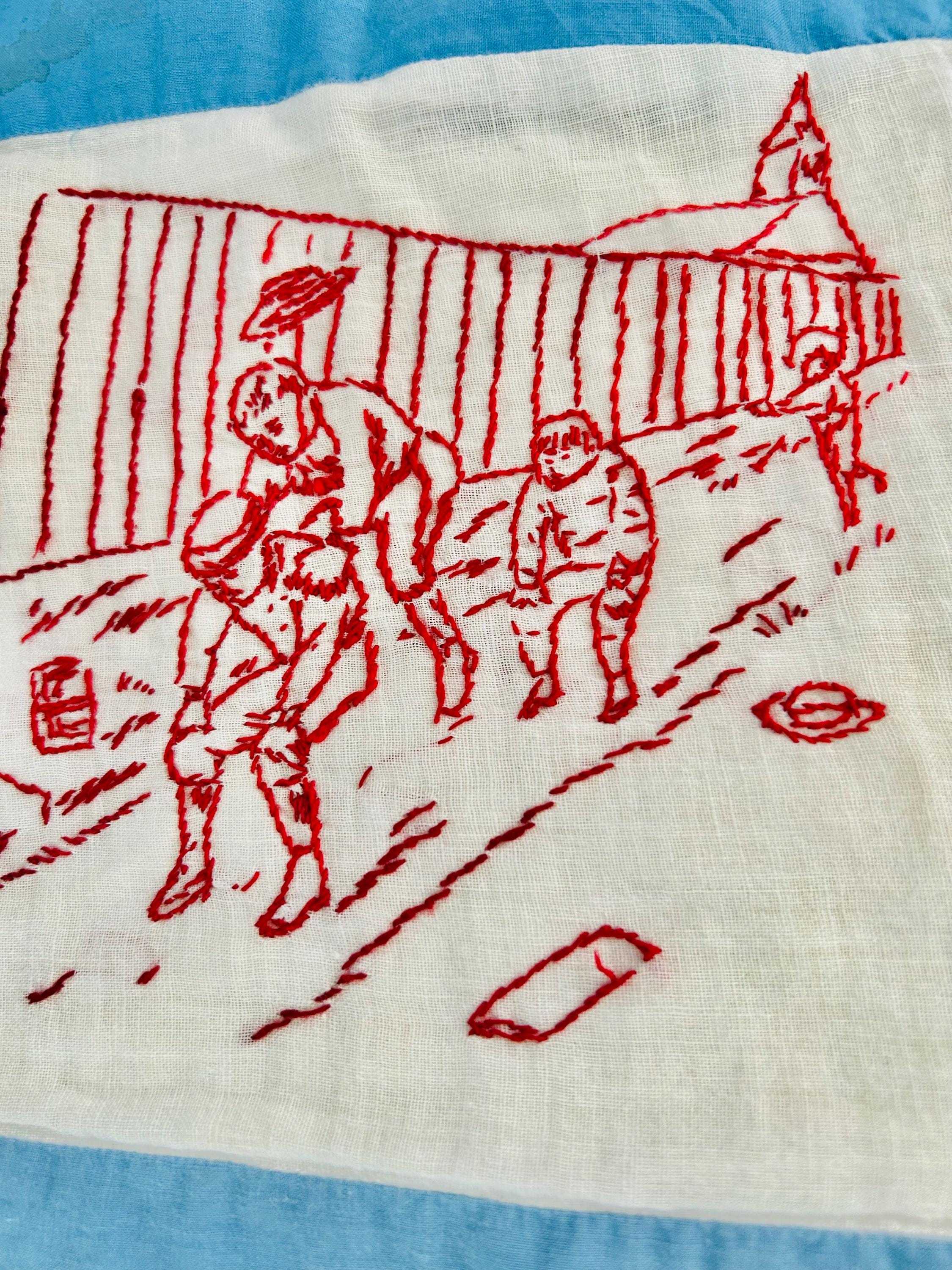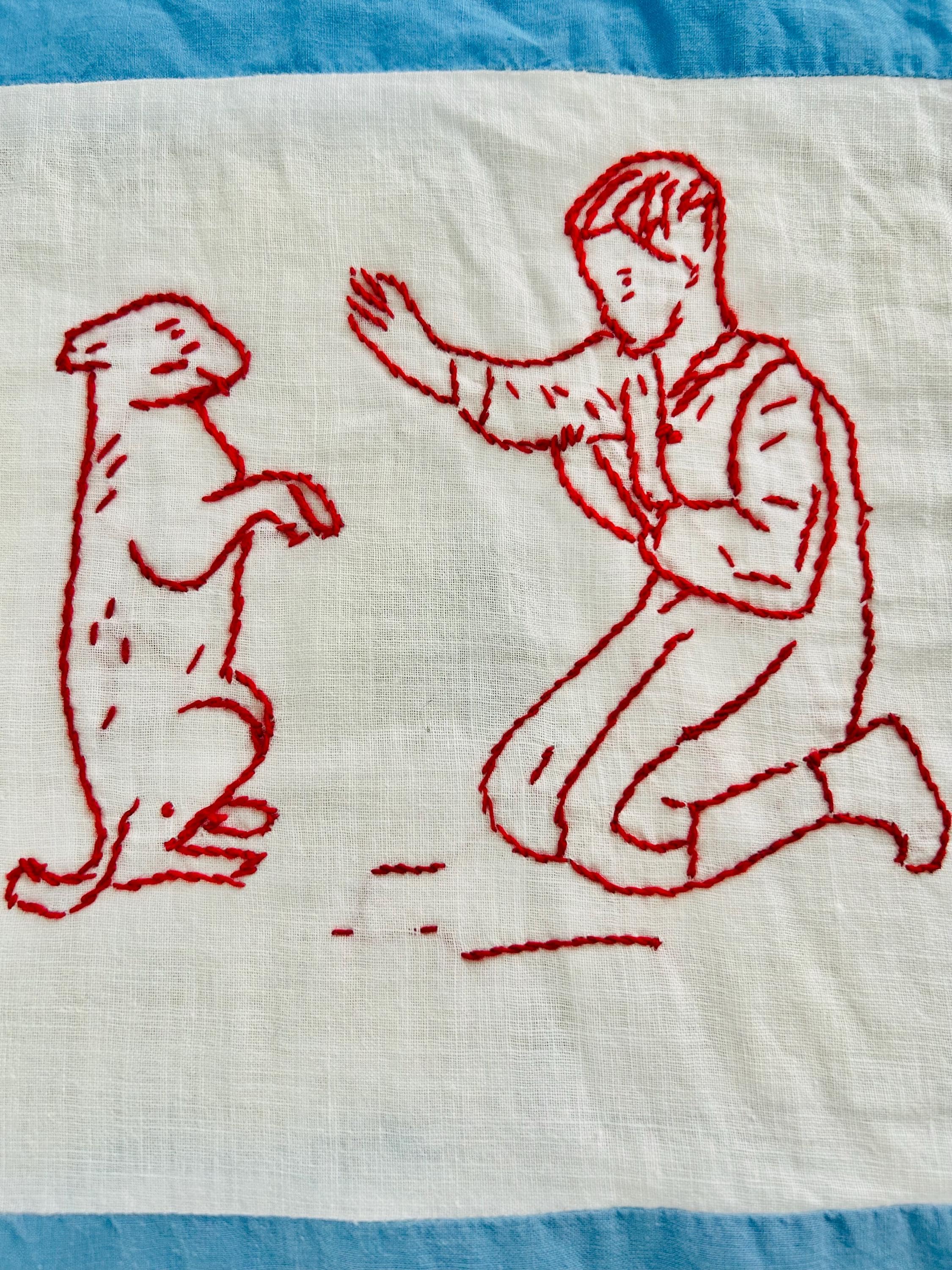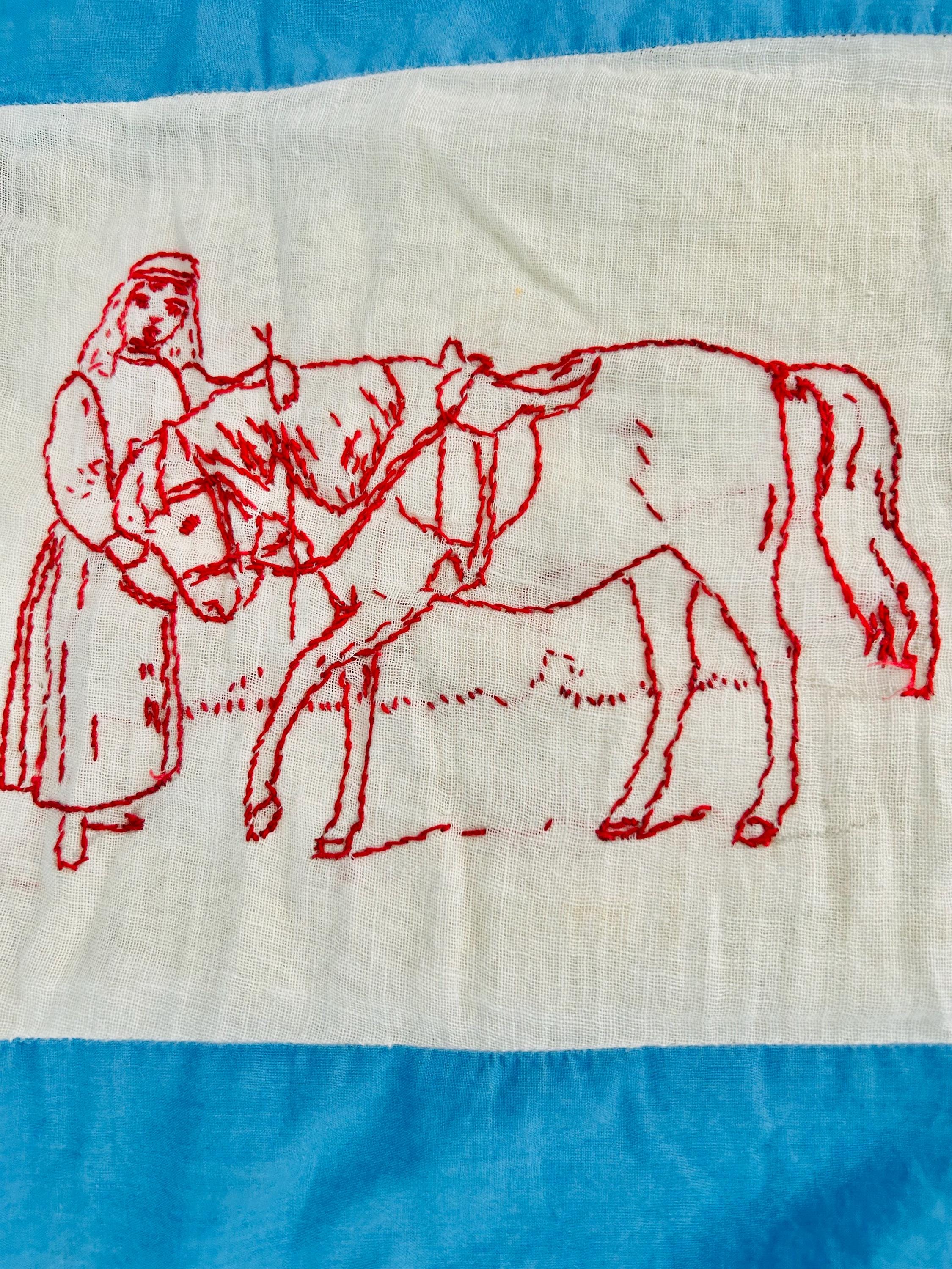 Crafted during the height of the Redwork movement (c. 1910–1925), this quilt showcases the iconic Turkey Red colorfast embroidery on a white ground, framed by vibrant cornflower blue sashing. The quilt is hand-tied (not quilted).