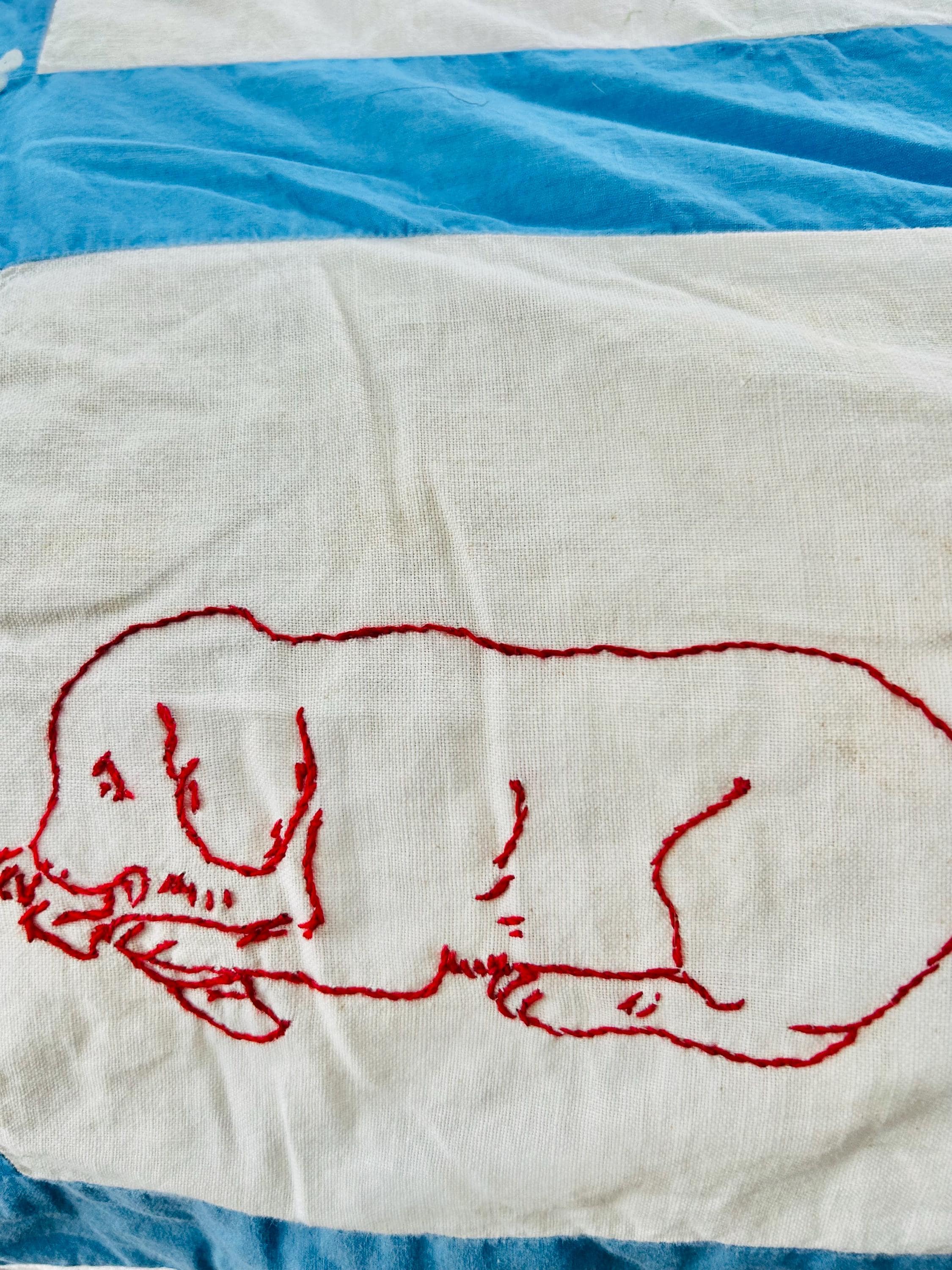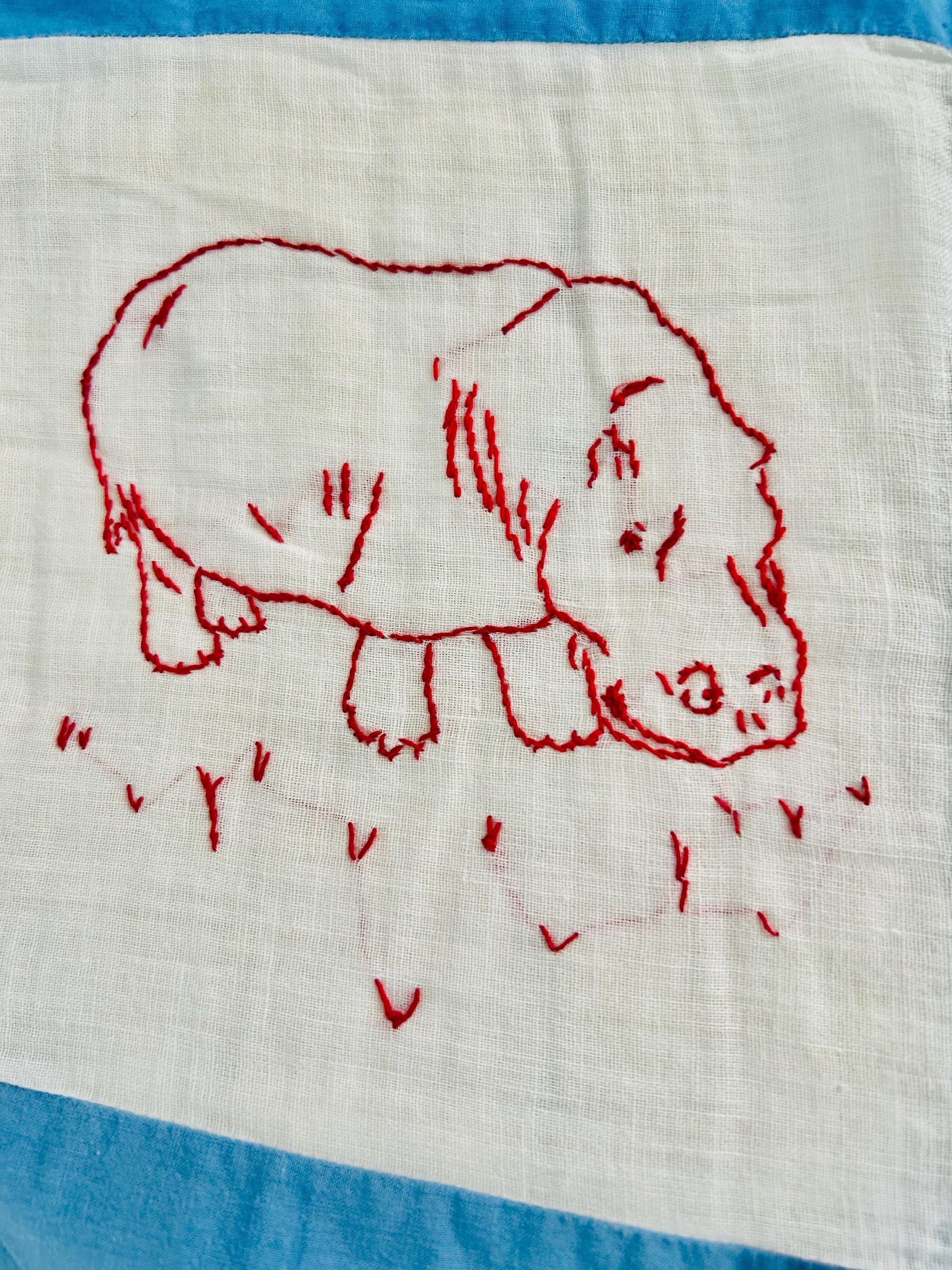 The back is cornflower blue cotton that has been turned to the front and hand-stitched to form the binding. The batting appears to be light-to-medium weight flannel.